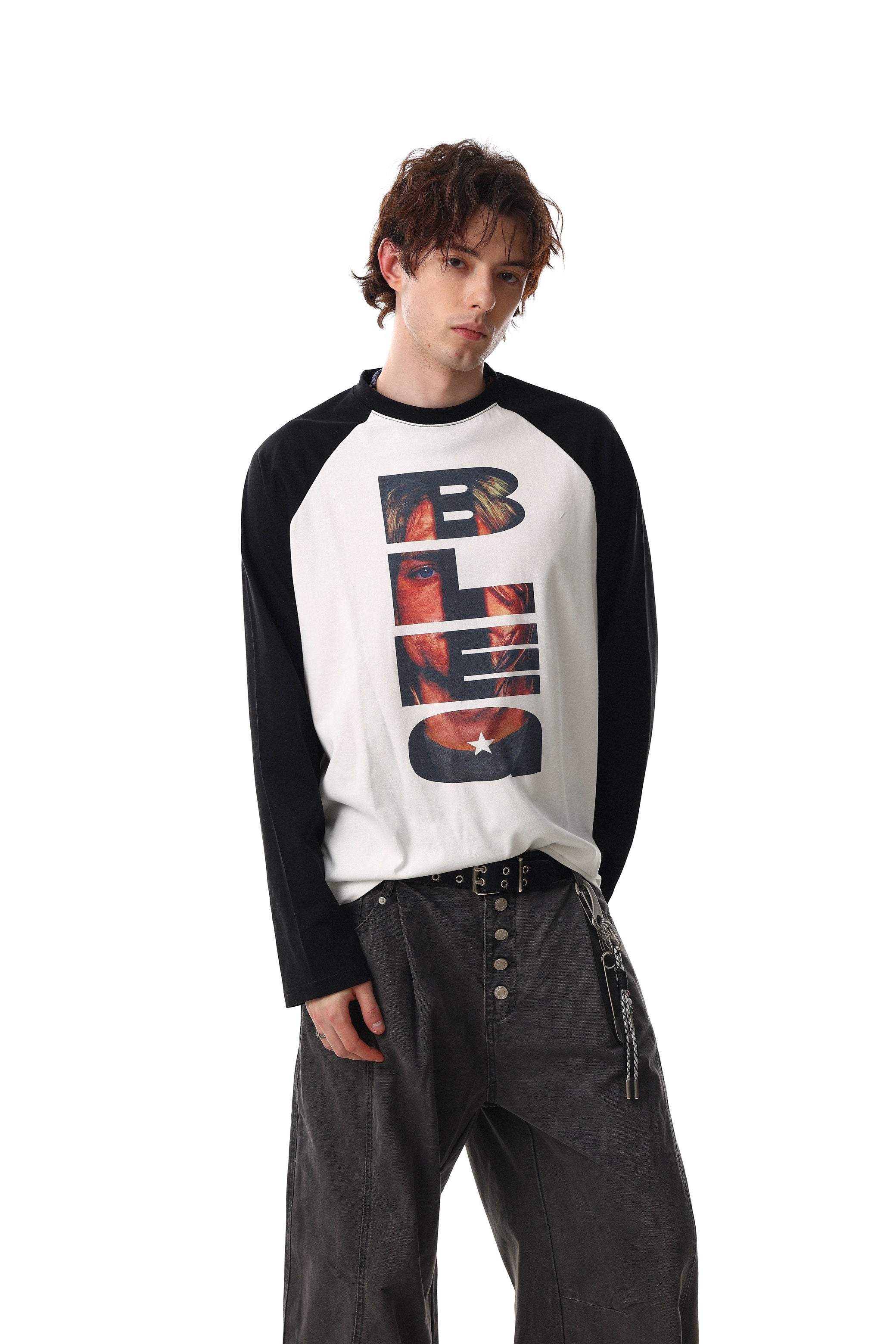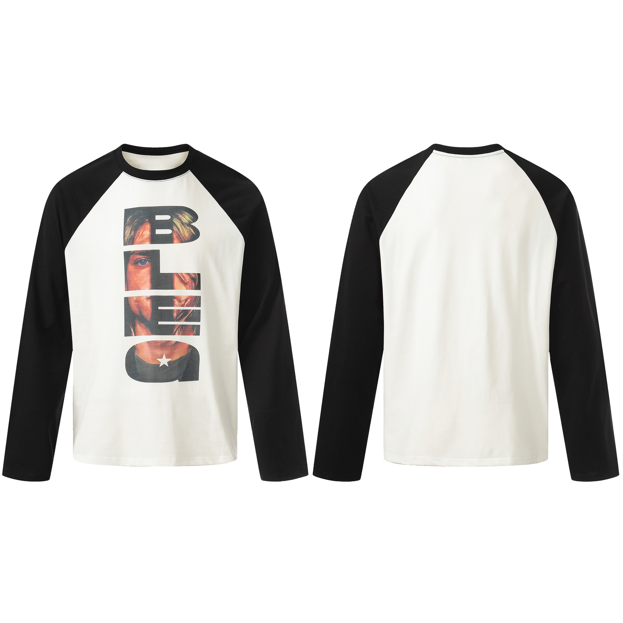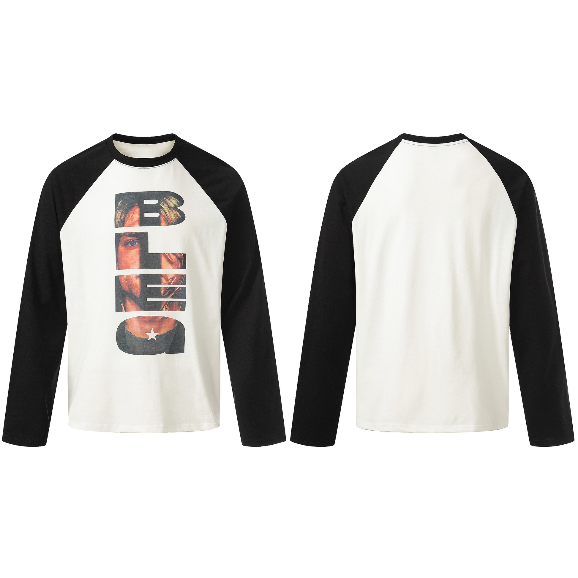 Clothing details: Front graphic print, raglan sleeve construction, contrast sleeves, long-sleeve silhouette.