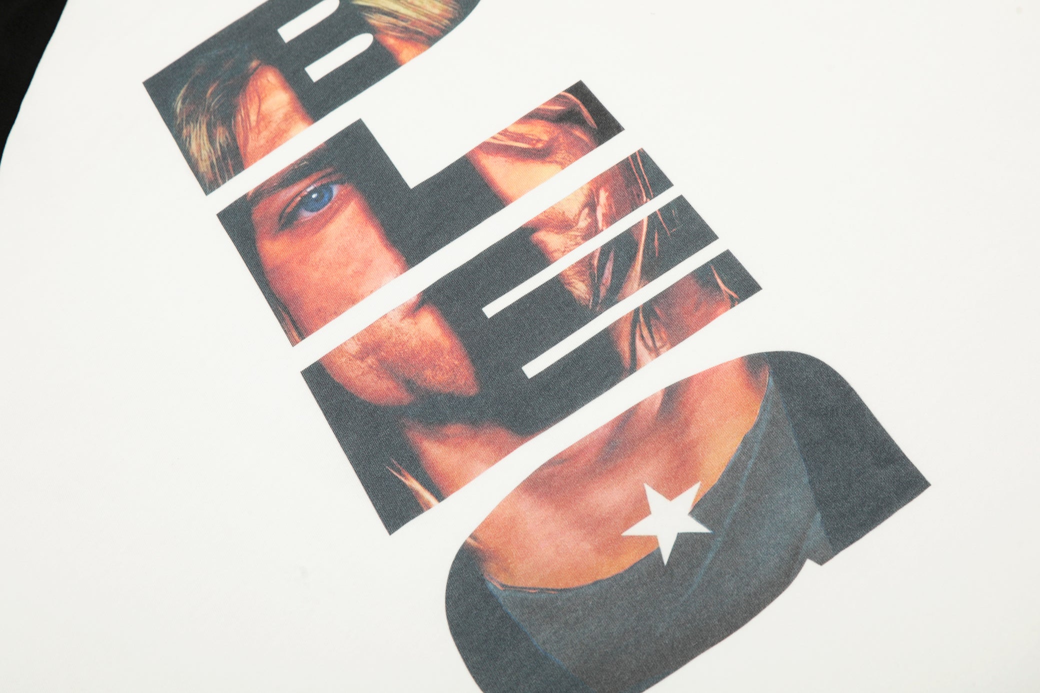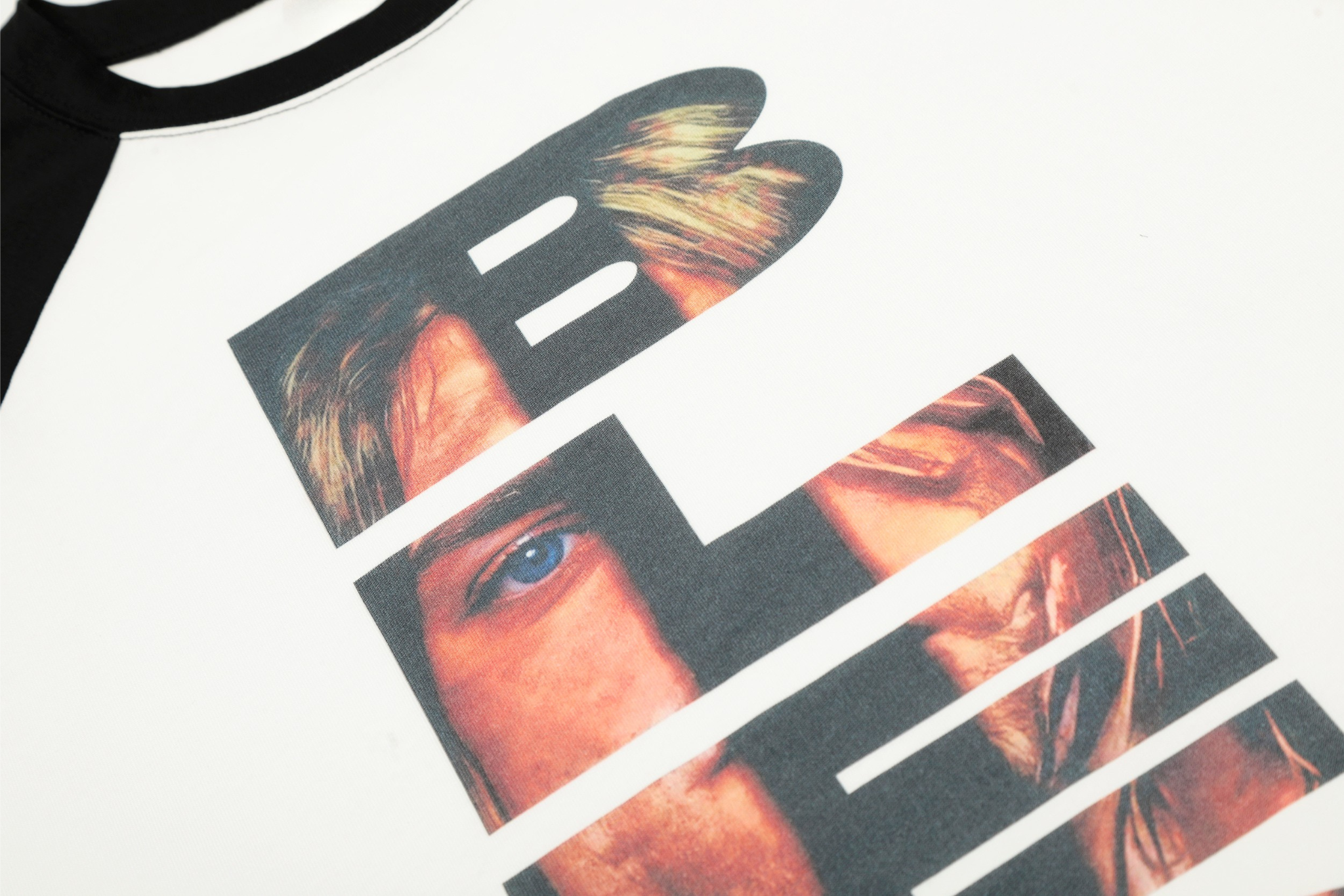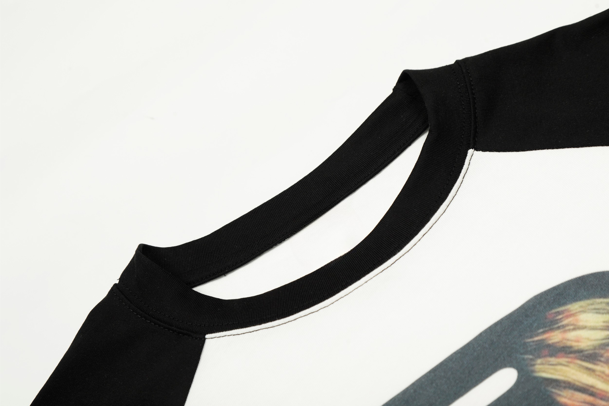 Clothing details: Front graphic print, raglan sleeve construction, contrast sleeves, long-sleeve silhouette.