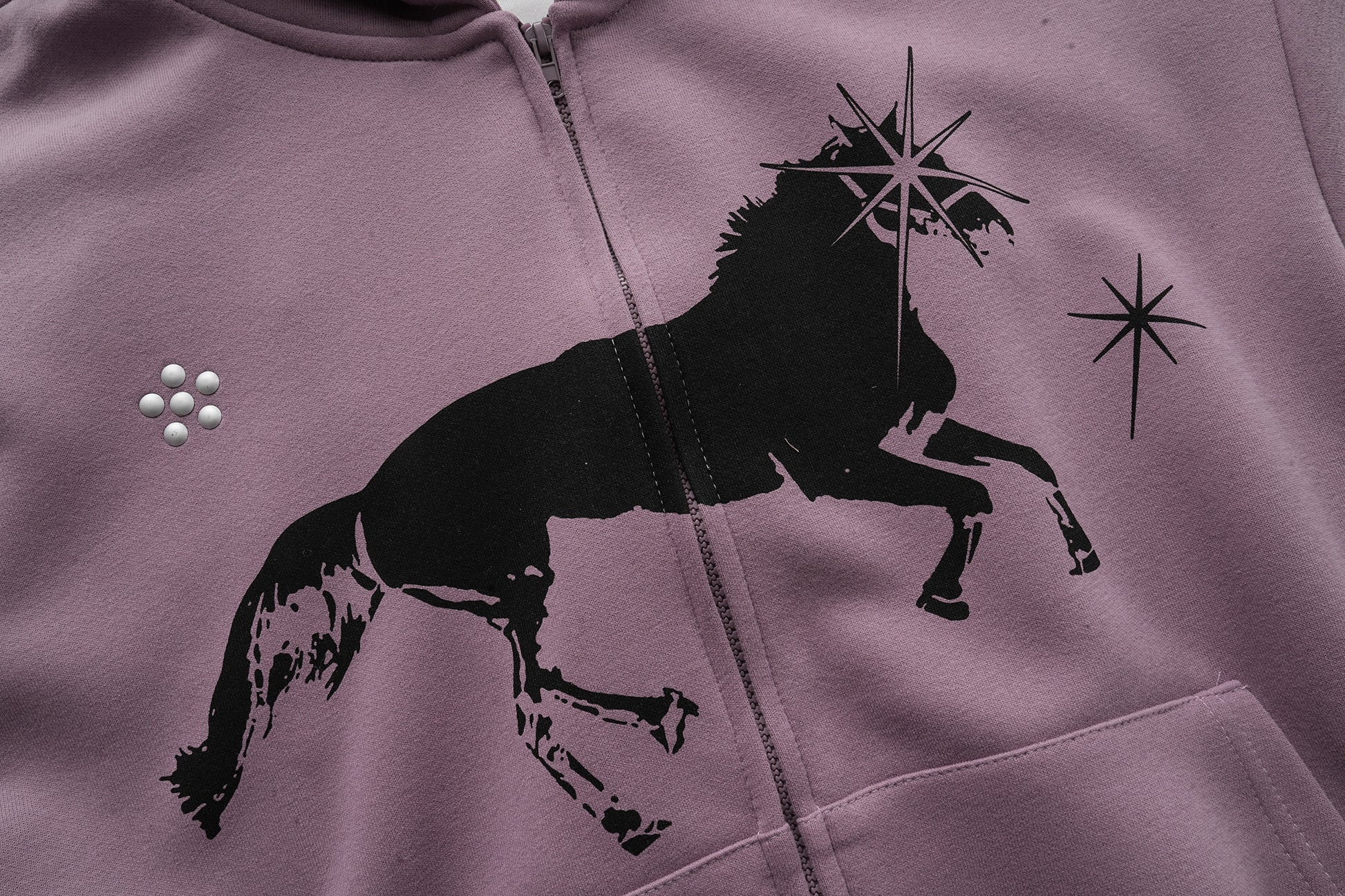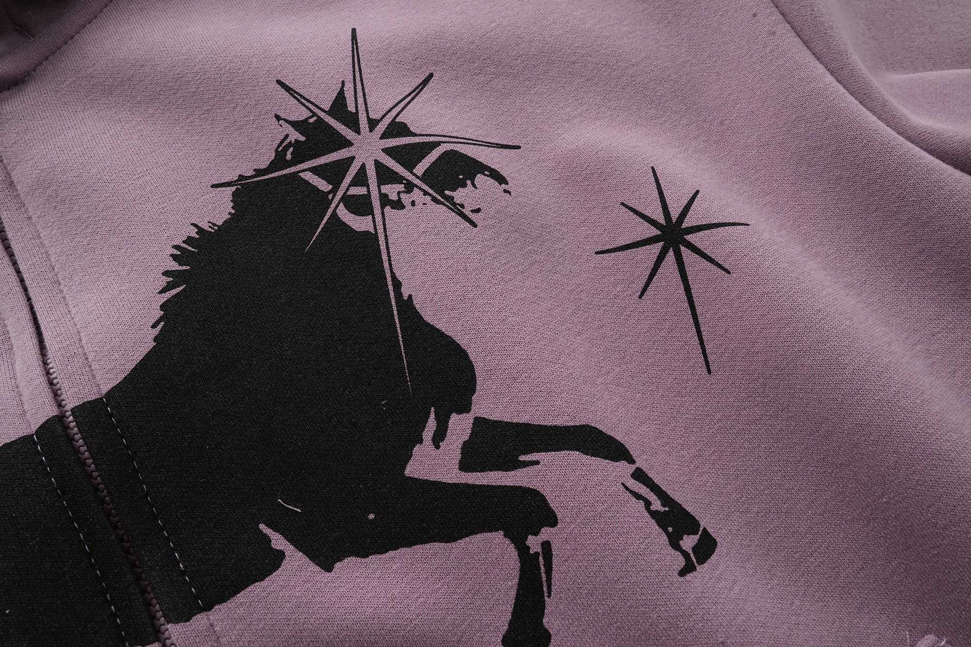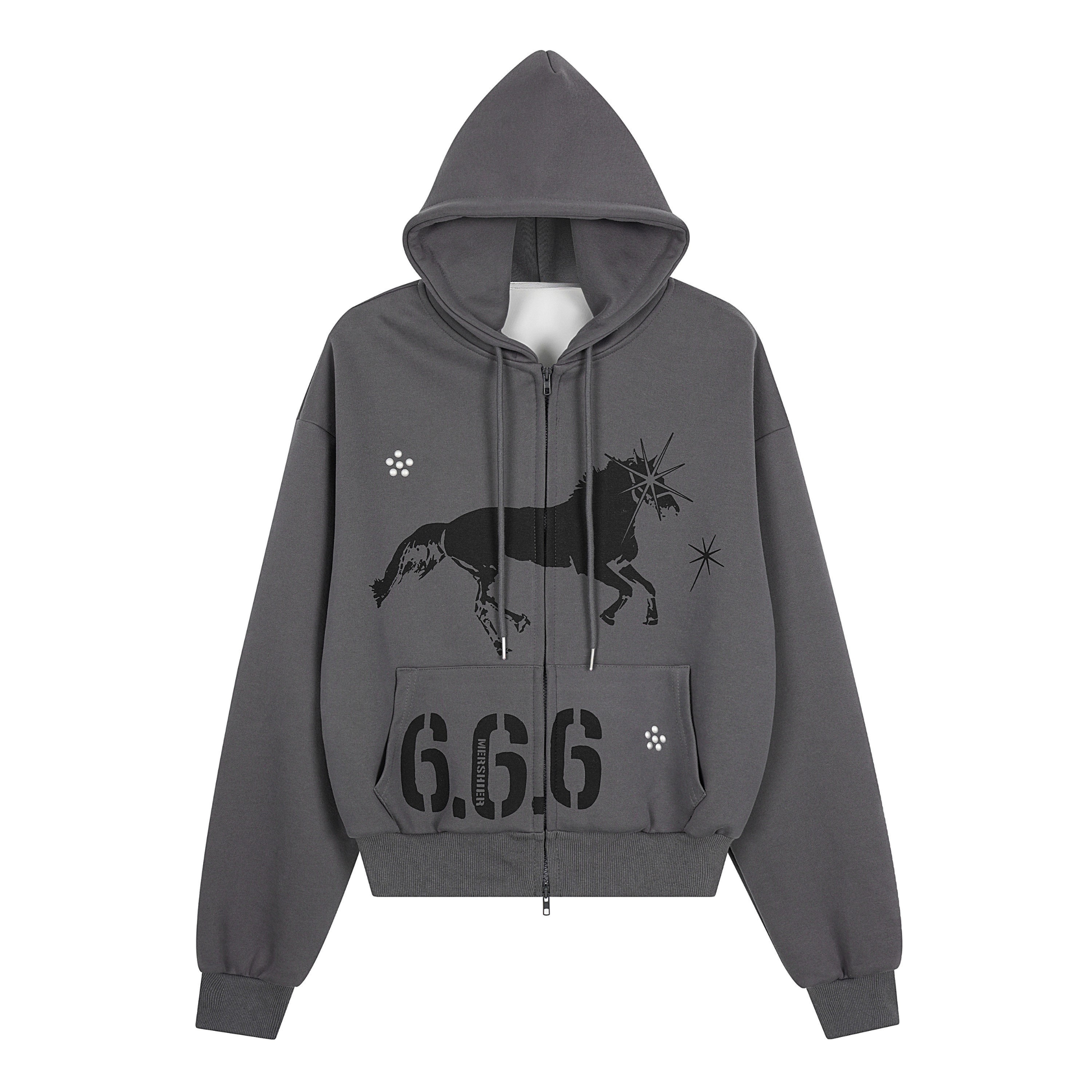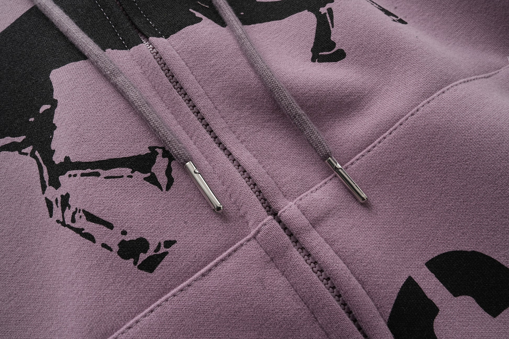 Clothing details: Graphic print, full zip closure, adjustable hood with drawstrings, front pockets, ribbed cuffs and hem, relaxed fit