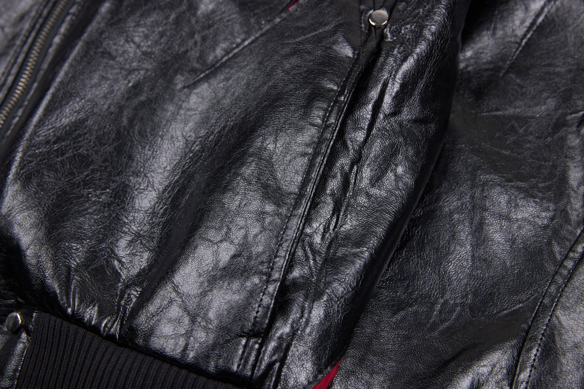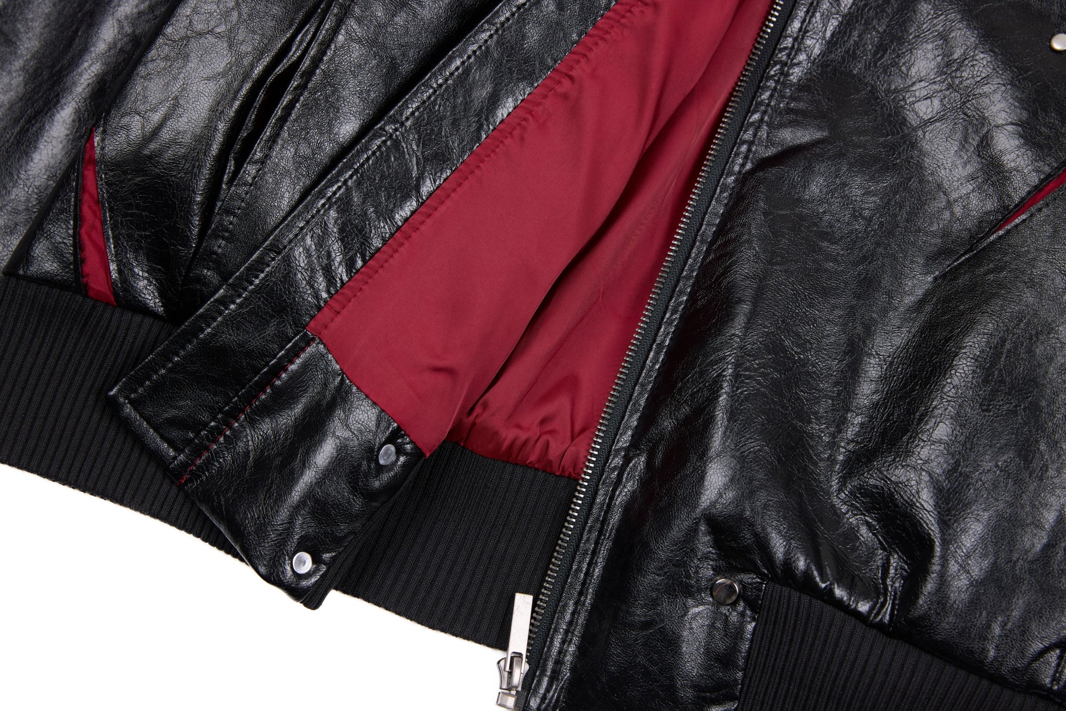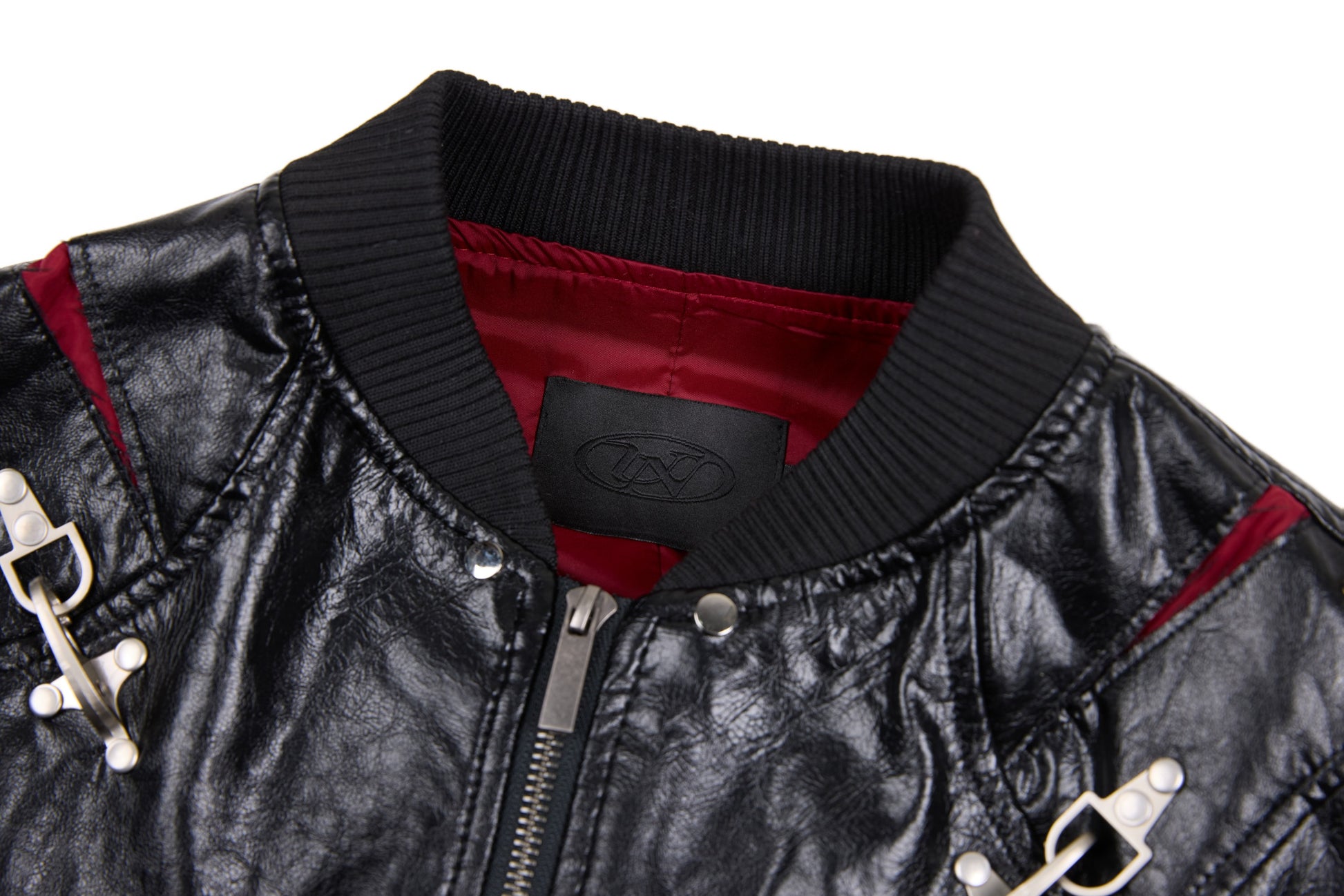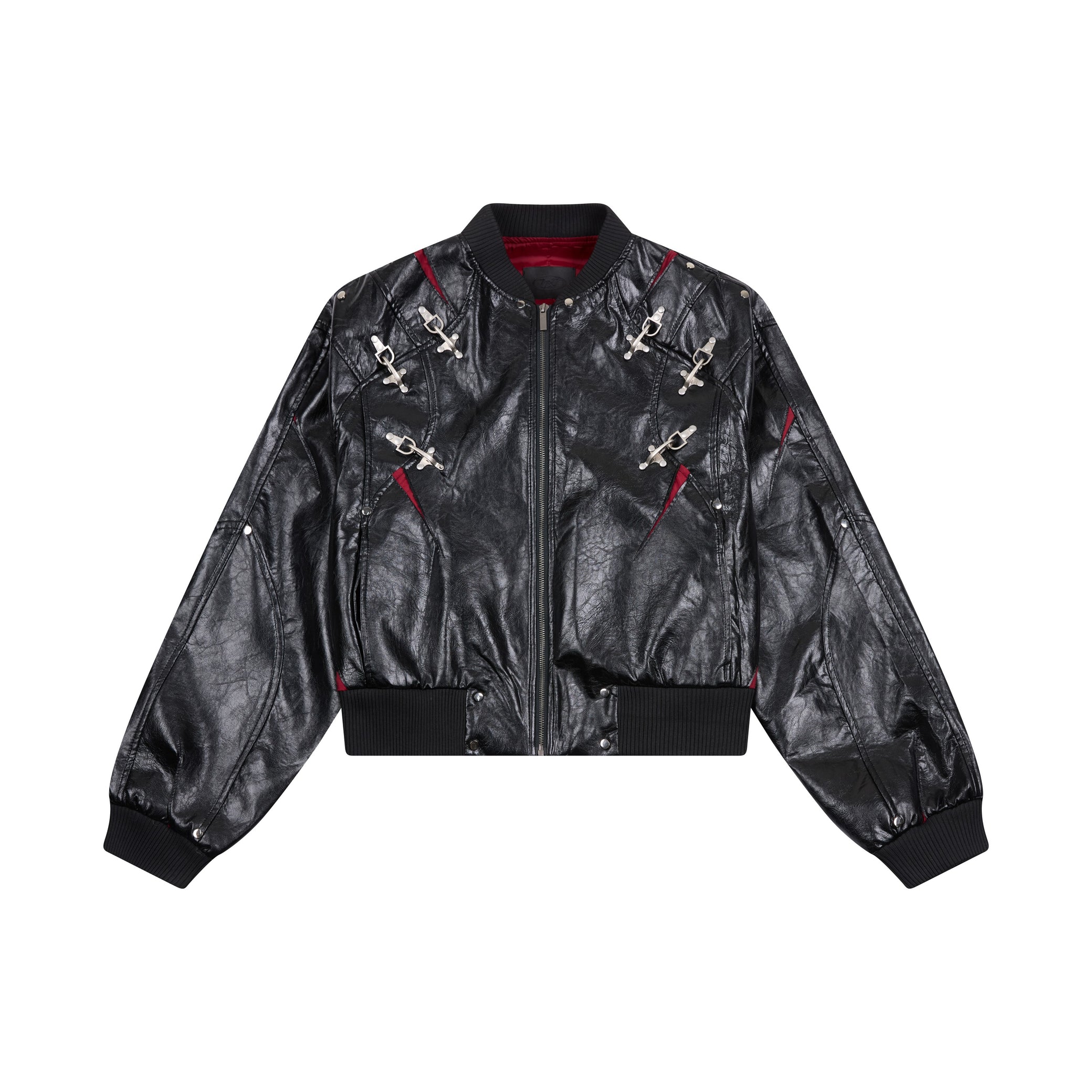 Clothing details: Faux leather construction, multi-point metal clasp hardware detailing, full zip front closure, ribbed collar, cuffs and hem, contrast interior panel accents, structured bomber fit.