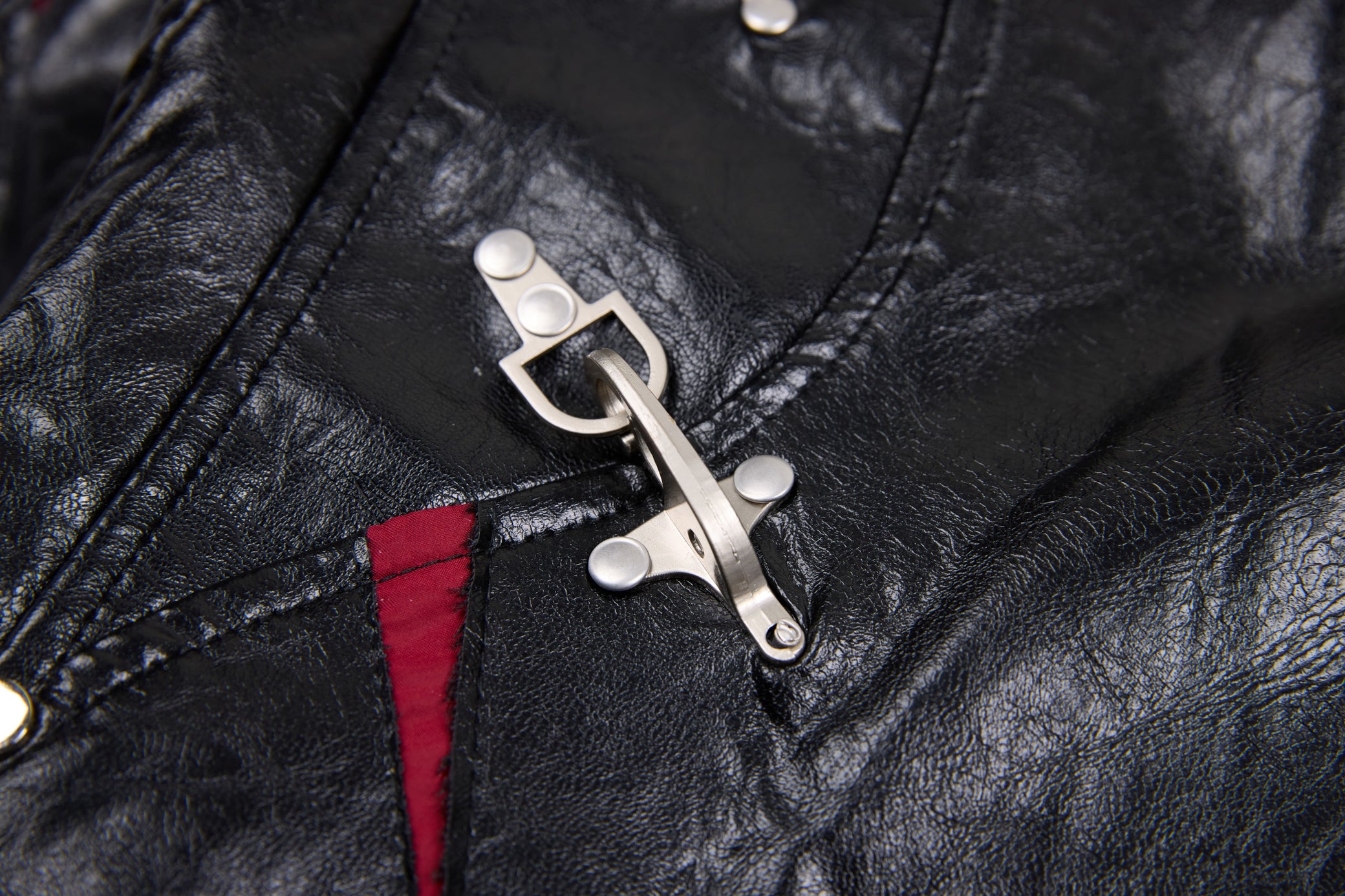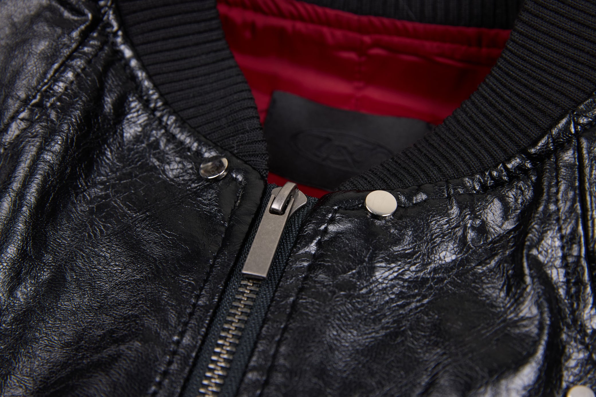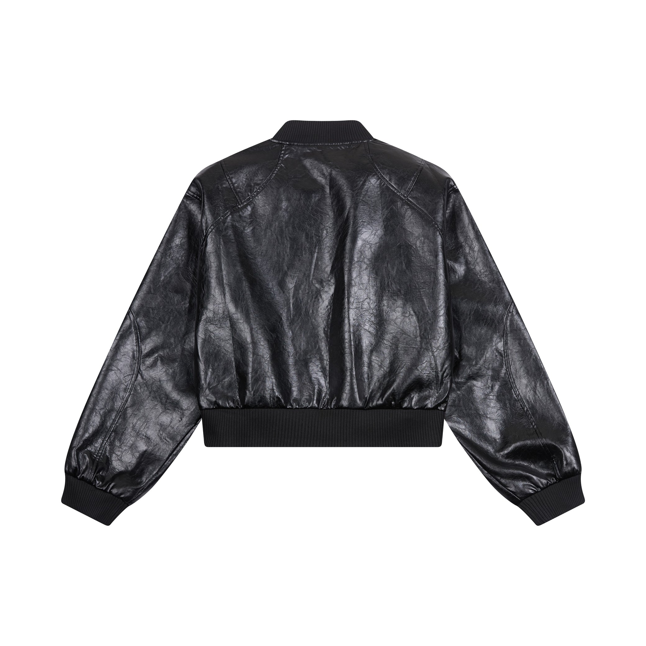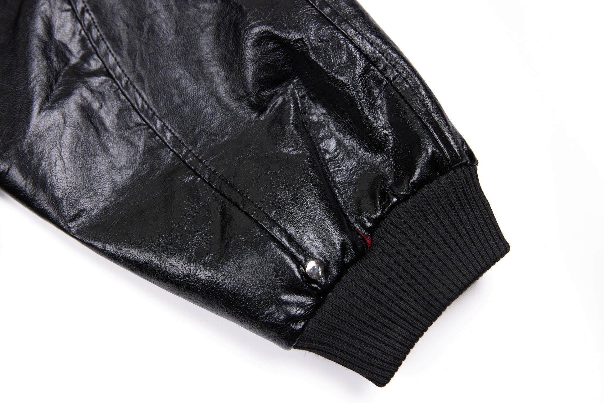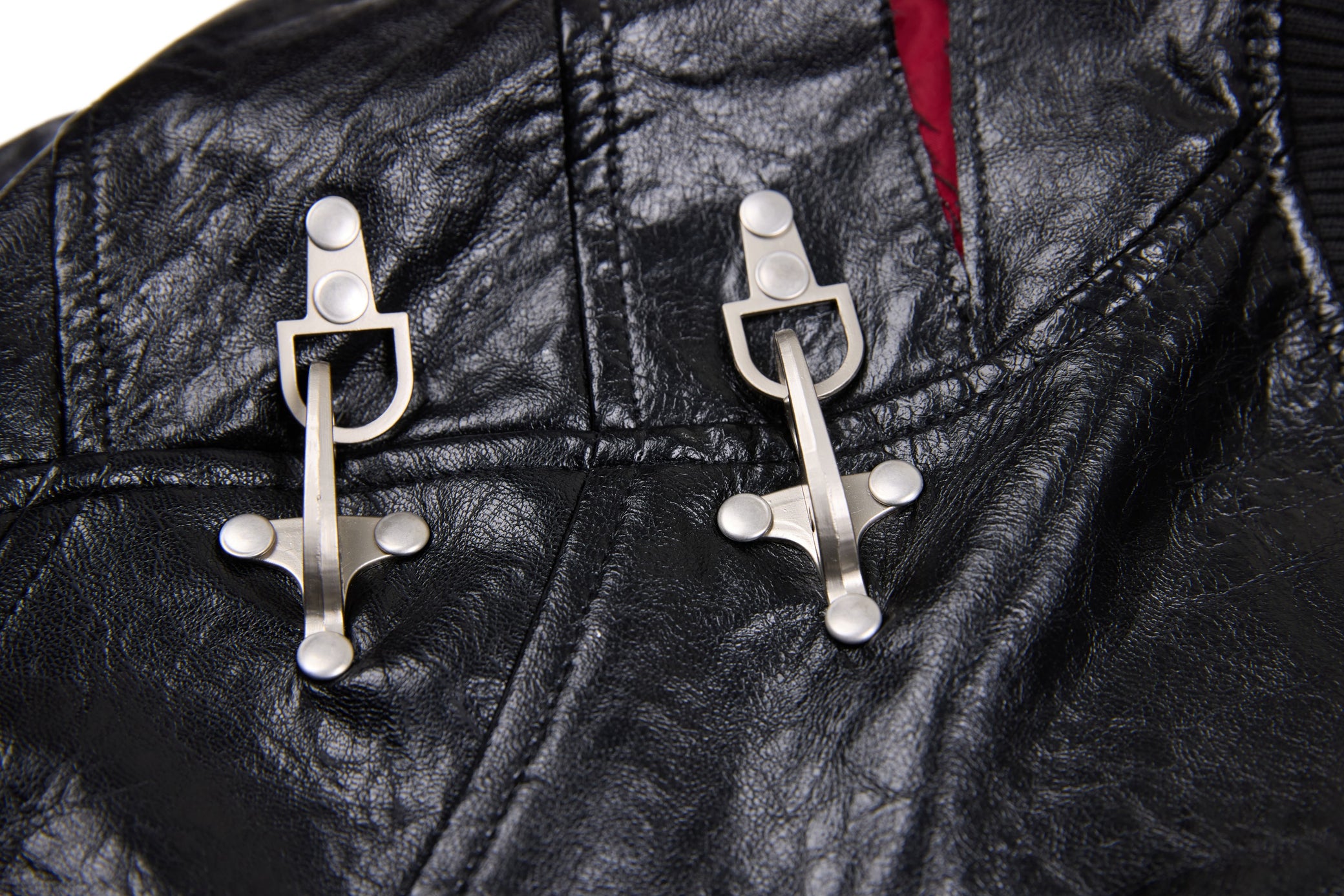 Clothing details: Faux leather construction, multi-point metal clasp hardware detailing, full zip front closure, ribbed collar, cuffs and hem, contrast interior panel accents, structured bomber fit.