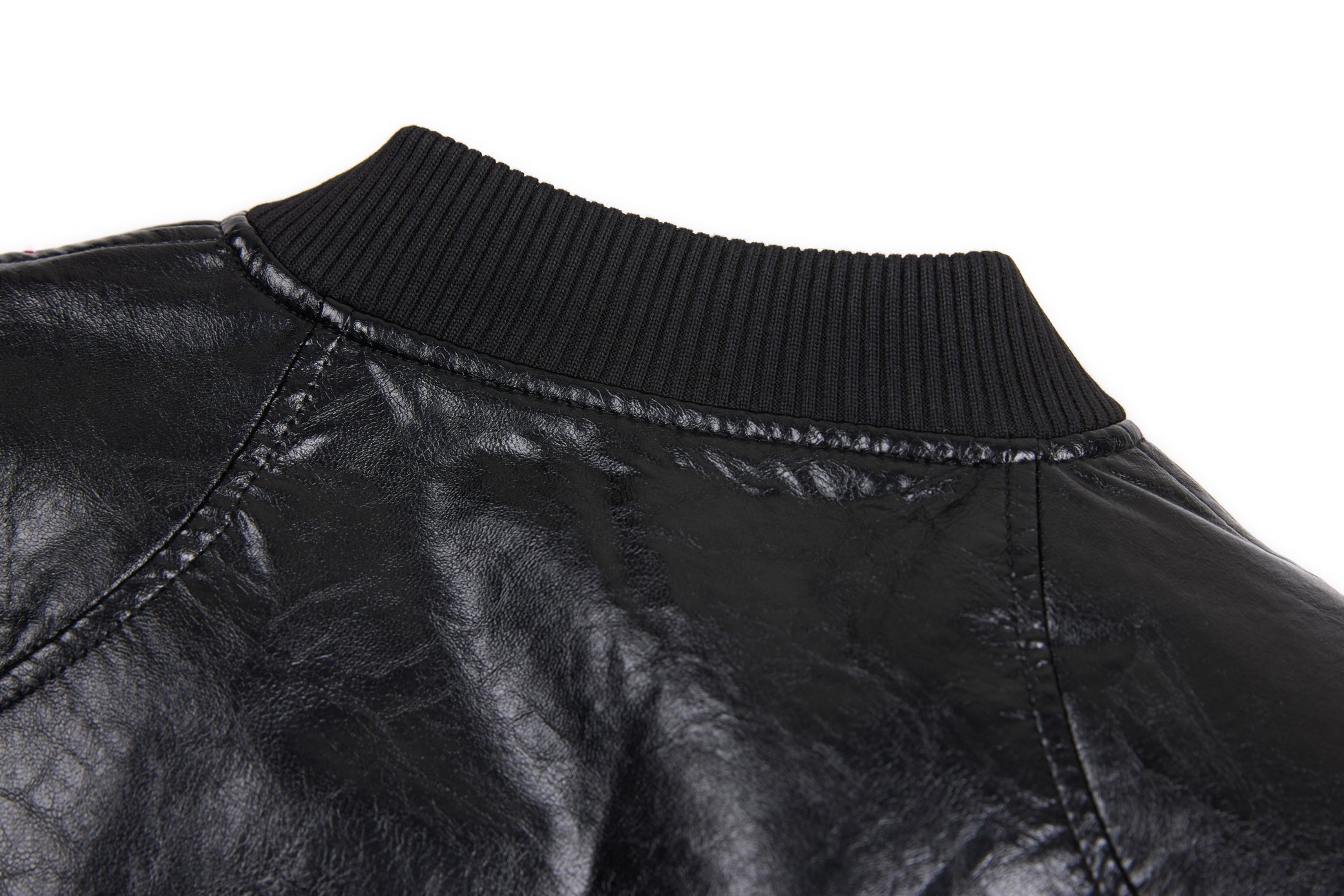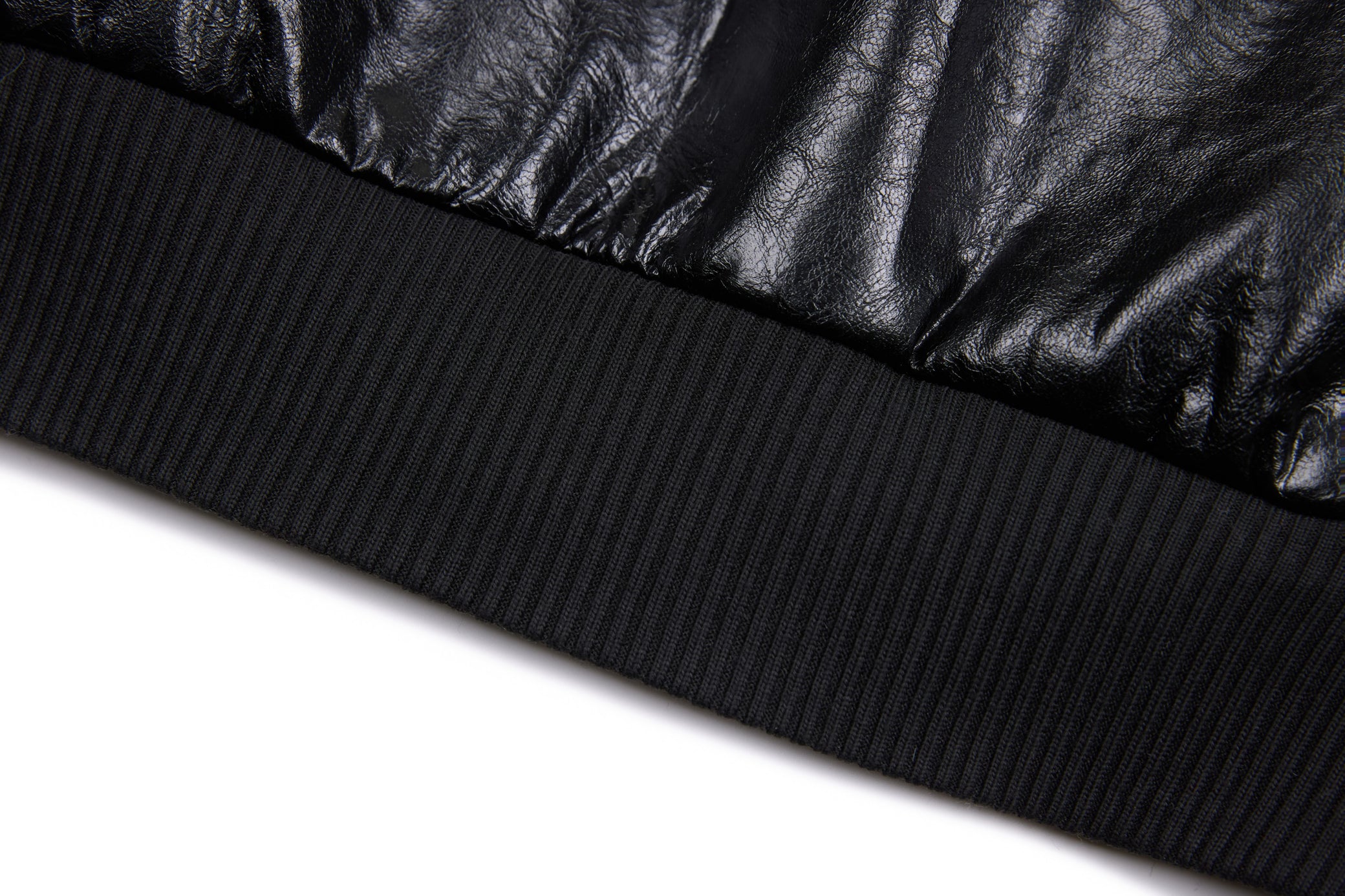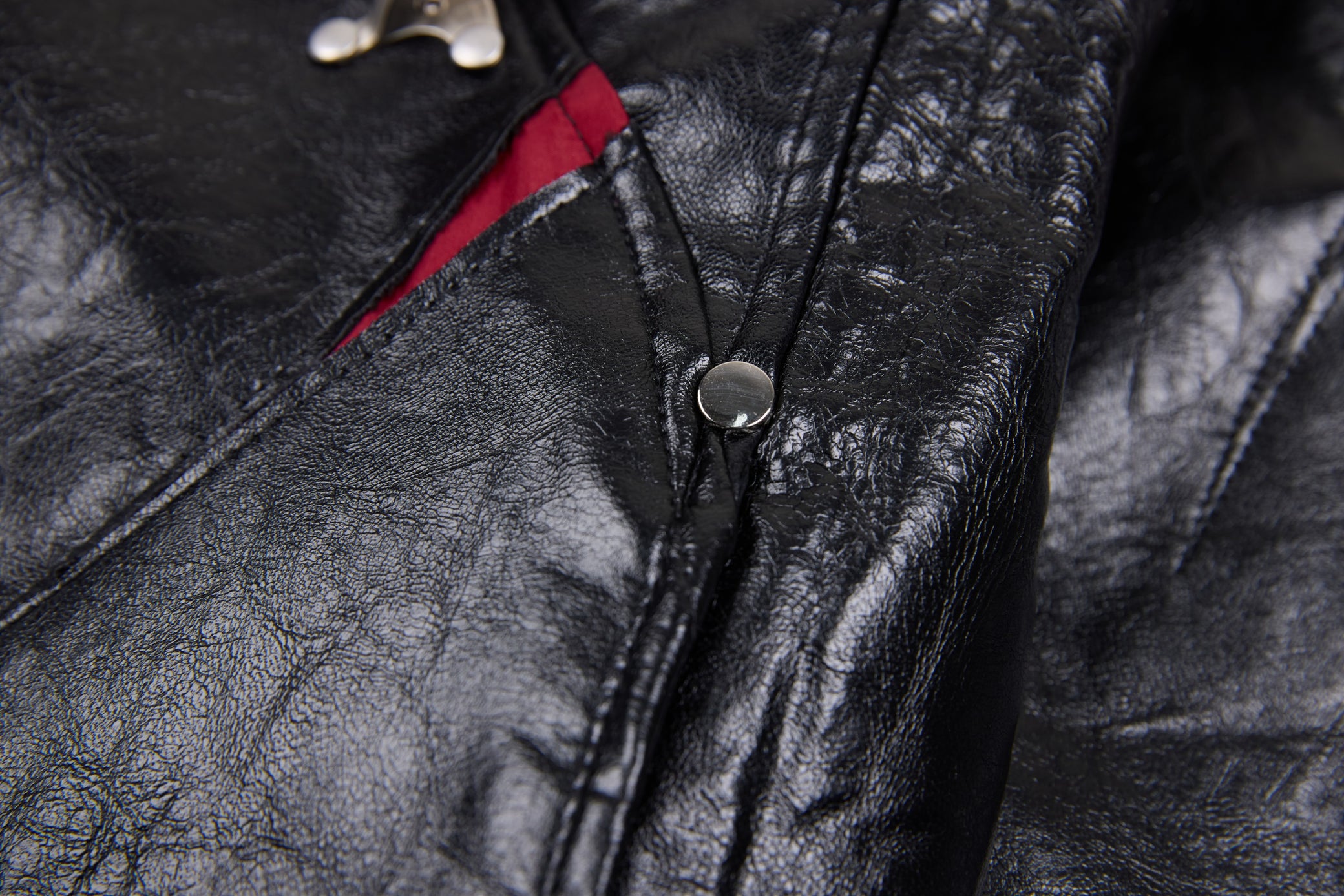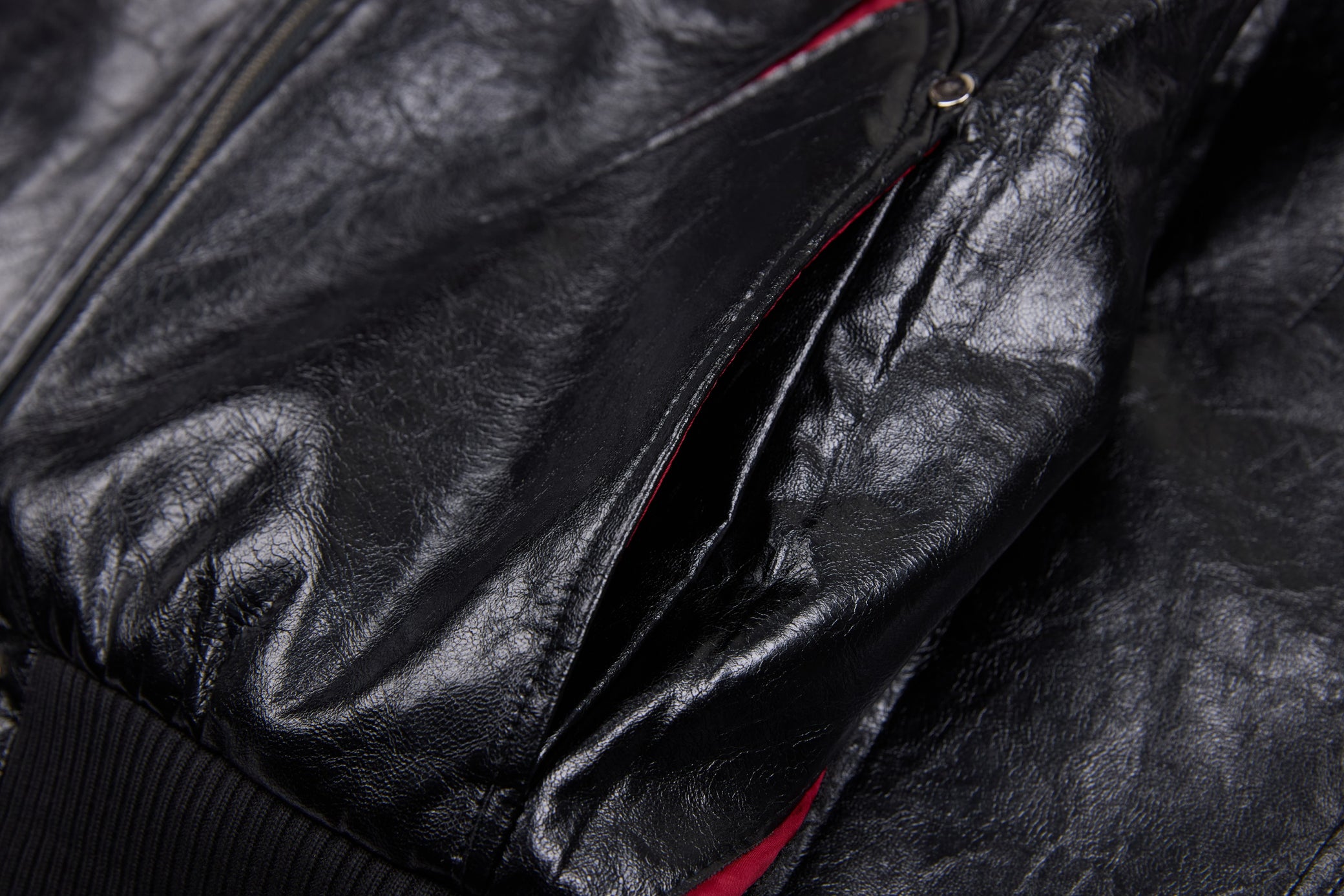 Clothing details: Faux leather construction, multi-point metal clasp hardware detailing, full zip front closure, ribbed collar, cuffs and hem, contrast interior panel accents, structured bomber fit.