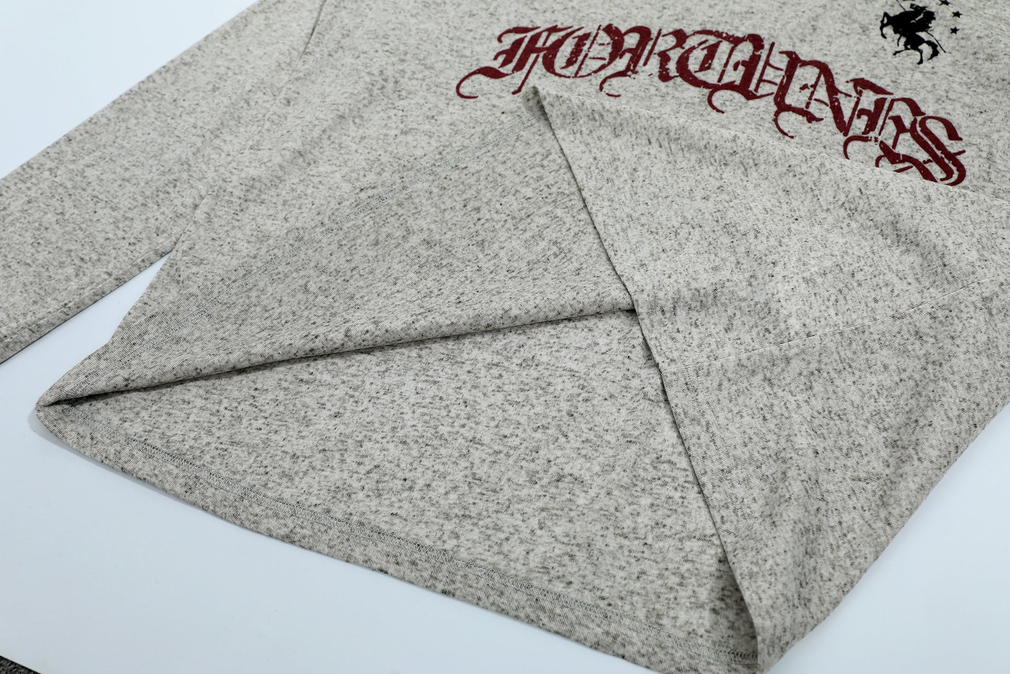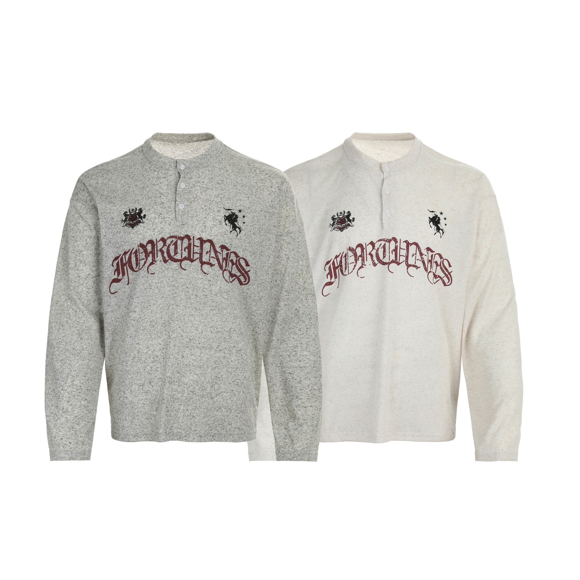 Omirad Heraldic Henley Long Sleeve is constructed from Premium Performance Mesh, combining lightweight breathability with a refined, structured drape. Featuring a classic henley neckline with button detailing, this piece is elevated by medieval-inspired heraldic graphics and gothic typography across the chest. The mesh fabric offers enhanced airflow while maintaining a smooth, premium hand feel, making it ideal for layered styling or standalone wear. Designed with a relaxed silhouette and subtle texture, it bridges vintage academic aesthetics with modern performance construction.