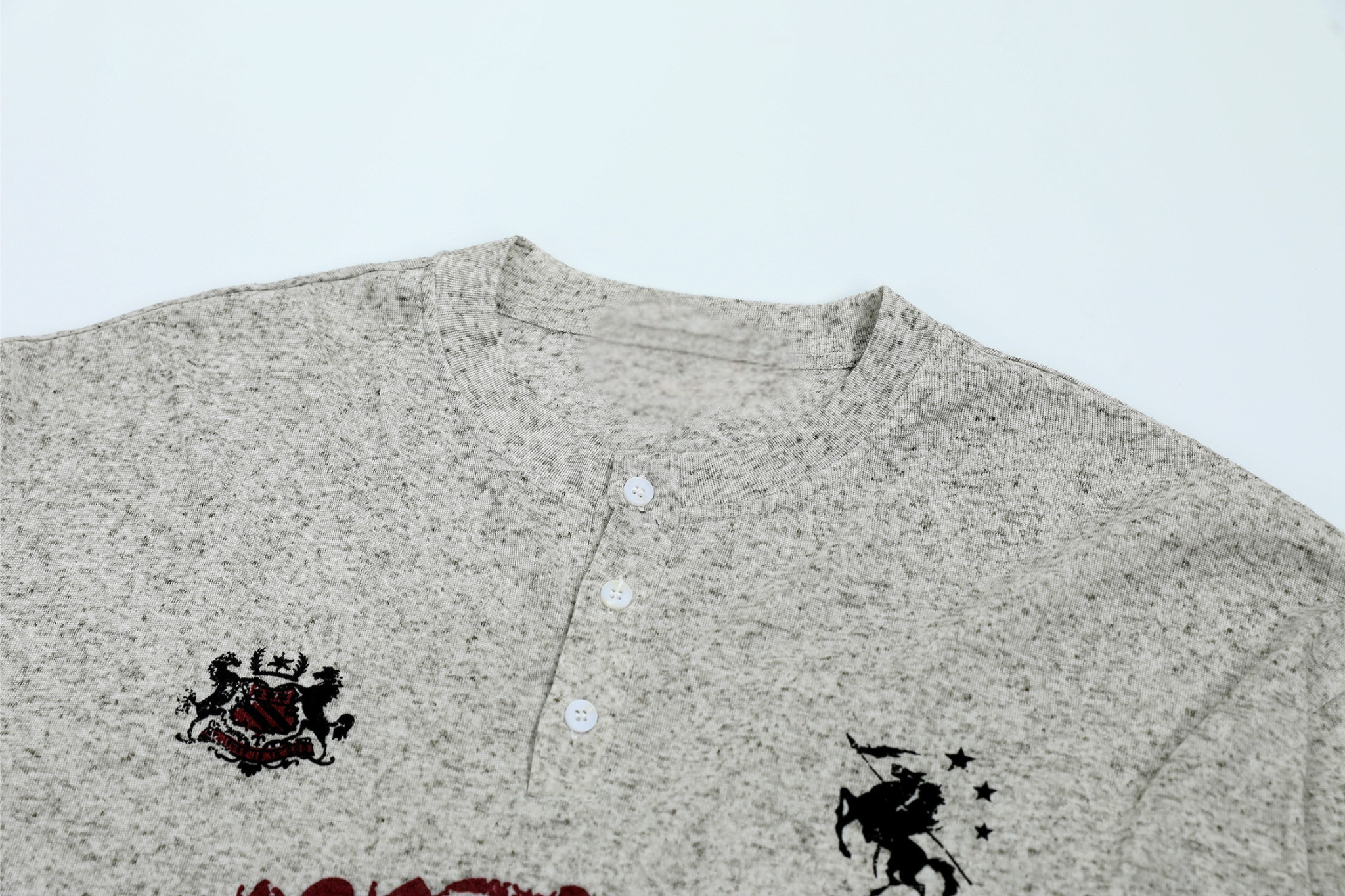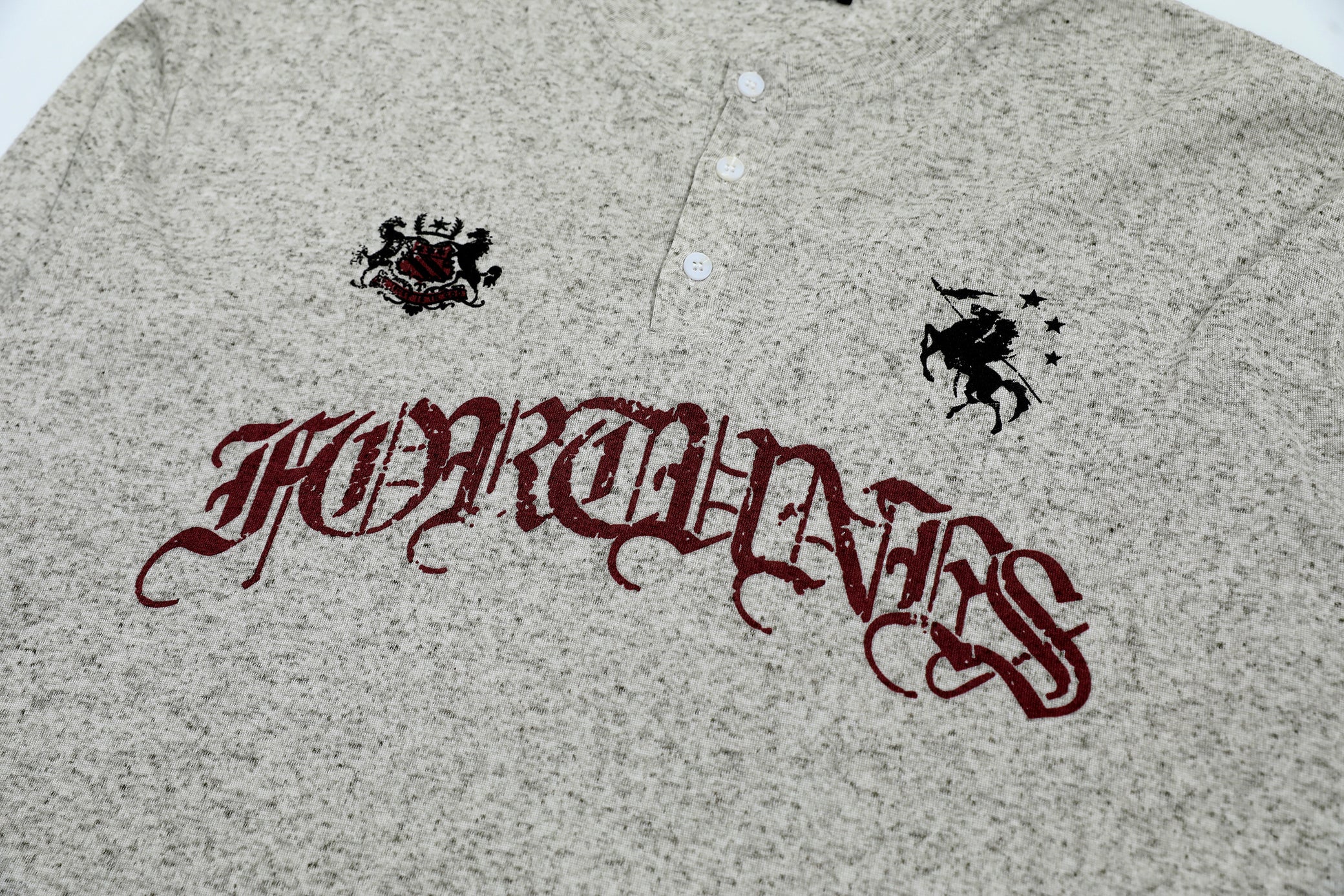 Clothing details: Henley button placket, heraldic crest graphics, gothic typography print, breathable mesh structure, lightweight feel, relaxed fit