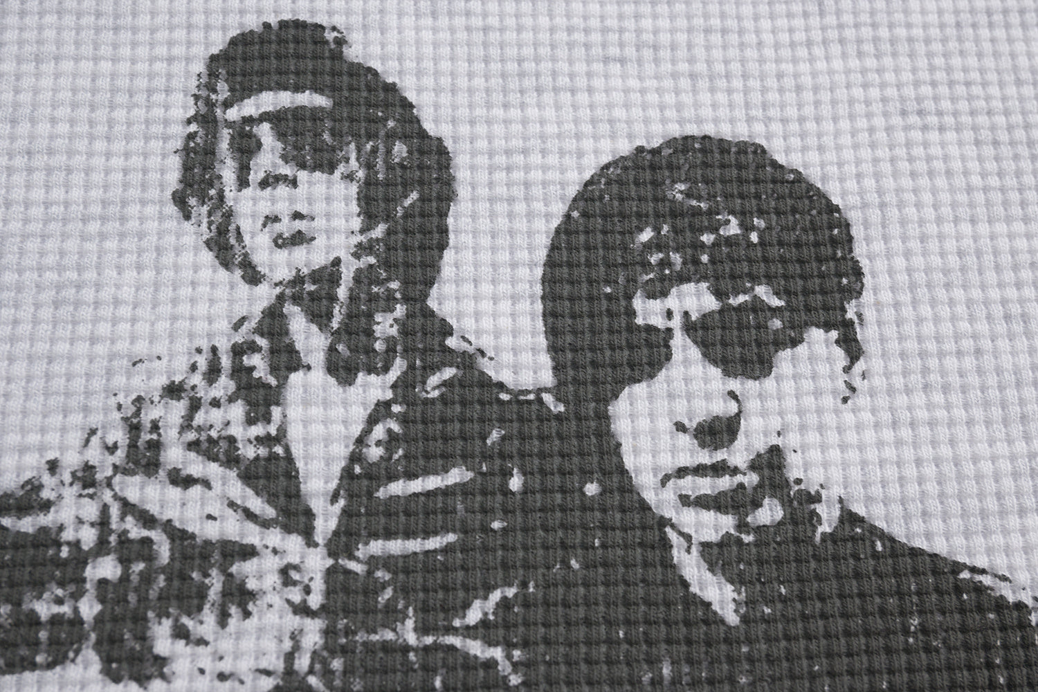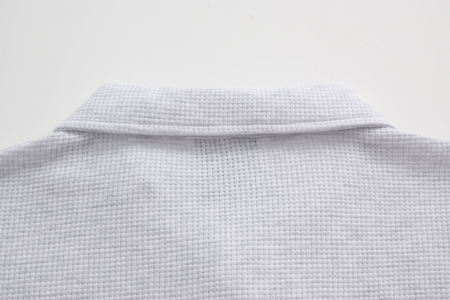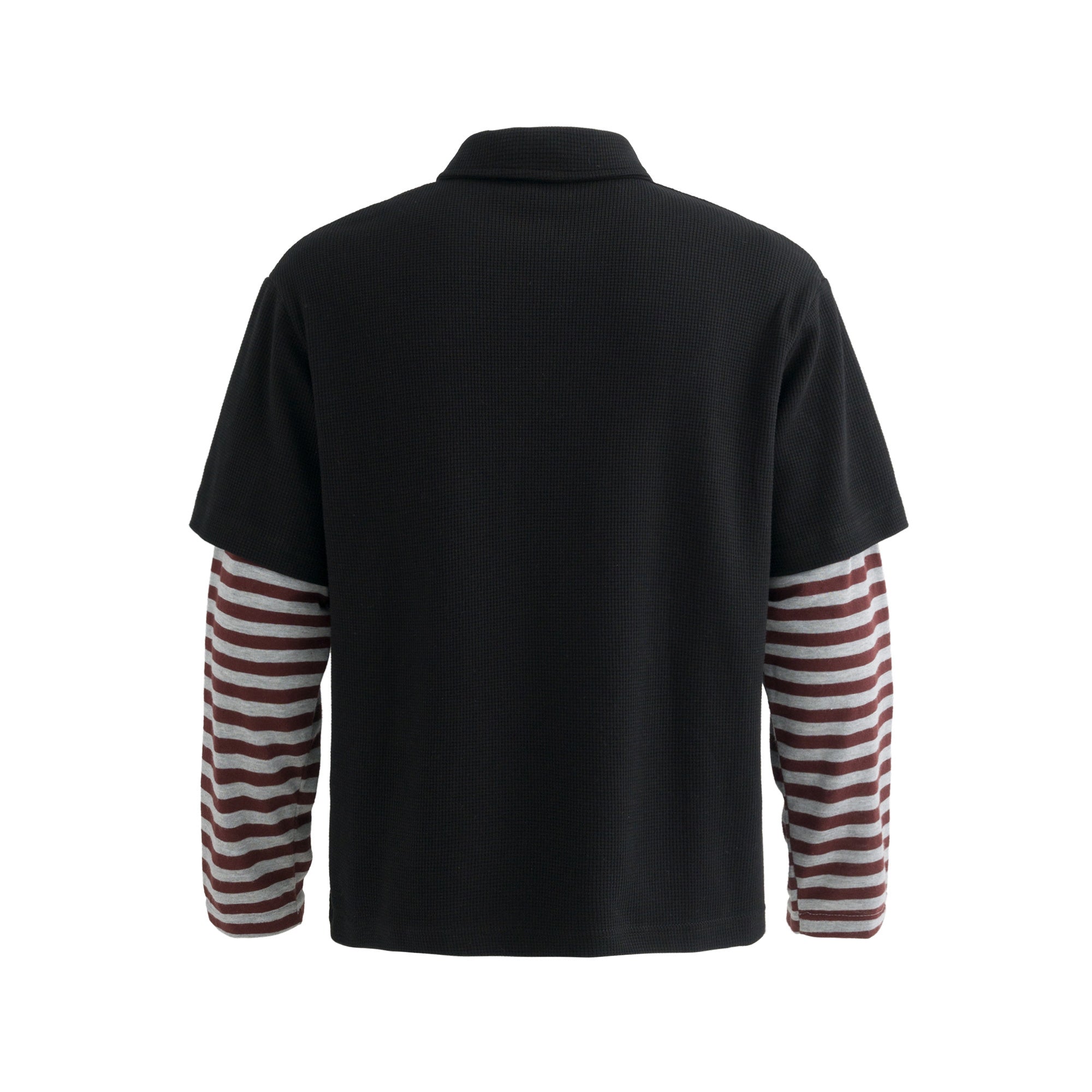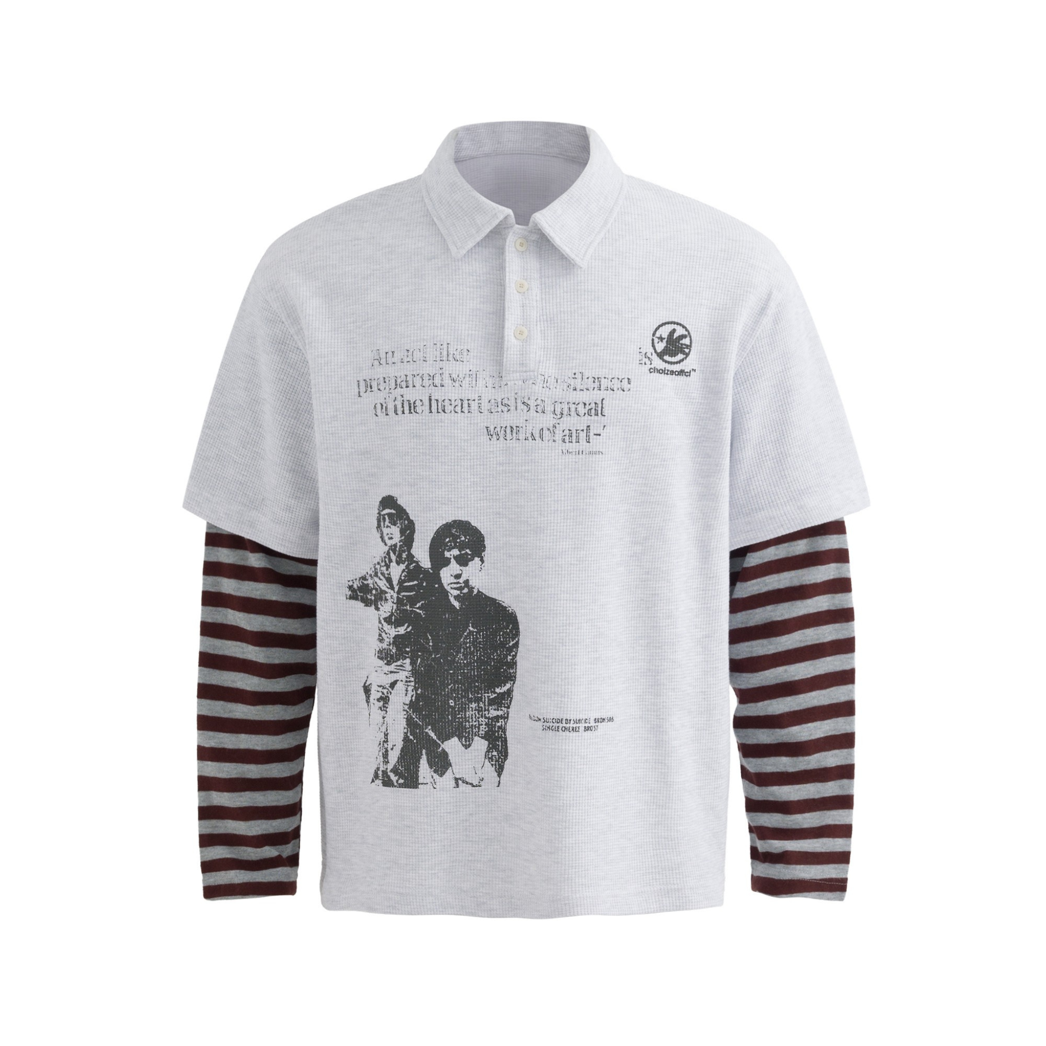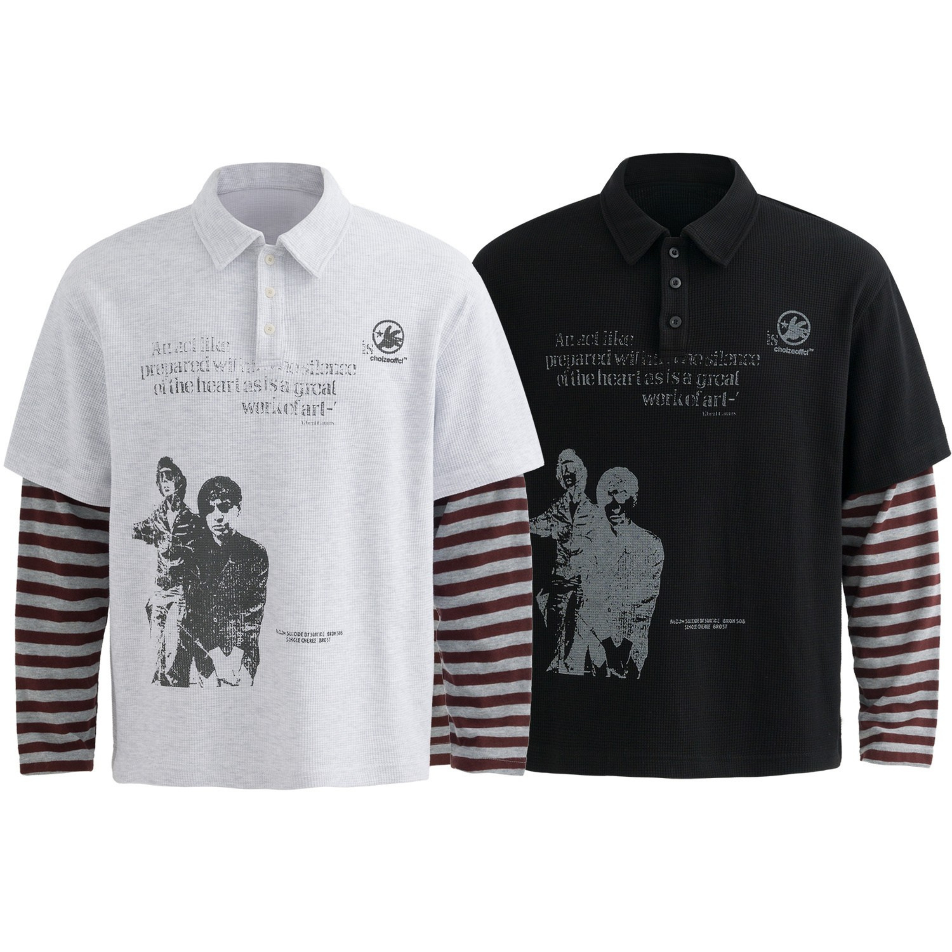 The Omirad Layered Graphic Polo Long Sleeve Tee fuses retro college aesthetics with streetwear rebellion. Featuring a double-layer design that combines a short-sleeve polo with striped long sleeves, it delivers a built-in stacked look for effortless layering. The textured waffle knit adds dimension, while the monochrome photo print and gothic lettering create a nostalgic punk-inspired edge. Perfect for daily wear with cargo pants or denim for a relaxed statement fit.