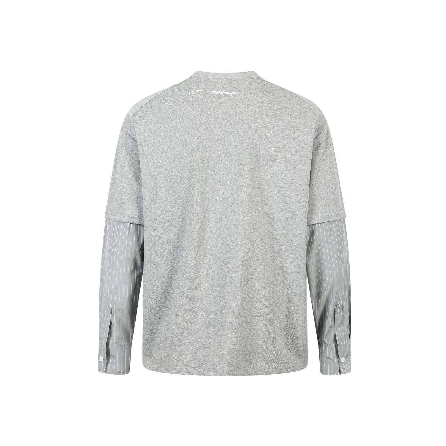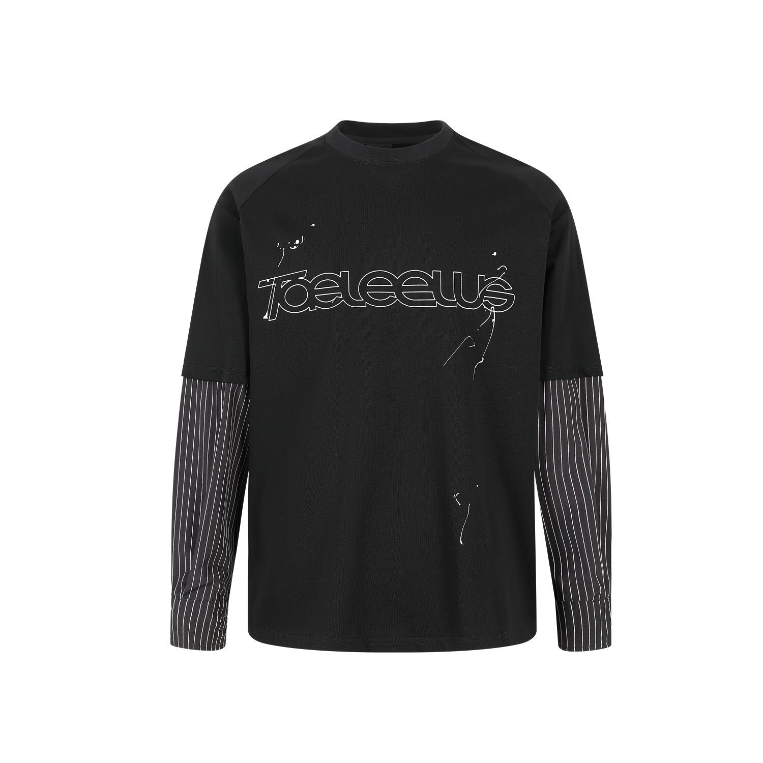 Clothing details: Integrated layered construction, short-sleeve outer tee with contrast striped long sleeves, crew neckline, relaxed straight fit, minimal chest logo detailing, lightweight breathable athletic fabric, designed for all-season styling, available in multiple colorways.