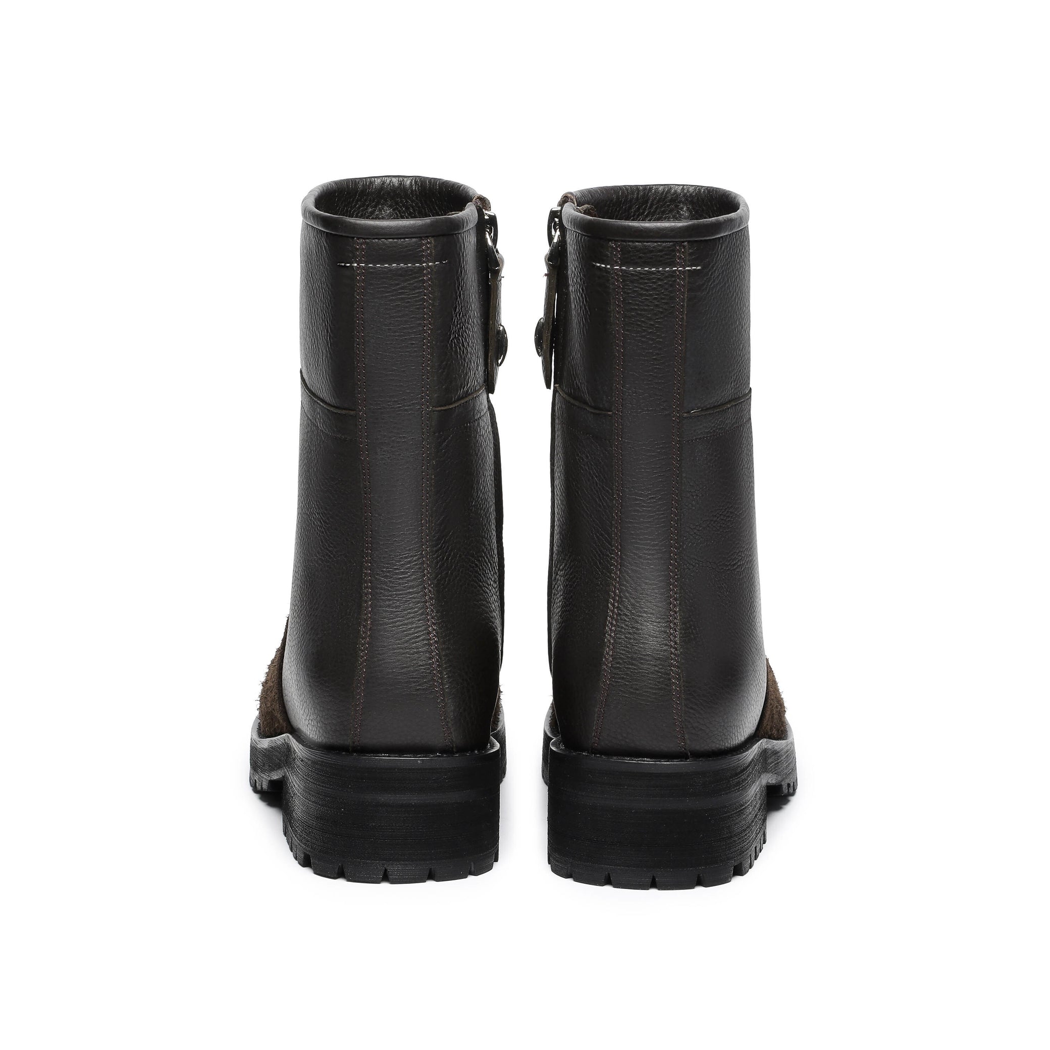 Clothing details: Genuine cowhide leather upper, textured front panel detailing, side zip closure for easy wear, reinforced metal toe plate, rugged lug outsole for traction, ankle-height silhouette with solid structured support.
