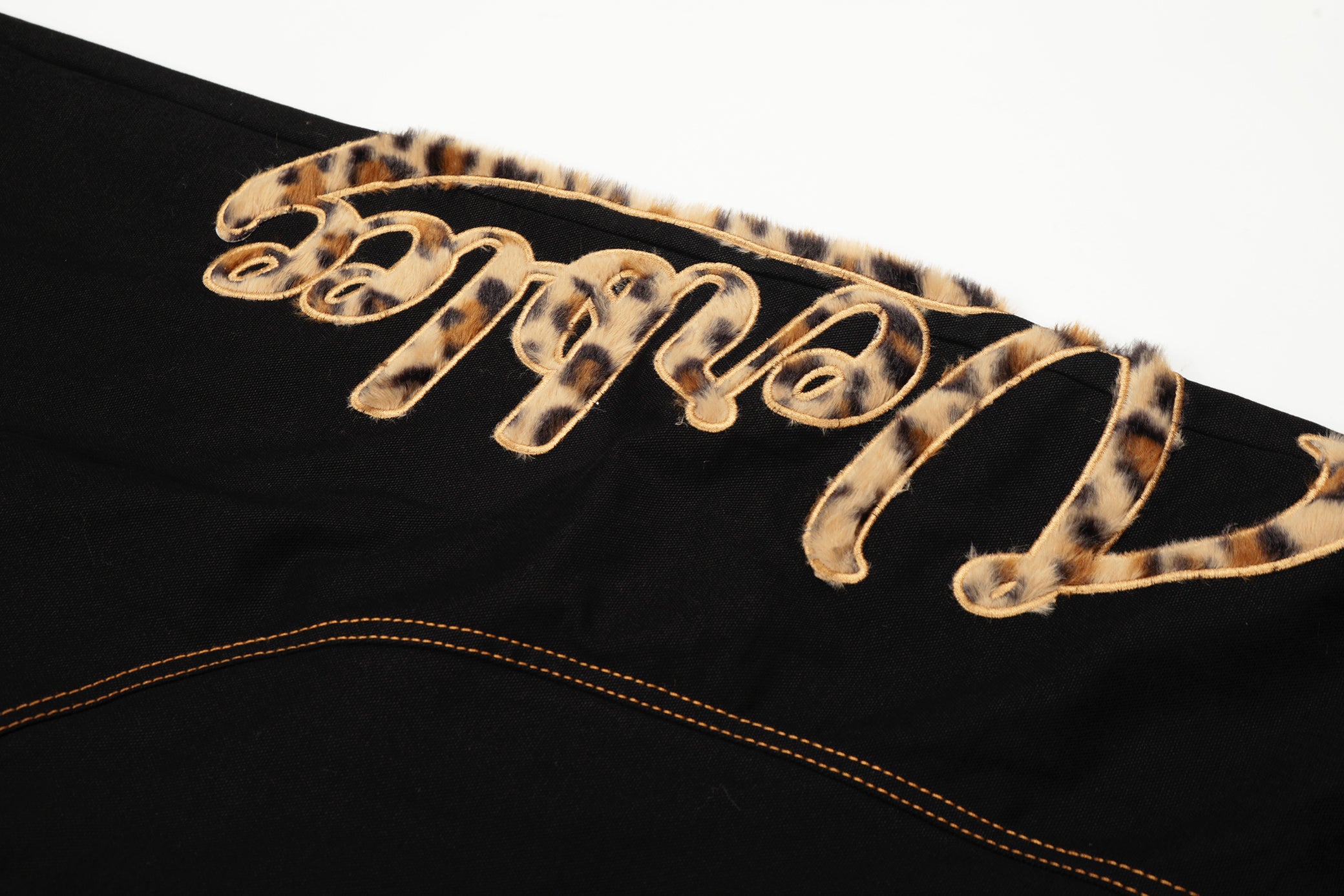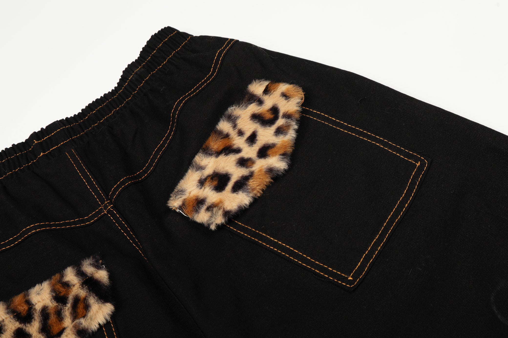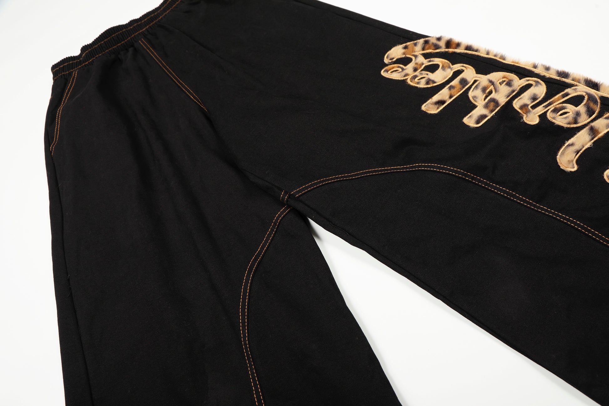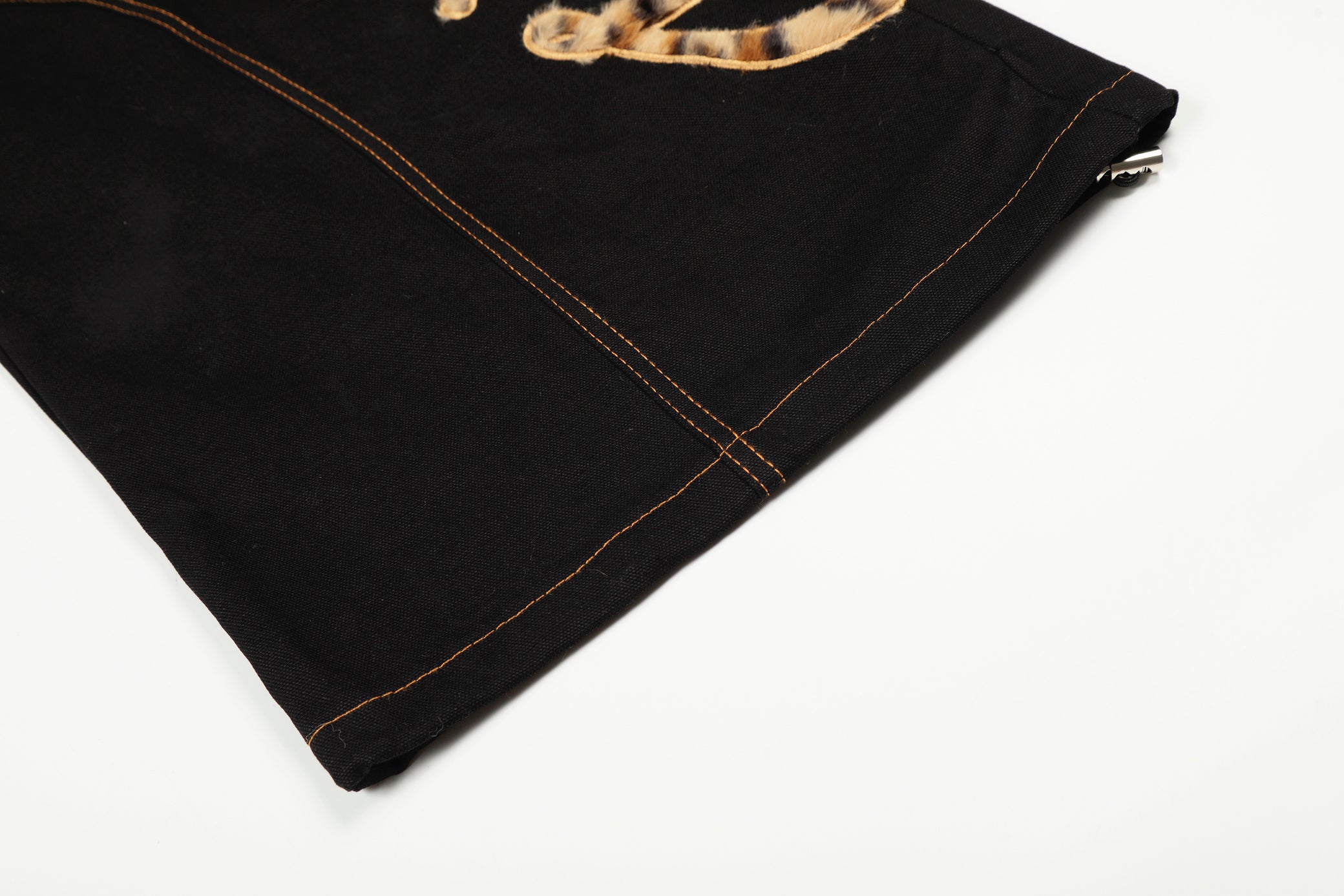 Clothing details: Leopard-print patch accents, applique lettering, contrast stitching, wide-leg fit, back pockets