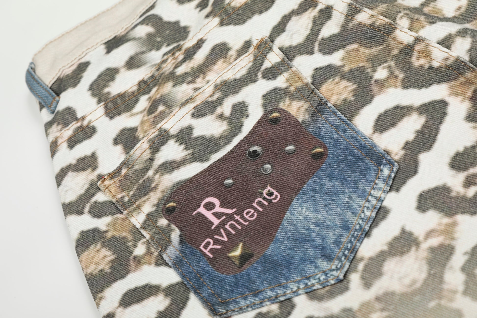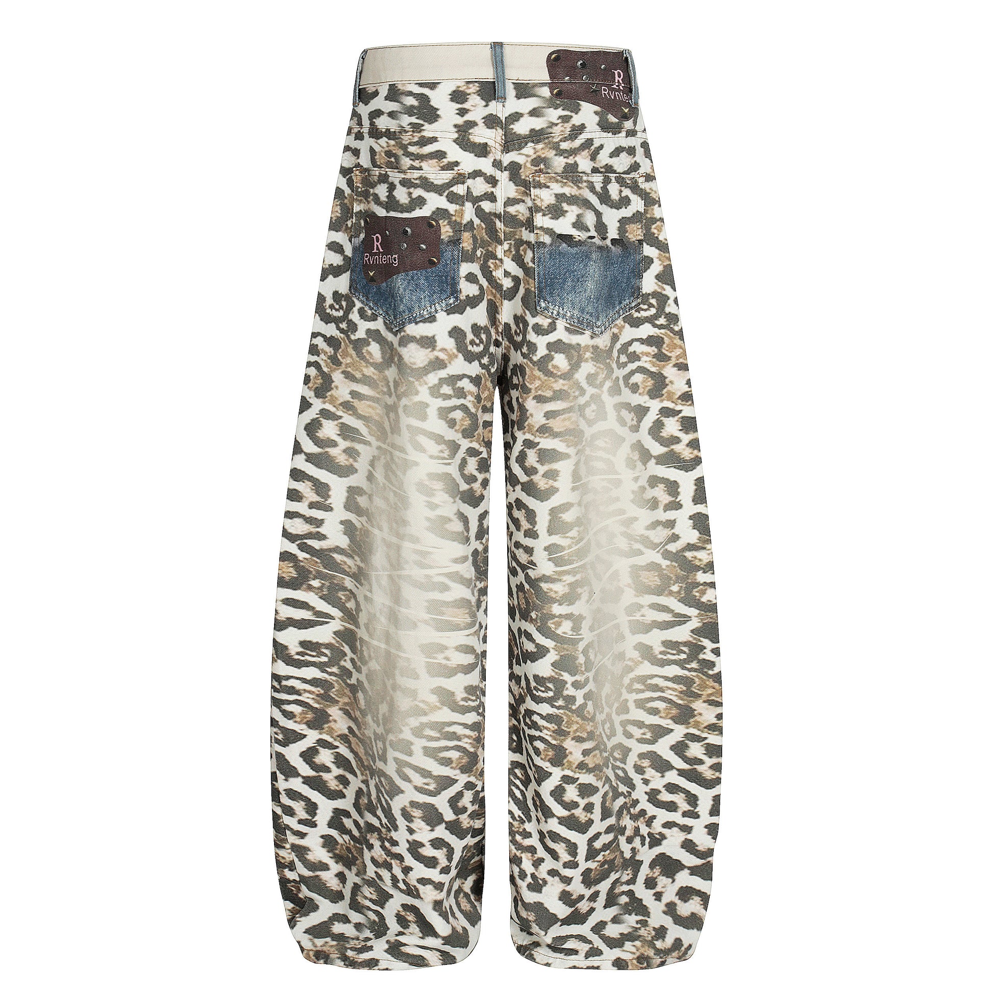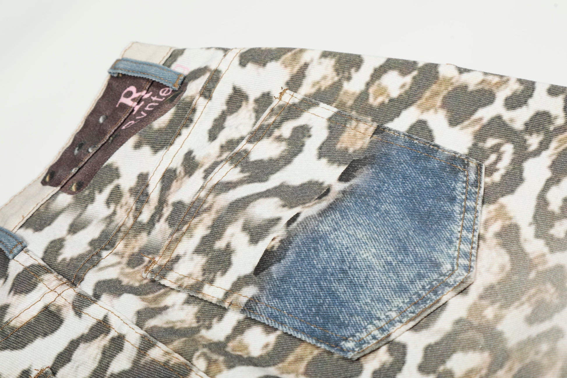 Clothing details: All-over leopard print, denim waistband and pocket contrast, grommet belt detail, wide-leg silhouette, vintage wash finish, and relaxed streetwear fit.