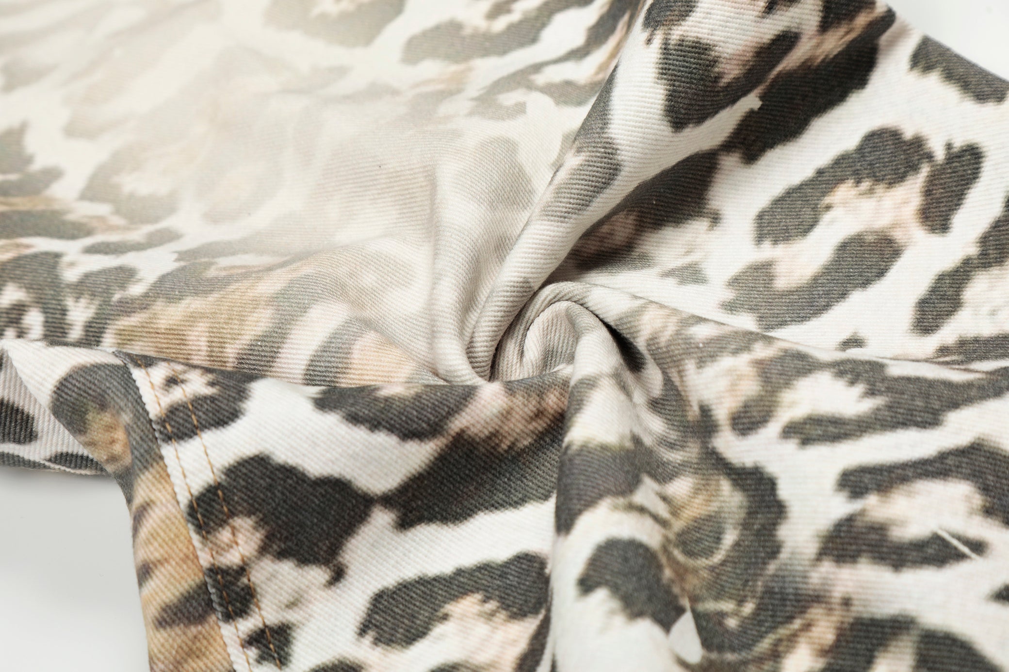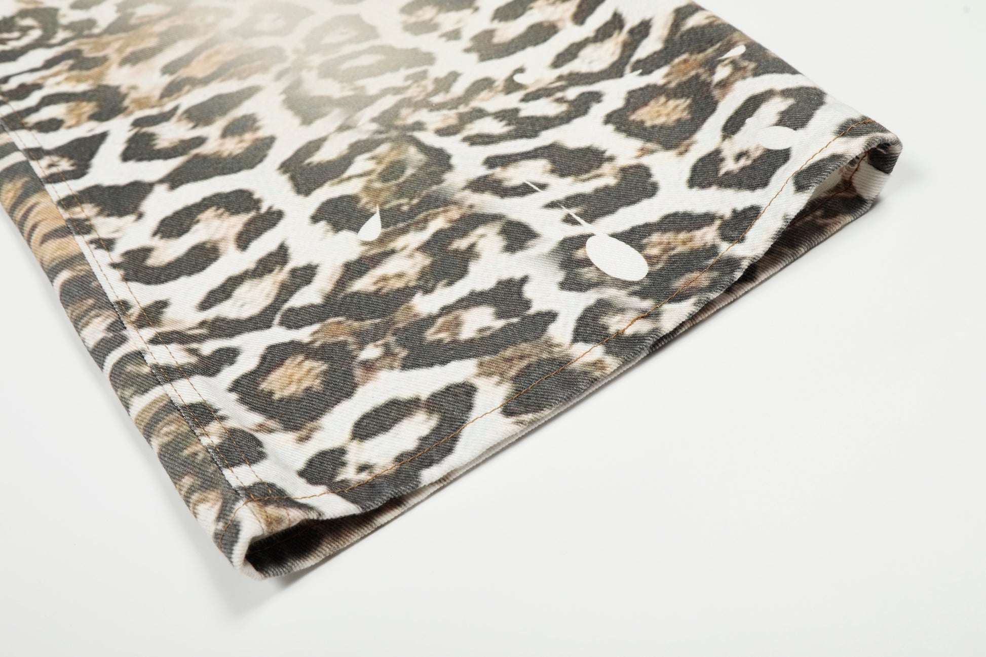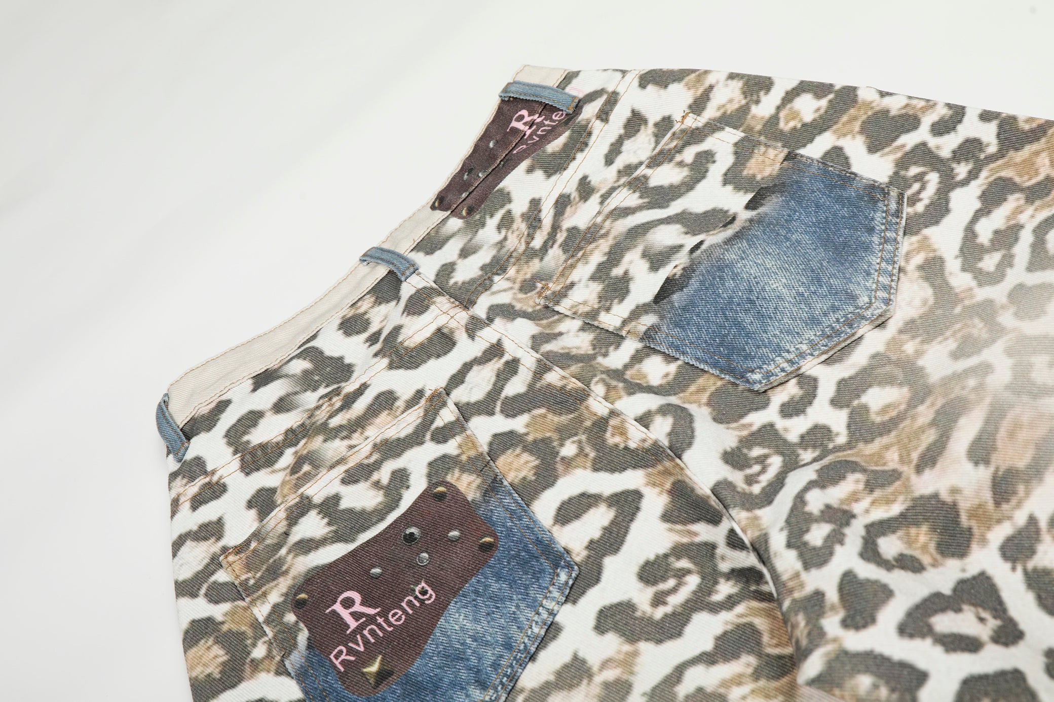 Clothing details: All-over leopard print, denim waistband and pocket contrast, grommet belt detail, wide-leg silhouette, vintage wash finish, and relaxed streetwear fit.