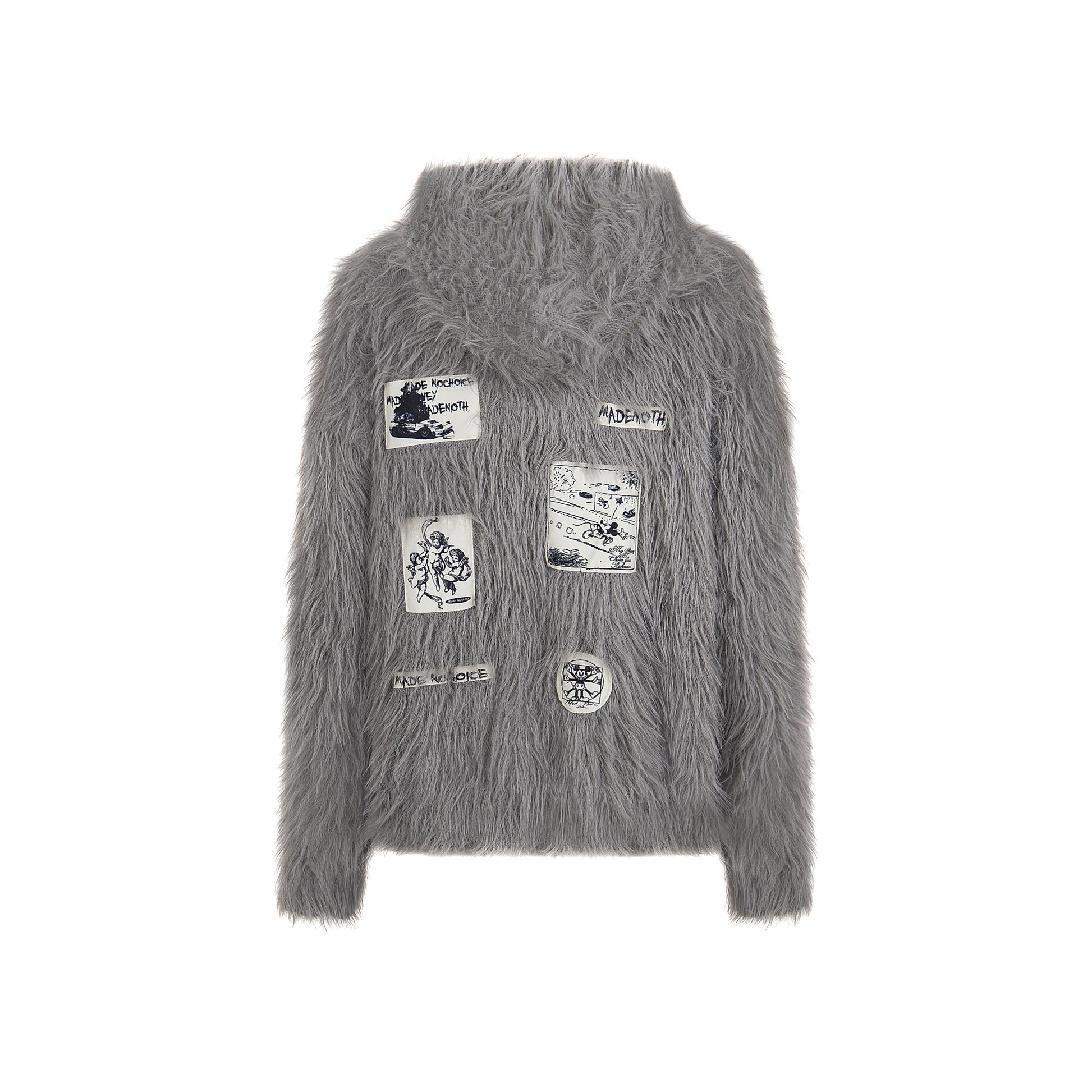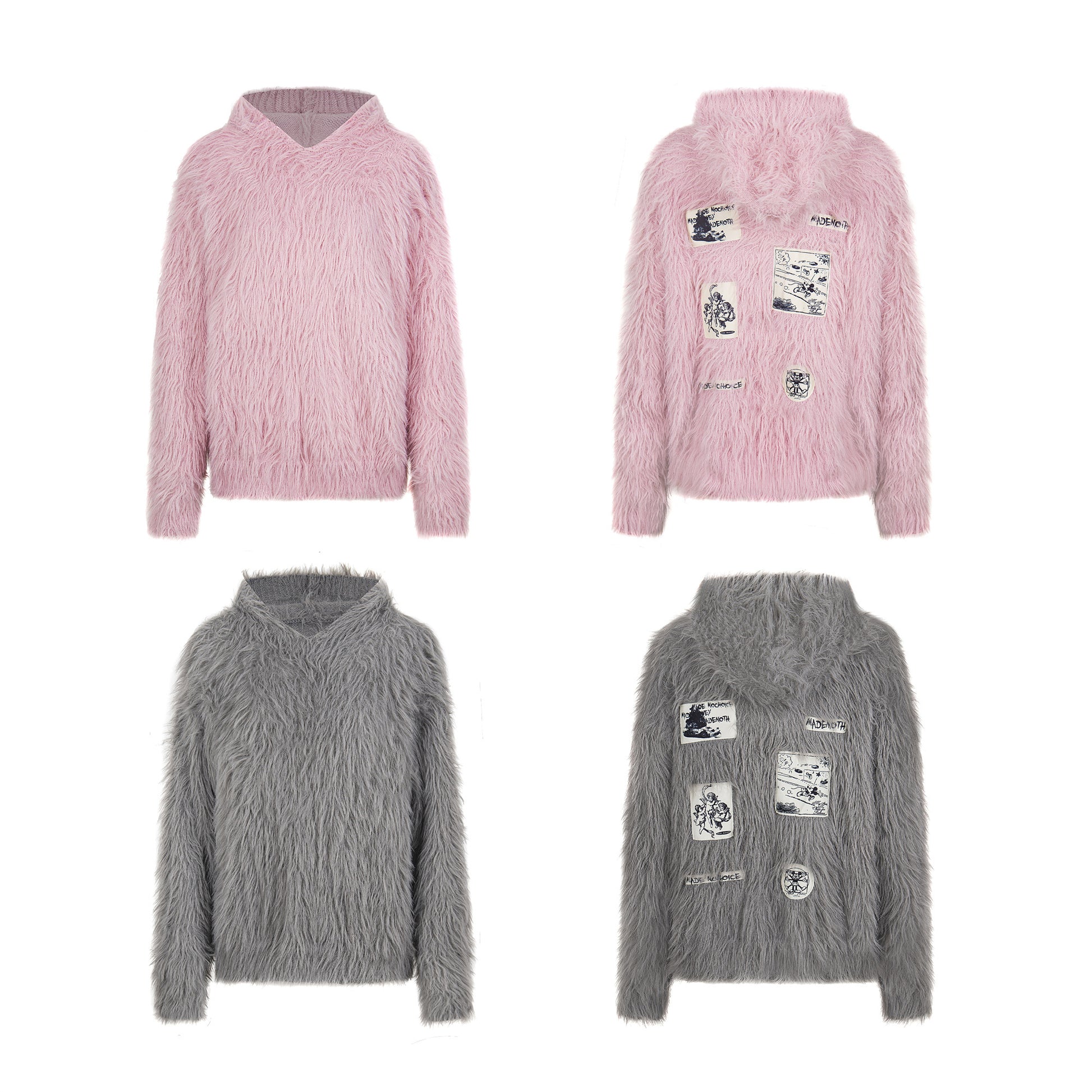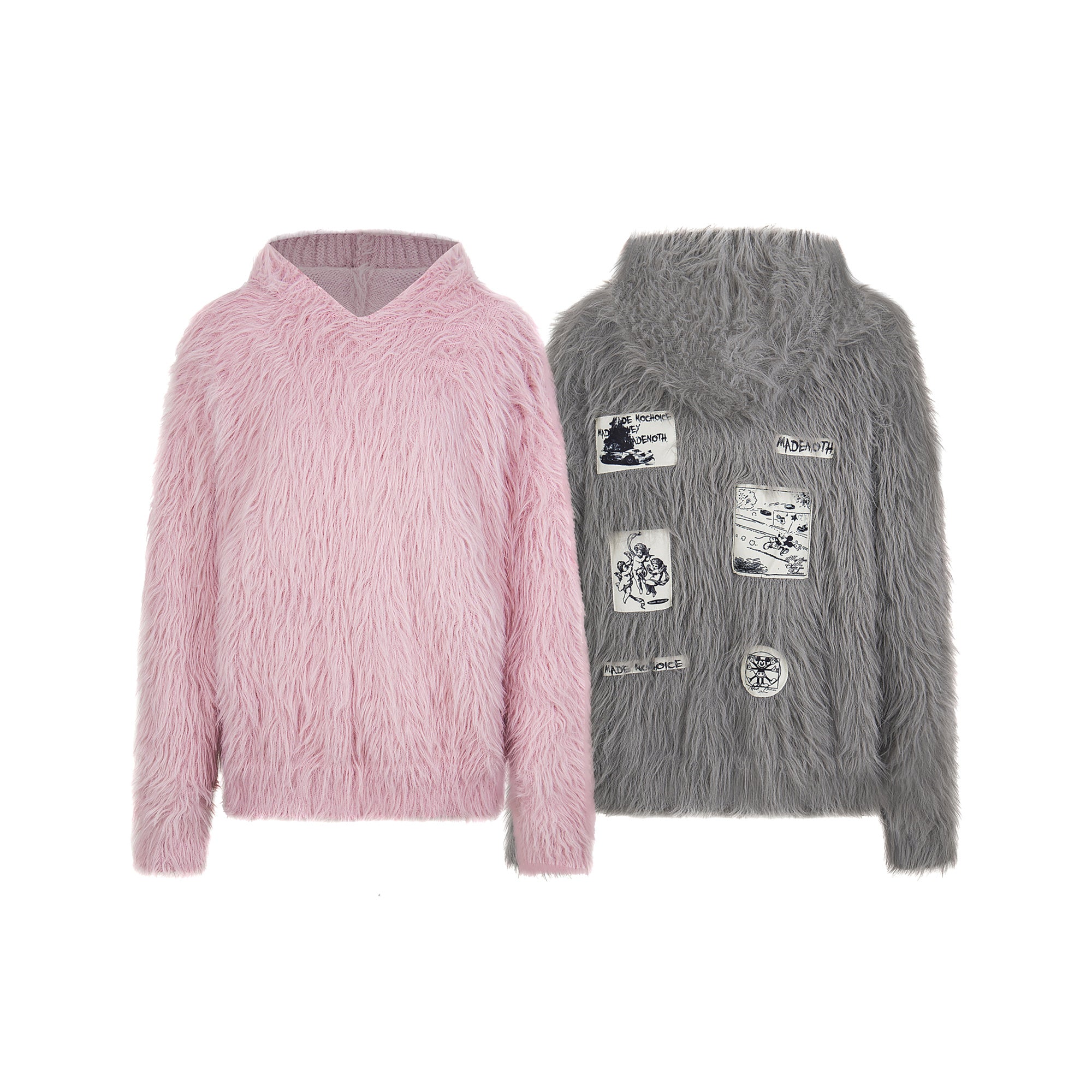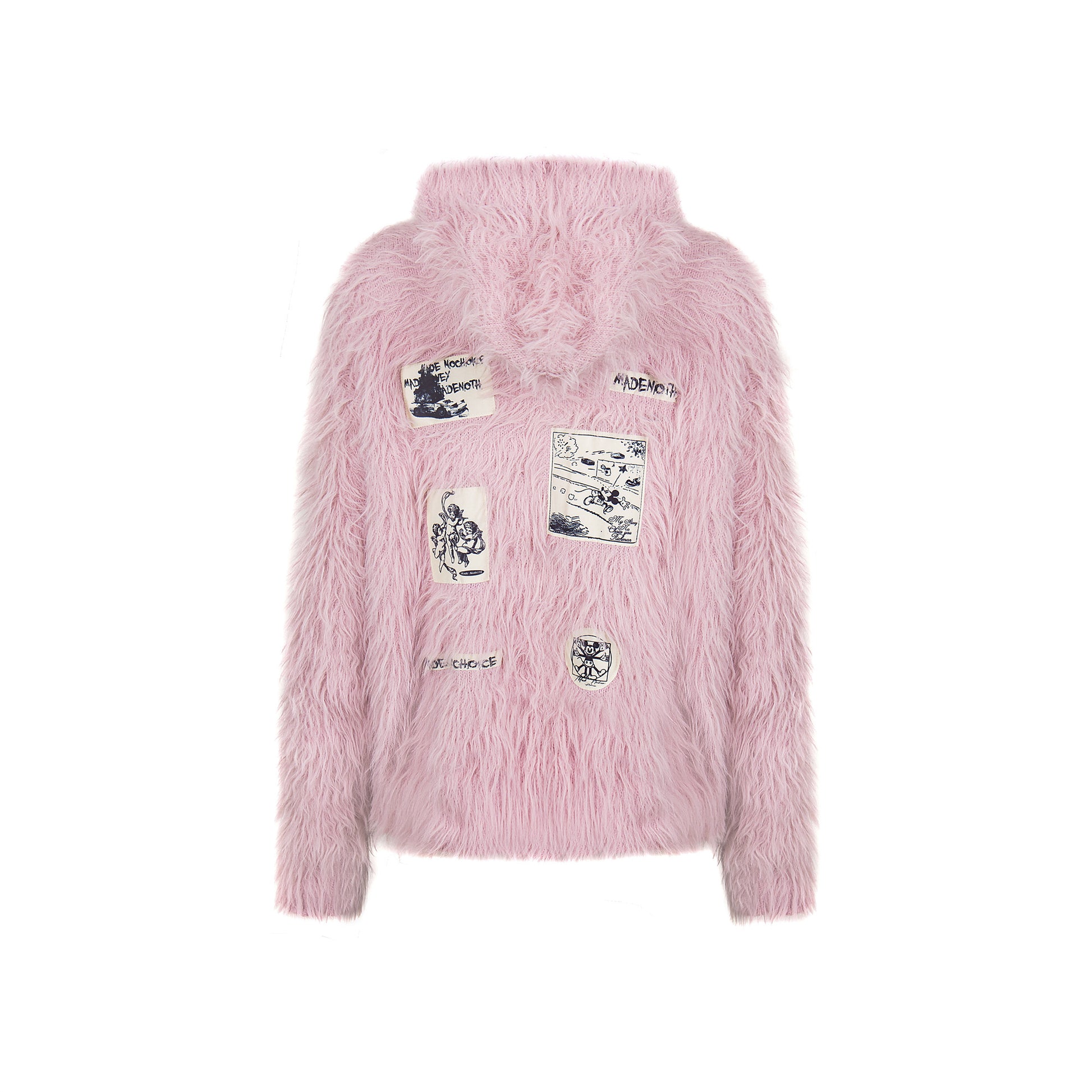 Clothing details: Long-pile fur-like knit texture, graphic patch detailing on back, relaxed oversized silhouette, soft and warm touch.