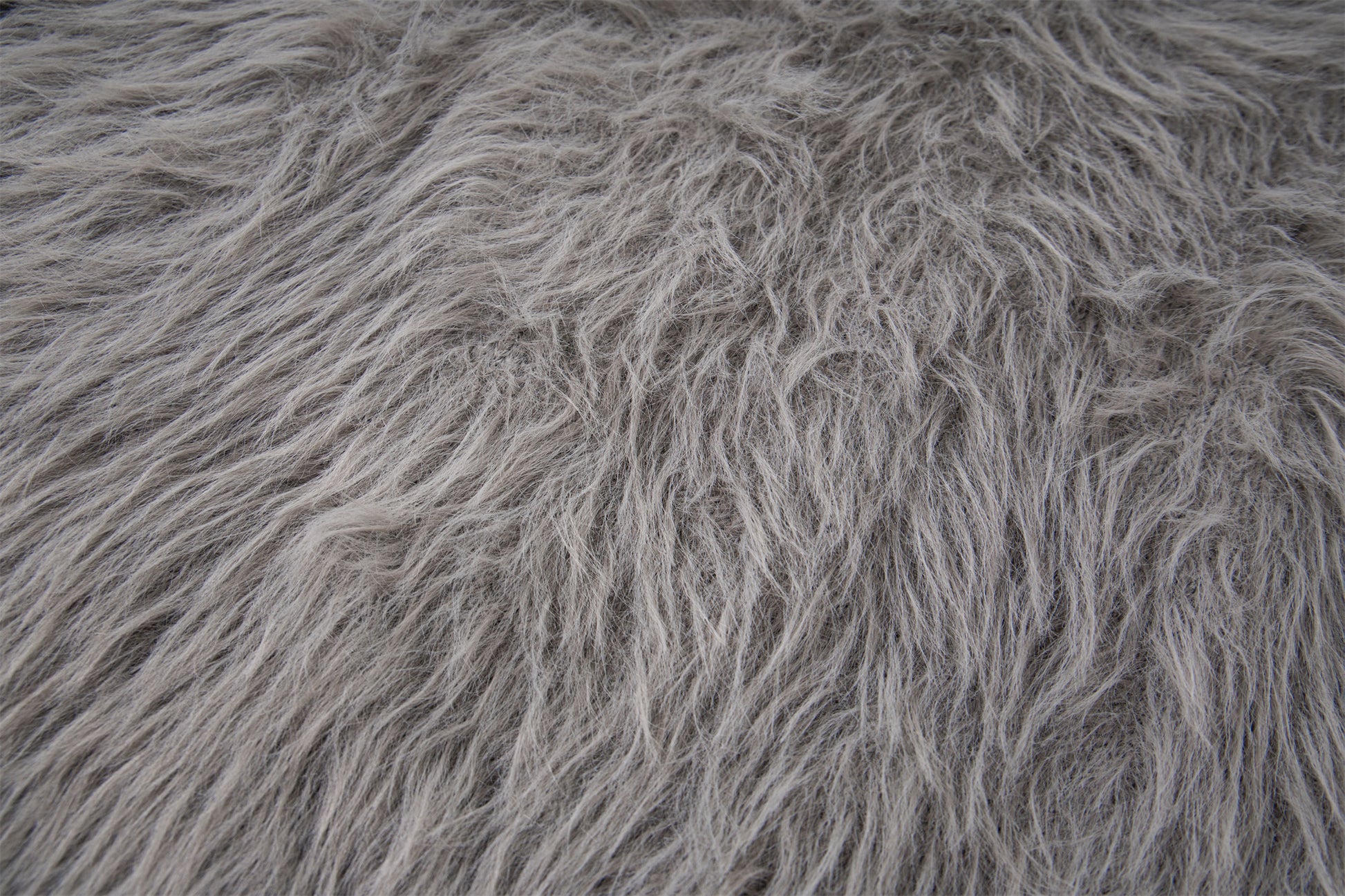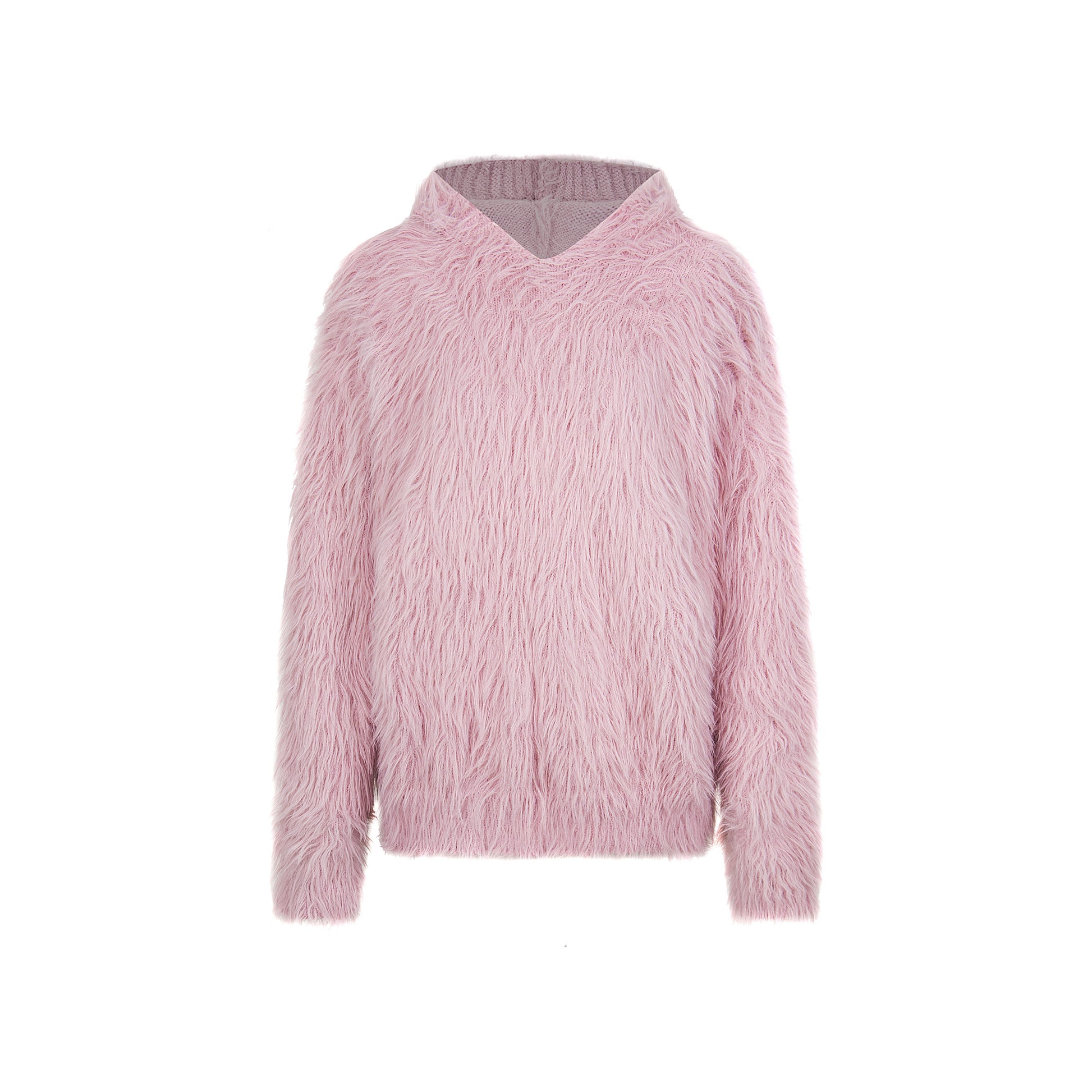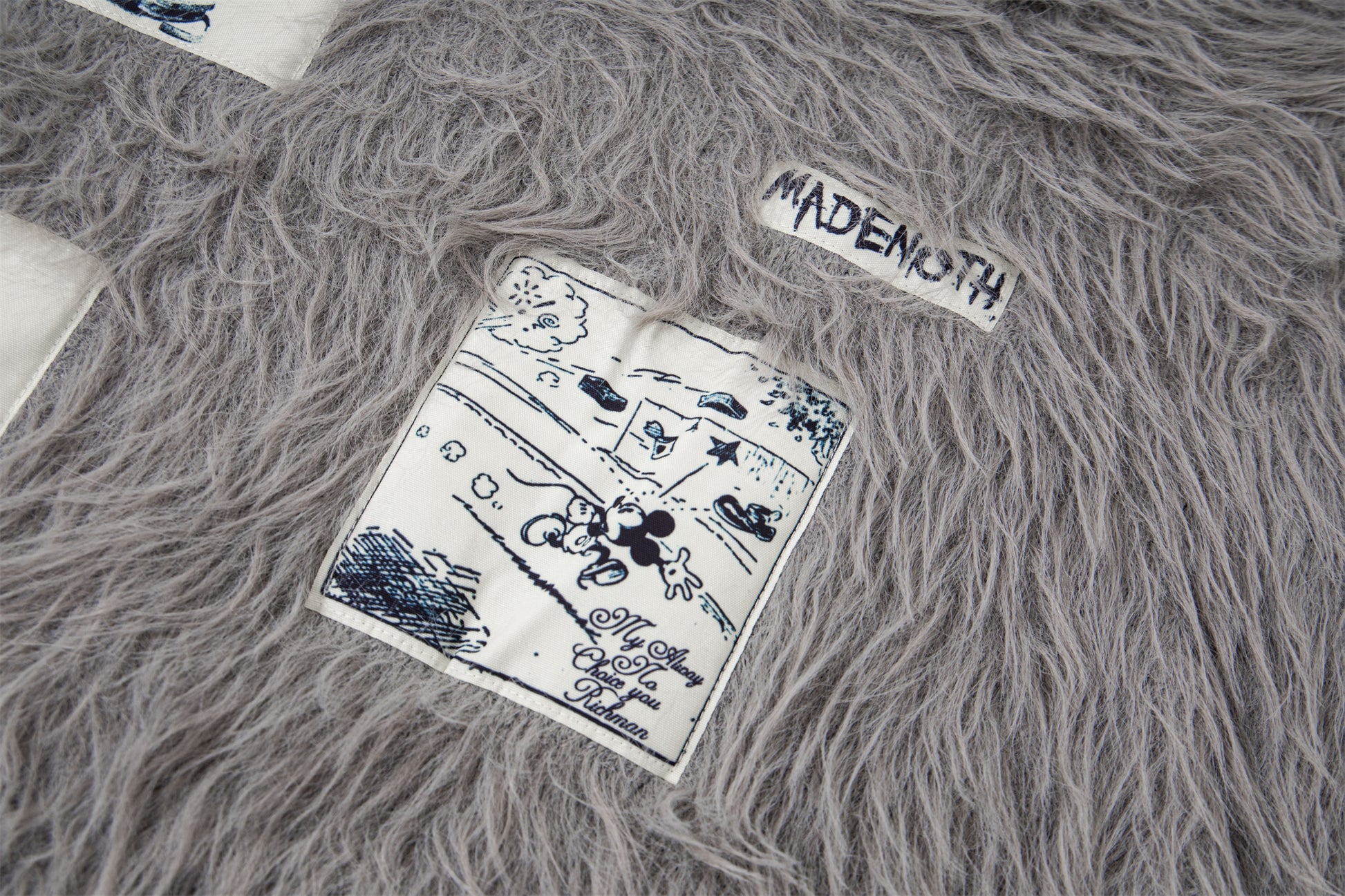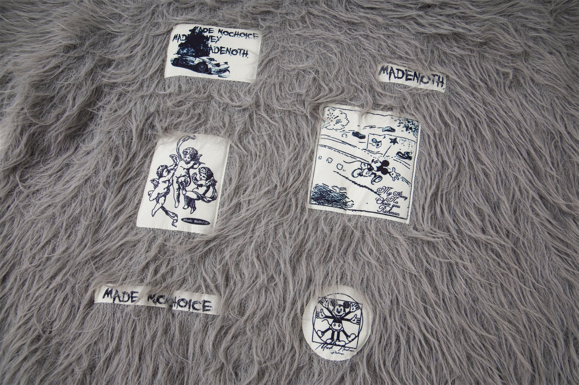 Clothing details: Long-pile fur-like knit texture, graphic patch detailing on back, relaxed oversized silhouette, soft and warm touch.