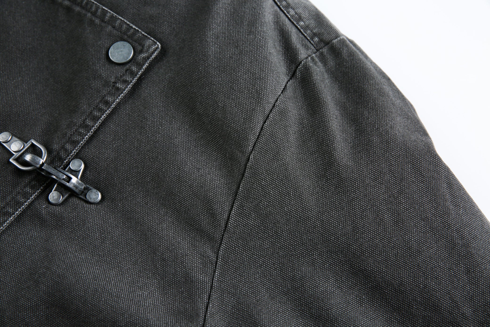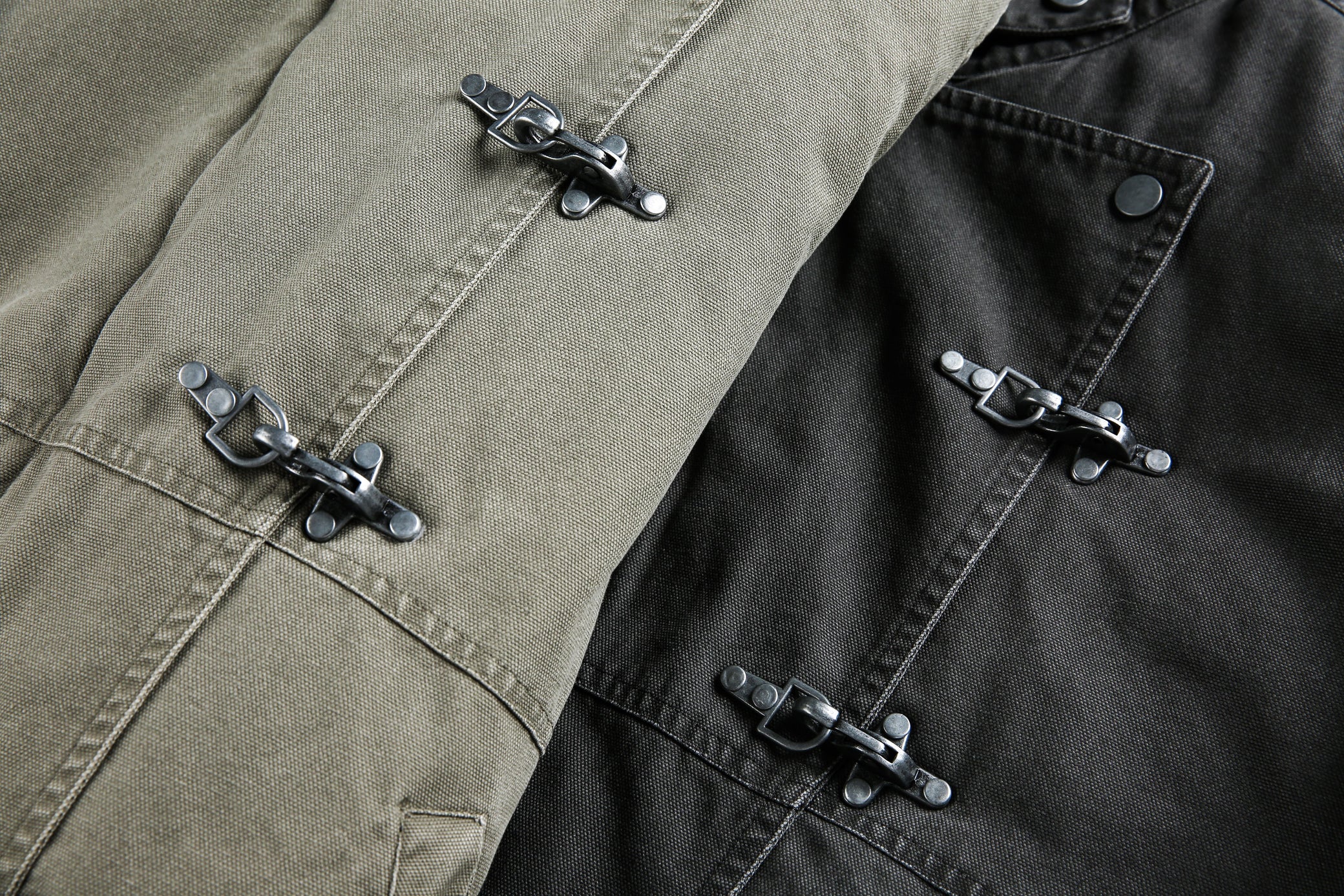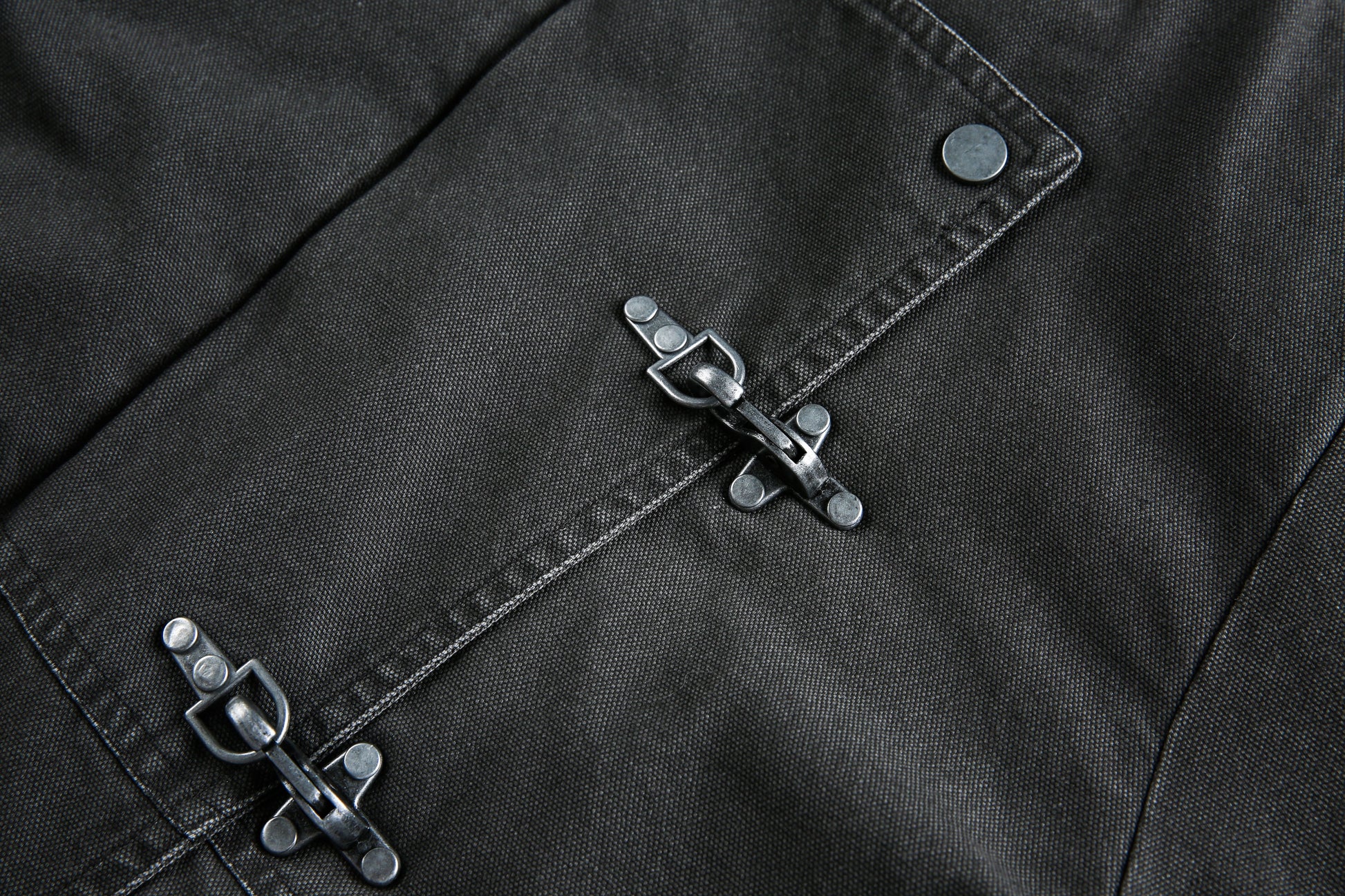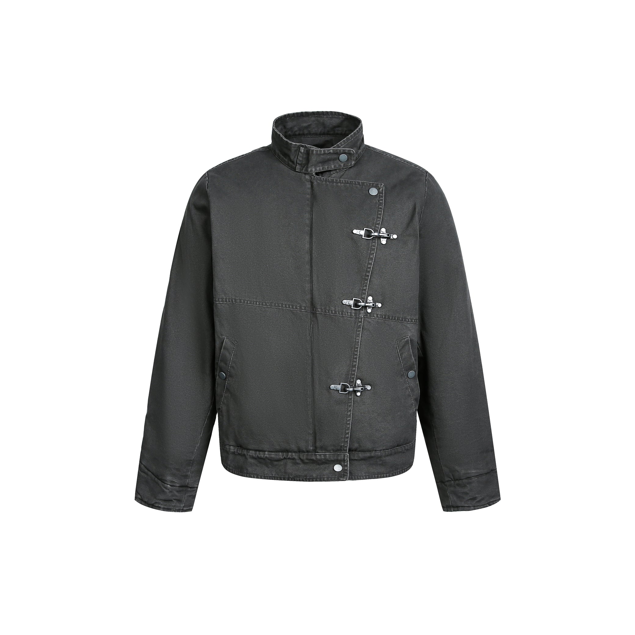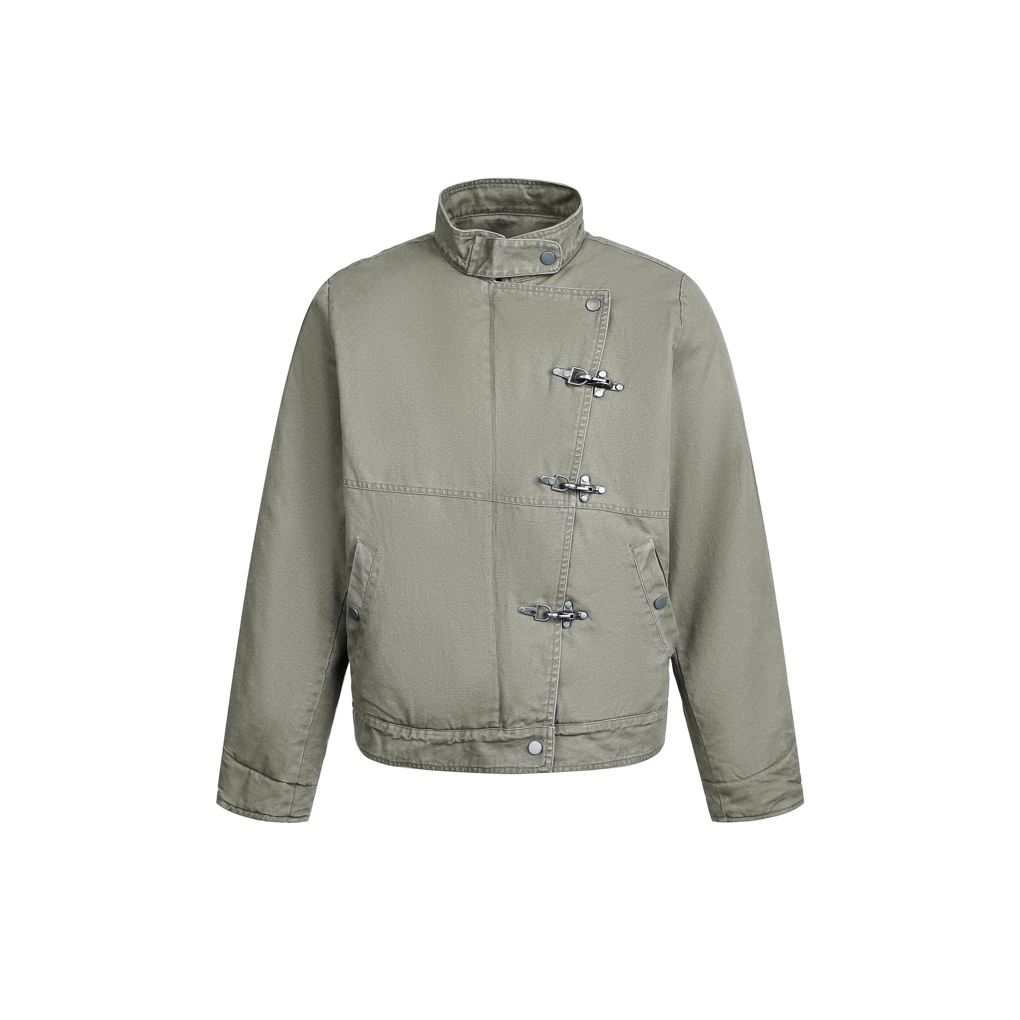 The Omirad Metal Clasp Utility Jacket reimagines military-inspired structure with a contemporary edge. Featuring asymmetrical metal clasp closures and a stand collar, this jacket combines utilitarian function with modern streetwear flair. Made from 100% cotton, it provides a firm texture with a comfortable hand feel, perfect for layering across seasons.