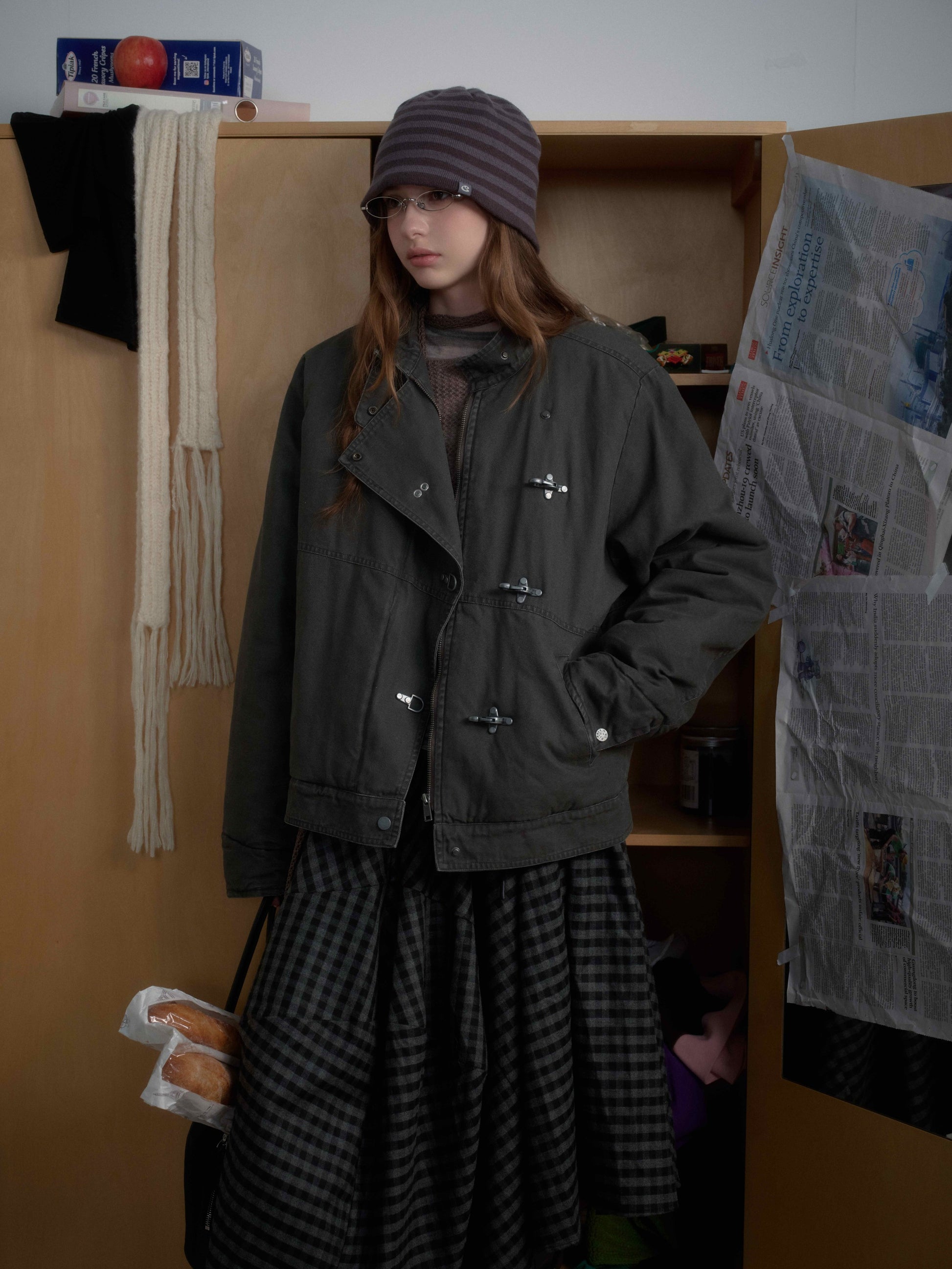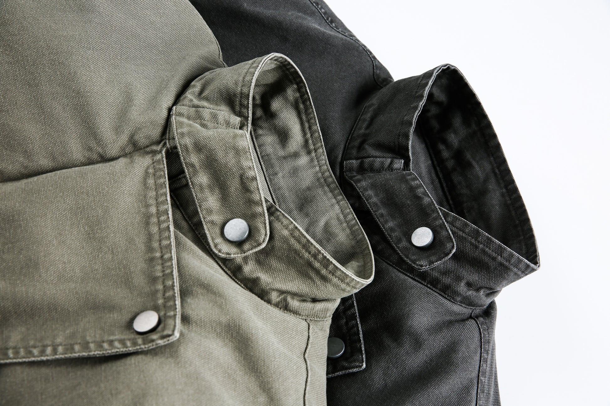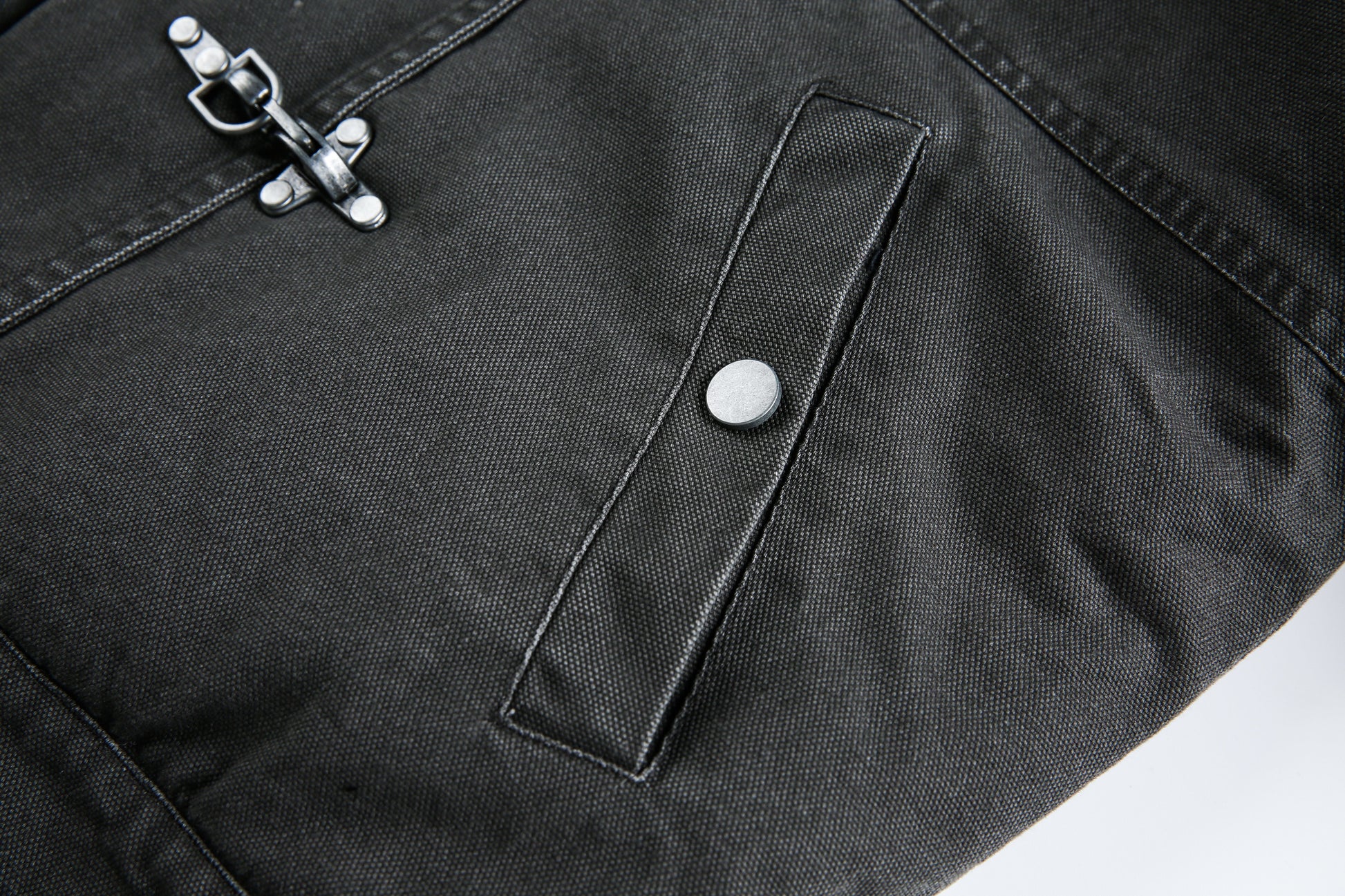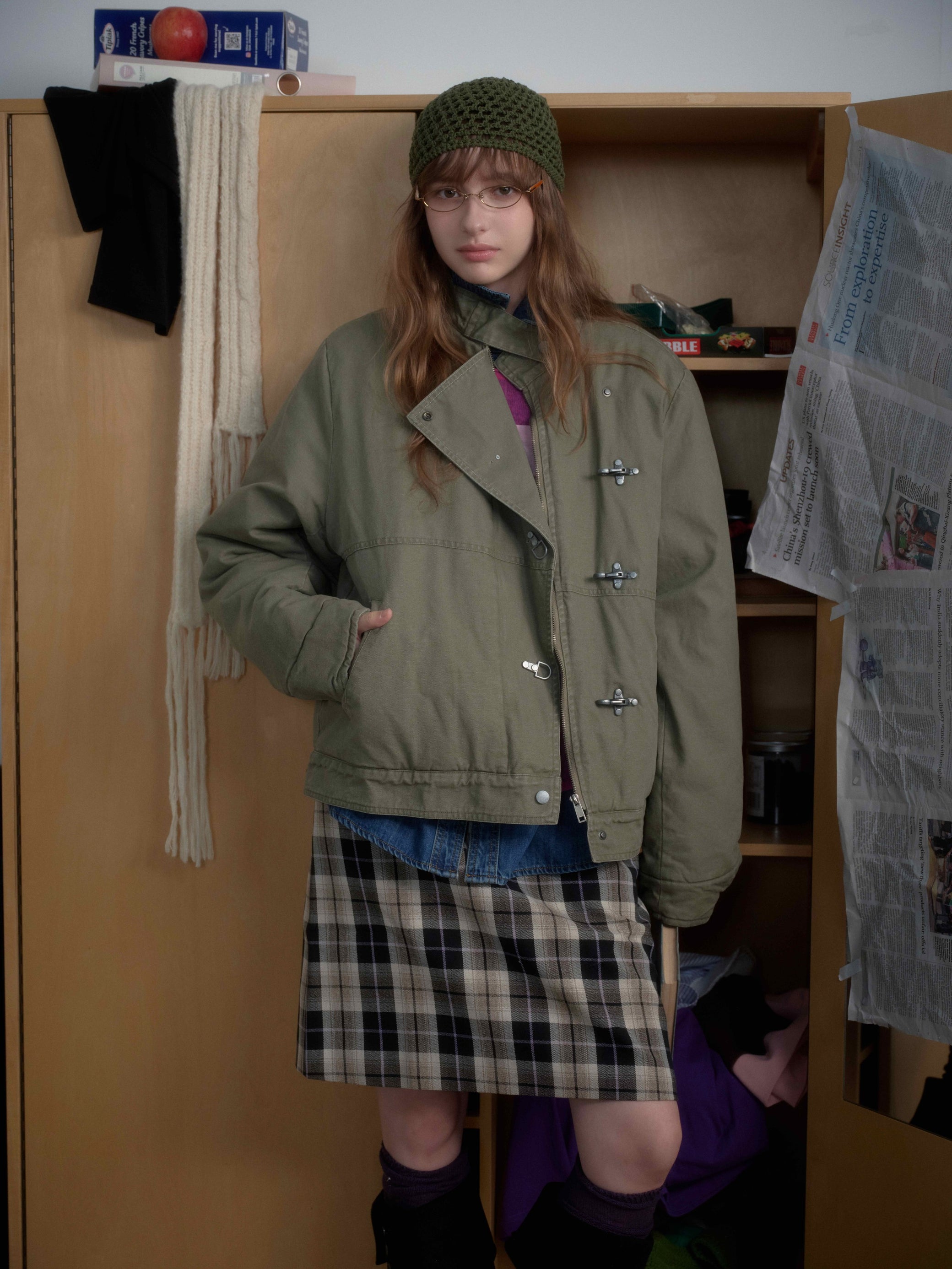The Omirad Metal Clasp Utility Jacket reimagines military-inspired structure with a contemporary edge. Featuring asymmetrical metal clasp closures and a stand collar, this jacket combines utilitarian function with modern streetwear flair. Made from 100% cotton, it provides a firm texture with a comfortable hand feel, perfect for layering across seasons.
