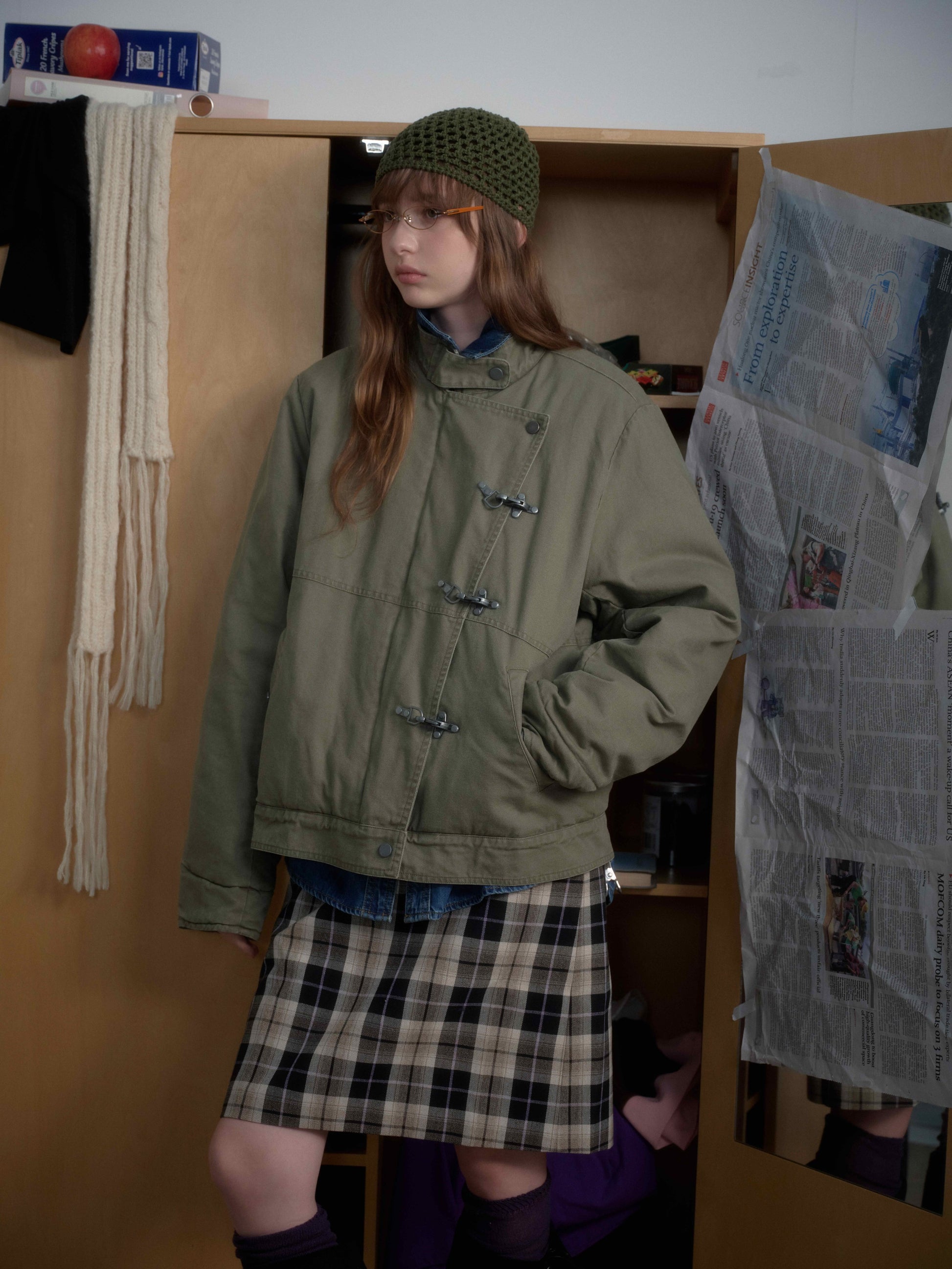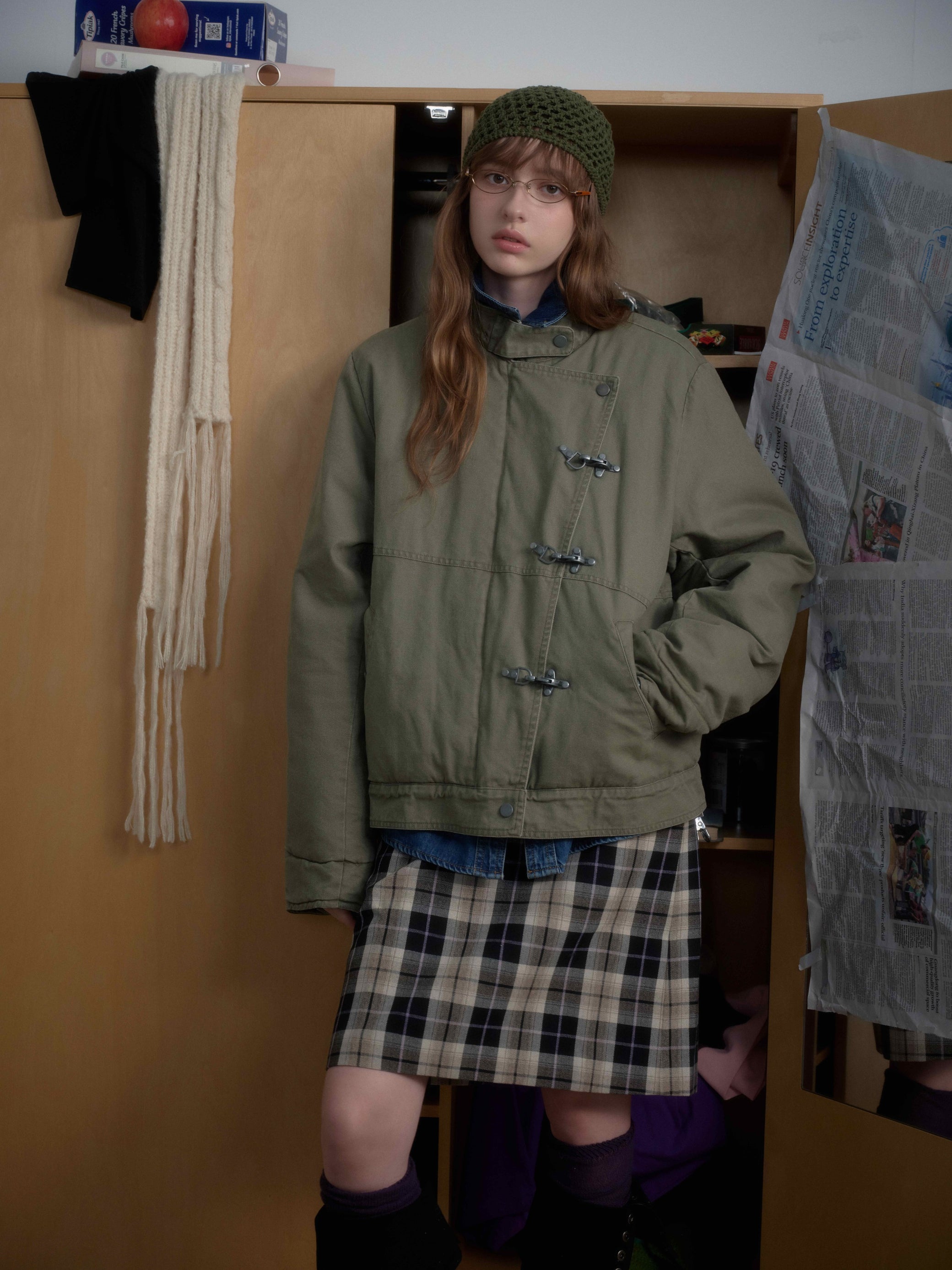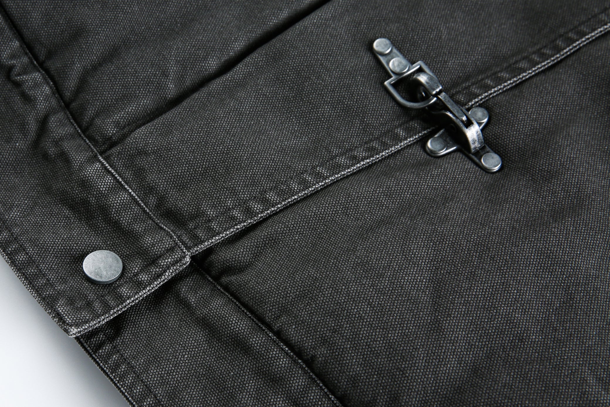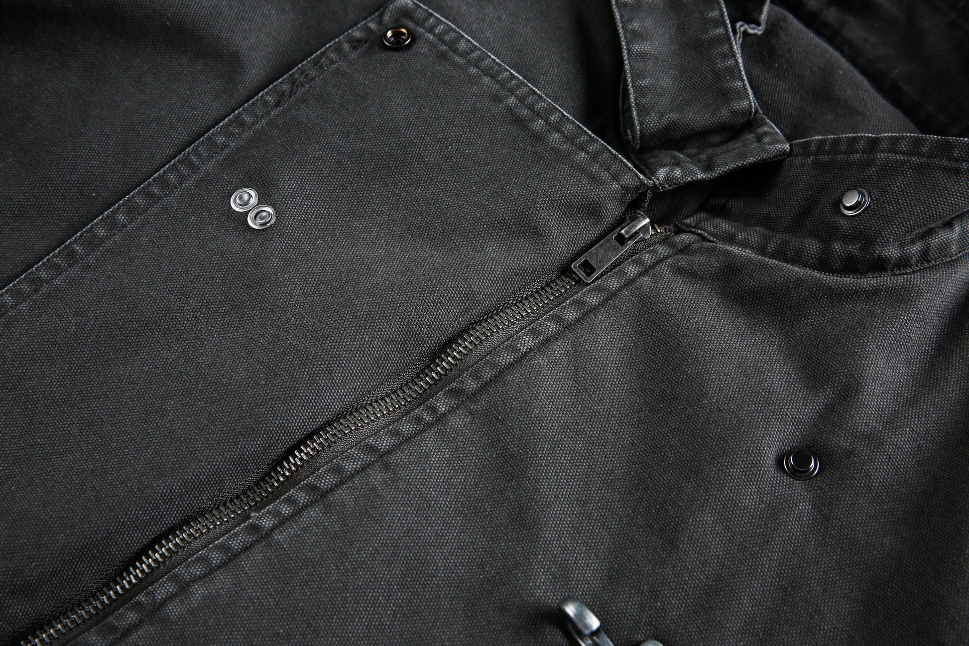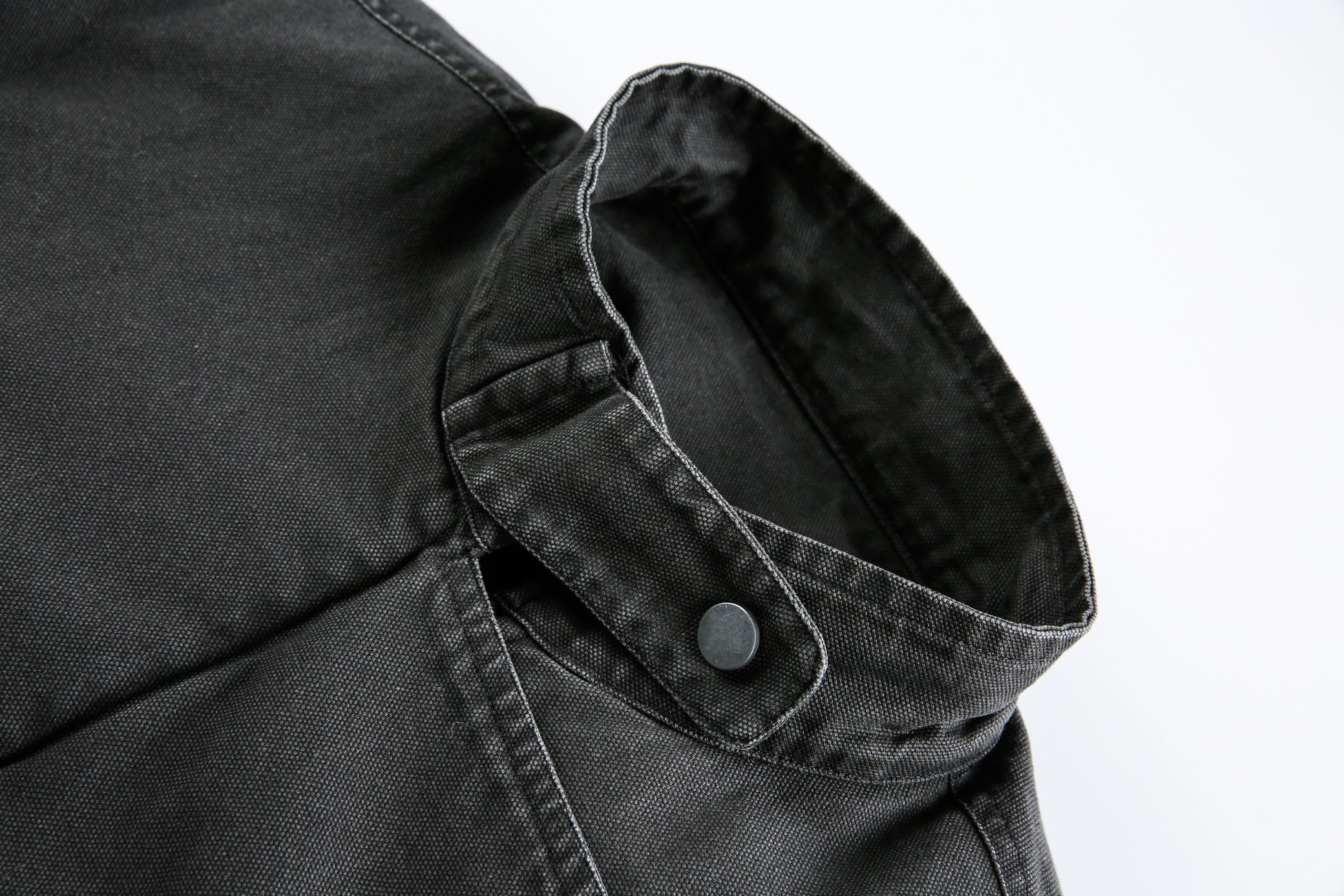 The Omirad Metal Clasp Utility Jacket reimagines military-inspired structure with a contemporary edge. Featuring asymmetrical metal clasp closures and a stand collar, this jacket combines utilitarian function with modern streetwear flair. Made from 100% cotton, it provides a firm texture with a comfortable hand feel, perfect for layering across seasons.