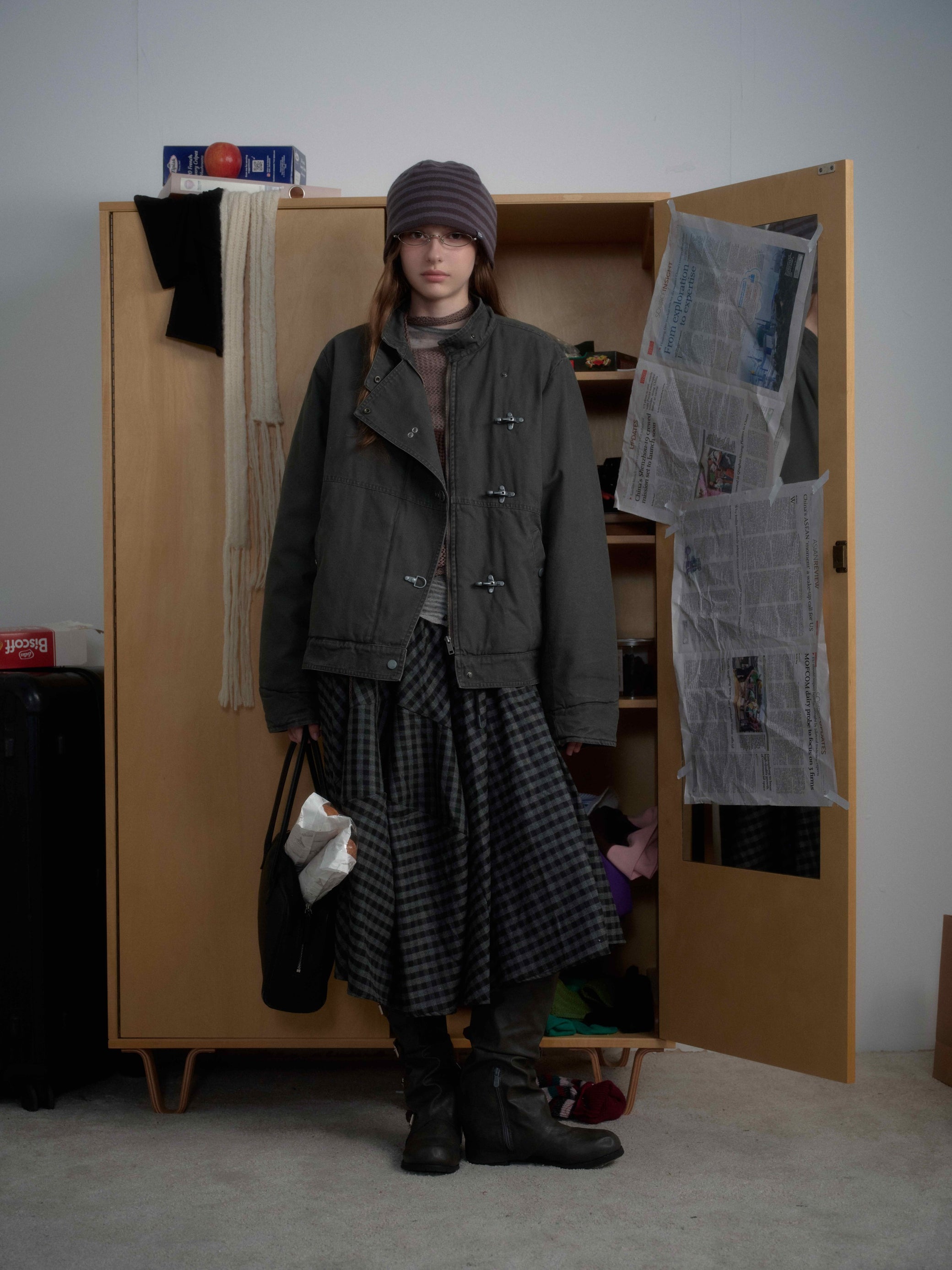 Clothing details: Stand collar, asymmetrical front design, metal clasp fasteners, side pockets, adjustable hem
