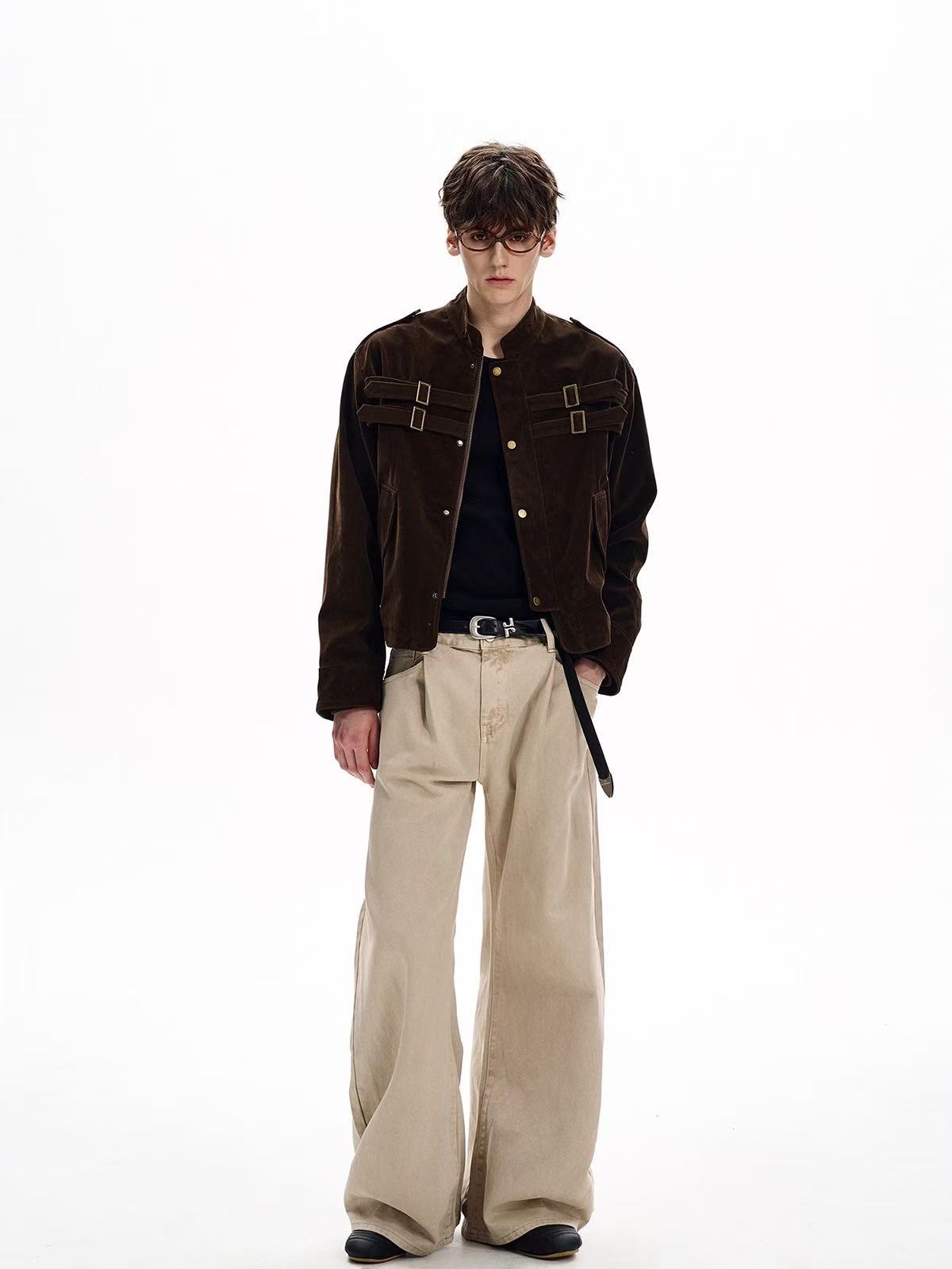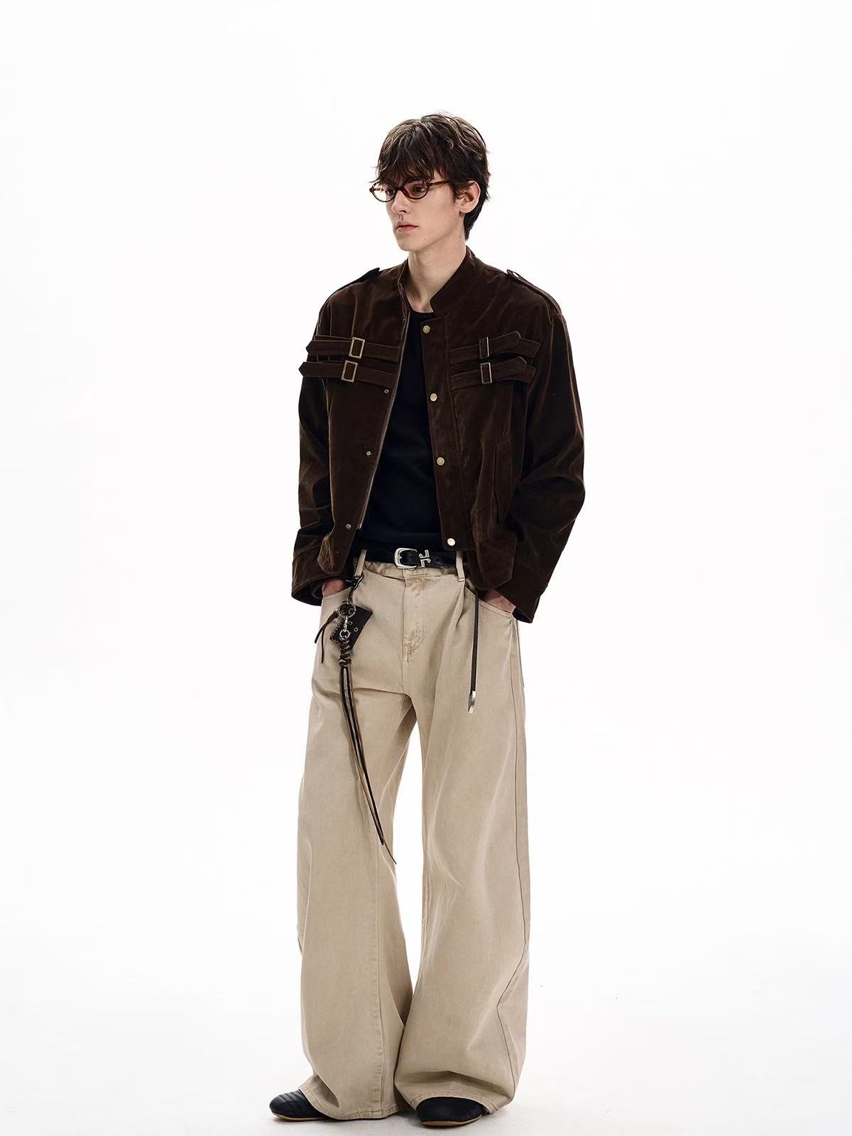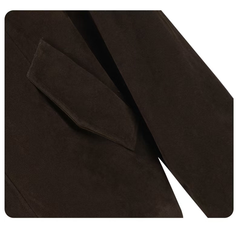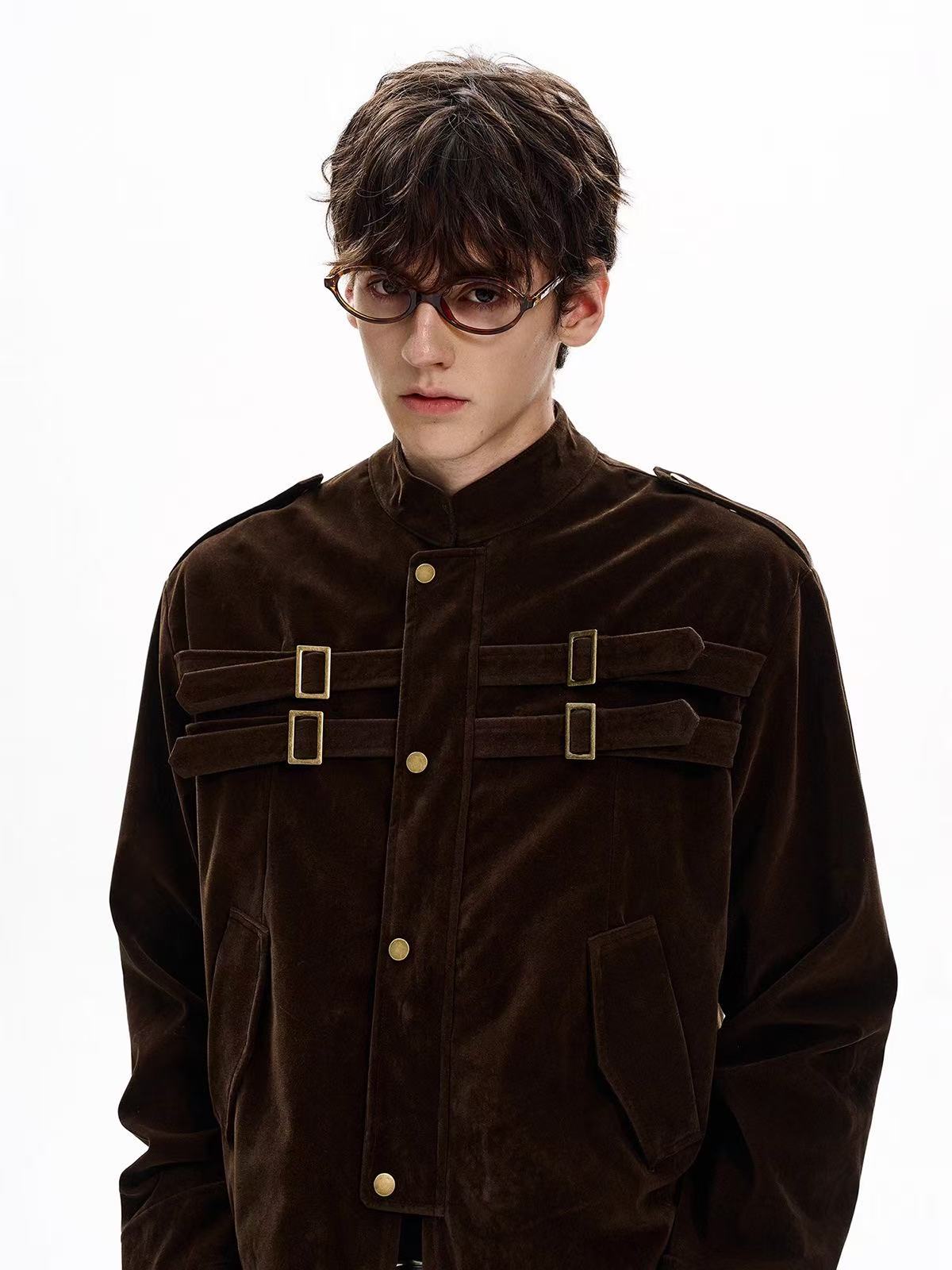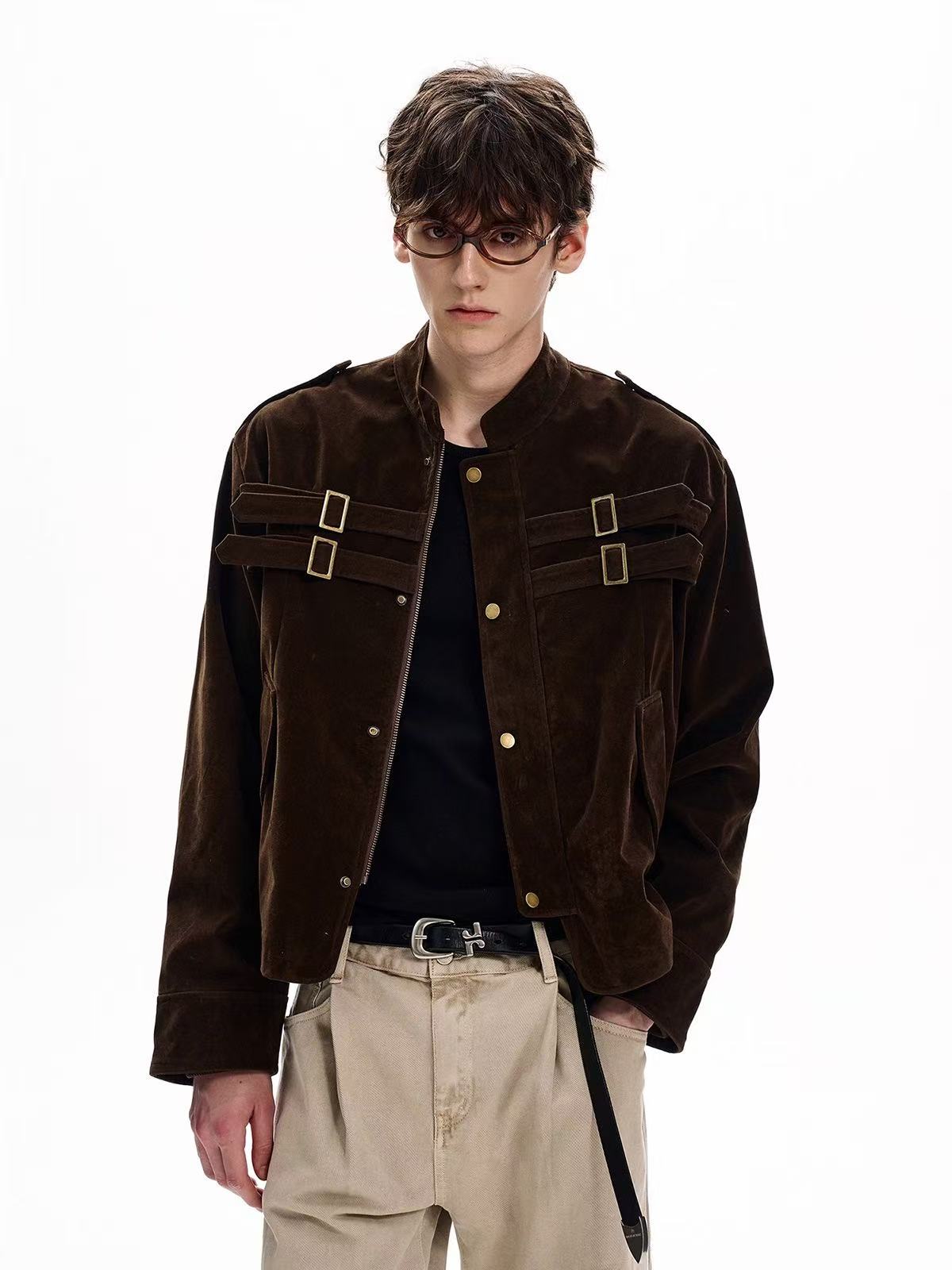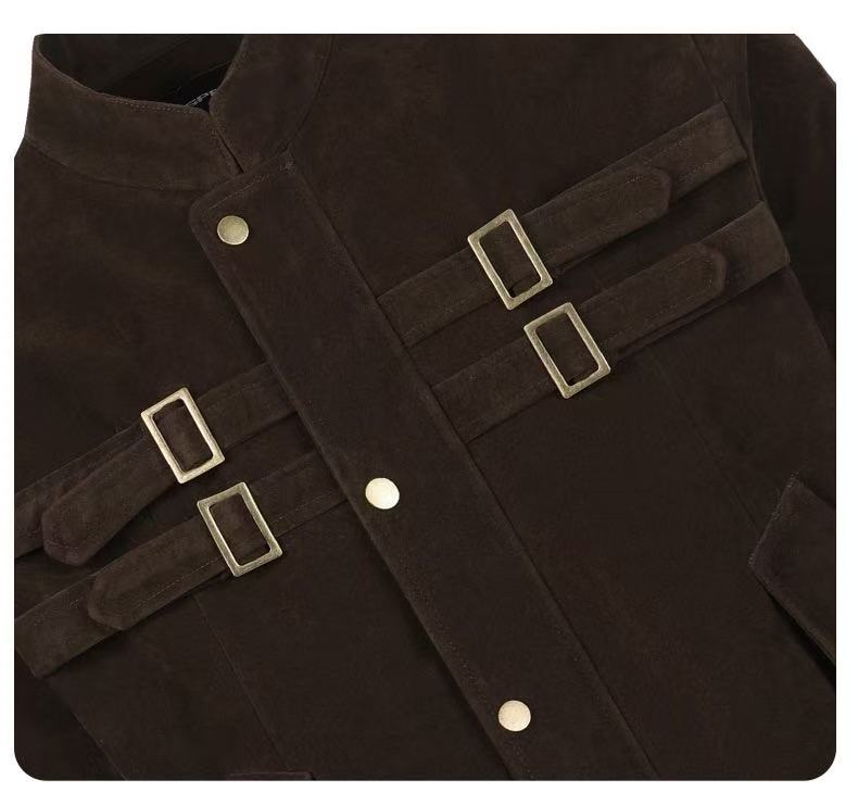 The Omirad Military Suede Jacket brings a structured, utilitarian edge to your streetwear rotation. Crafted from premium polyester suede fabric, it features vintage brass hardware, dual chest straps, and a high stand collar for a bold military-inspired silhouette. The soft-touch suede texture contrasts with the sharp tailoring, creating a perfect blend of rugged and refined.