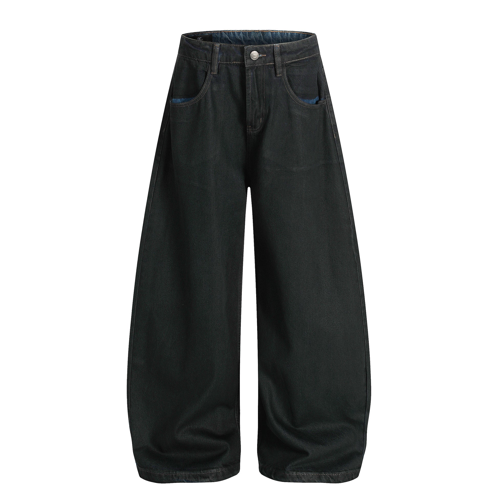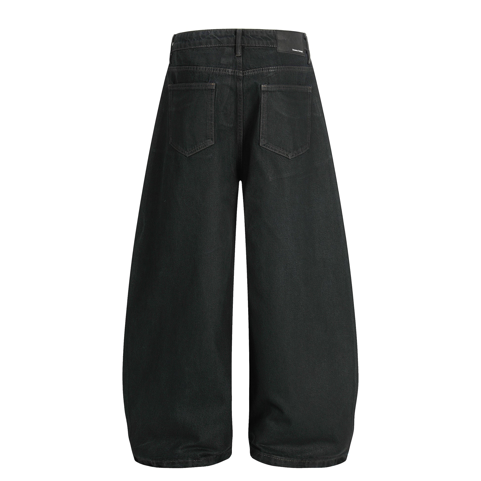 Clothing details: Curved wide-leg silhouette, minimalist five-pocket design, subtle faded finish, structured denim fabric.