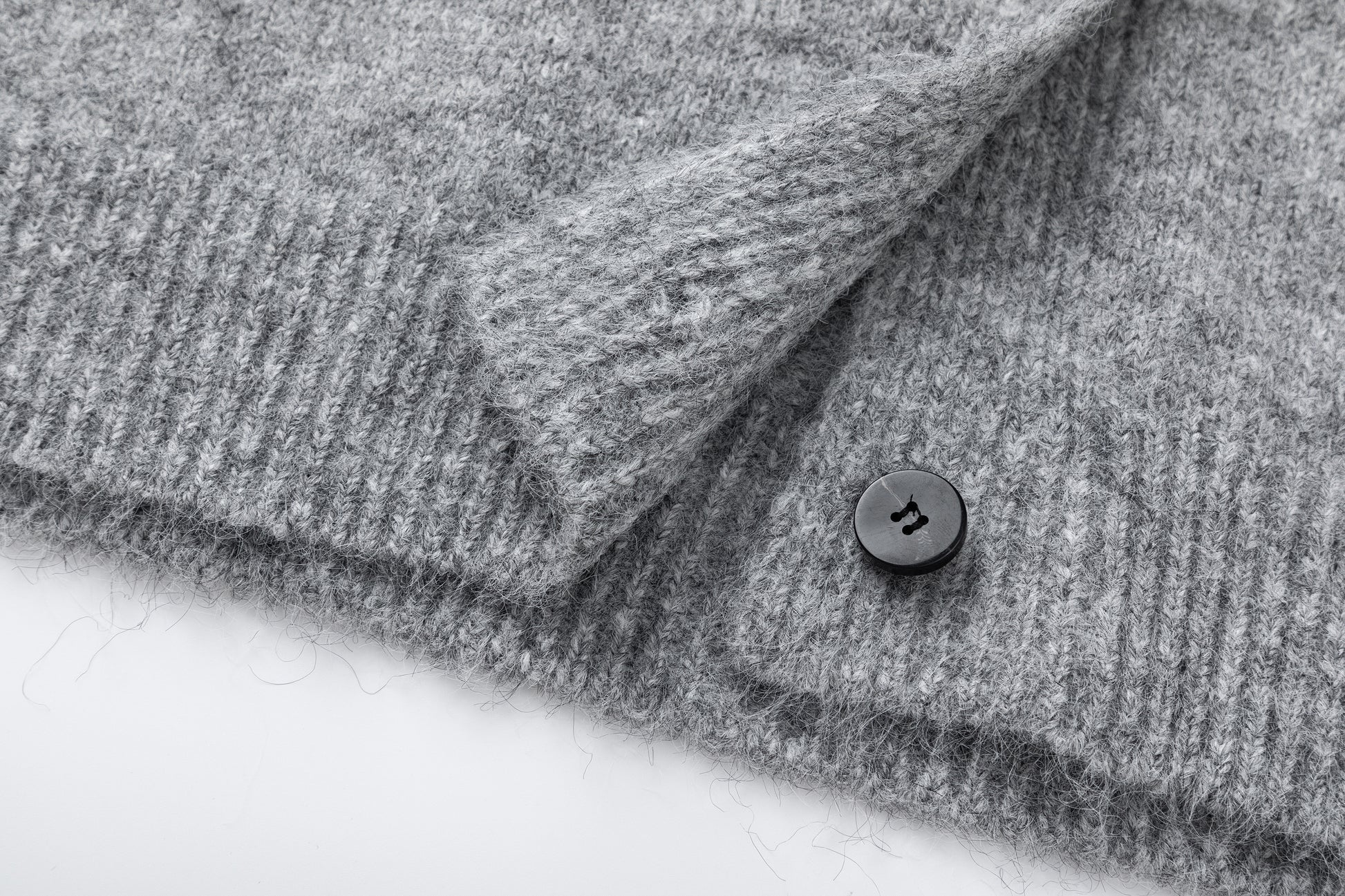 Clothing details: Crew neck, button-up closure, ribbed cuffs and hem, soft wool-blend texture, relaxed fit