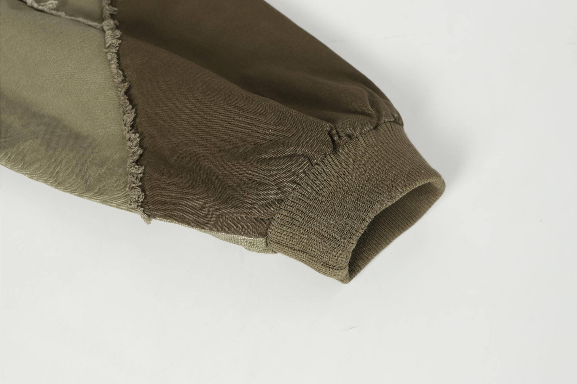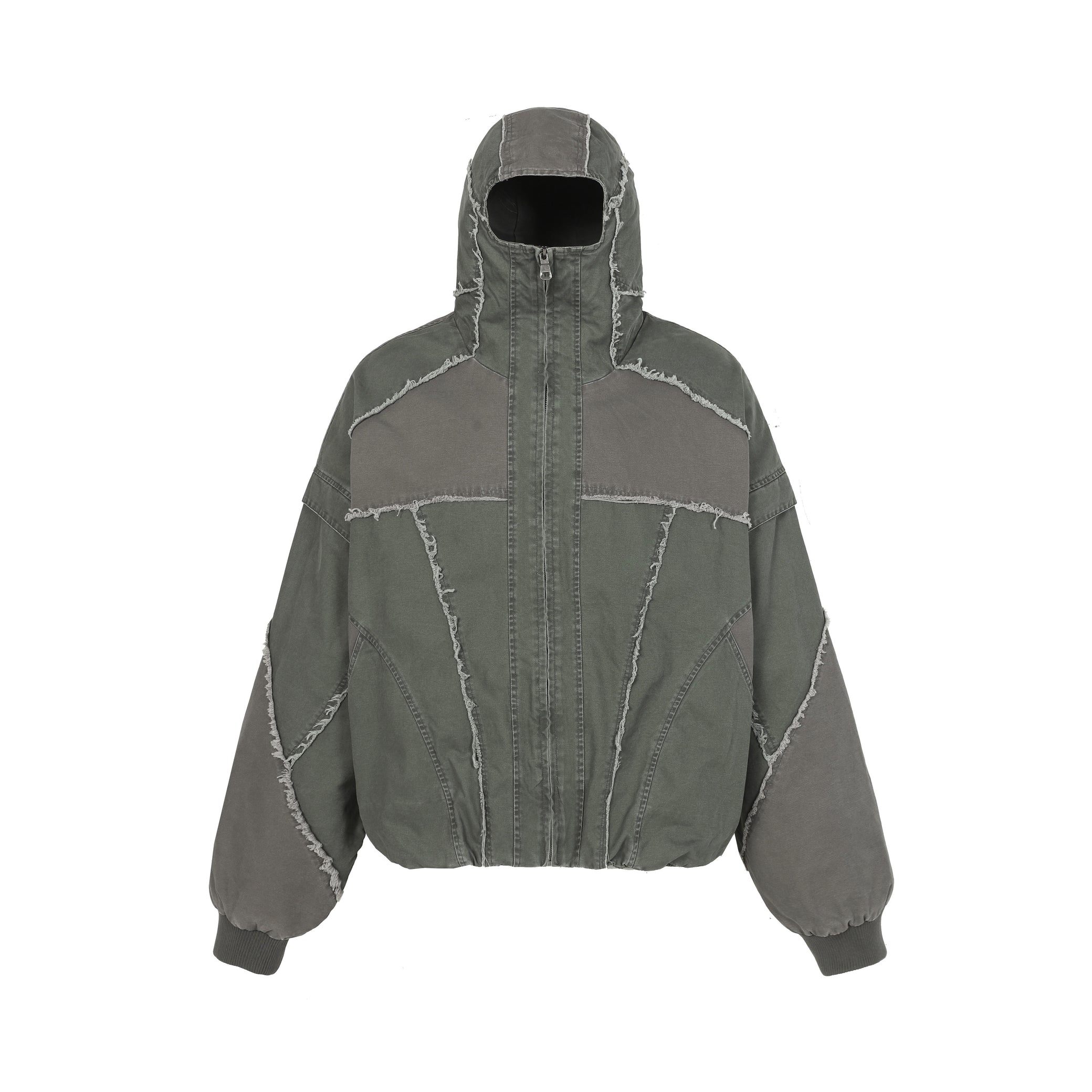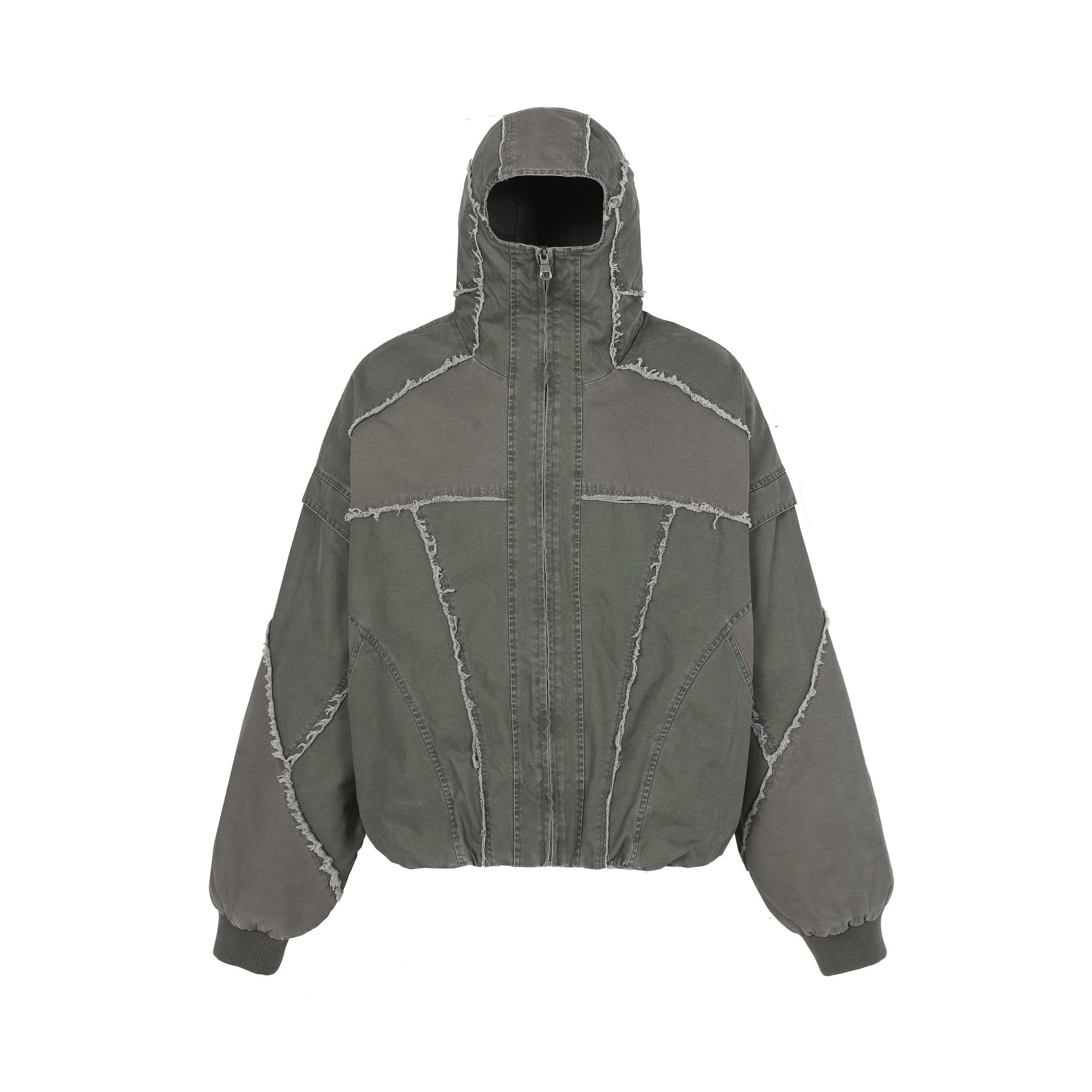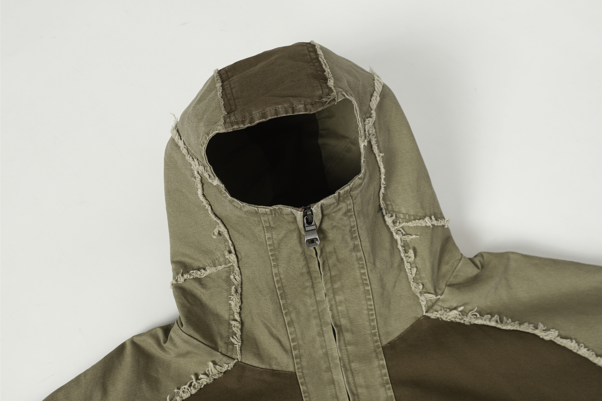 The Omirad Multi-Panel Distressed Hooded Jacket fuses deconstructed detailing with functional streetwear aesthetics. Crafted entirely from 100% cotton, the jacket offers a soft yet durable texture with visible exposed seams and raw-edge panel construction. The design features contrast color blocking on the shoulders and sleeves, emphasizing its utilitarian, patch-built structure. The high-neck hood provides added coverage, while the elastic cuffs and hem ensure a secure and comfortable fit.