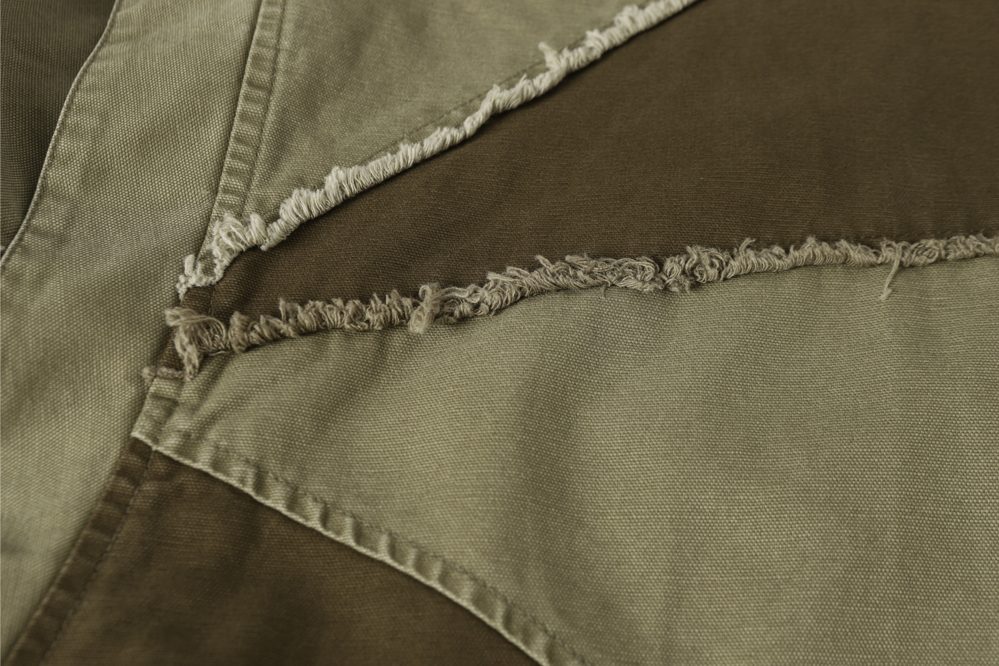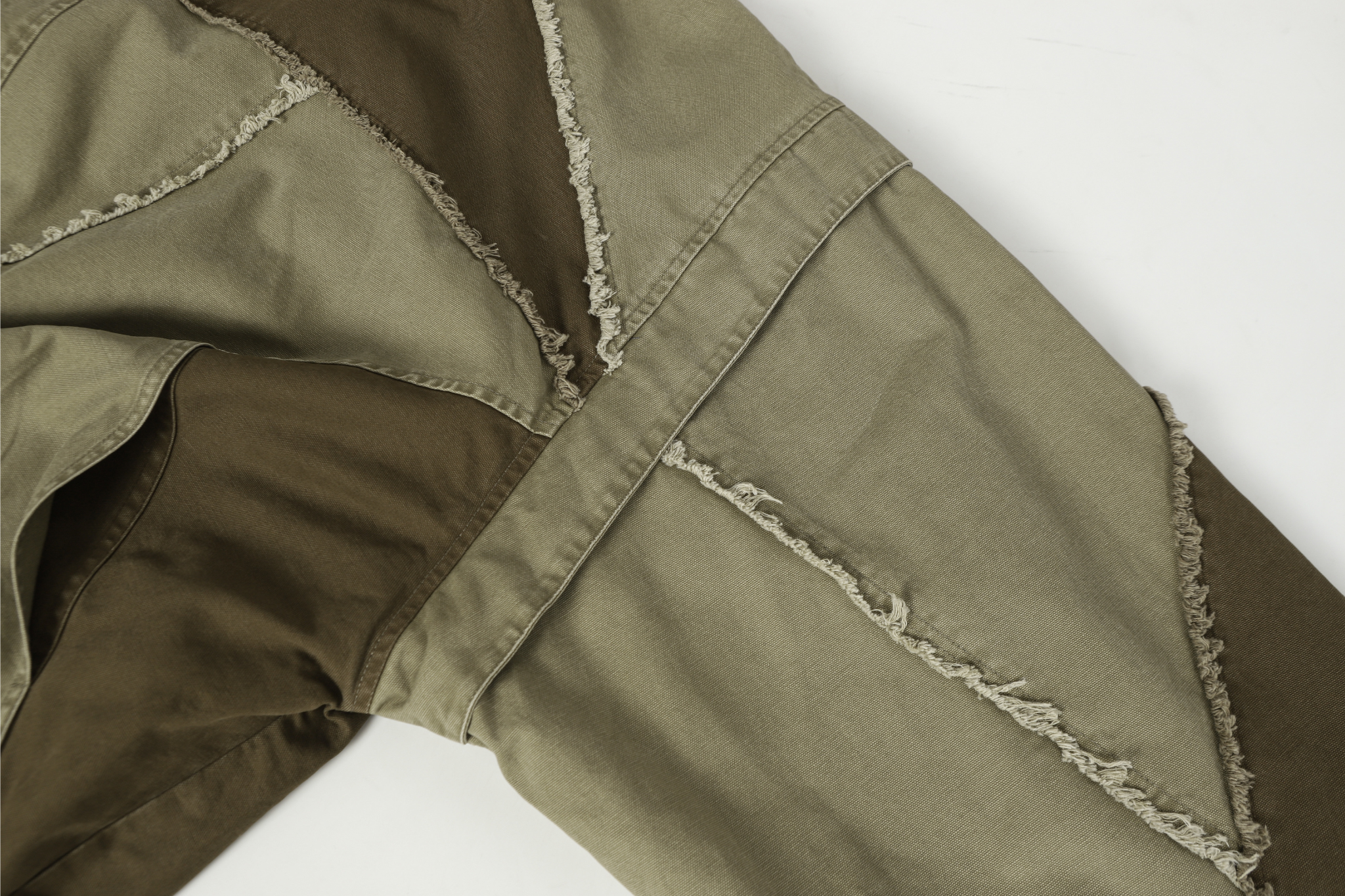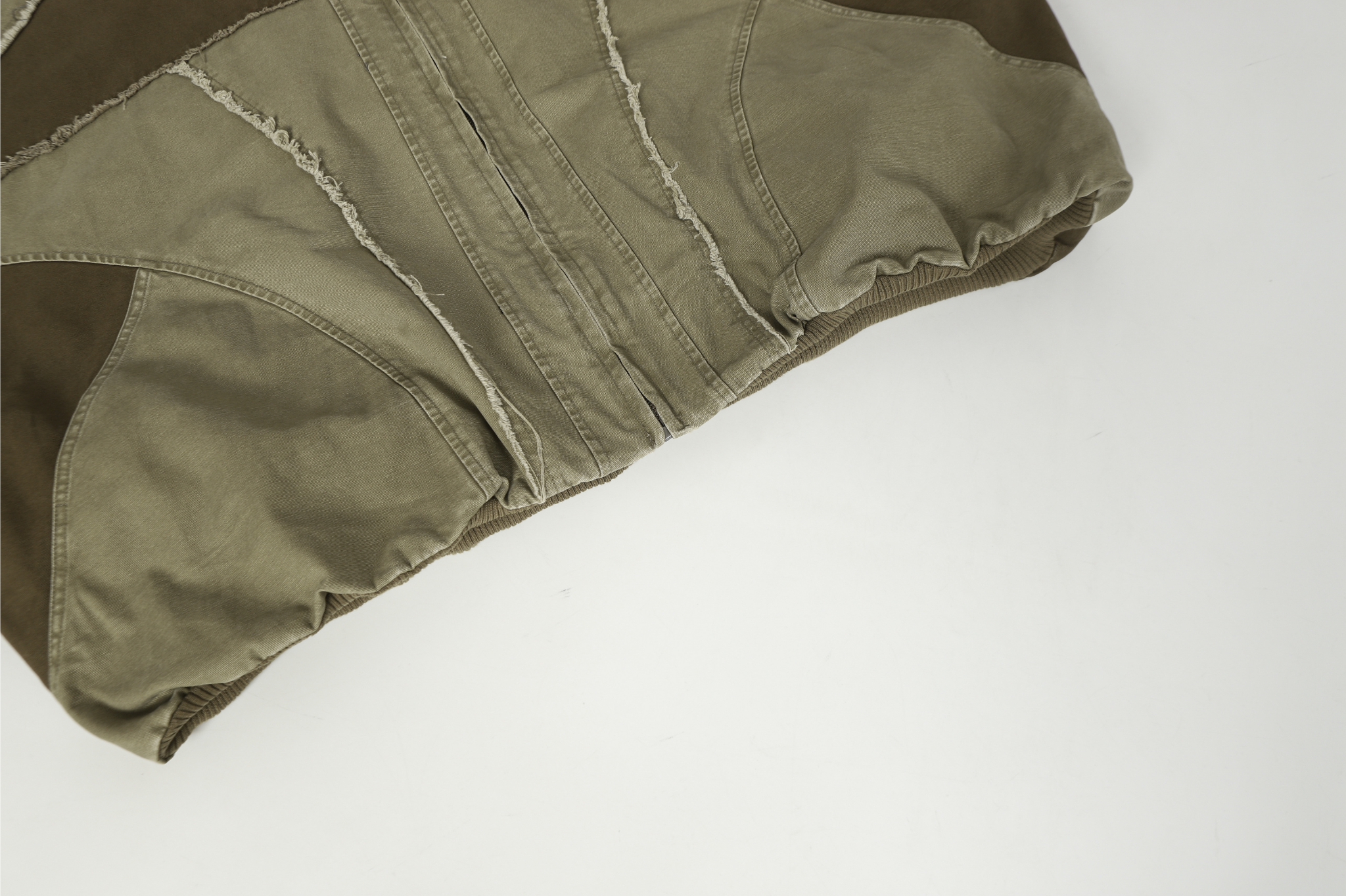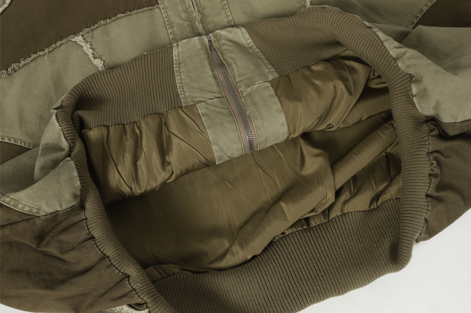 The Omirad Multi-Panel Distressed Hooded Jacket fuses deconstructed detailing with functional streetwear aesthetics. Crafted entirely from 100% cotton, the jacket offers a soft yet durable texture with visible exposed seams and raw-edge panel construction. The design features contrast color blocking on the shoulders and sleeves, emphasizing its utilitarian, patch-built structure. The high-neck hood provides added coverage, while the elastic cuffs and hem ensure a secure and comfortable fit.