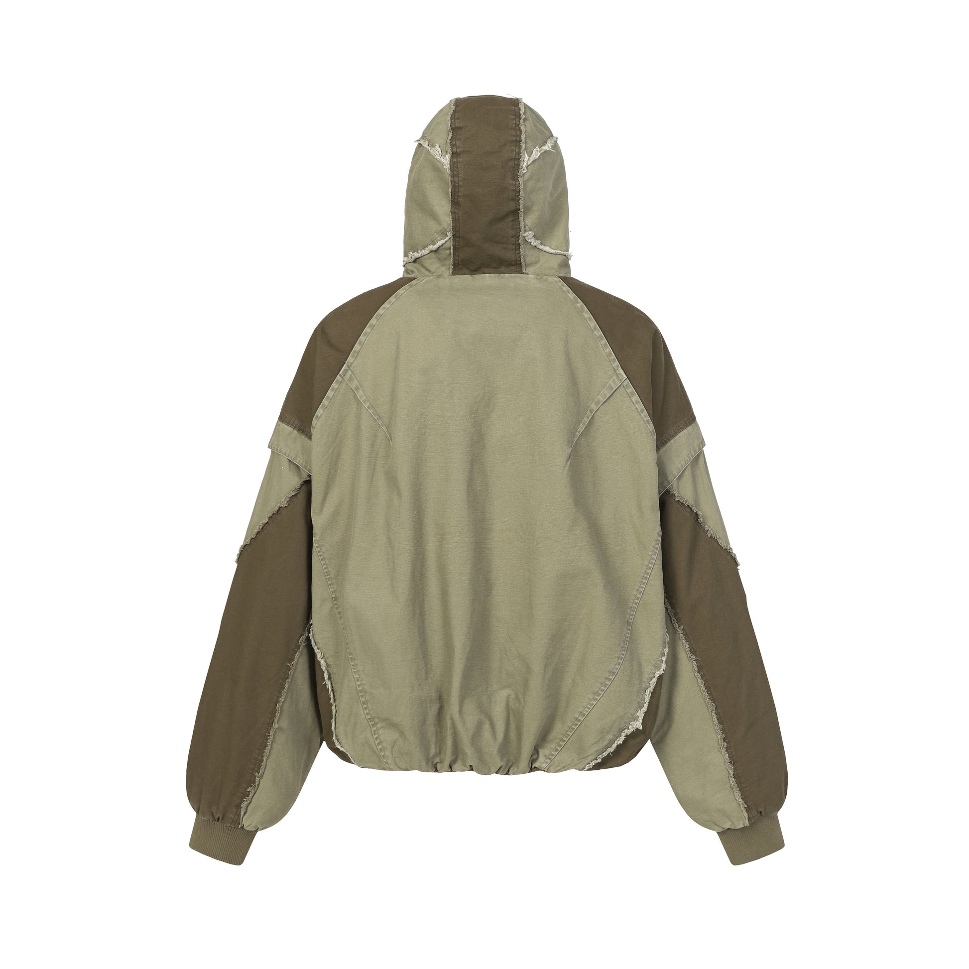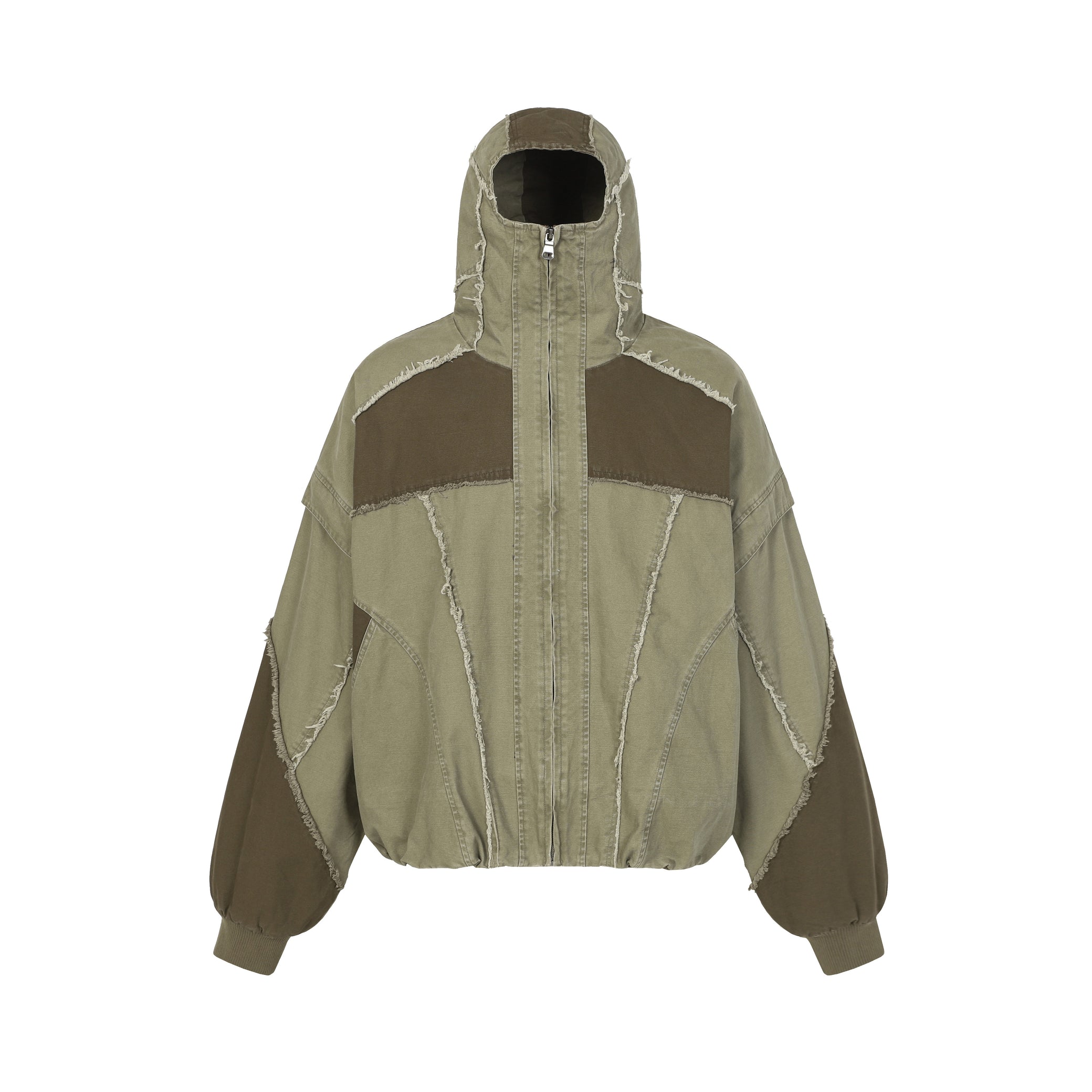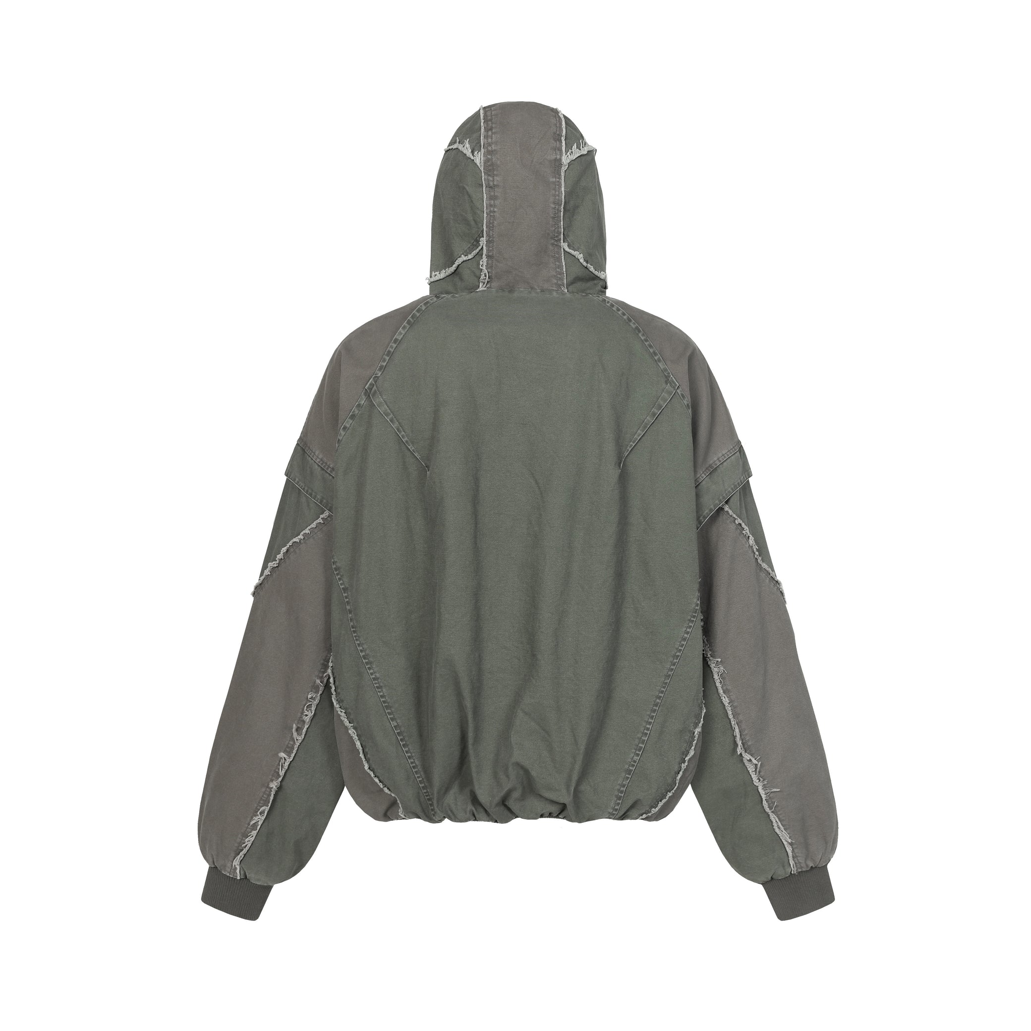 Clothing Details: Multi-panel stitched construction, raw-edge seam finish, contrast color blocking, full-zip front closure, high-neck hood, elastic cuffs and hem, oversized relaxed silhouette