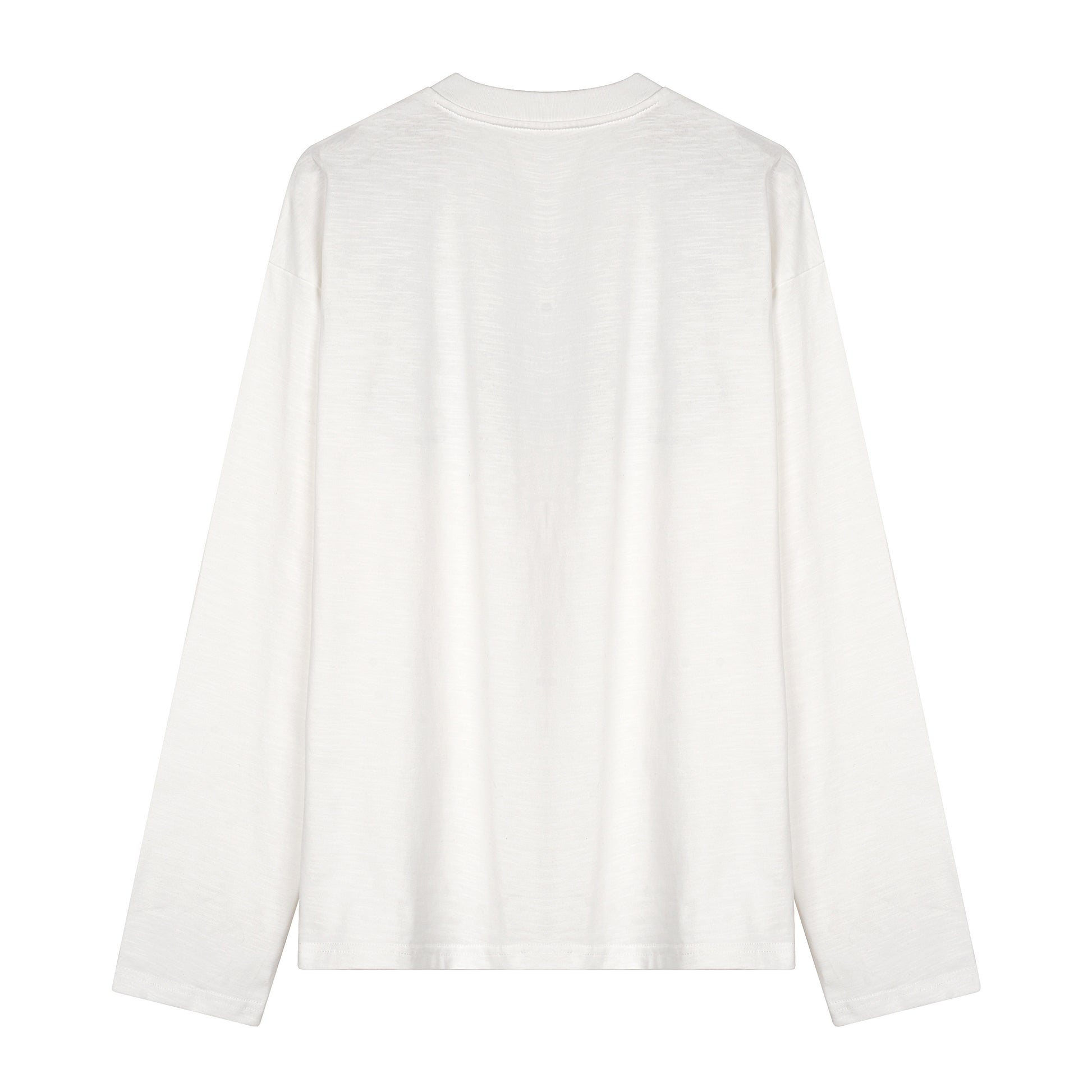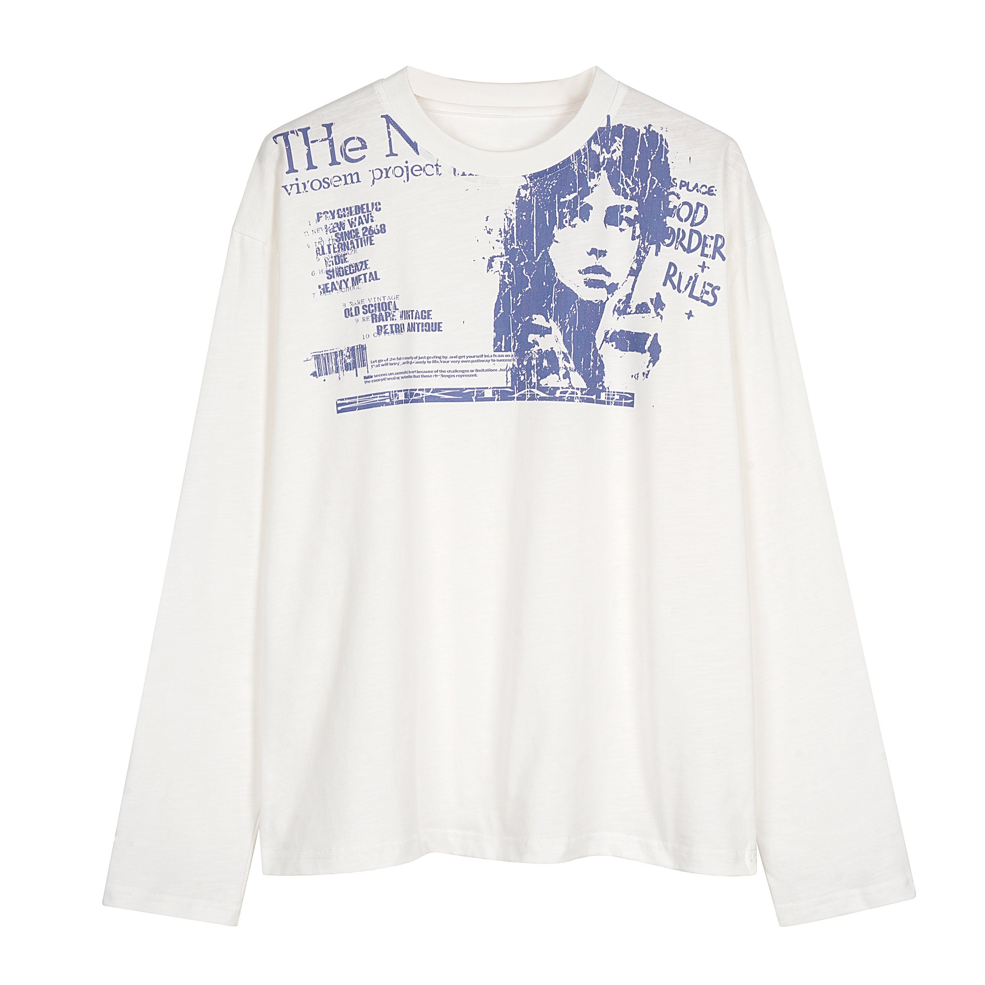 Clothing details: Long-sleeve T-shirt construction, vintage-inspired graphic print, relaxed oversized fit, classic crew neckline, soft cotton feel, straight hem.
