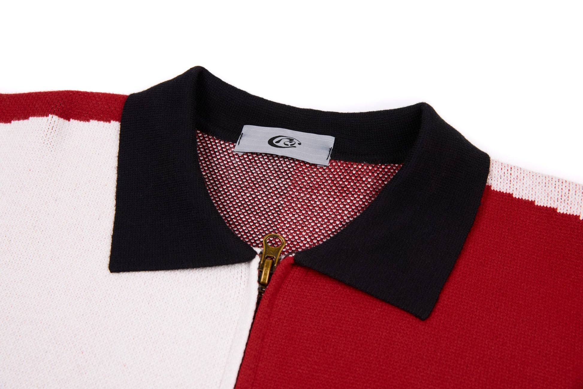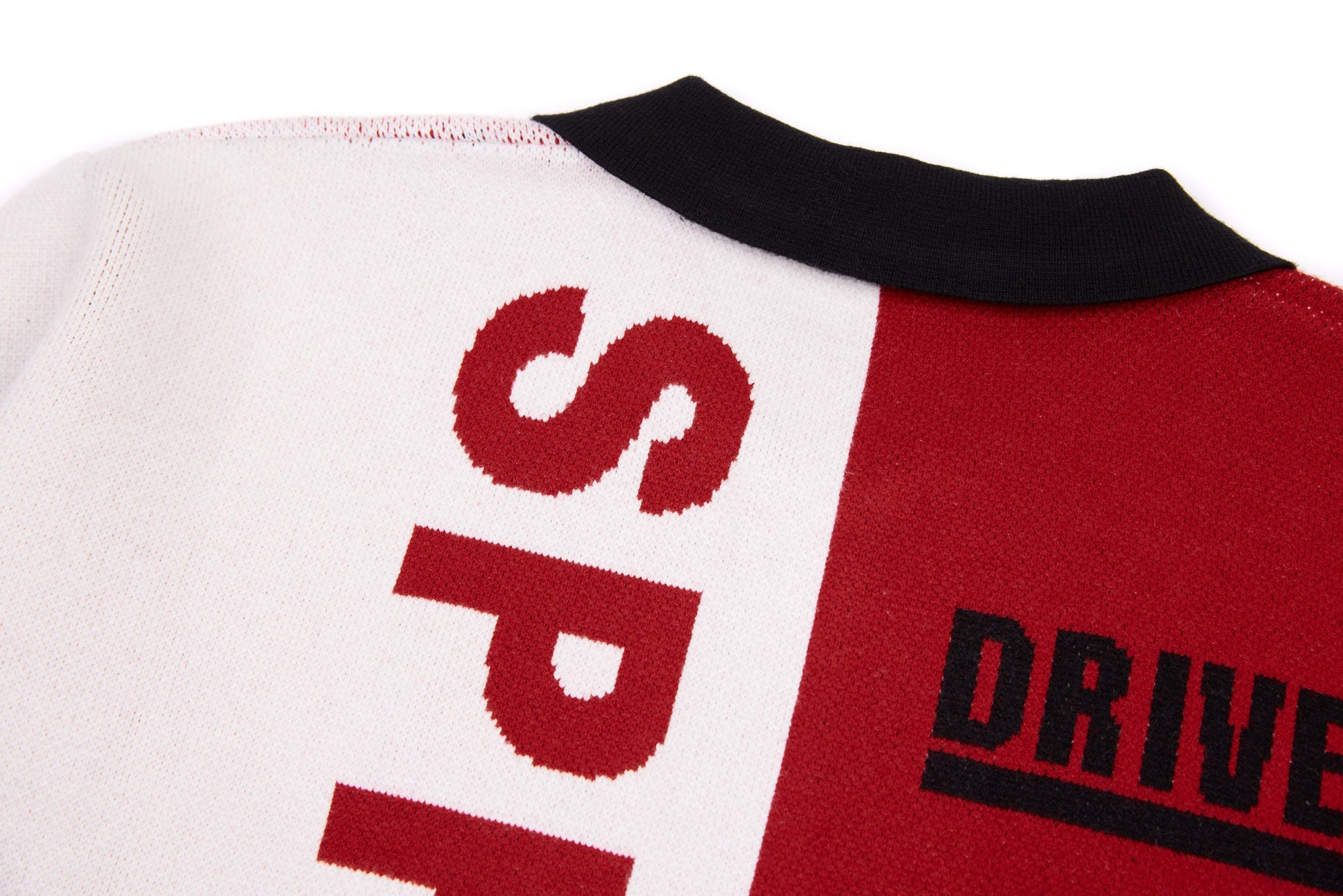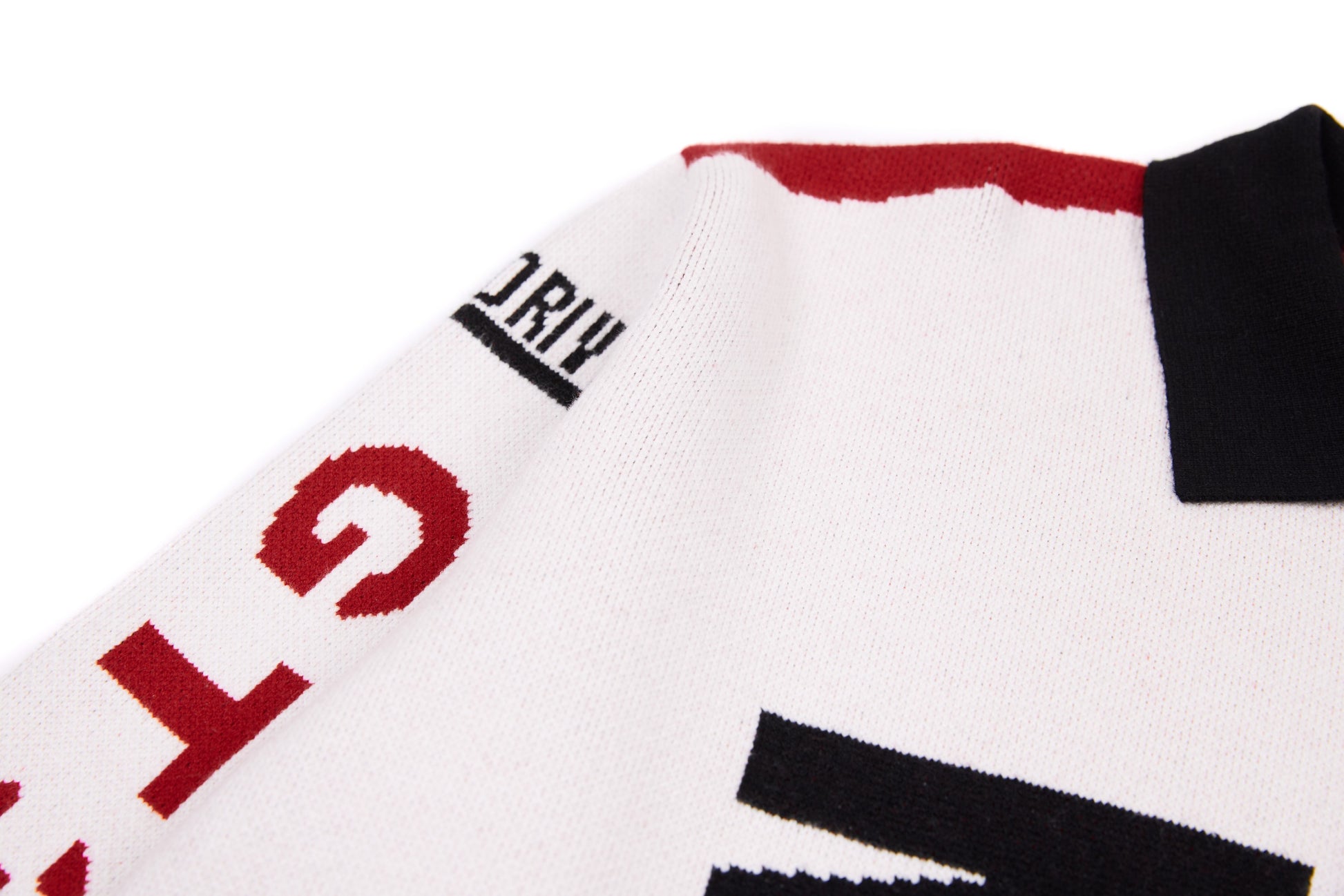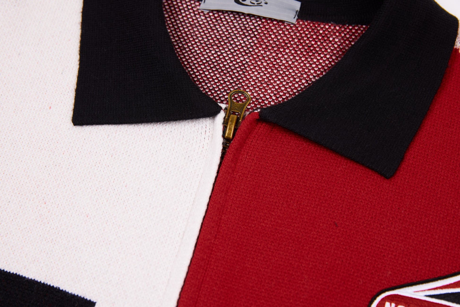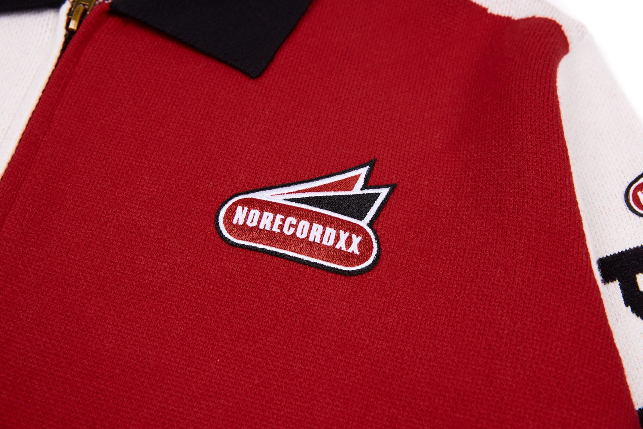 Details: Split-color knit, oversized racing typography, sleeve graphics, embroidered chest patch, metal zip front
