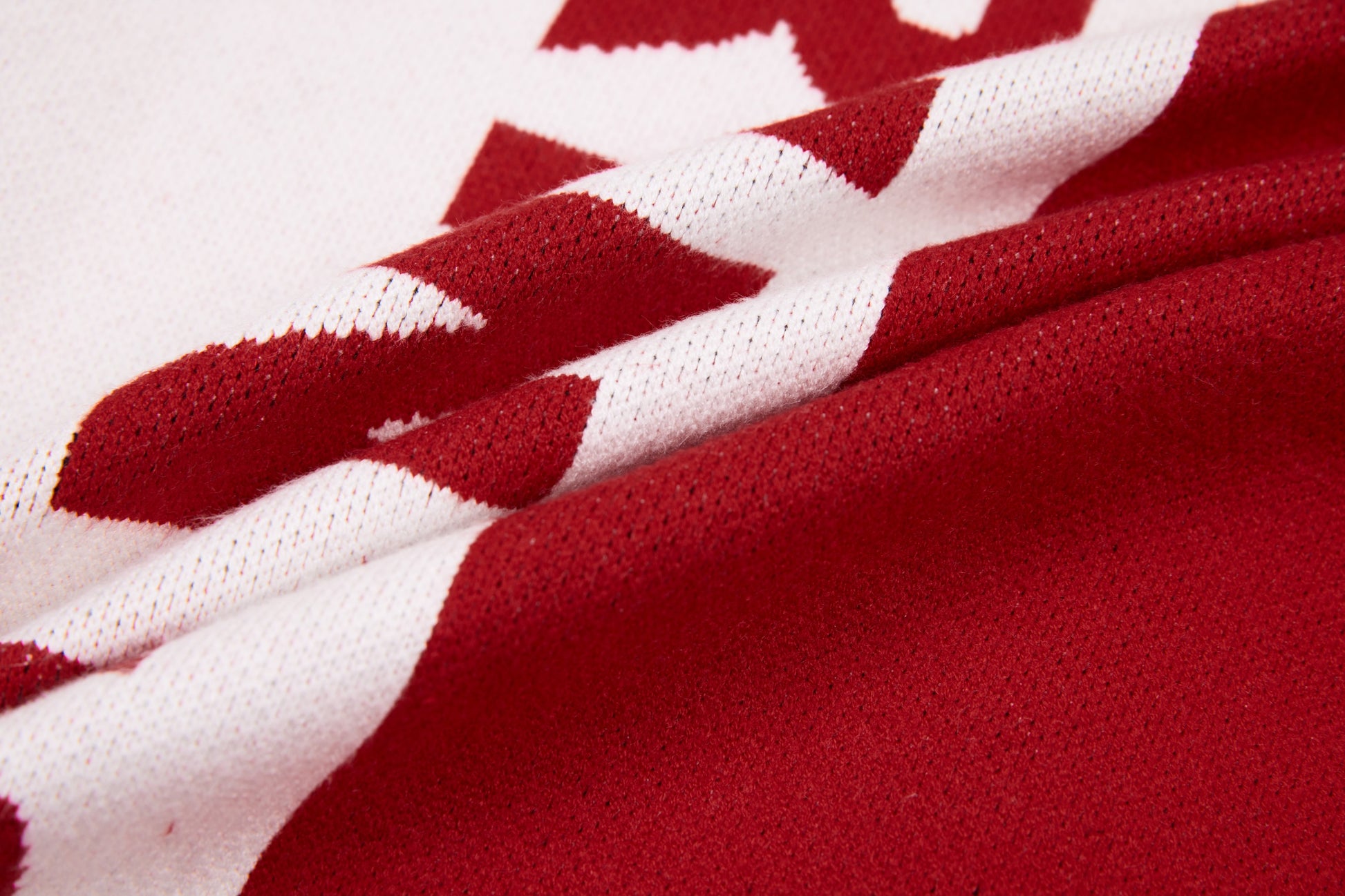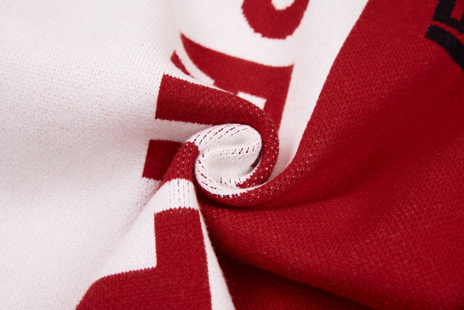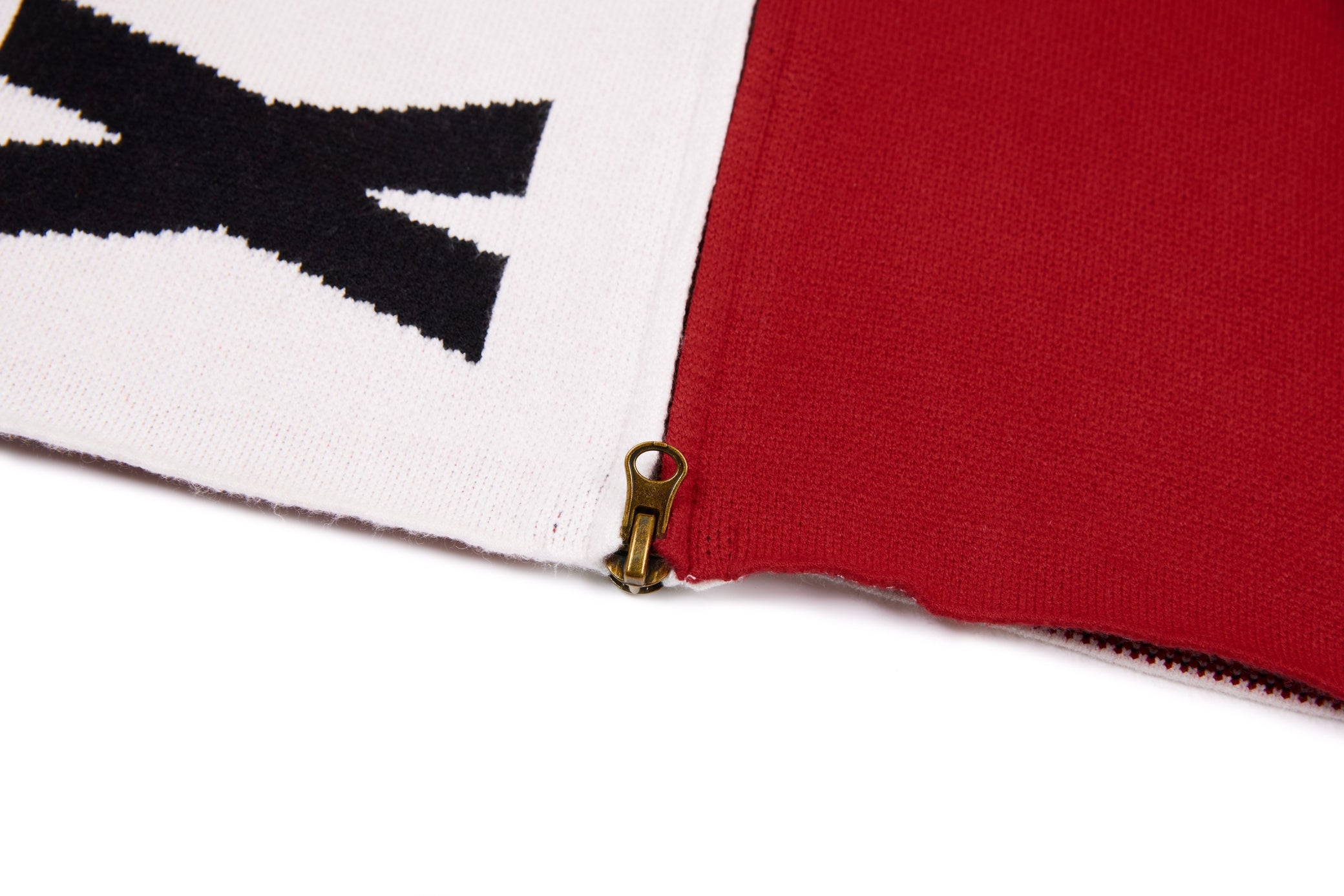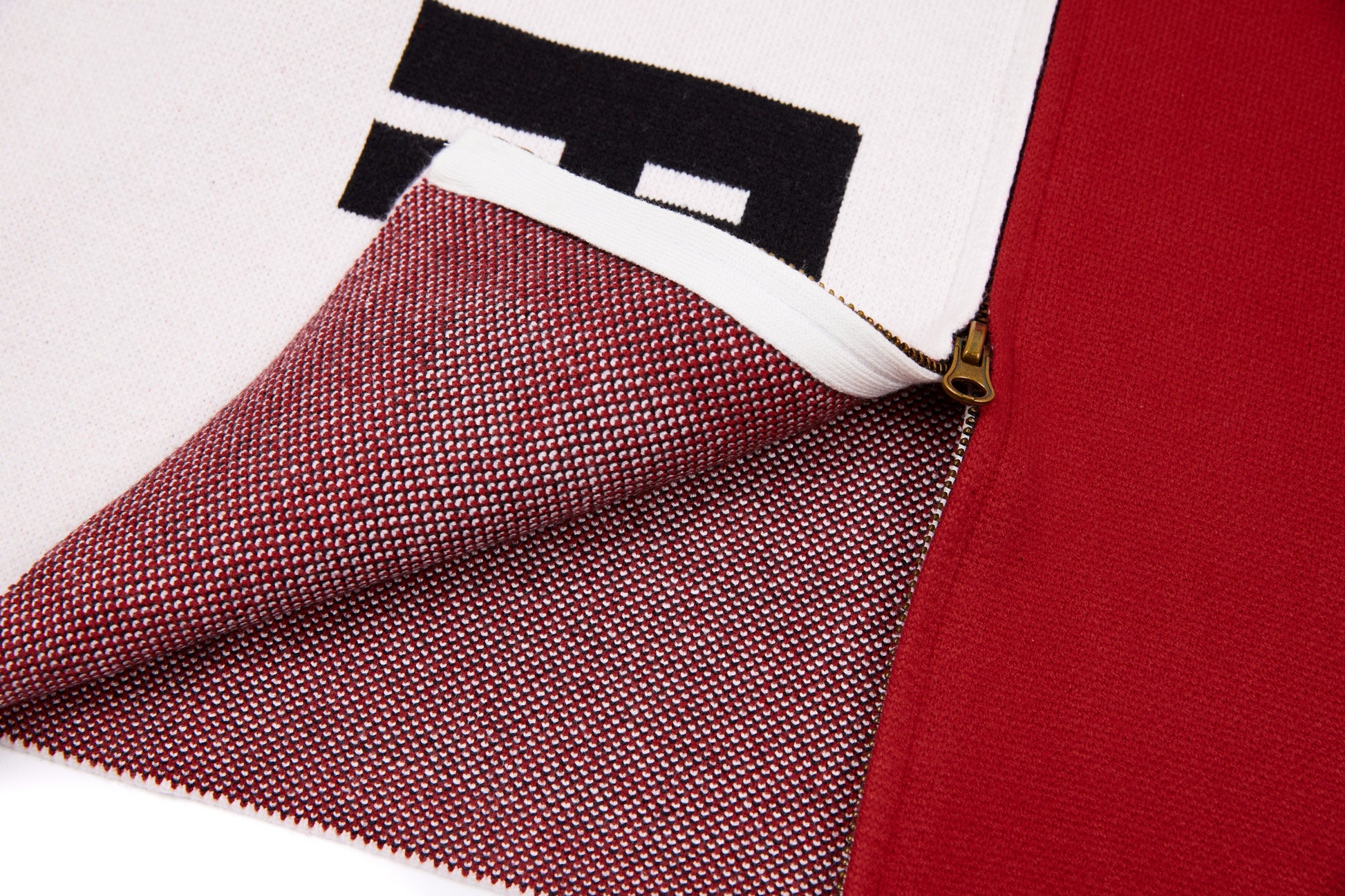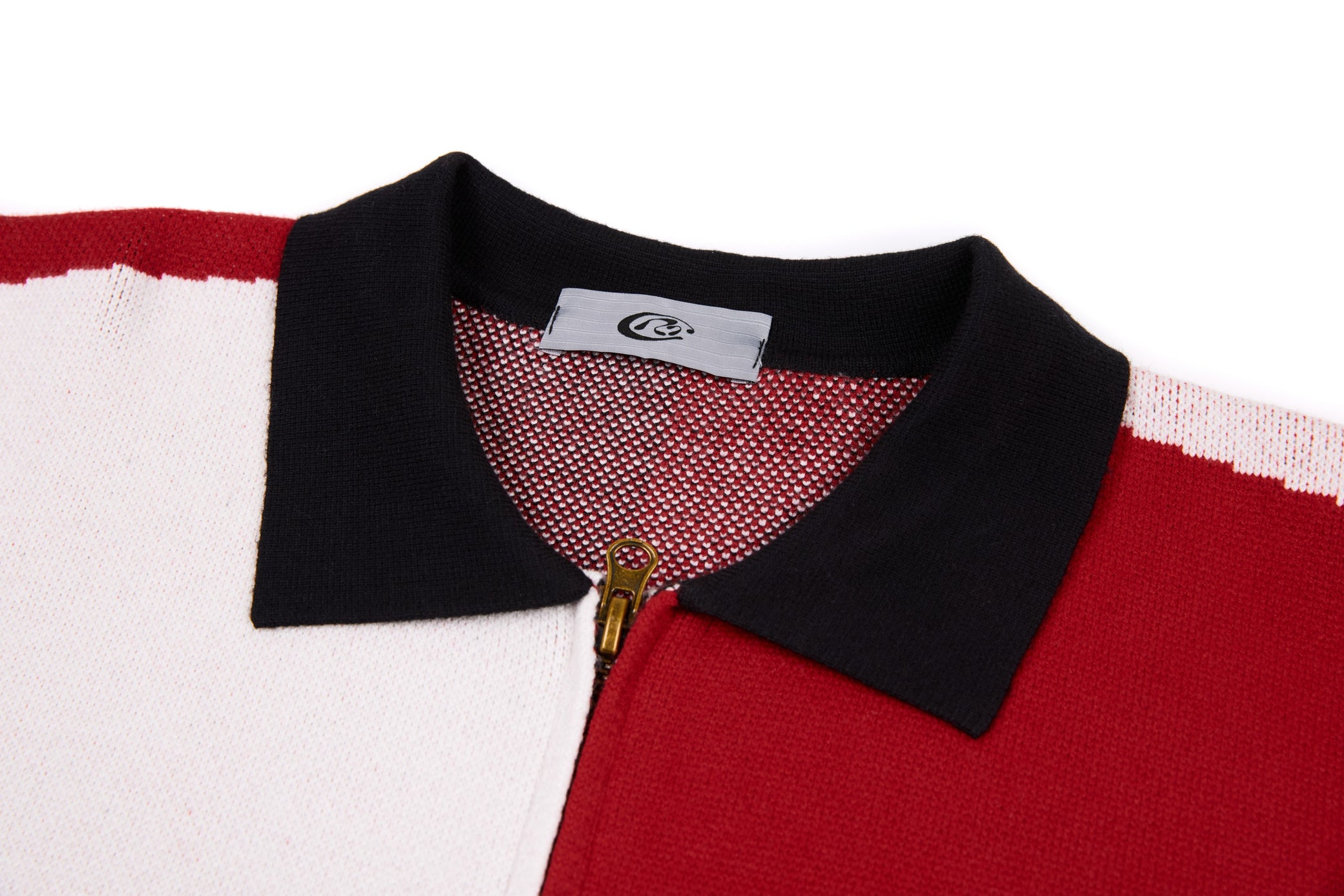 Details: Split-color knit, oversized racing typography, sleeve graphics, embroidered chest patch, metal zip front
