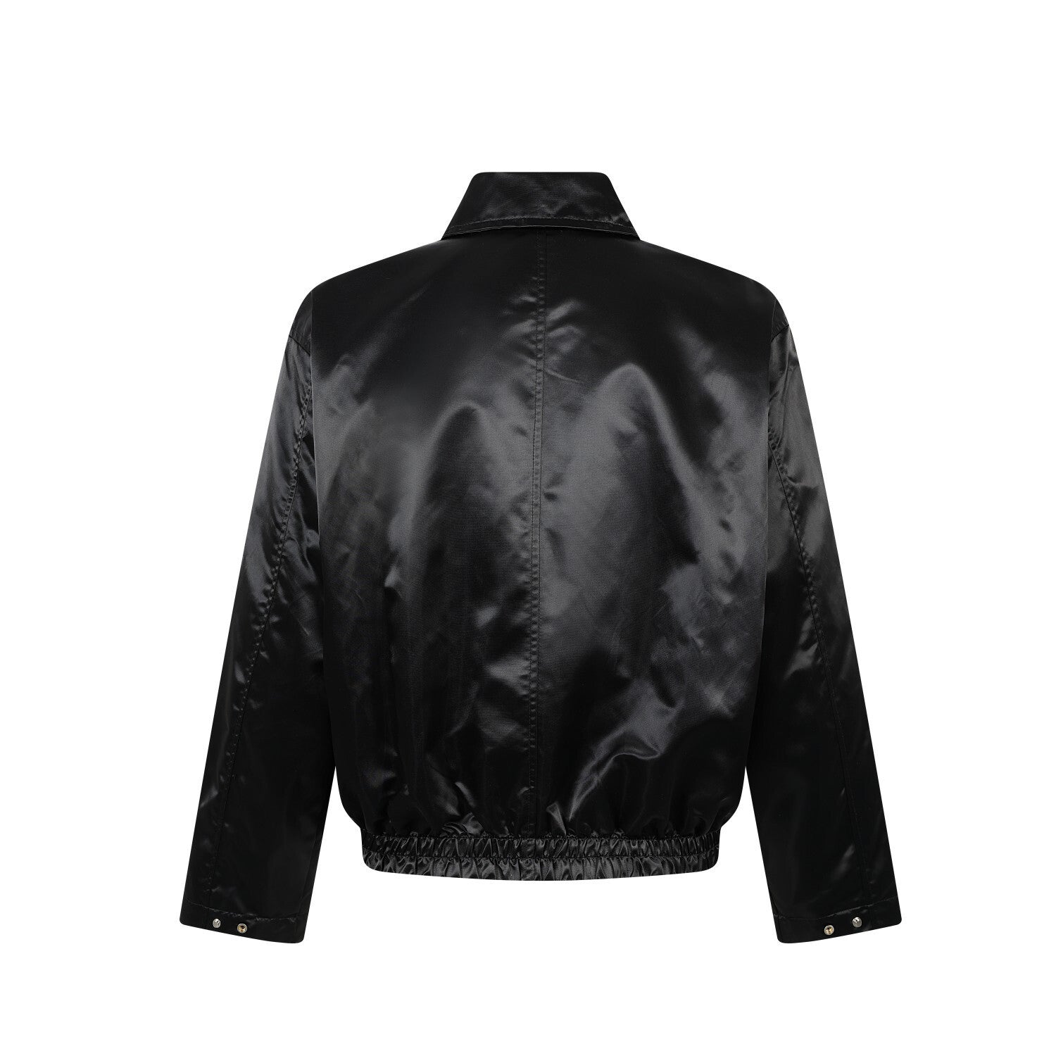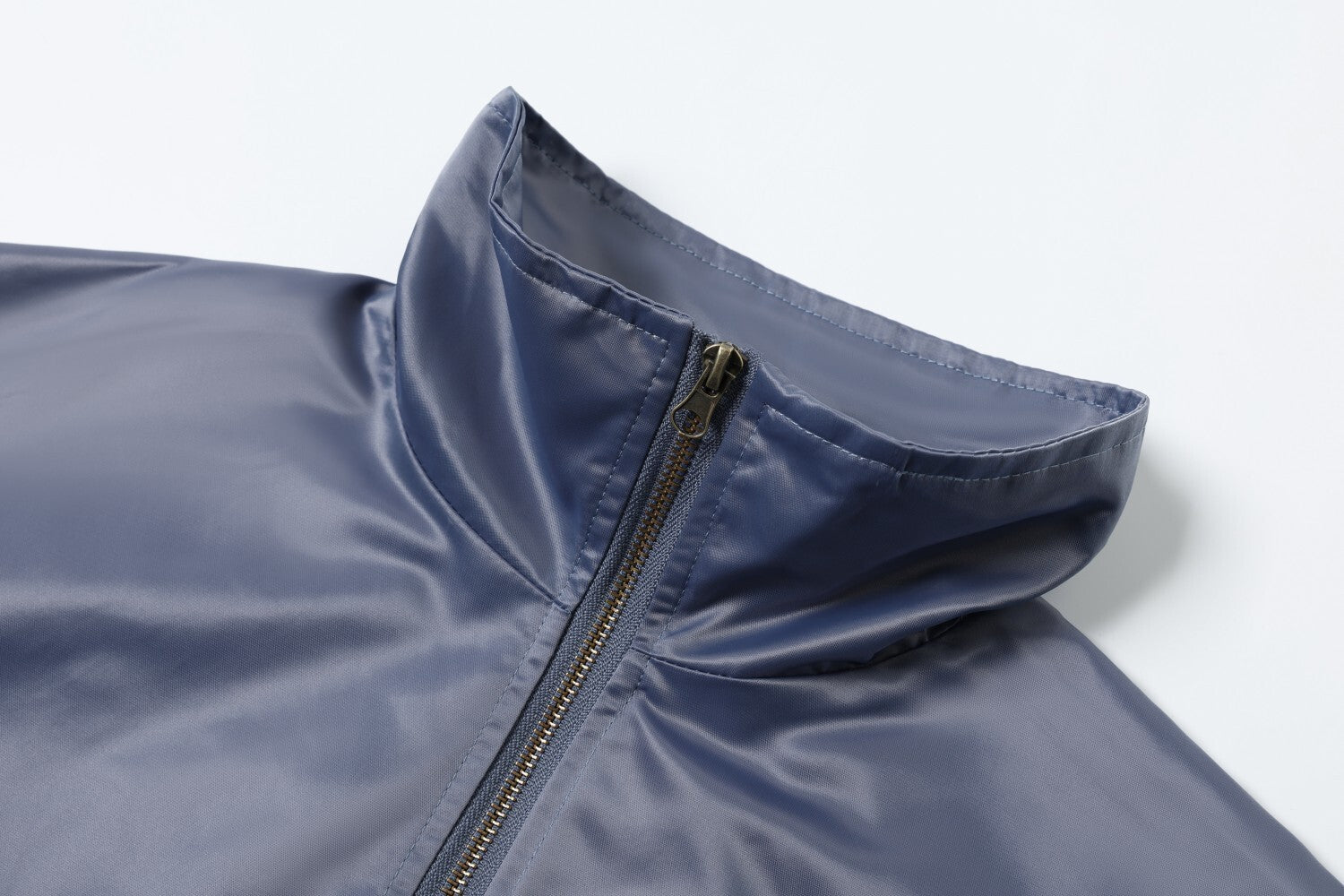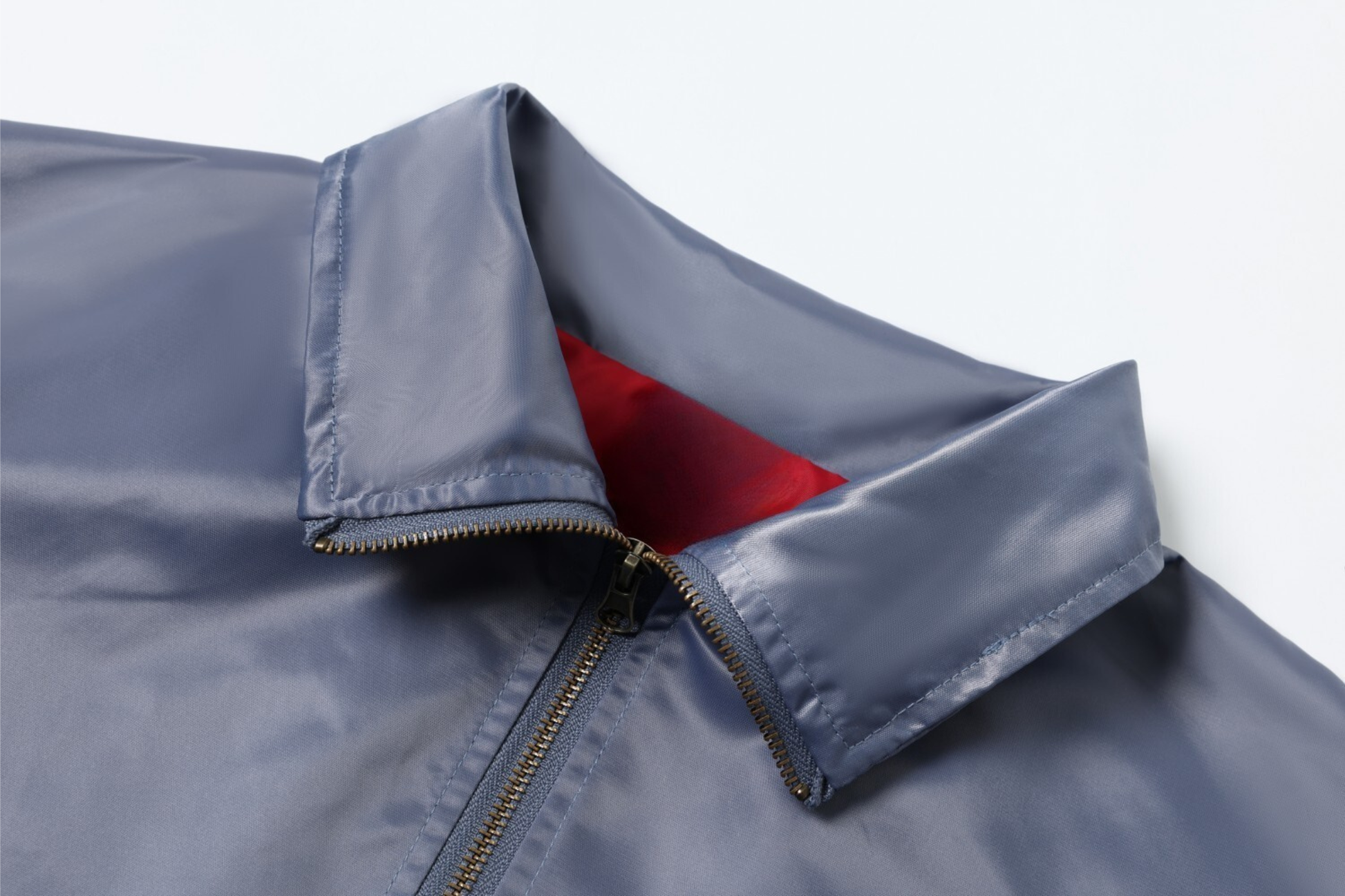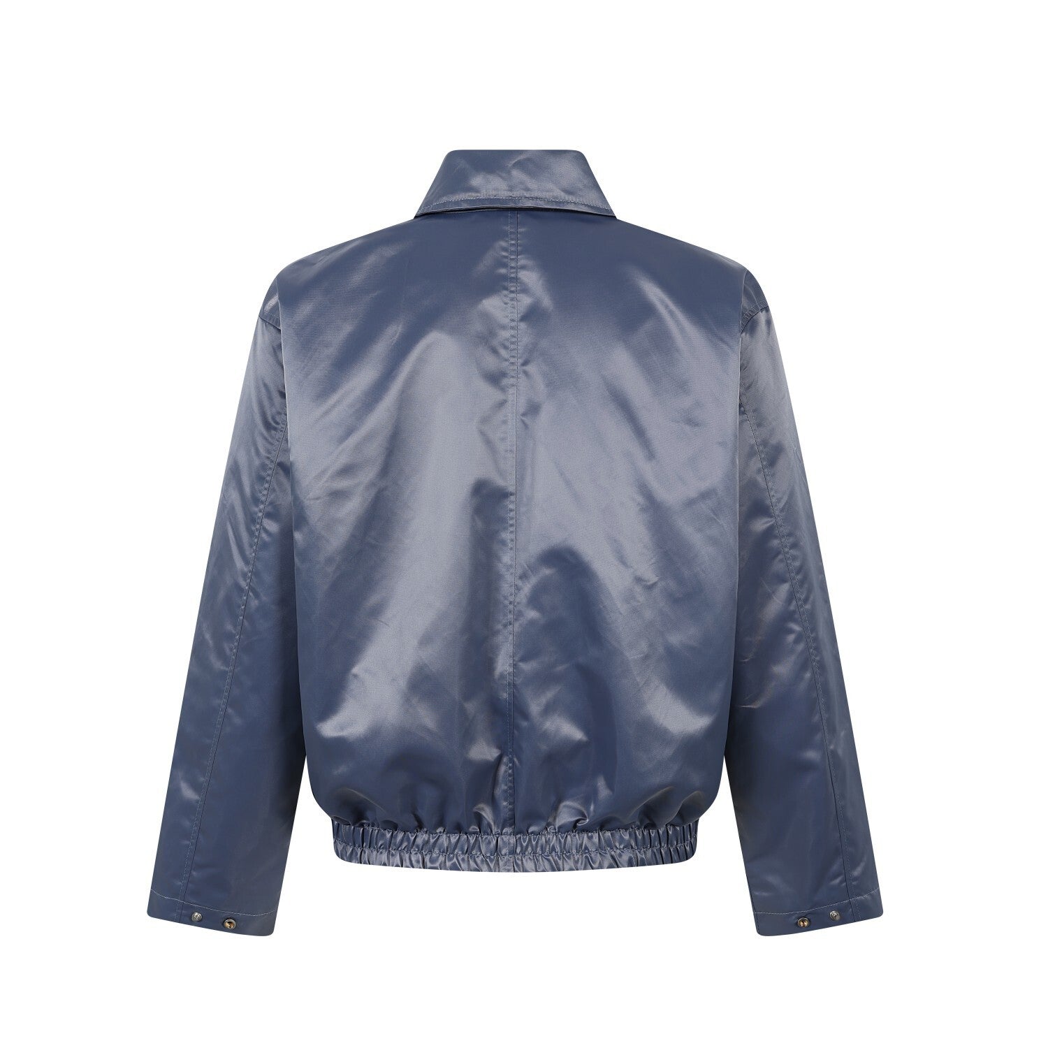 Clothing details: Smooth nylon shell with subtle sheen, classic fold-down collar, full zip-front closure, elasticated hem, side slit pockets, statement chest patch detailing, lightweight wind-resistant construction, available in multiple colorways.
