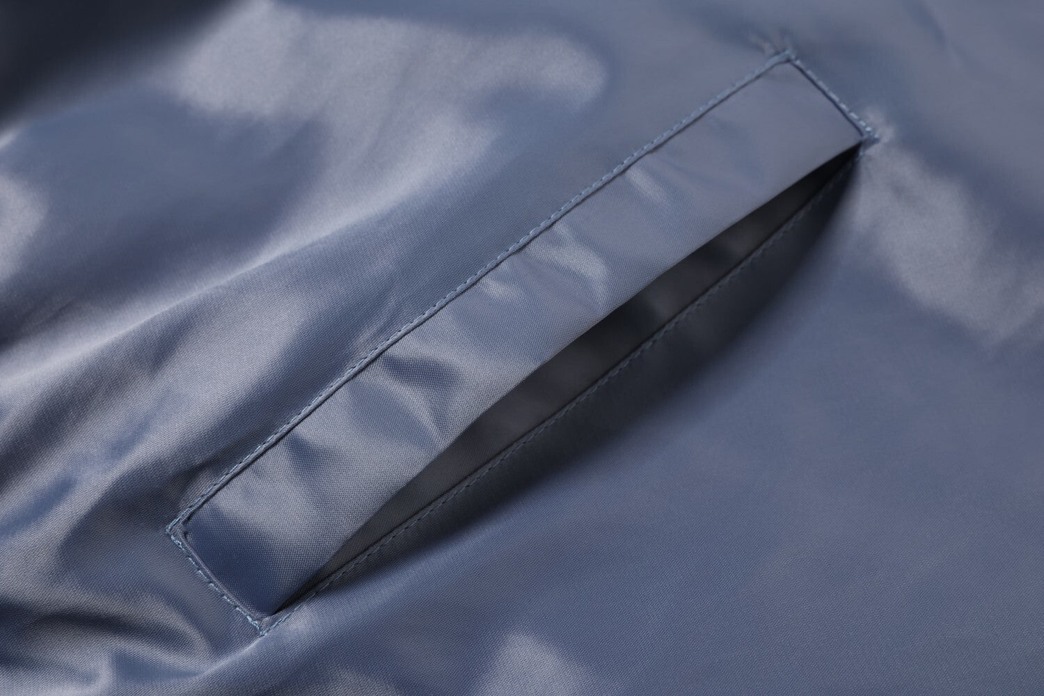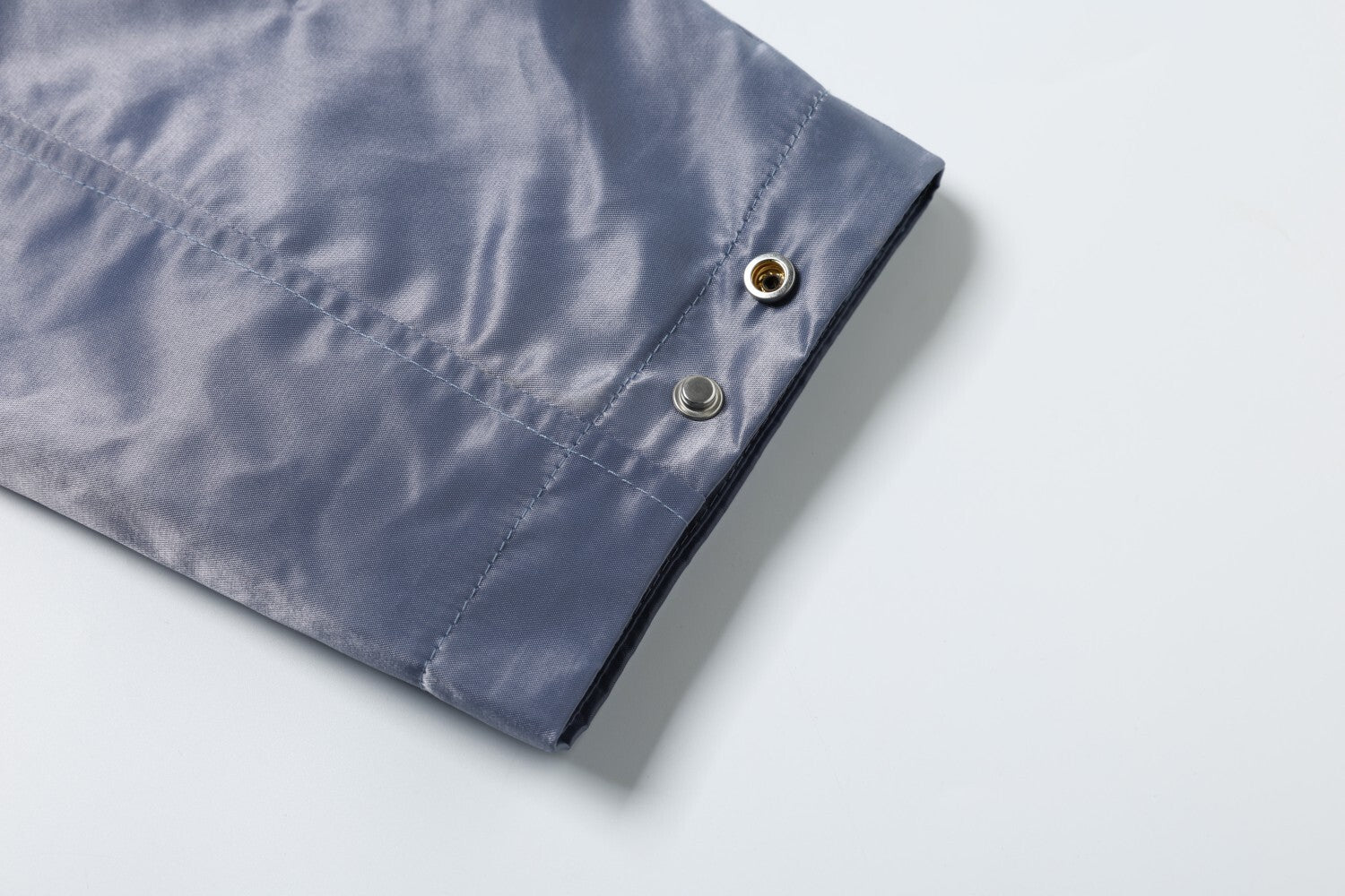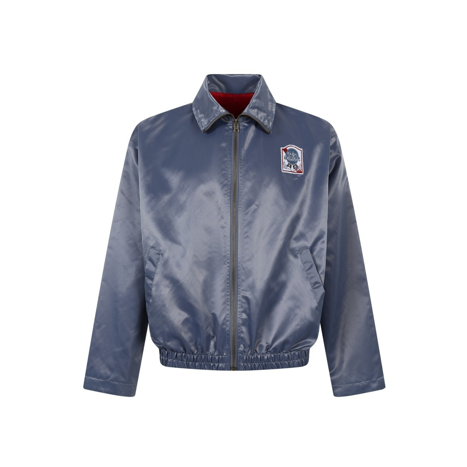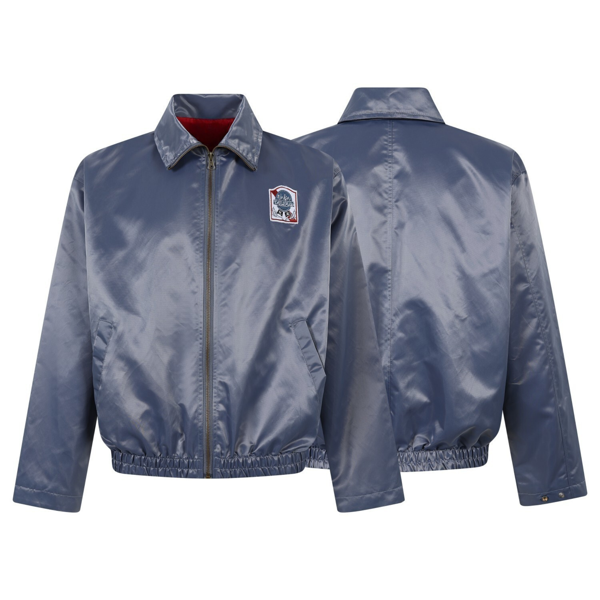 Clothing details: Smooth nylon shell with subtle sheen, classic fold-down collar, full zip-front closure, elasticated hem, side slit pockets, statement chest patch detailing, lightweight wind-resistant construction, available in multiple colorways.