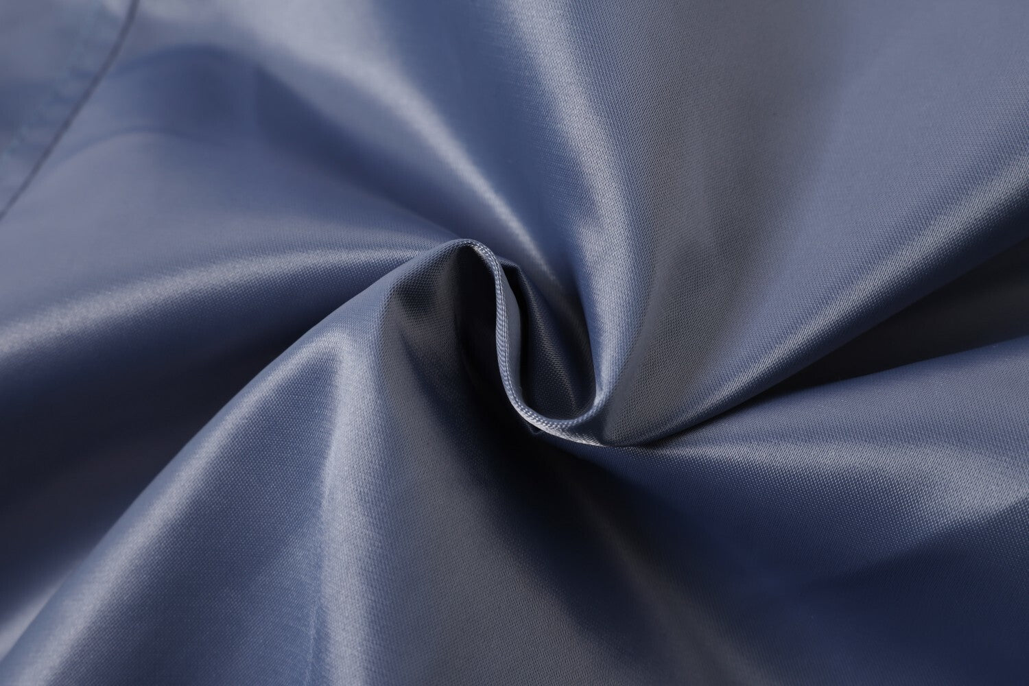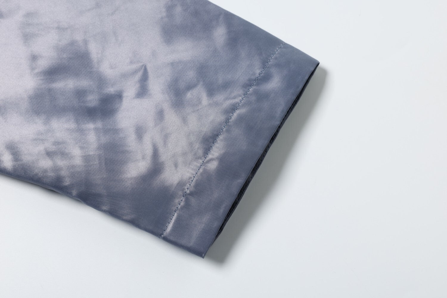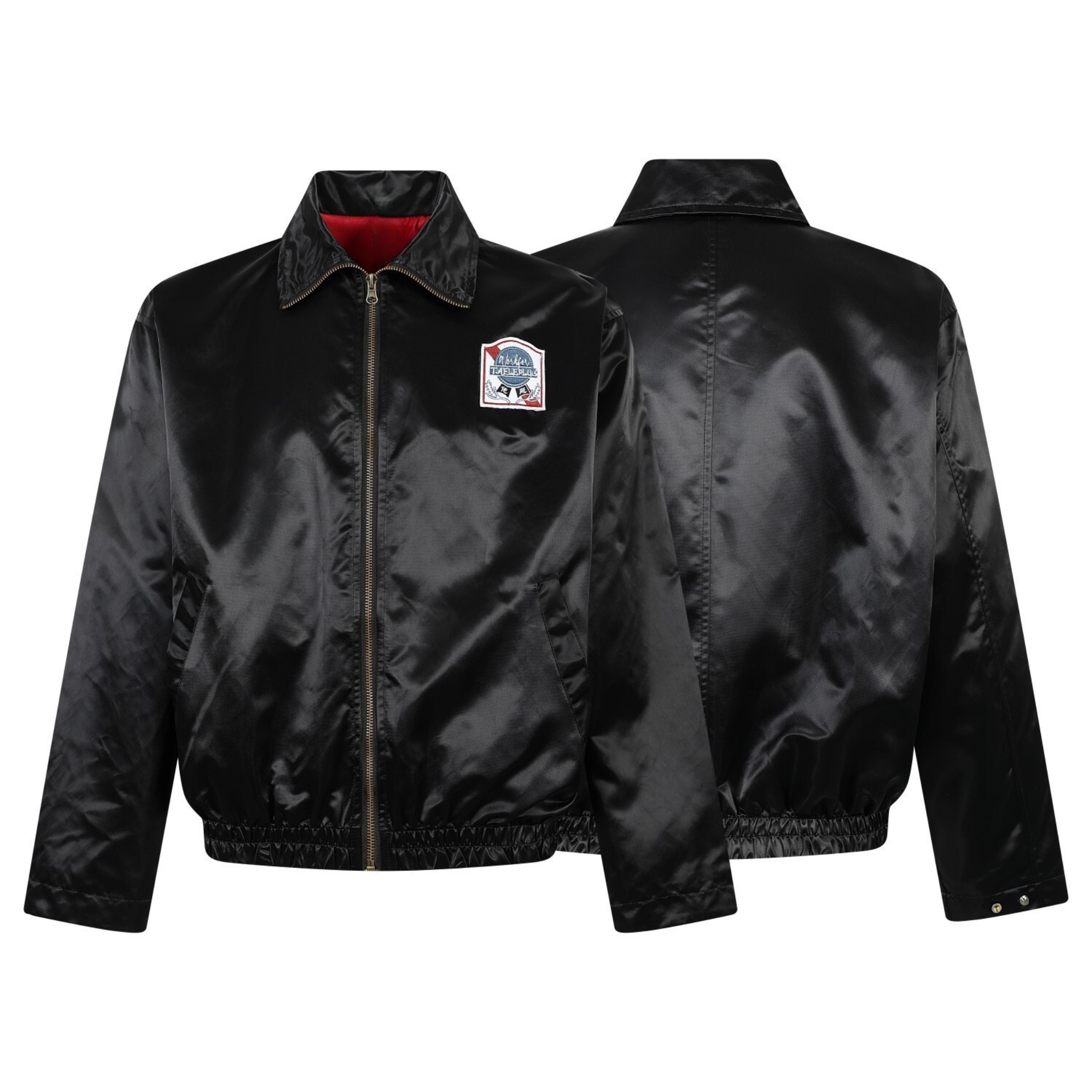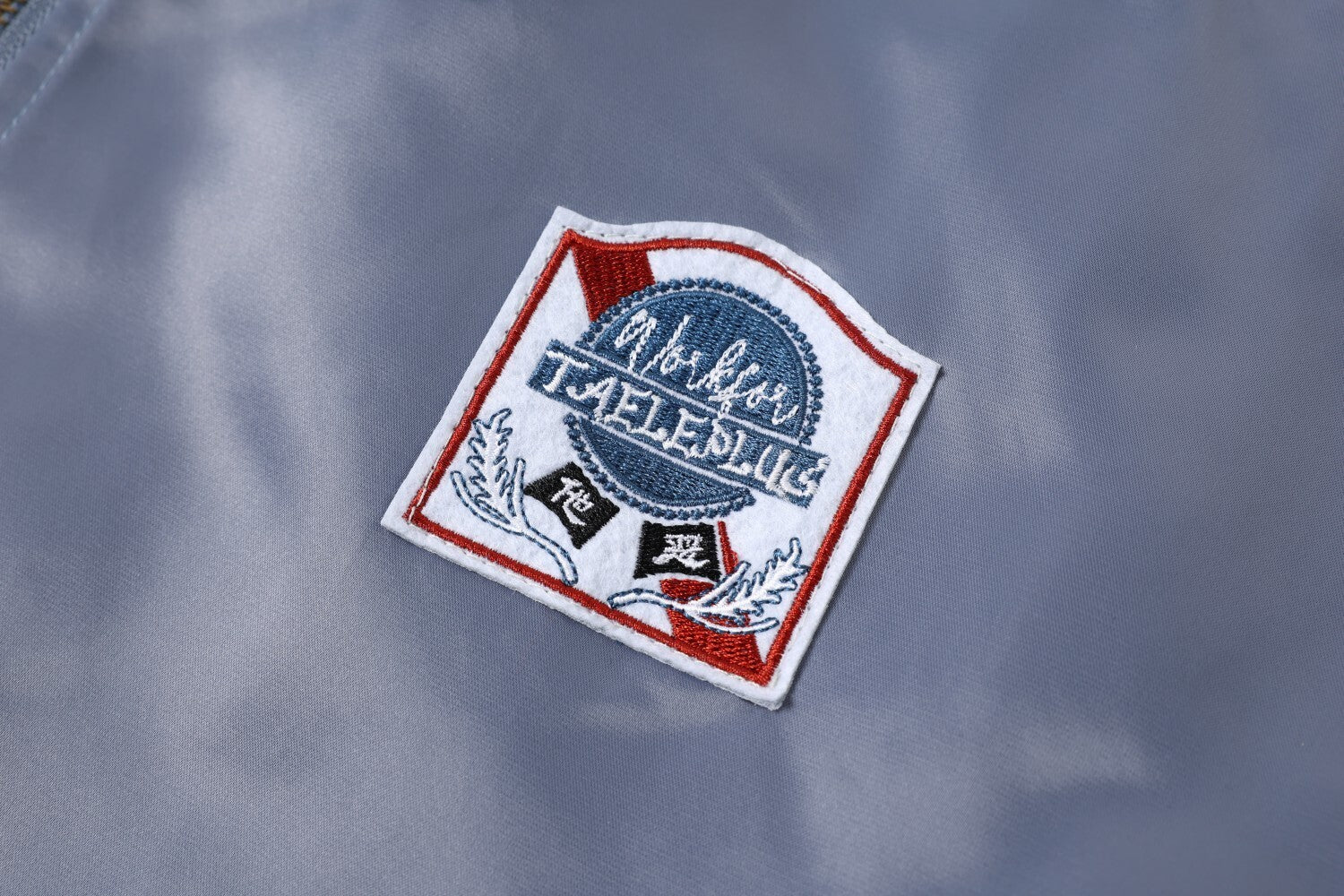 Clothing details: Smooth nylon shell with subtle sheen, classic fold-down collar, full zip-front closure, elasticated hem, side slit pockets, statement chest patch detailing, lightweight wind-resistant construction, available in multiple colorways.