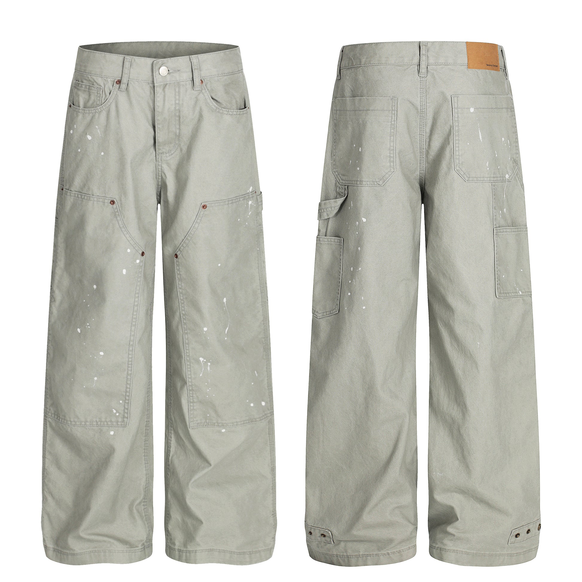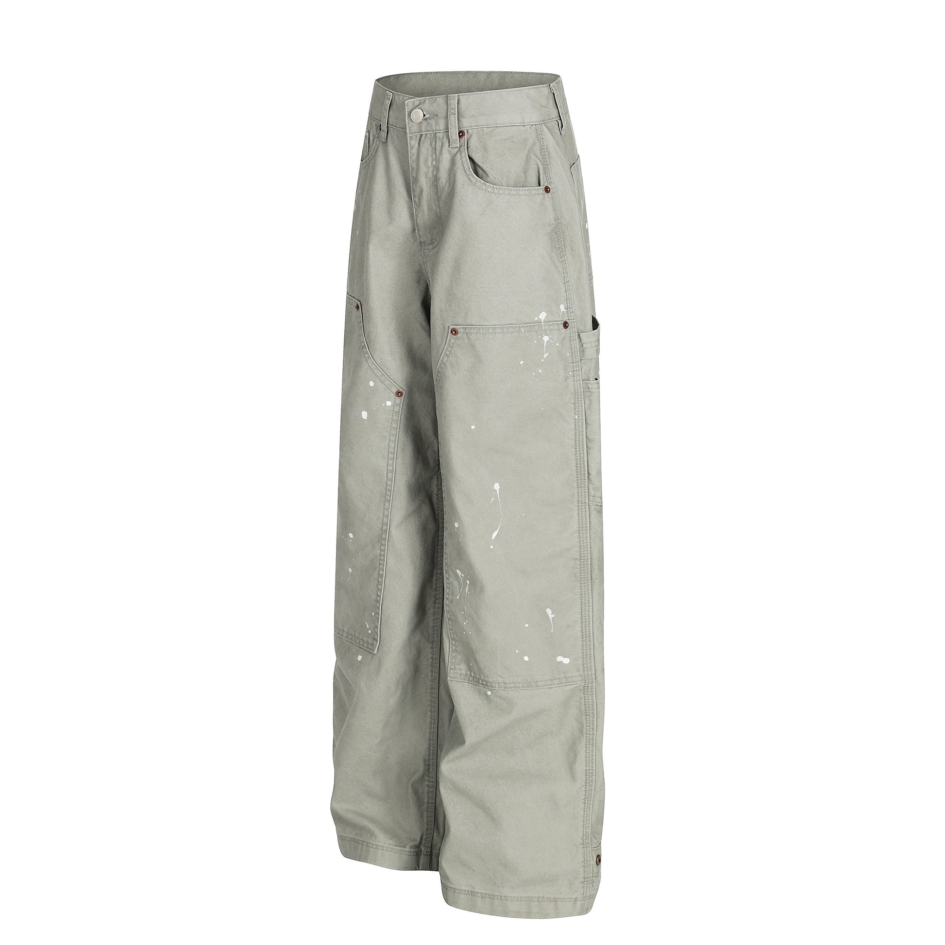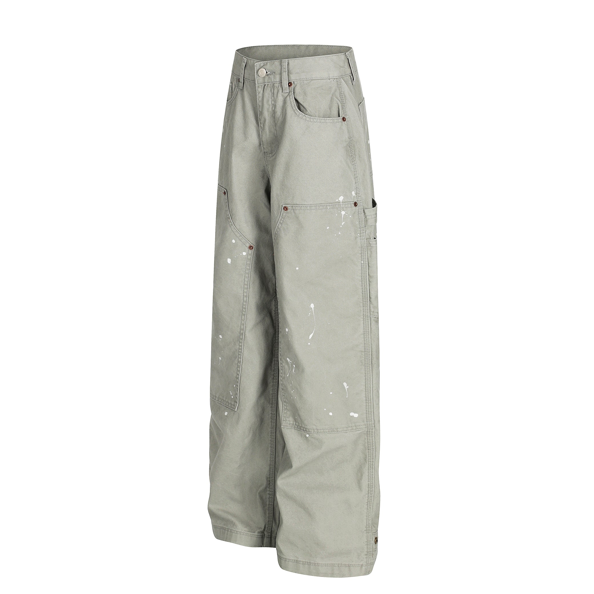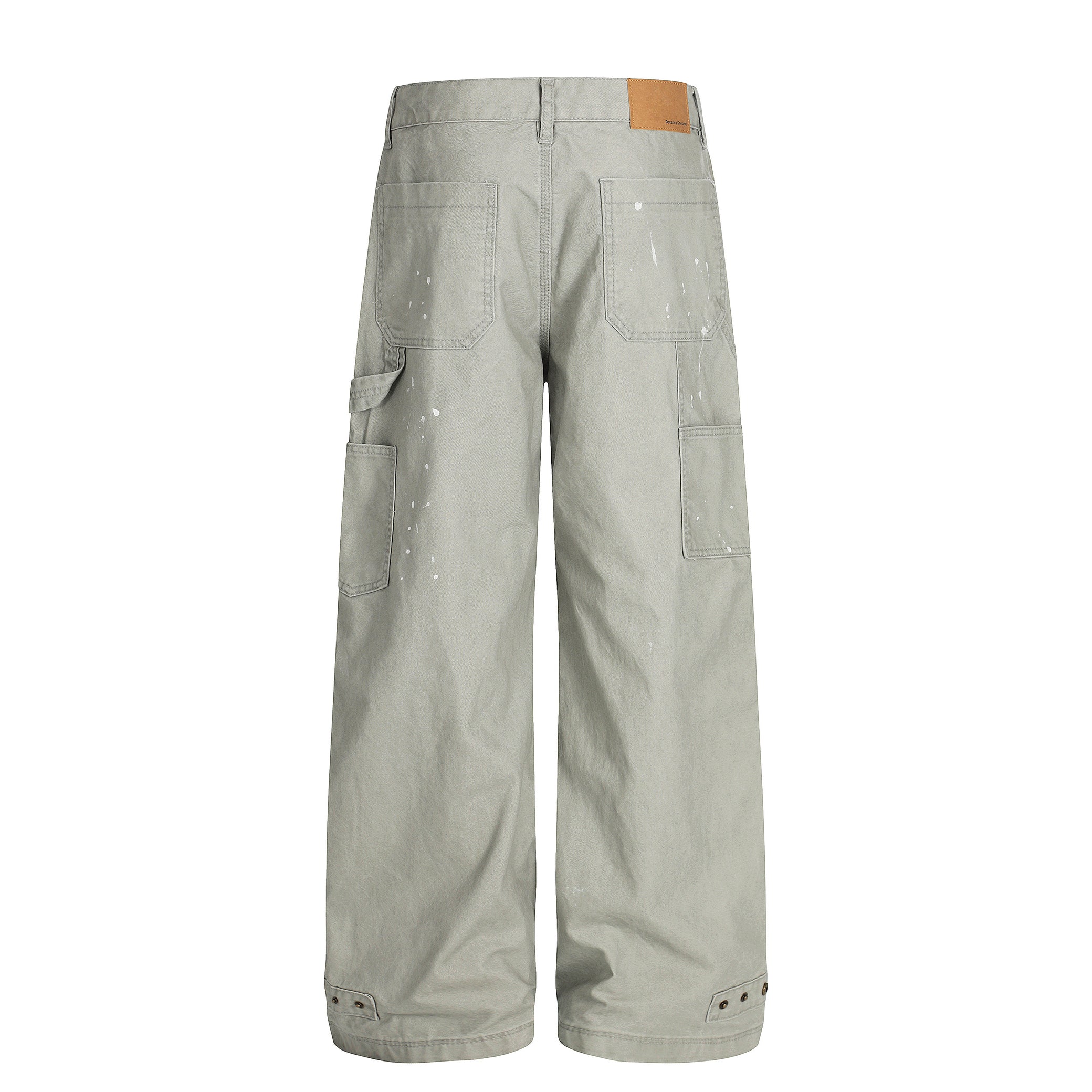 Details: Hand-splattered effect, utility side pocket, metal rivet reinforcement, adjustable hem tabs, relaxed wide-leg silhouette