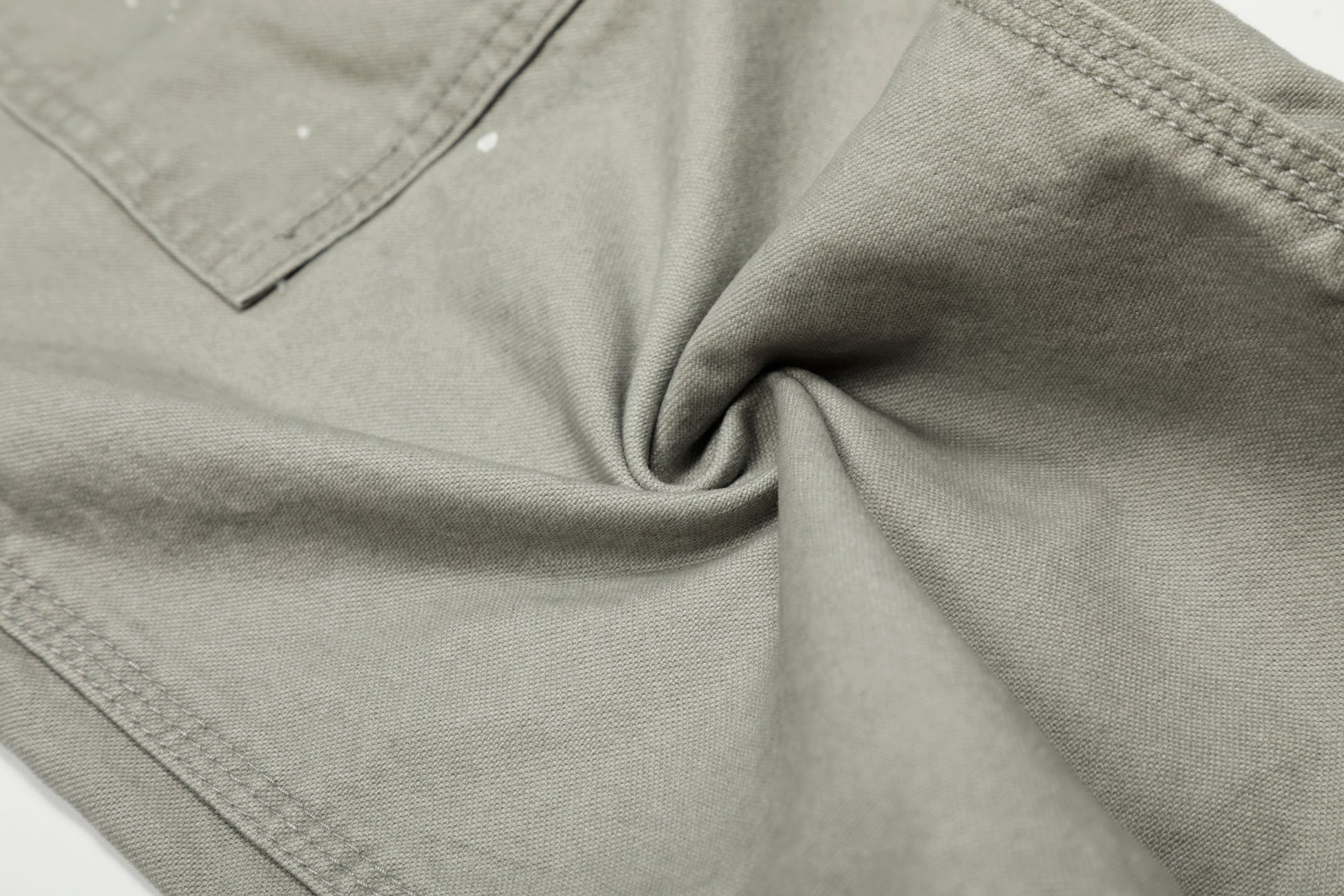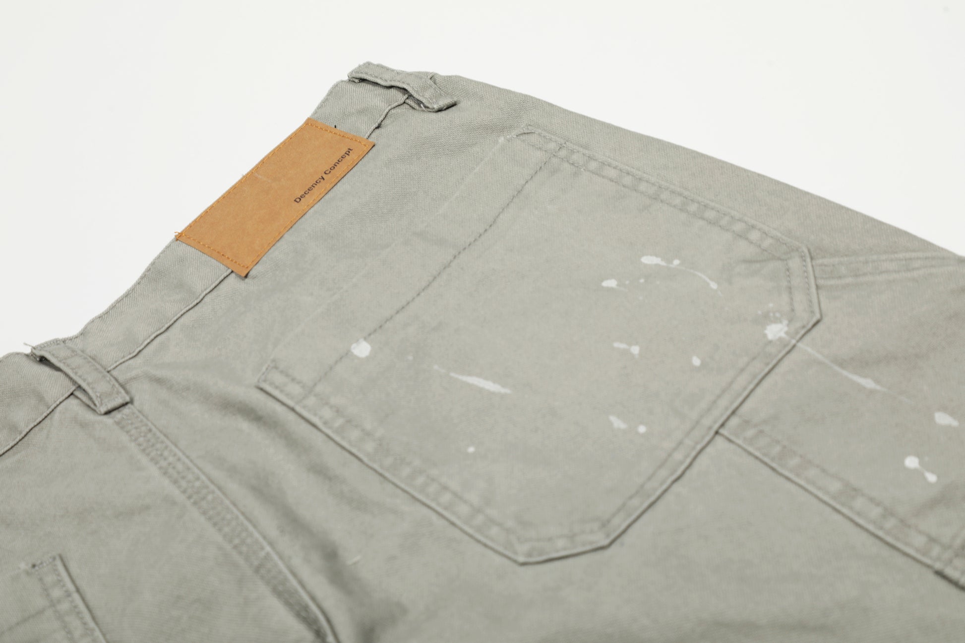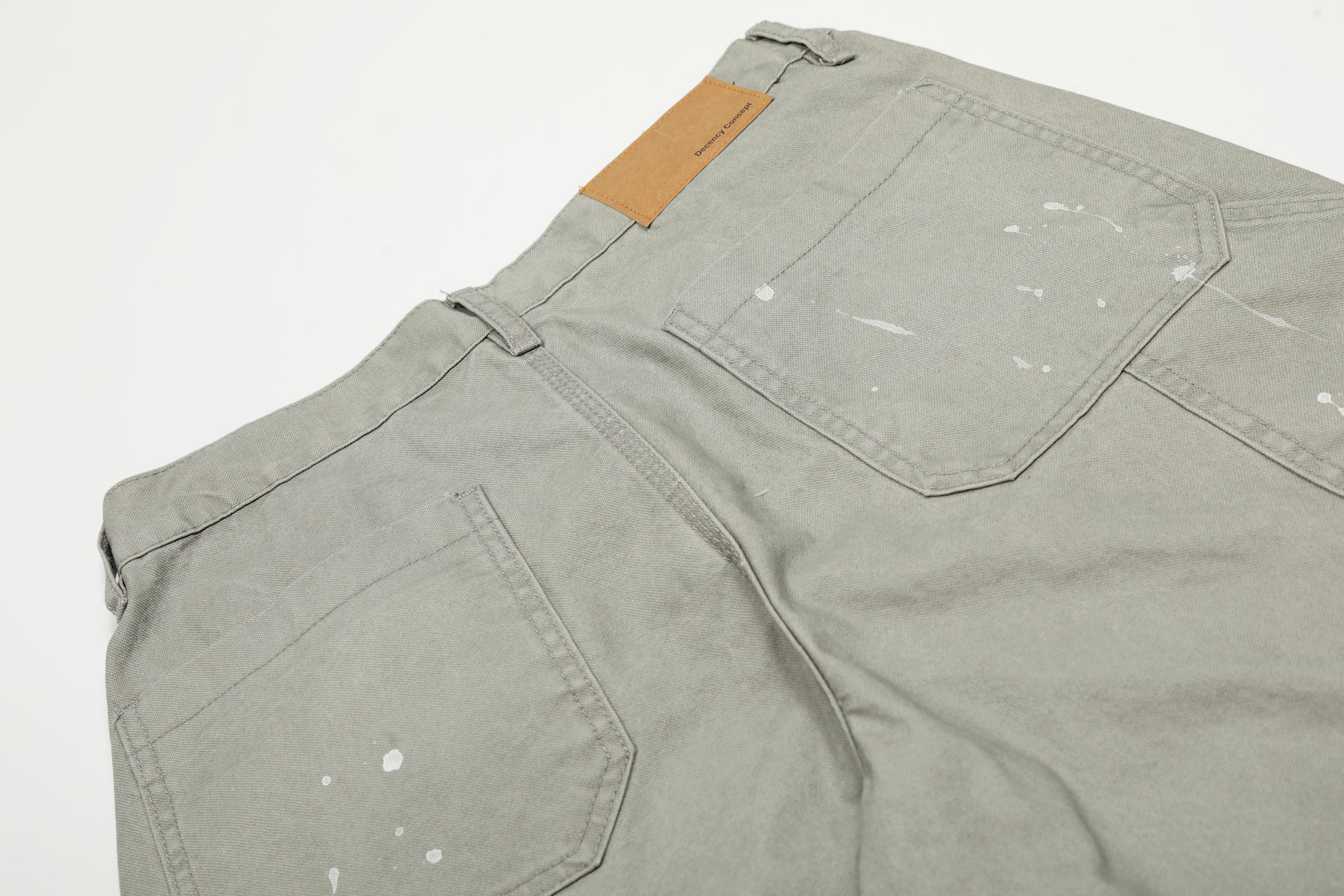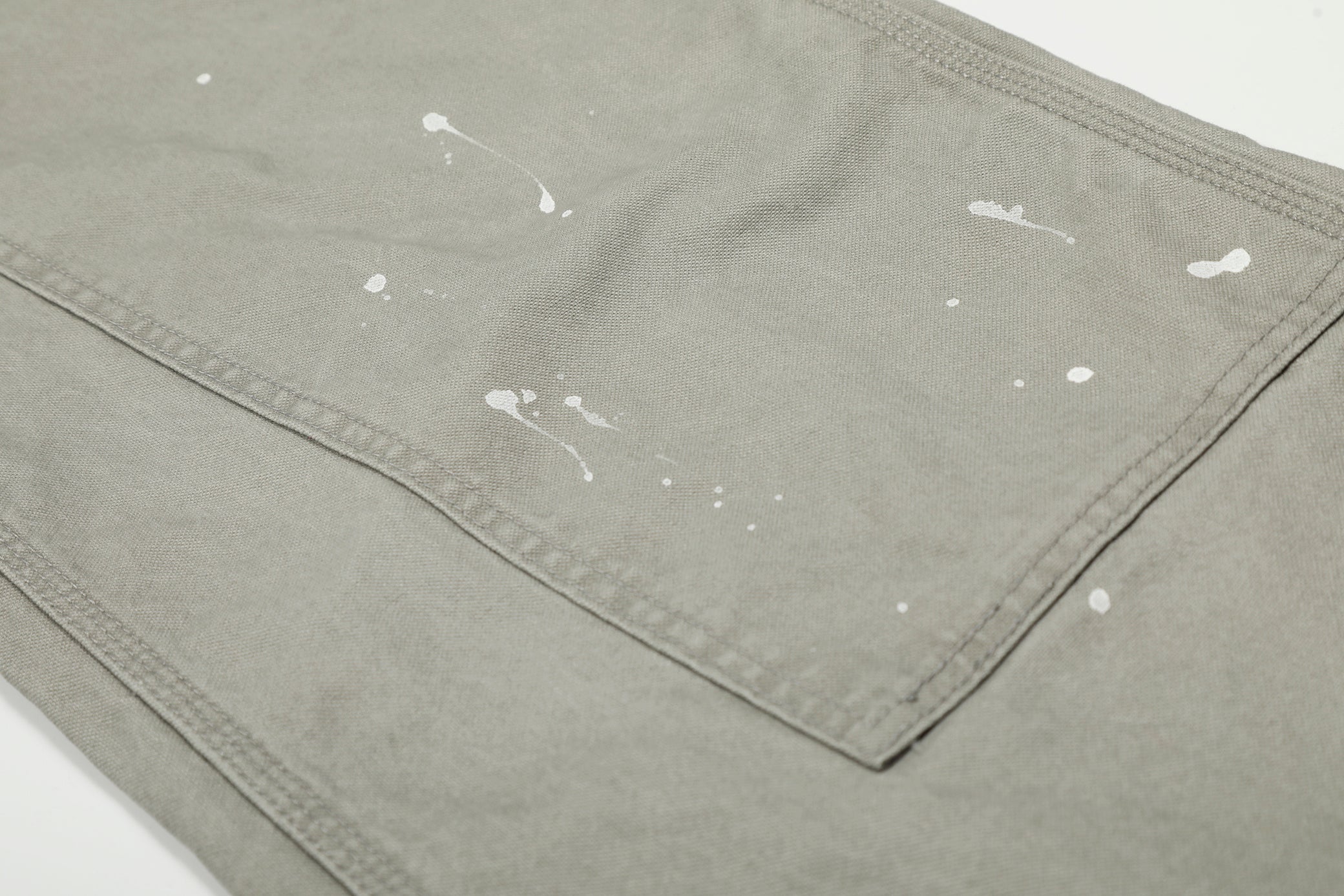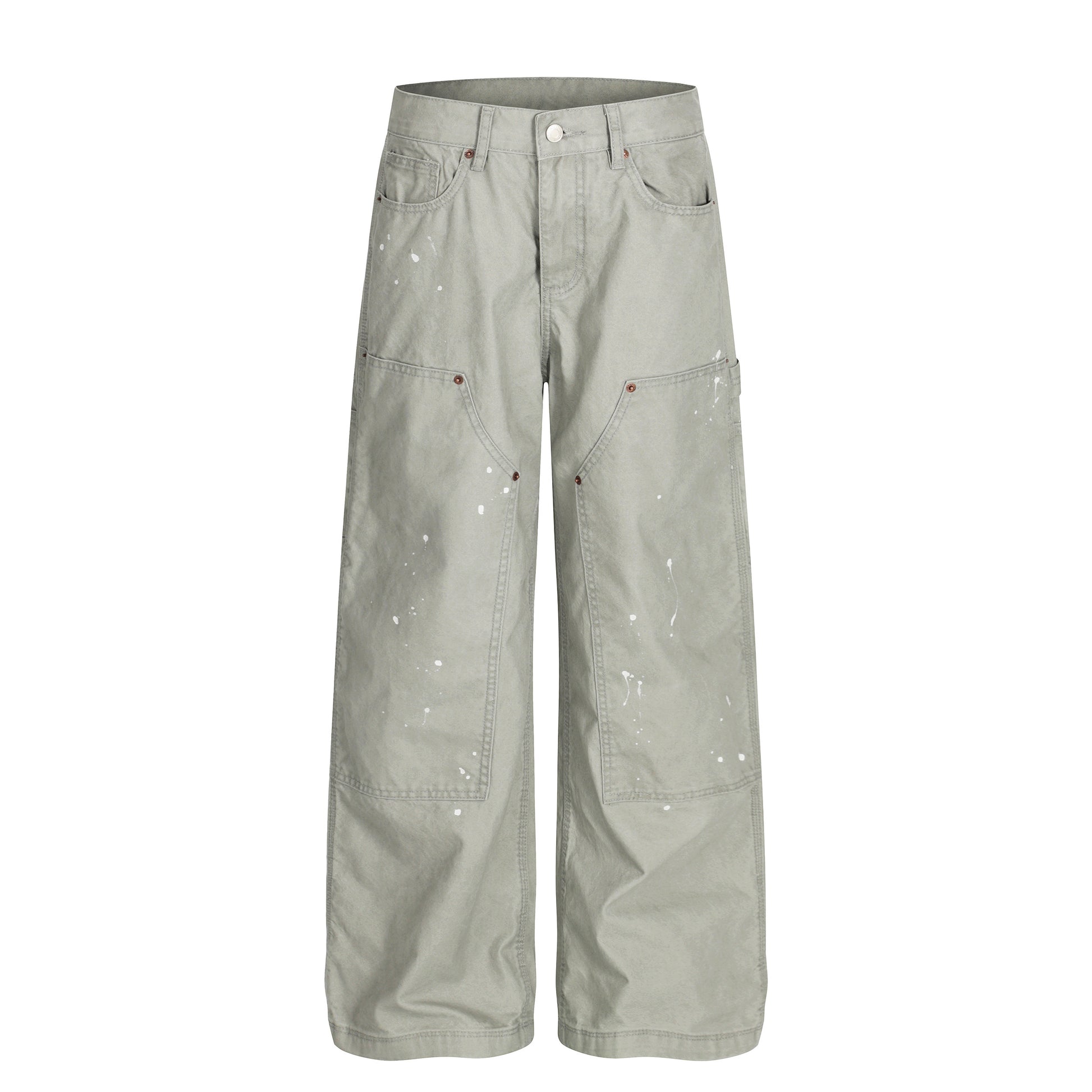 Details: Hand-splattered effect, utility side pocket, metal rivet reinforcement, adjustable hem tabs, relaxed wide-leg silhouette