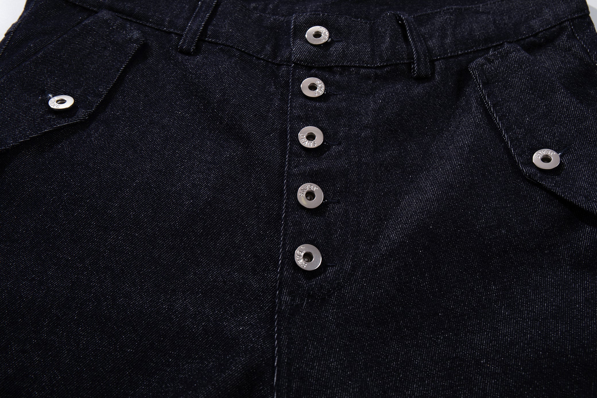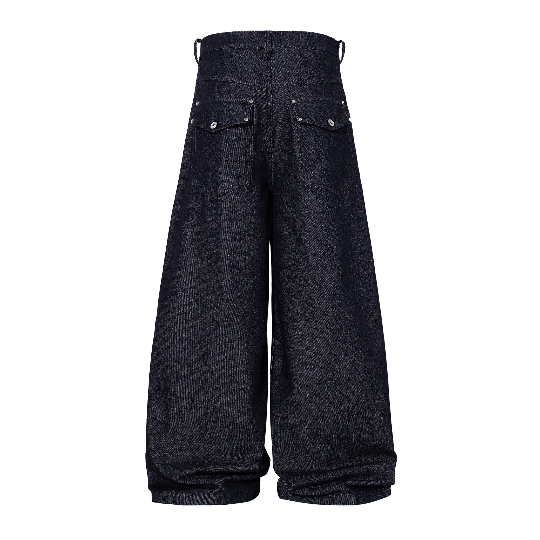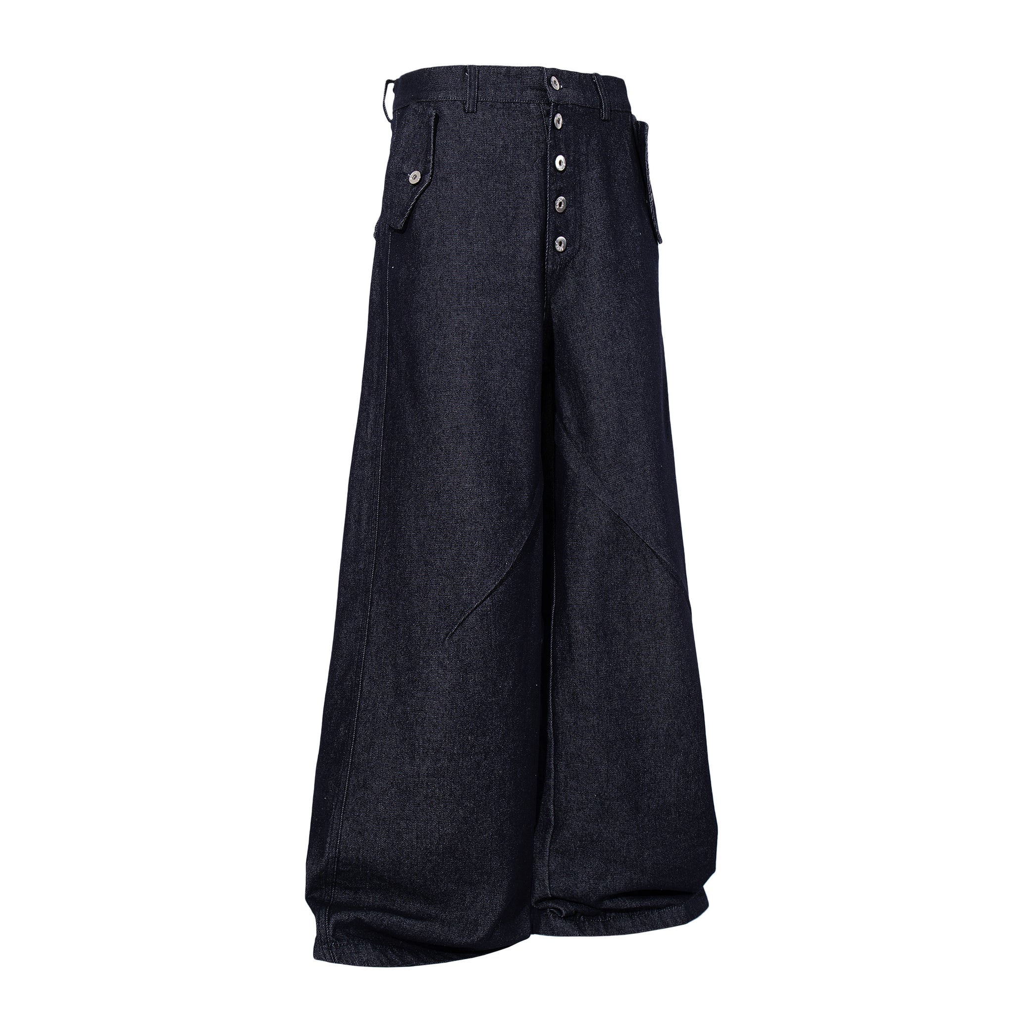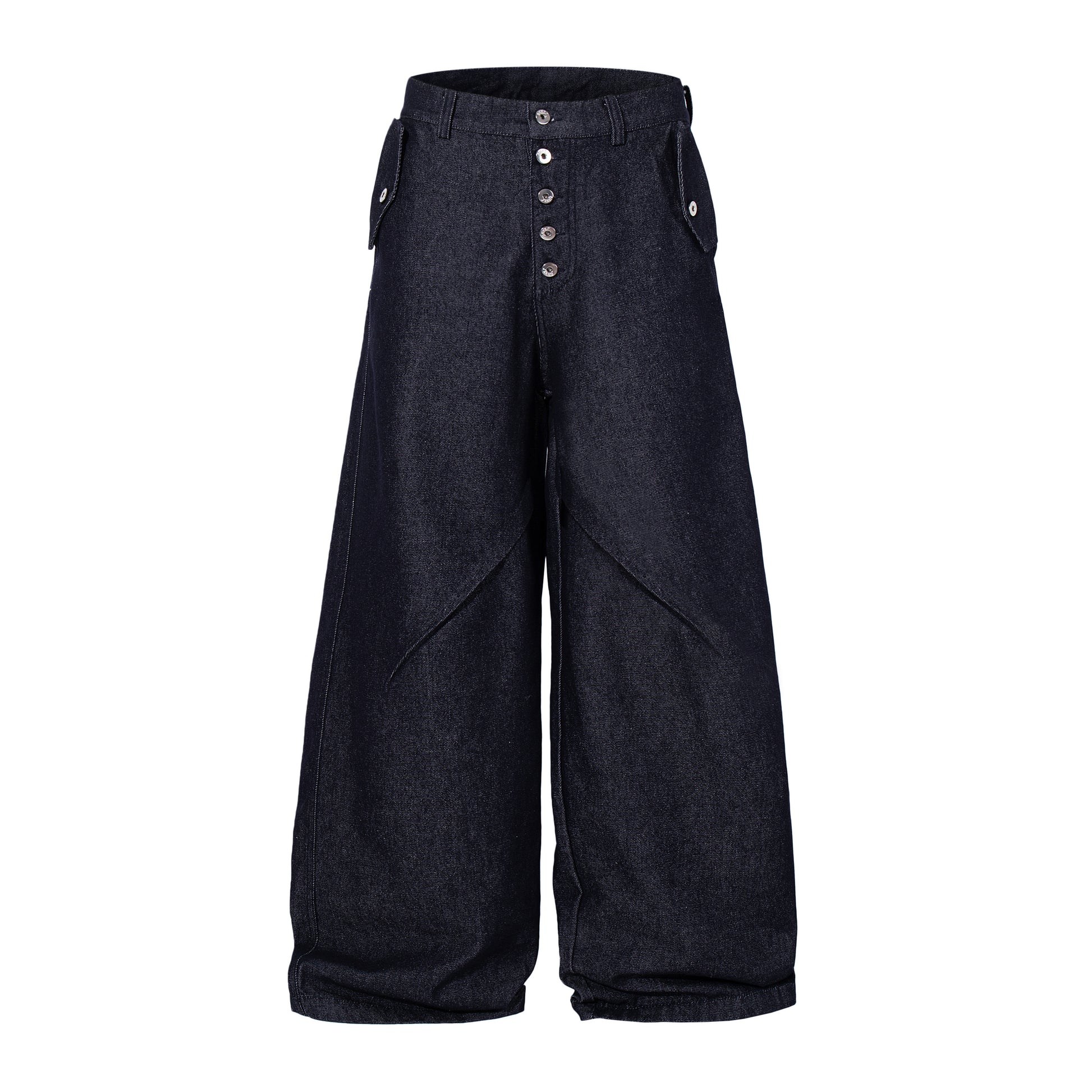 Clothing details: Wide-leg denim pants design, front panel construction detailing, high-rise waist, button fly front closure, functional pocket layout, relaxed fit, structured cotton denim fabric.