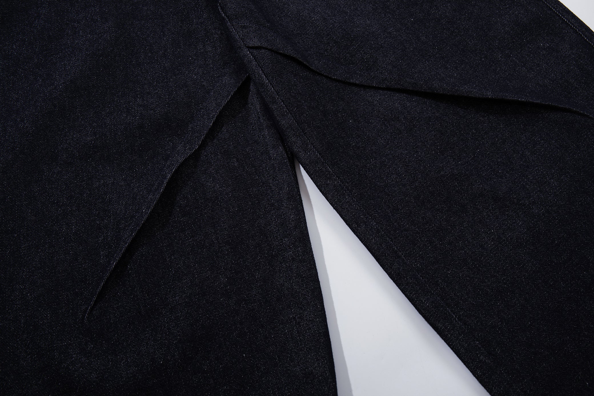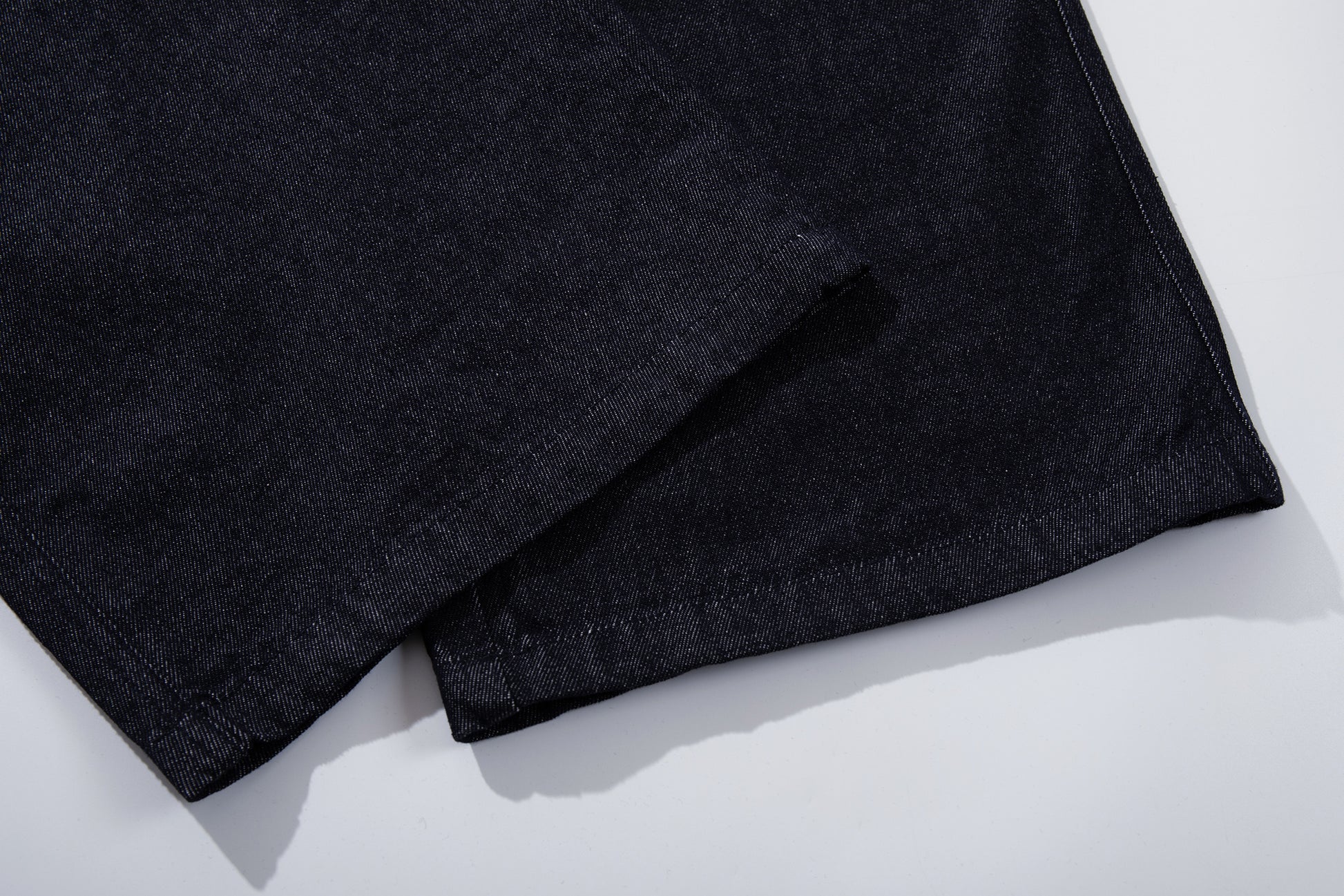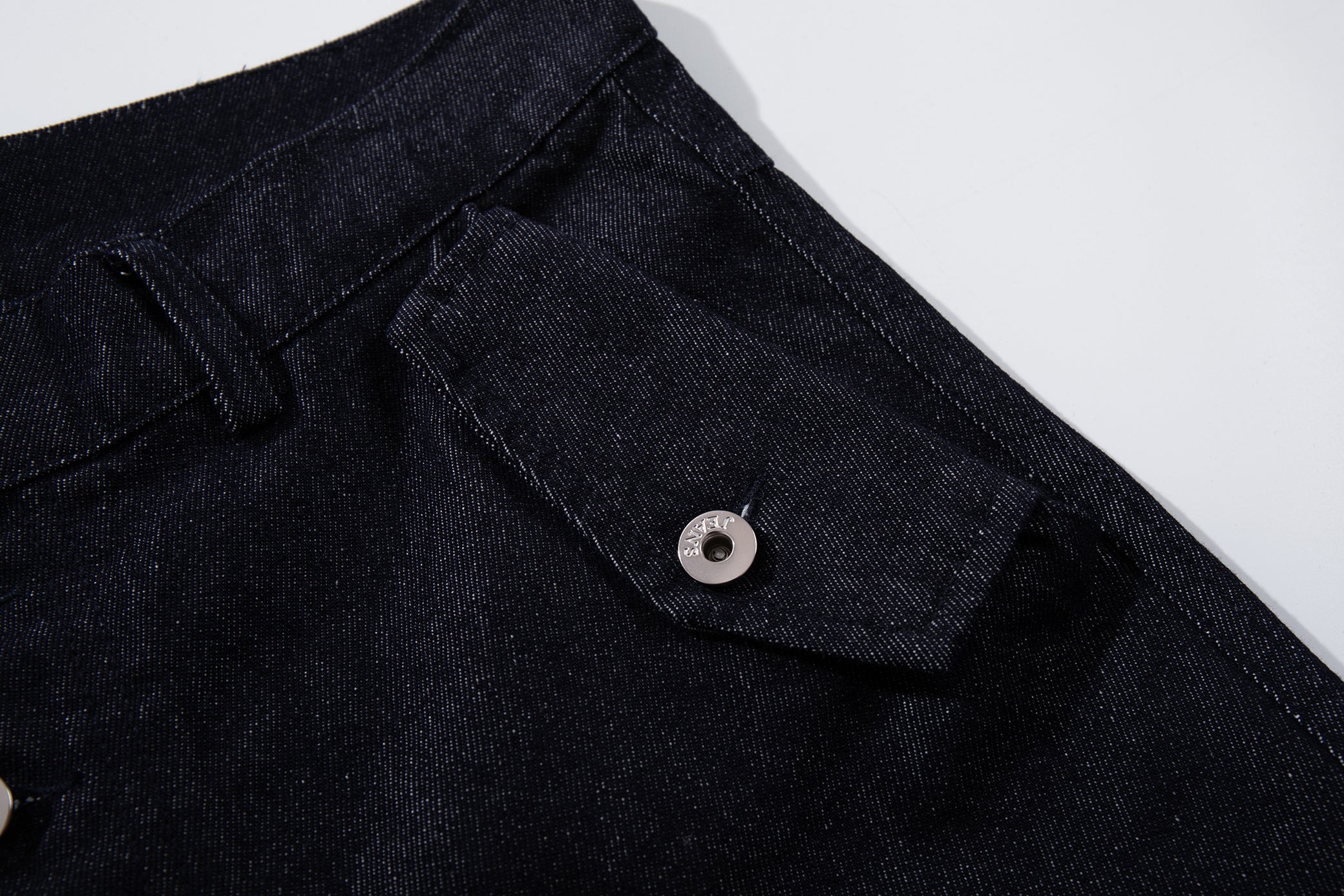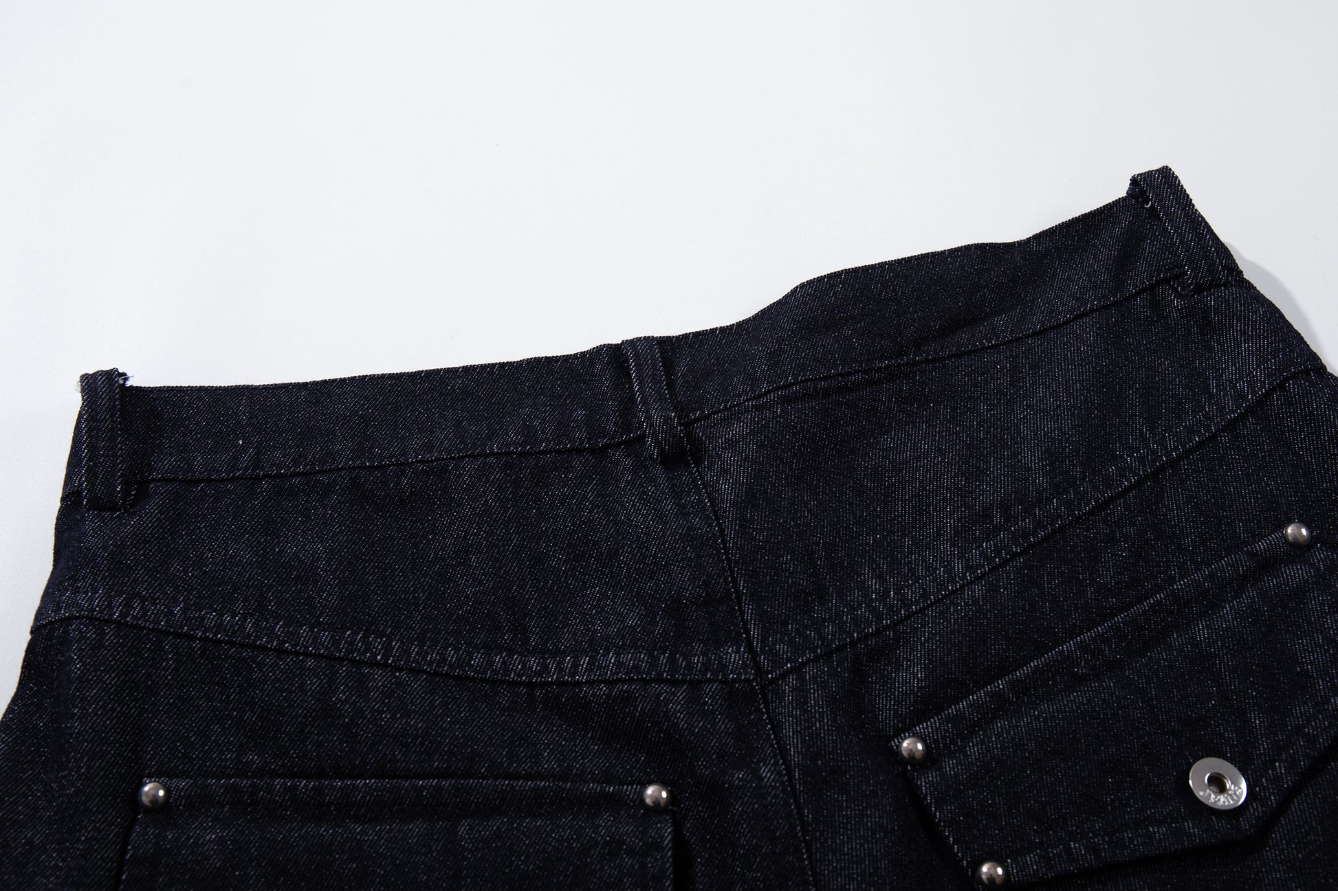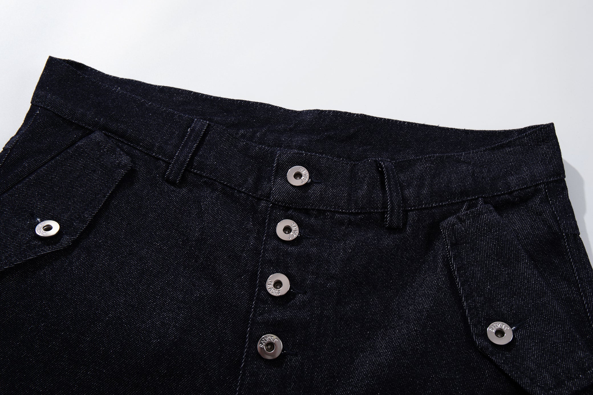 Clothing details: Wide-leg denim pants design, front panel construction detailing, high-rise waist, button fly front closure, functional pocket layout, relaxed fit, structured cotton denim fabric.