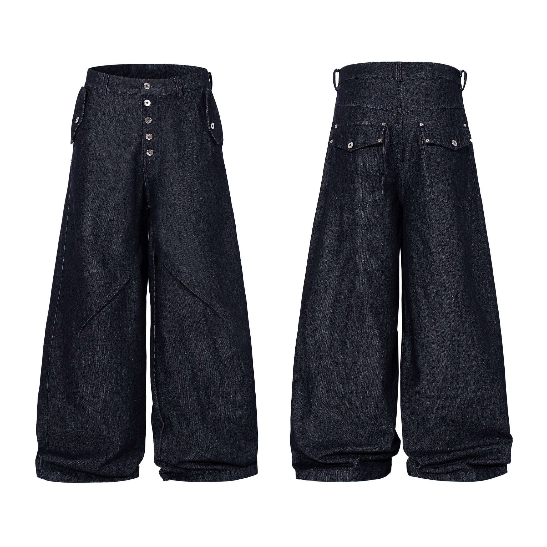 The Omirad Panel Construction Wide Leg Denim Pants feature a strong wide-leg silhouette with structured panel detailing across the front. Designed with a high-rise waist and button fly closure, these pants emphasize durability and form through clean construction lines. The reinforced seams and functional pocket layout maintain a balanced, utilitarian streetwear profile.