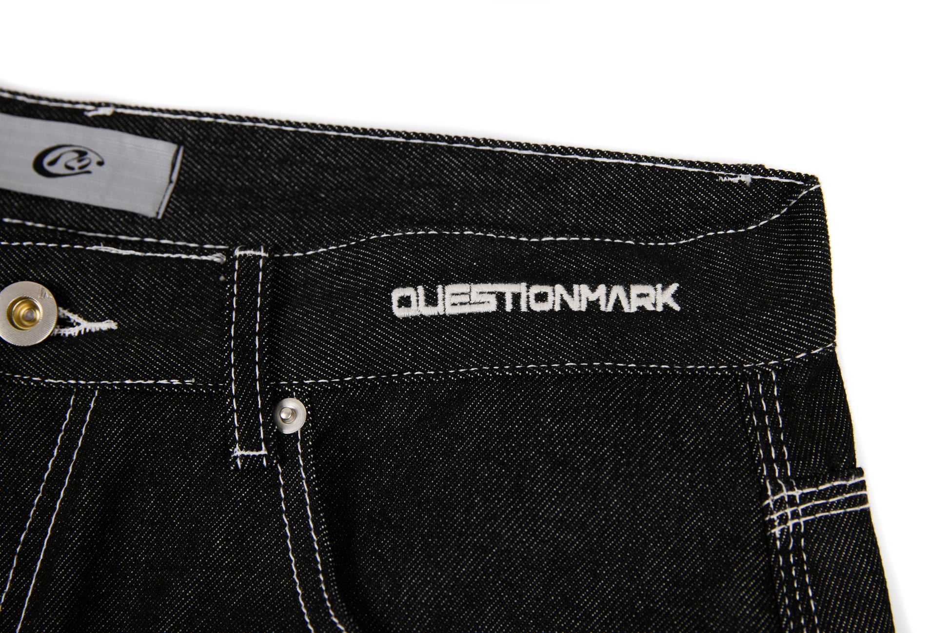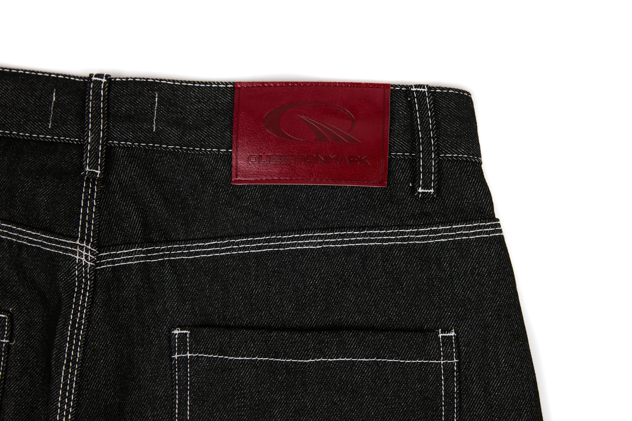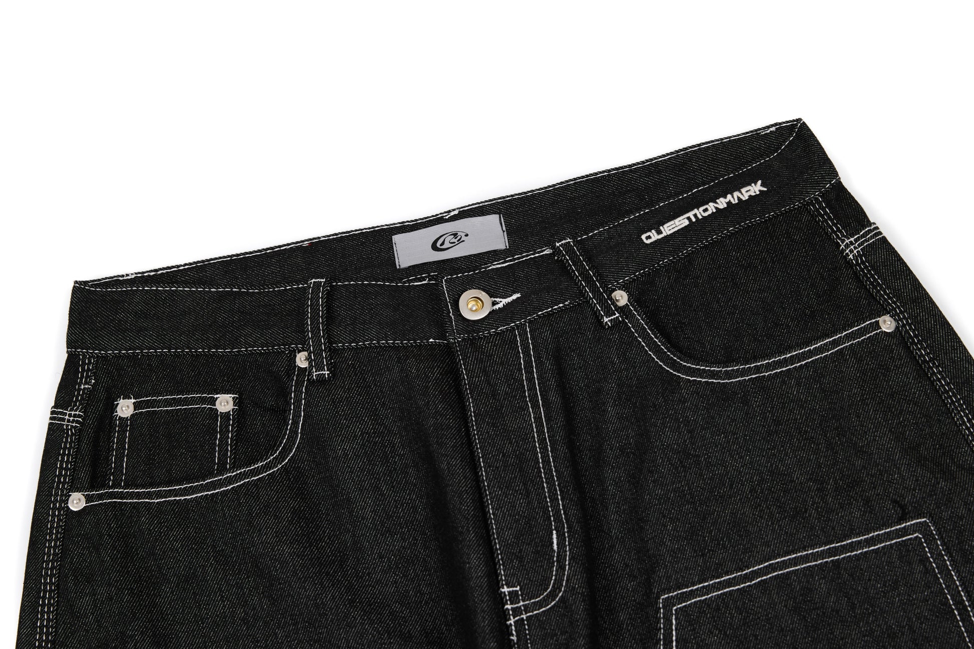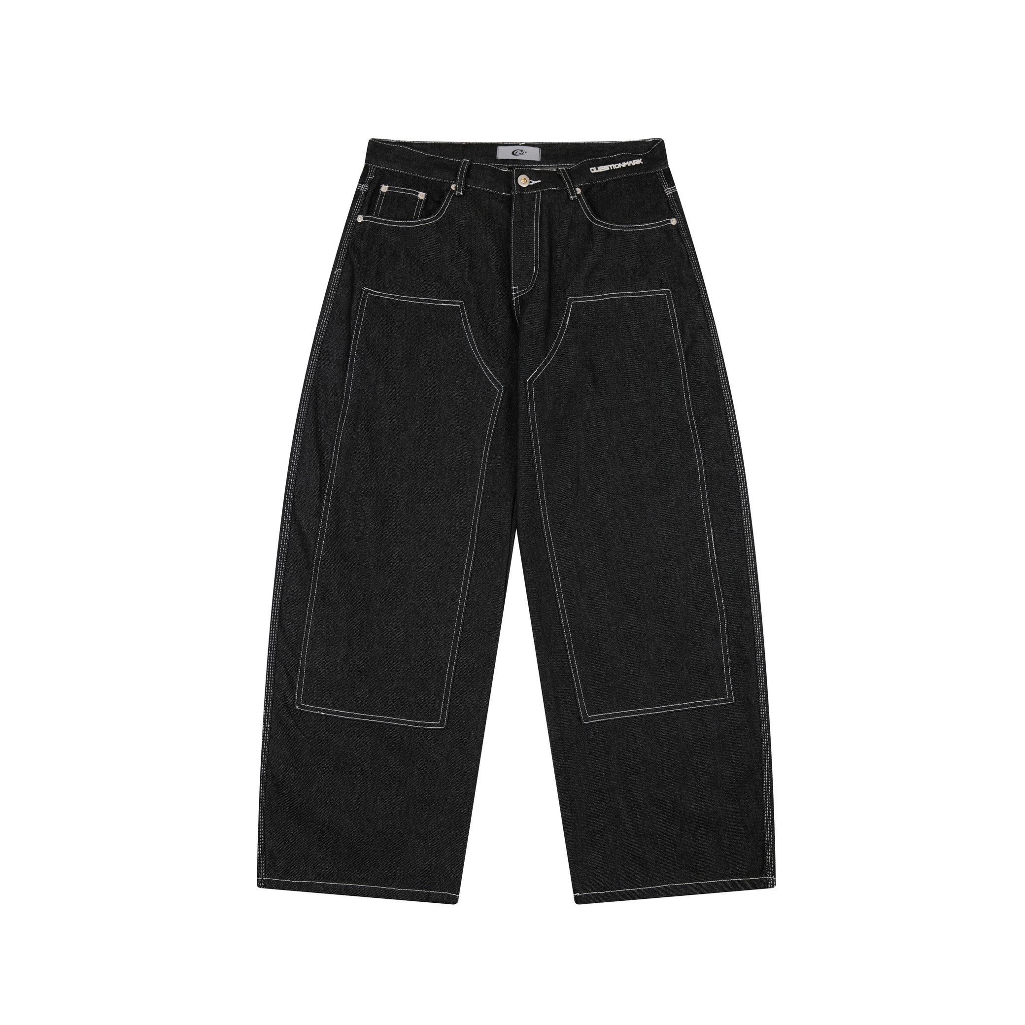 Clothing Details: Wide-leg fit, oversized stitched front panels, contrast stitching, classic 5-pocket design, metal hardware