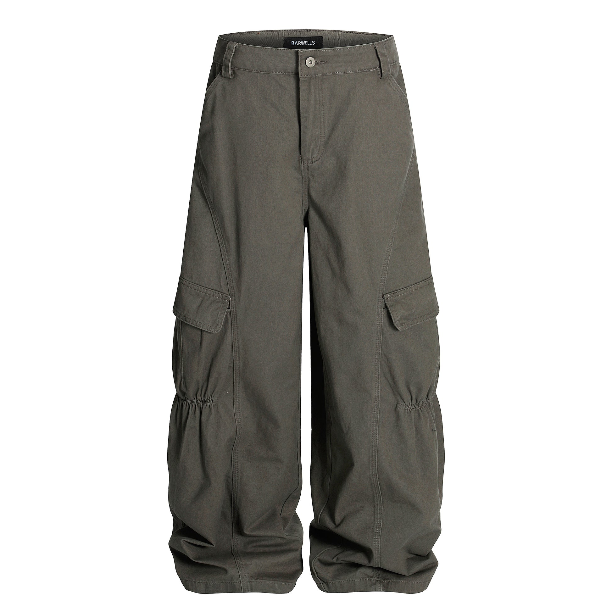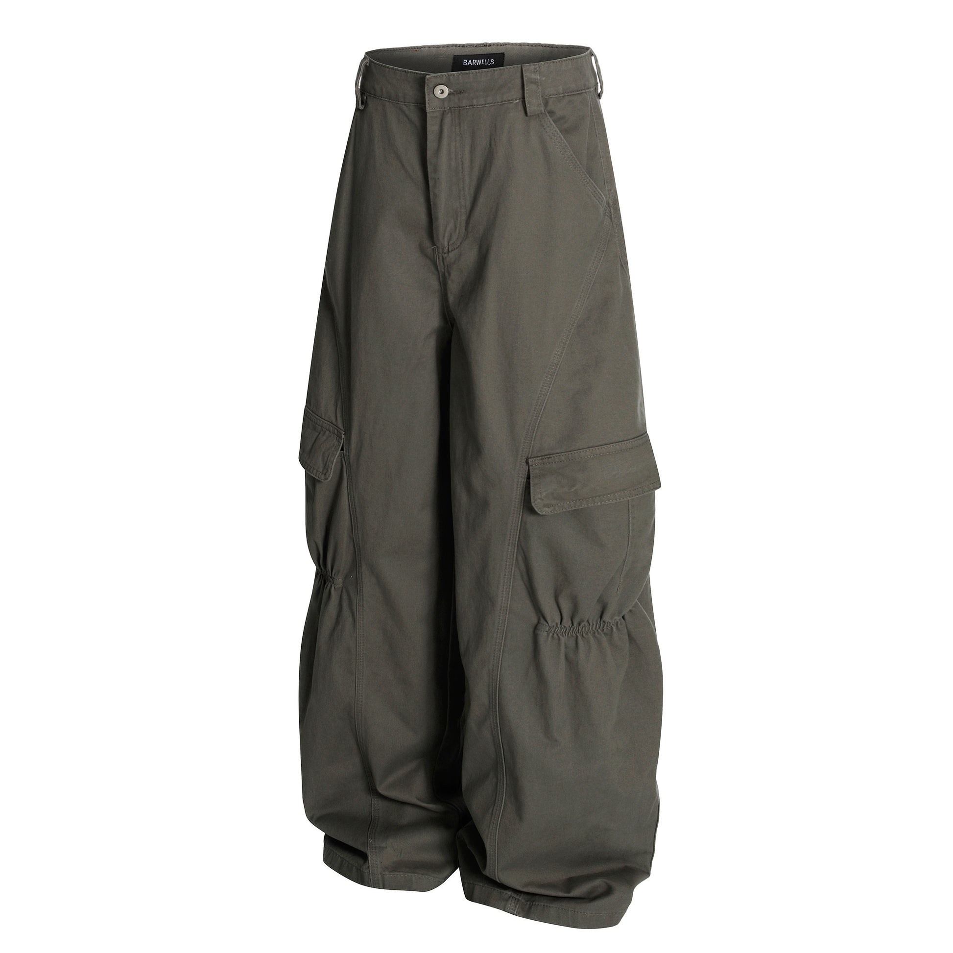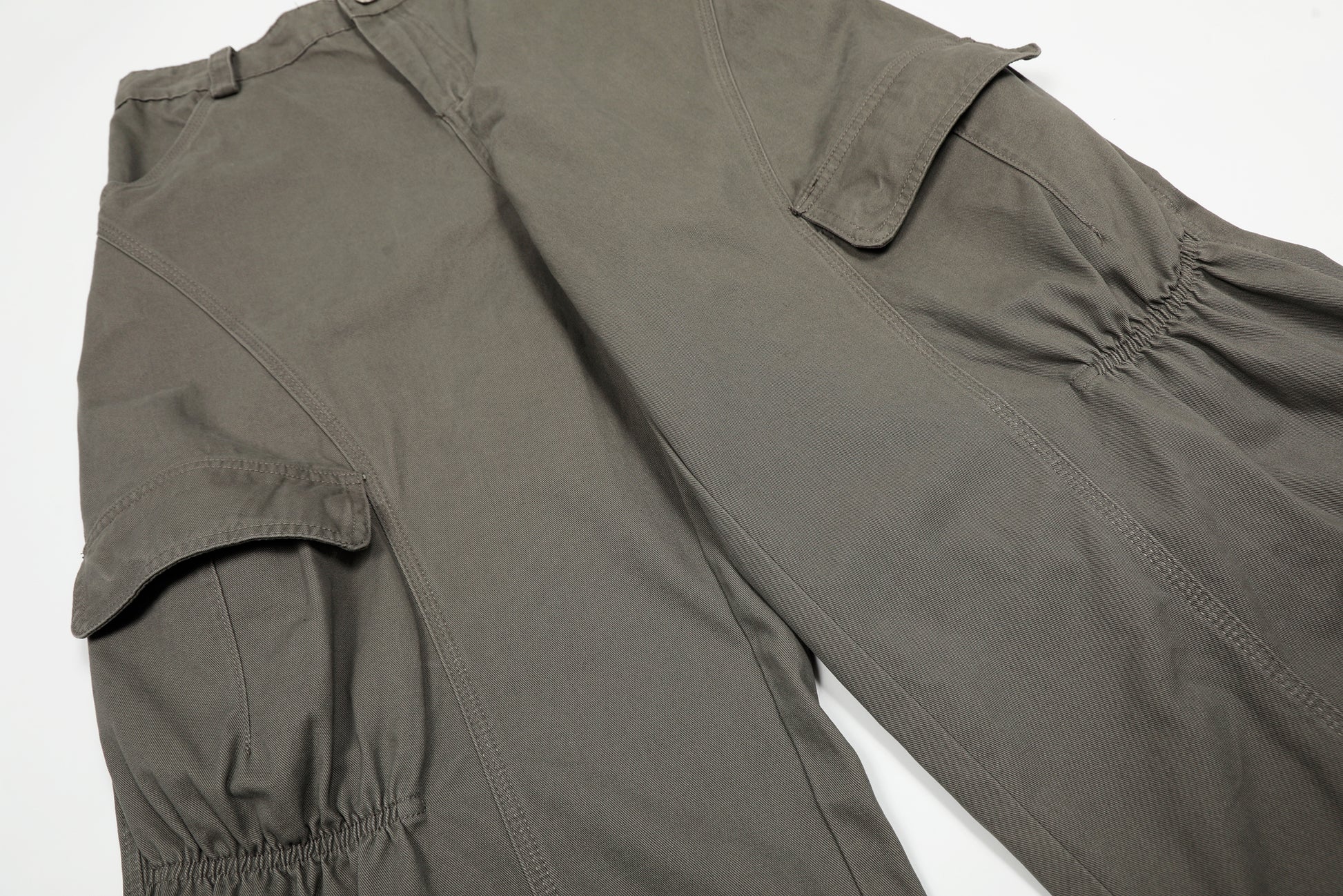 Clothing details: Curved wide-leg fit, gathered knee detail, stacked hem, side cargo pockets, button waist closure.