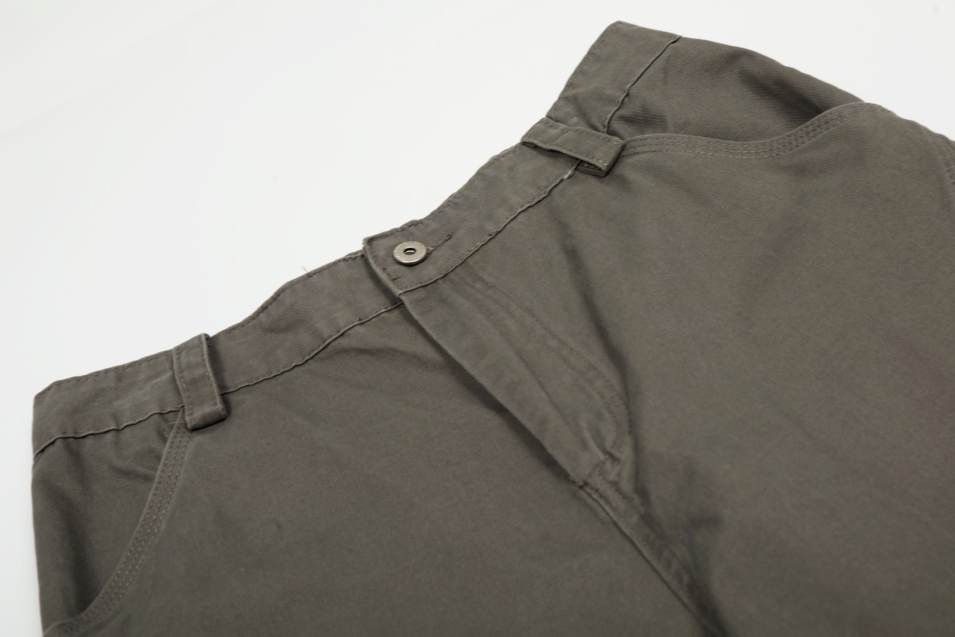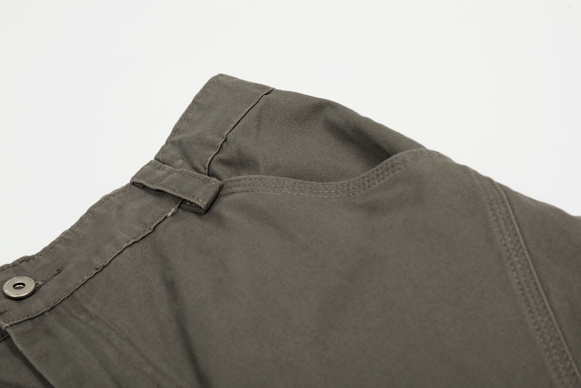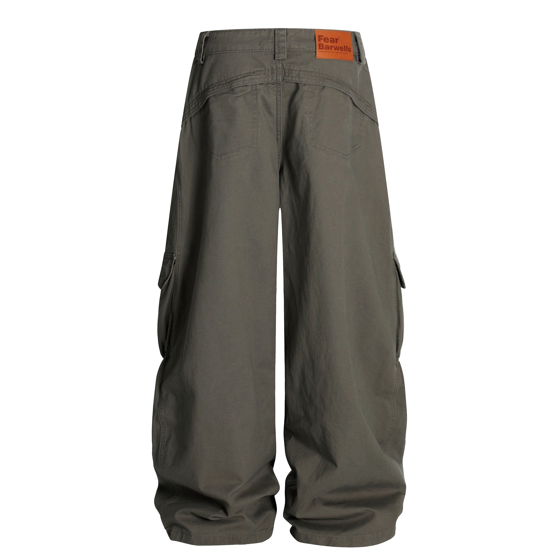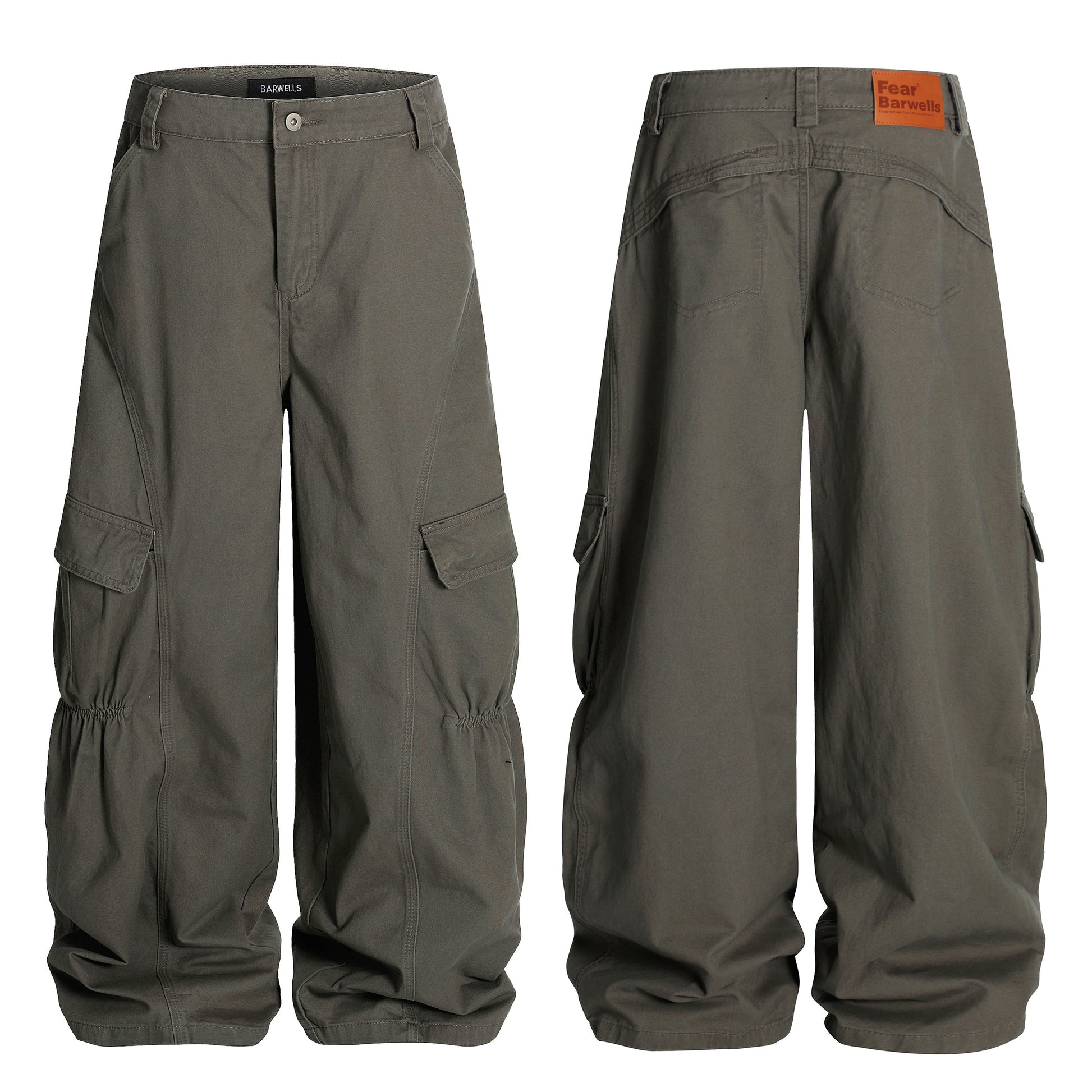 Clothing details: Curved wide-leg fit, gathered knee detail, stacked hem, side cargo pockets, button waist closure.