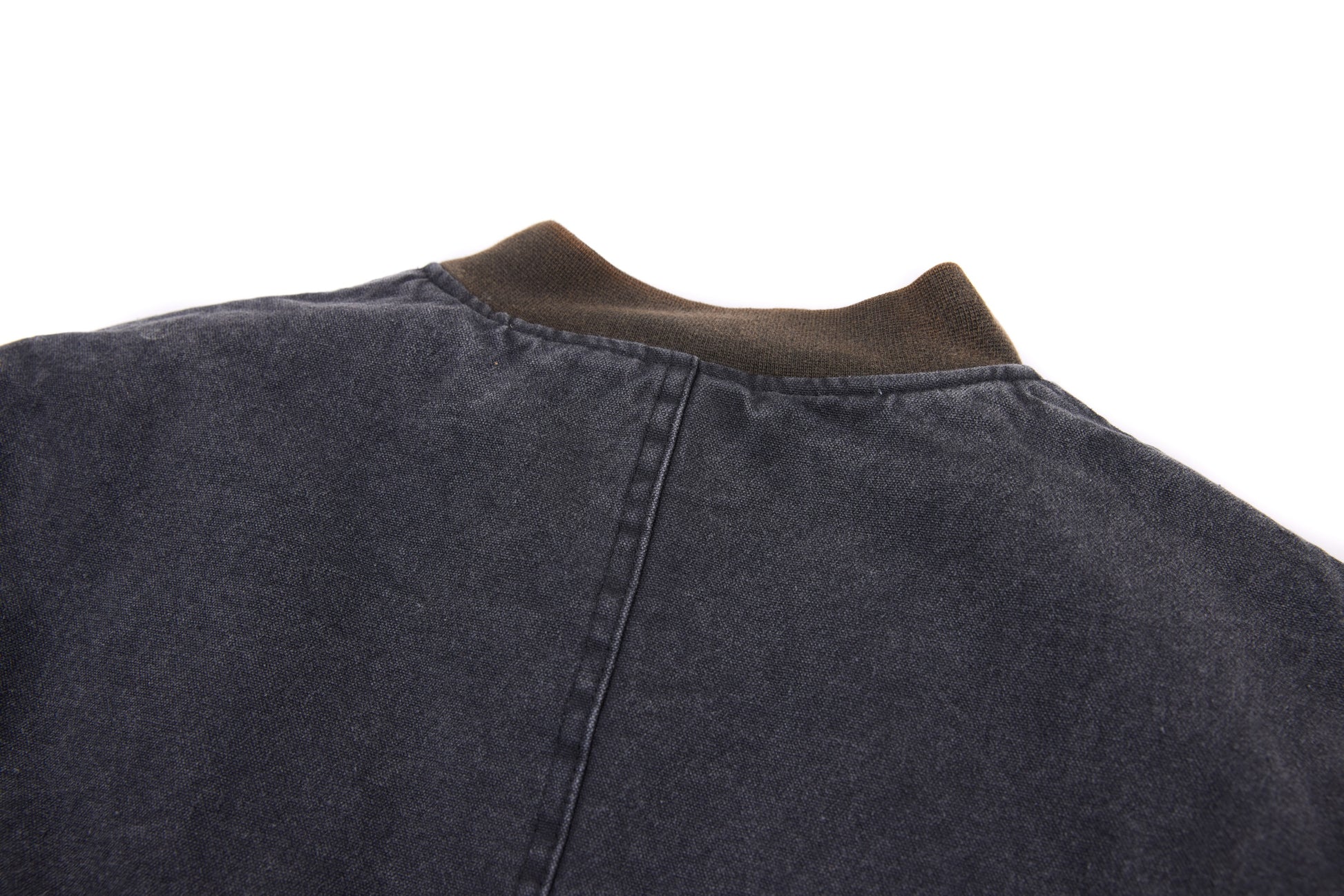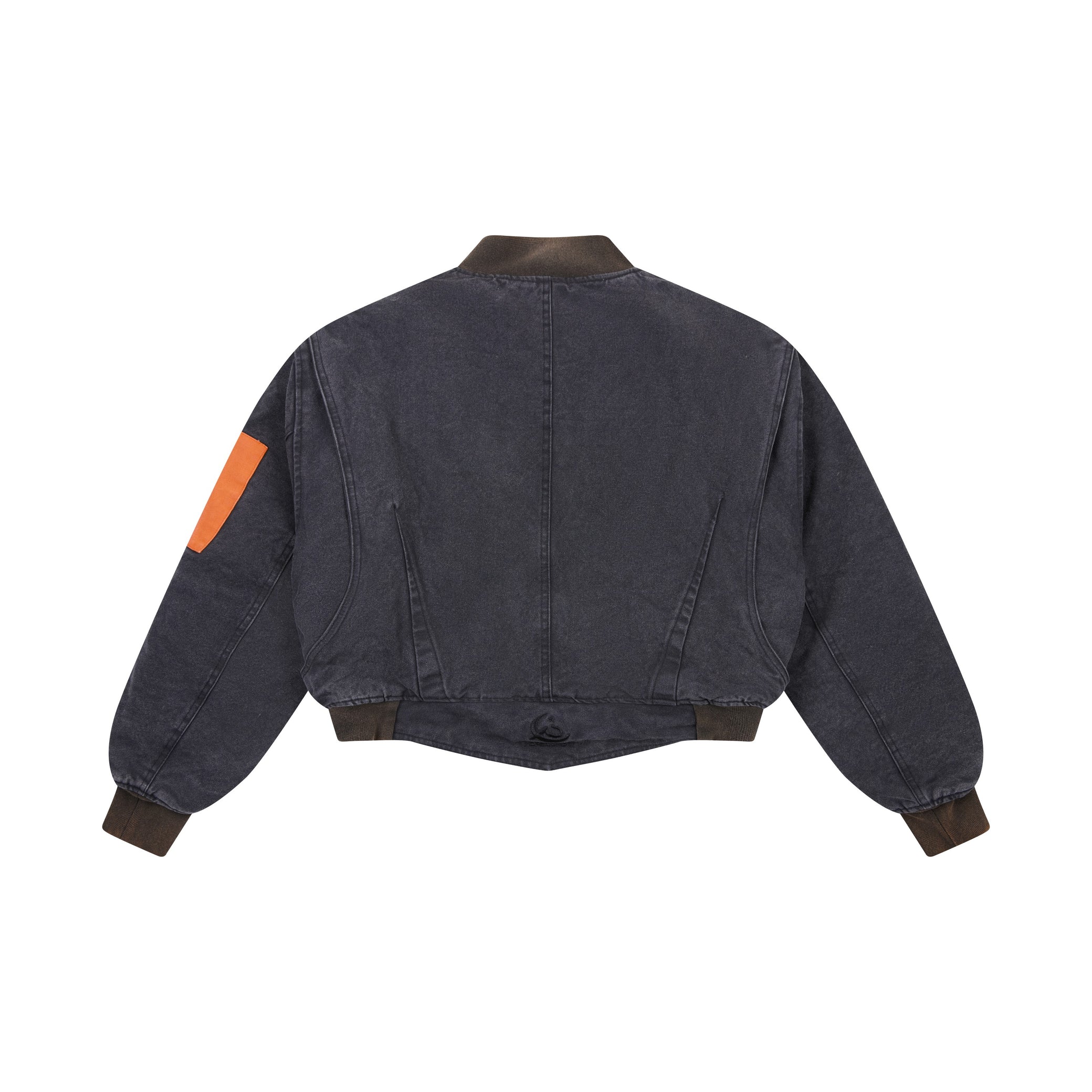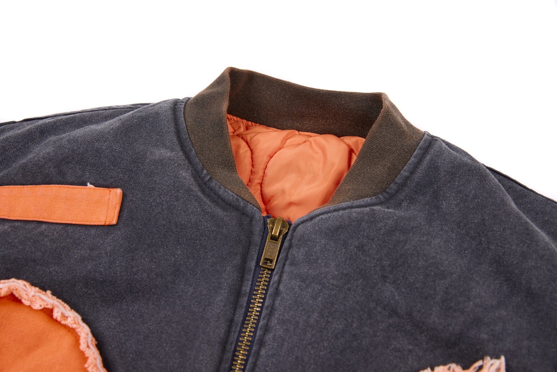 Clothing Details: Raw-edge patchwork, contrast color panels, cropped bomber fit, ribbed cuffs/hem, metal zip closure