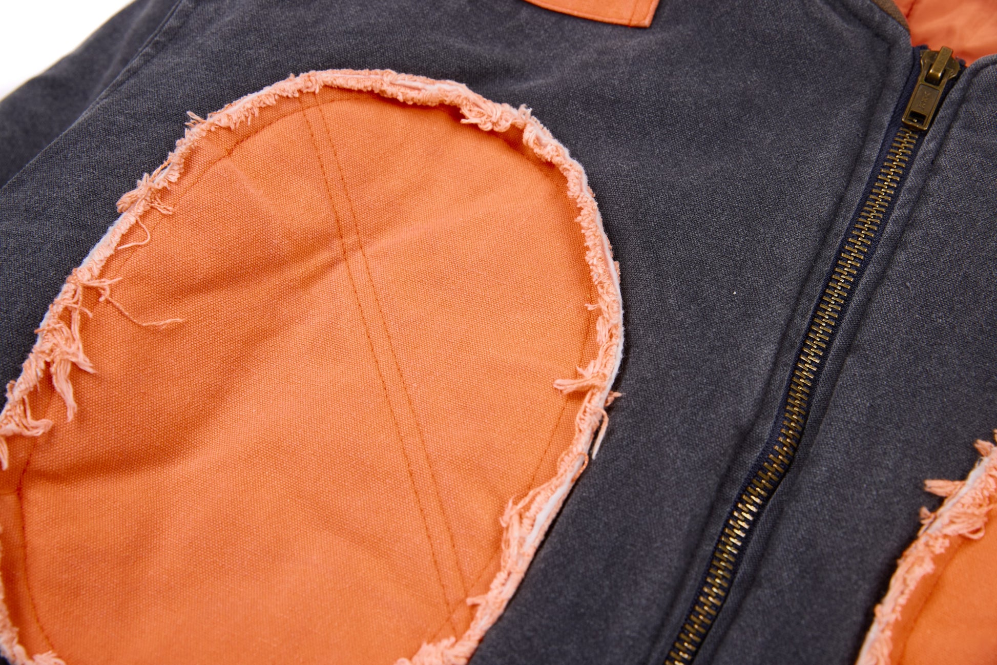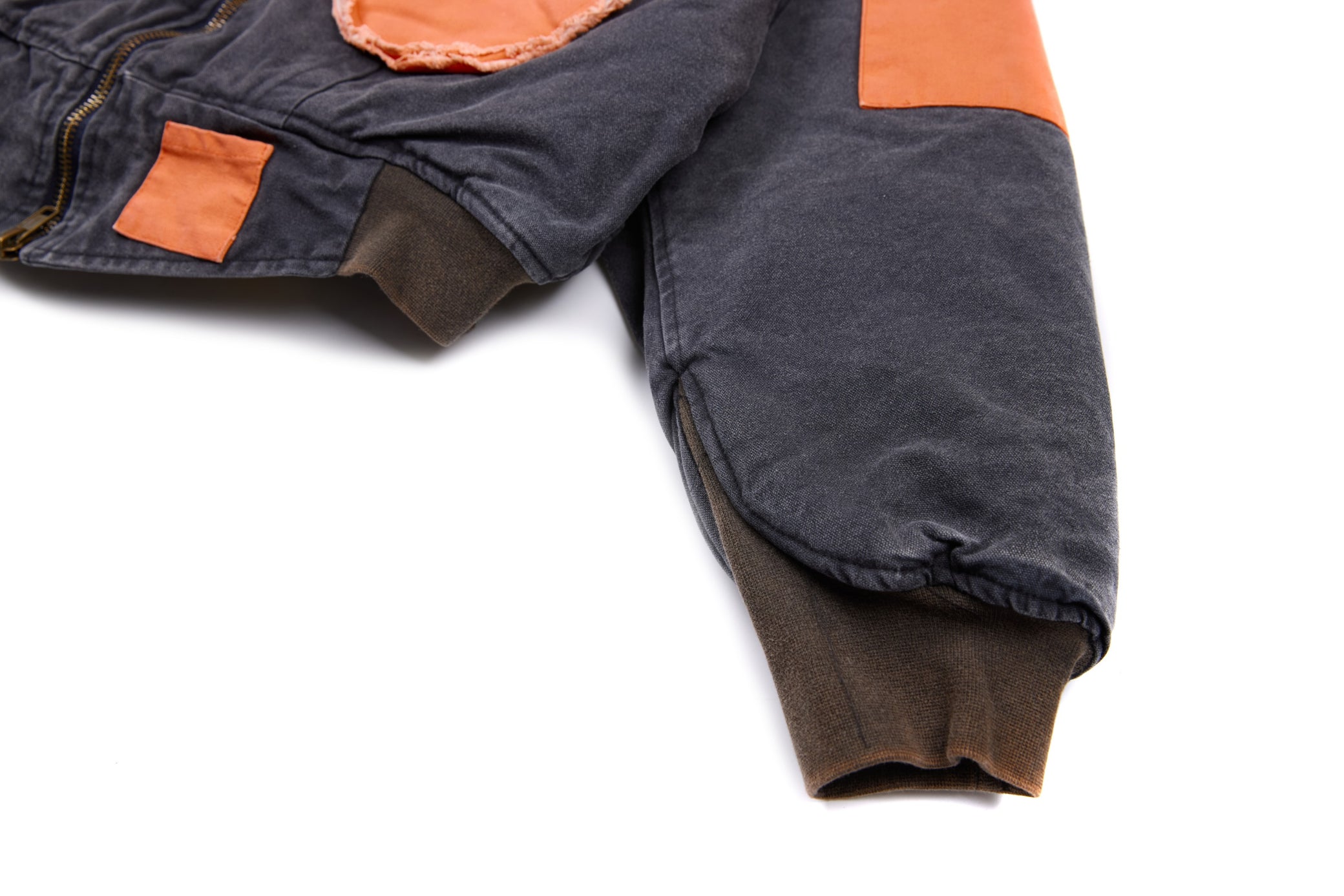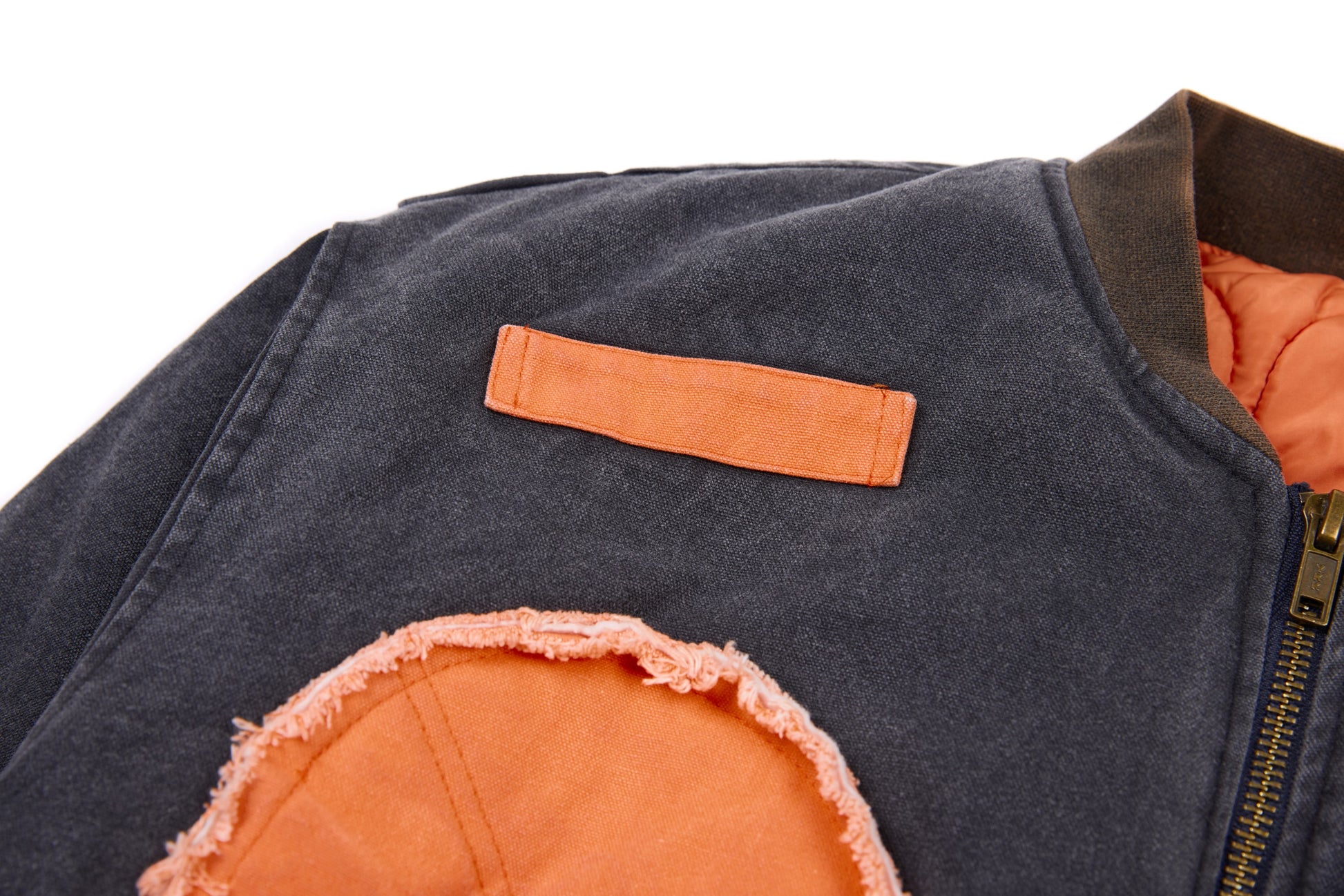 The Omirad Patchwork Cotton Bomber Jacket stands out with its unique deconstructed design and bold contrast detailing. Crafted from 100% cotton, this jacket features oversized raw-edge patchwork on the front, paired with additional orange accent panels for a striking visual contrast. The cropped bomber silhouette adds a modern streetwear touch, while ribbed cuffs and hem ensure a comfortable, secure fit.