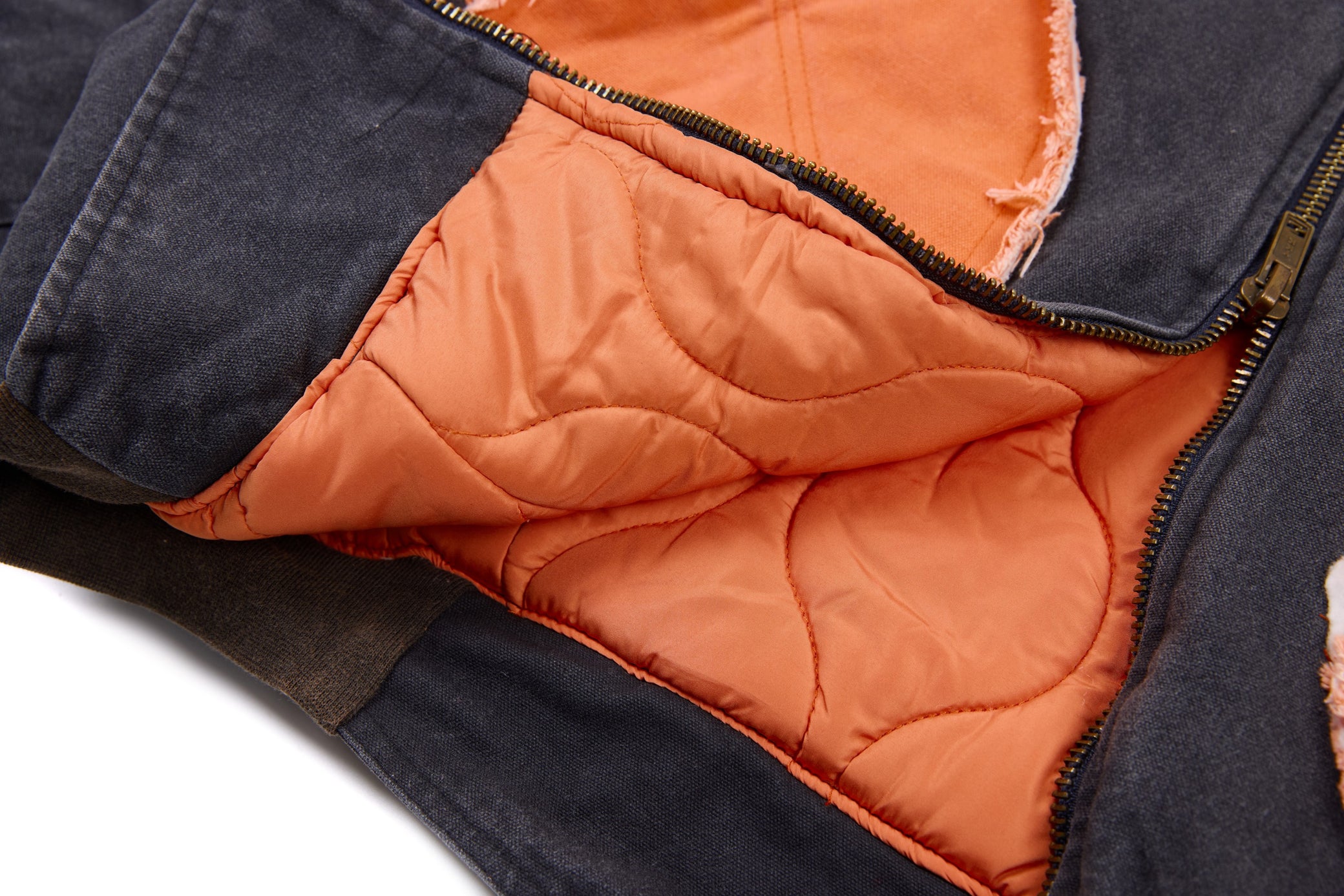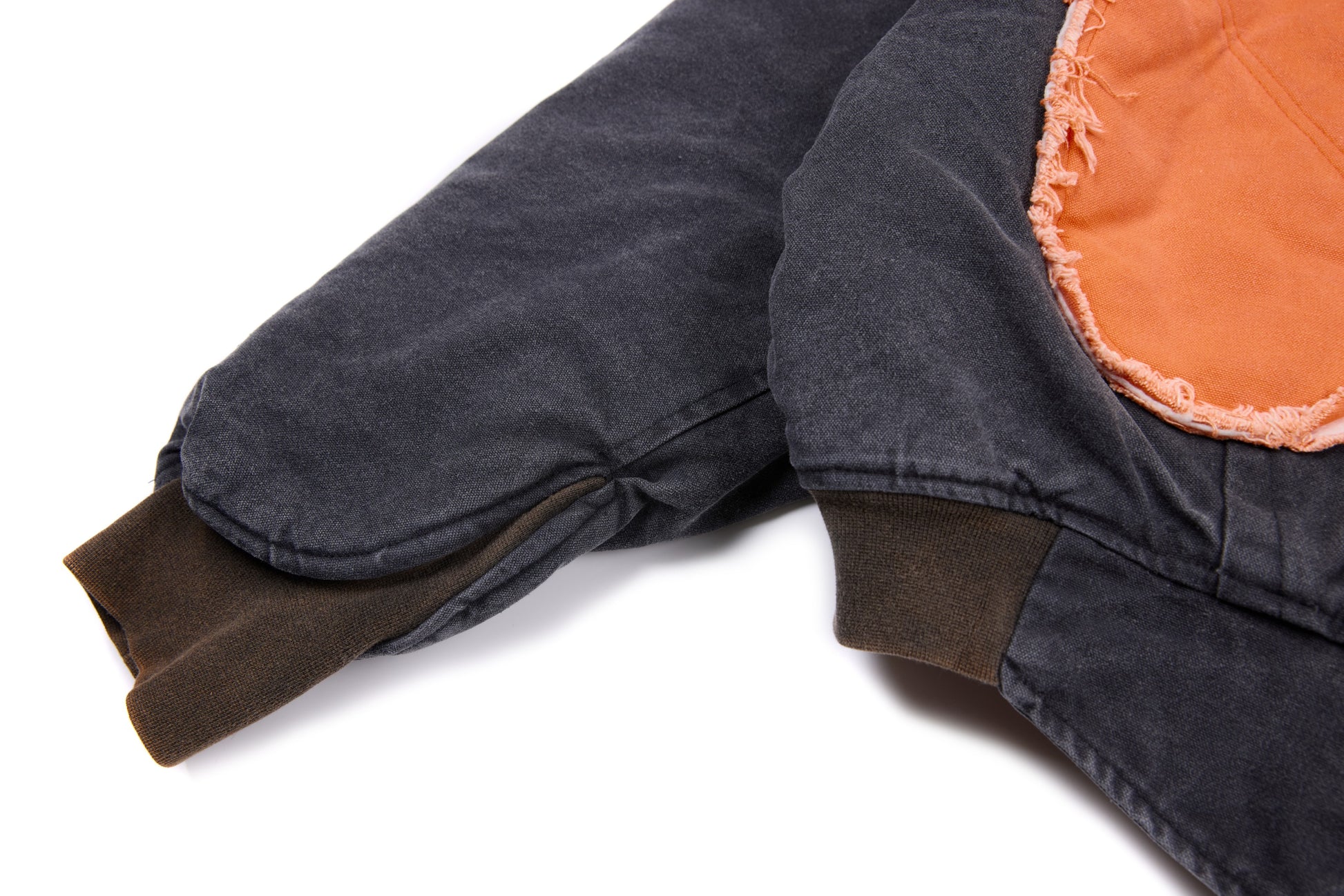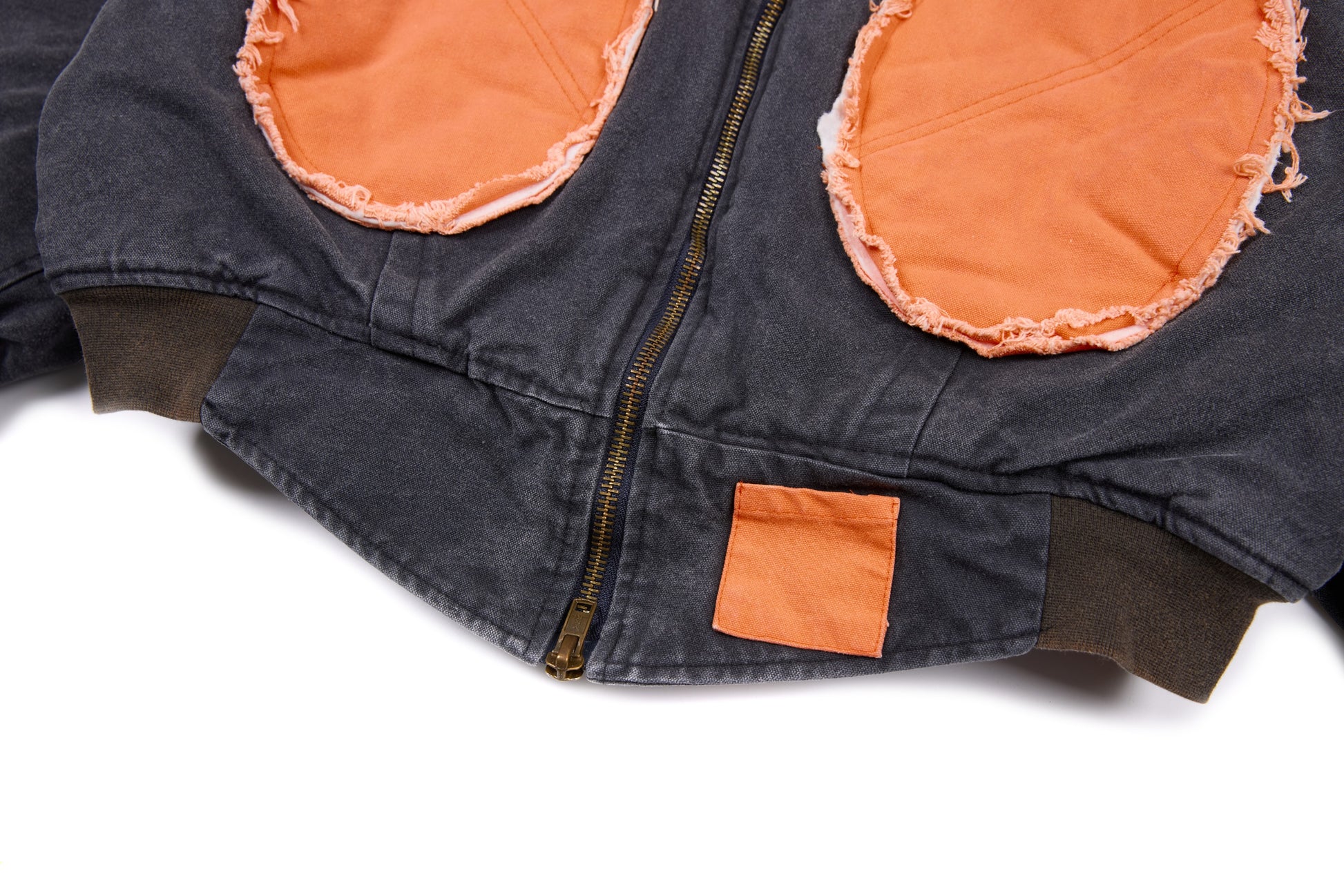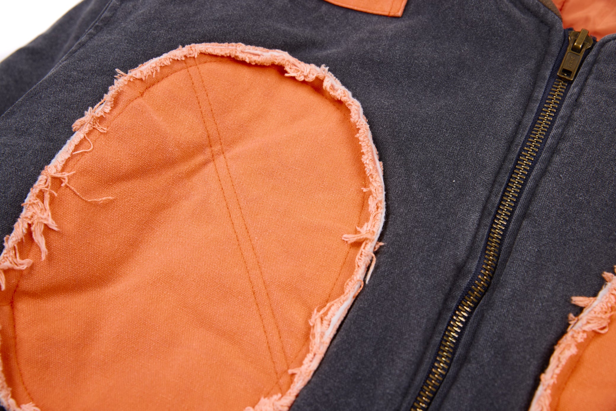 The Omirad Patchwork Cotton Bomber Jacket stands out with its unique deconstructed design and bold contrast detailing. Crafted from 100% cotton, this jacket features oversized raw-edge patchwork on the front, paired with additional orange accent panels for a striking visual contrast. The cropped bomber silhouette adds a modern streetwear touch, while ribbed cuffs and hem ensure a comfortable, secure fit.
