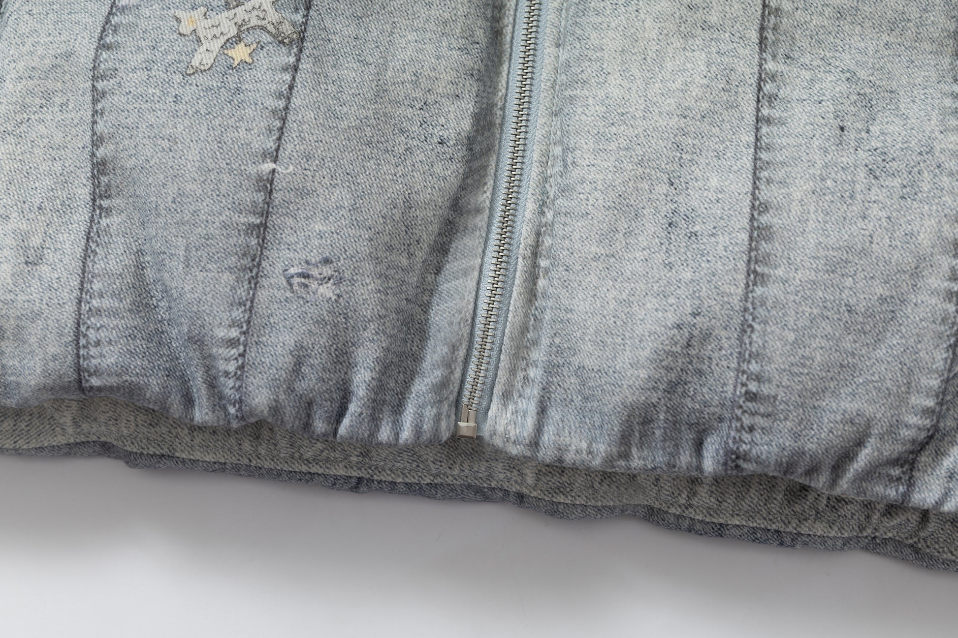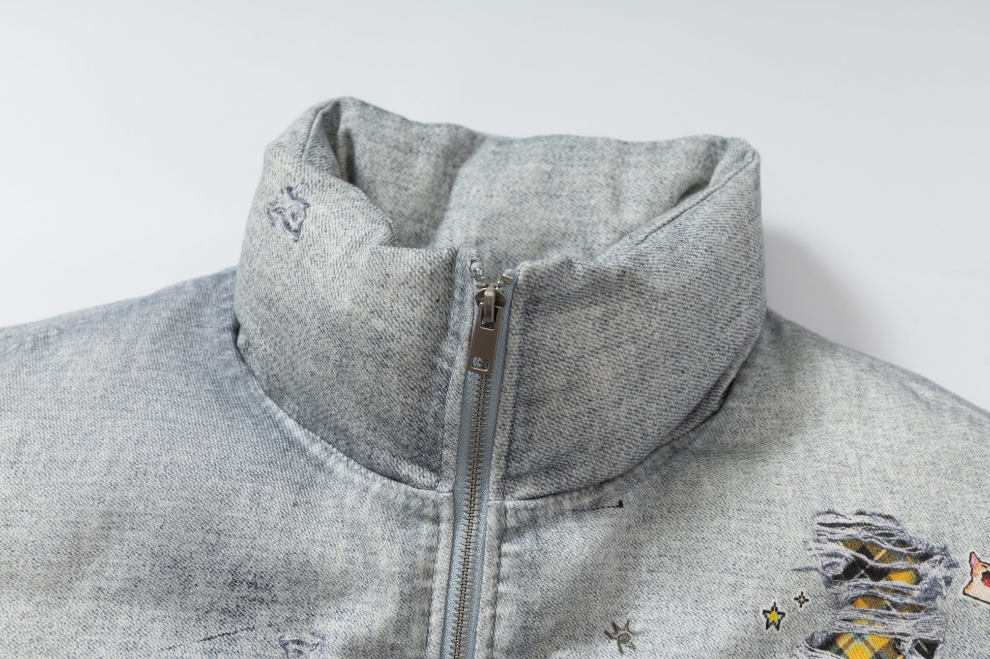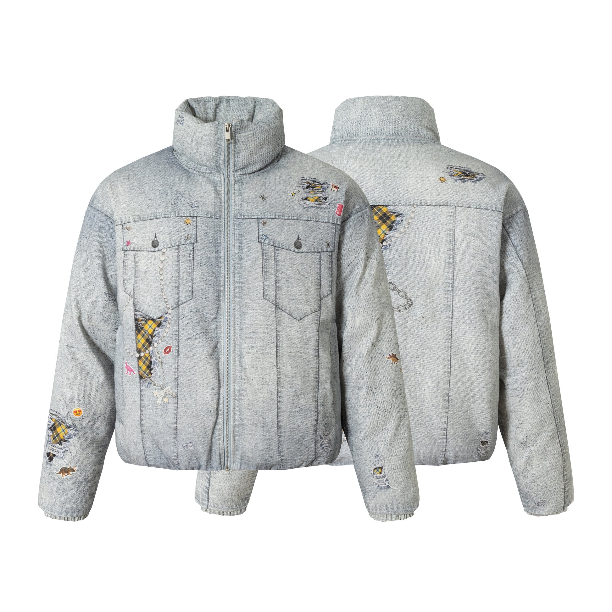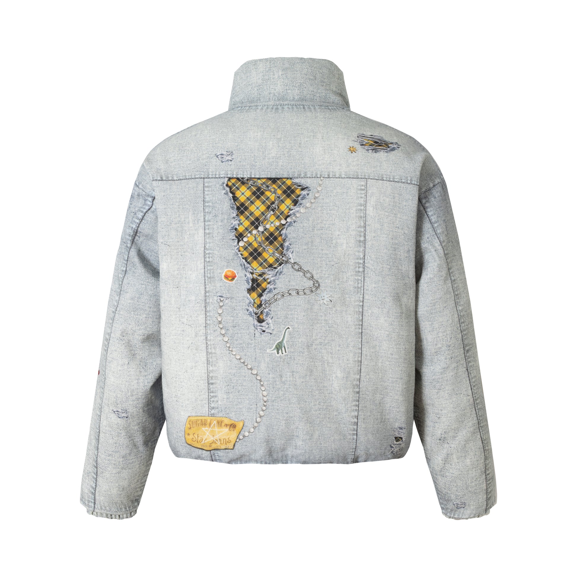 Clothing details: Distressed denim finish, plaid patchwork, embroidery details, zip-up front, padded interior for warmth.