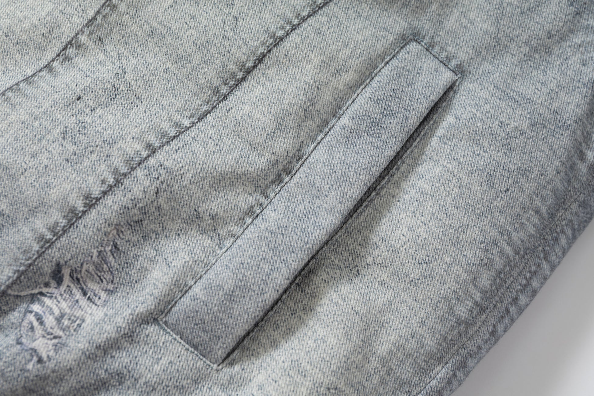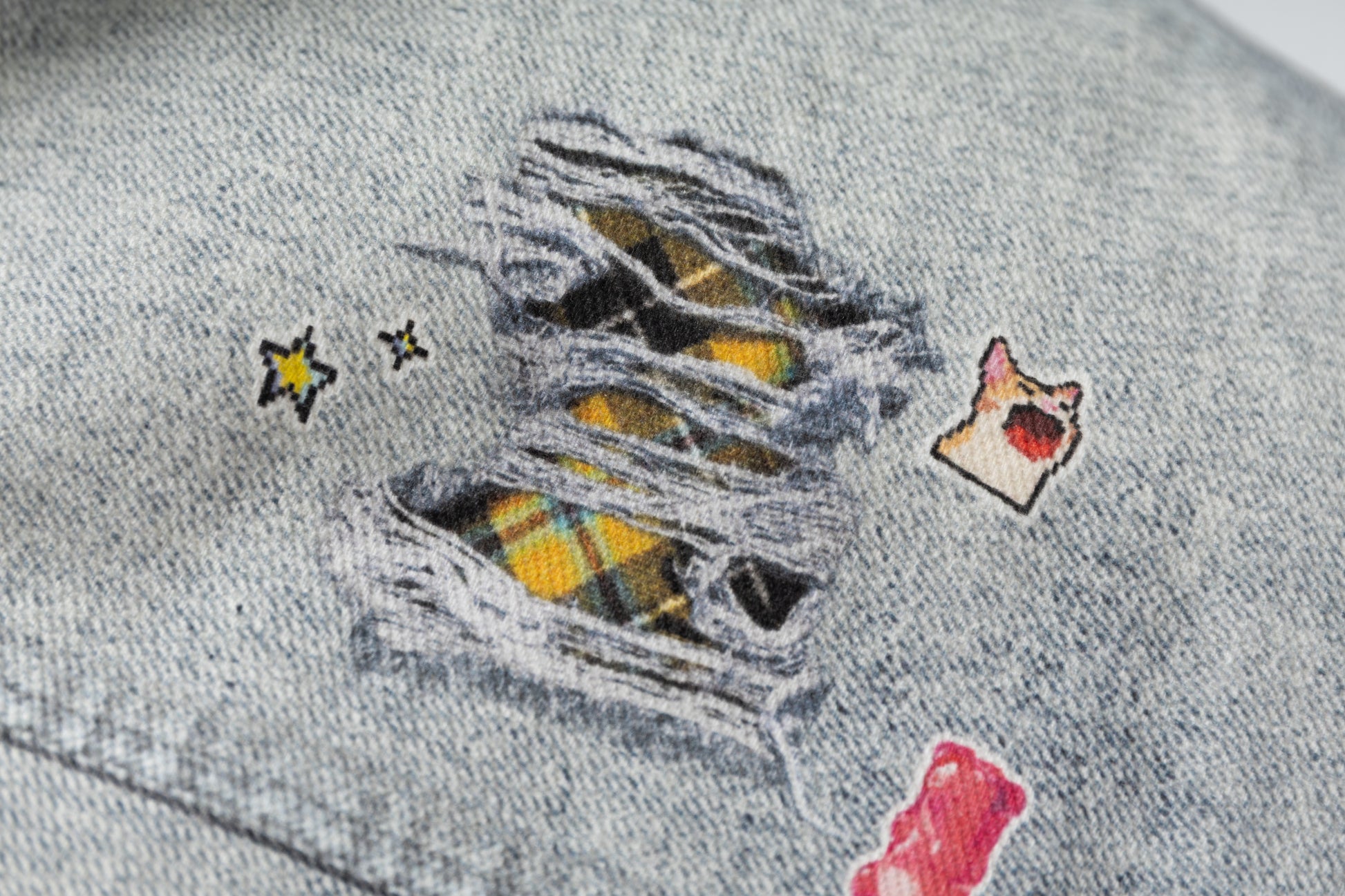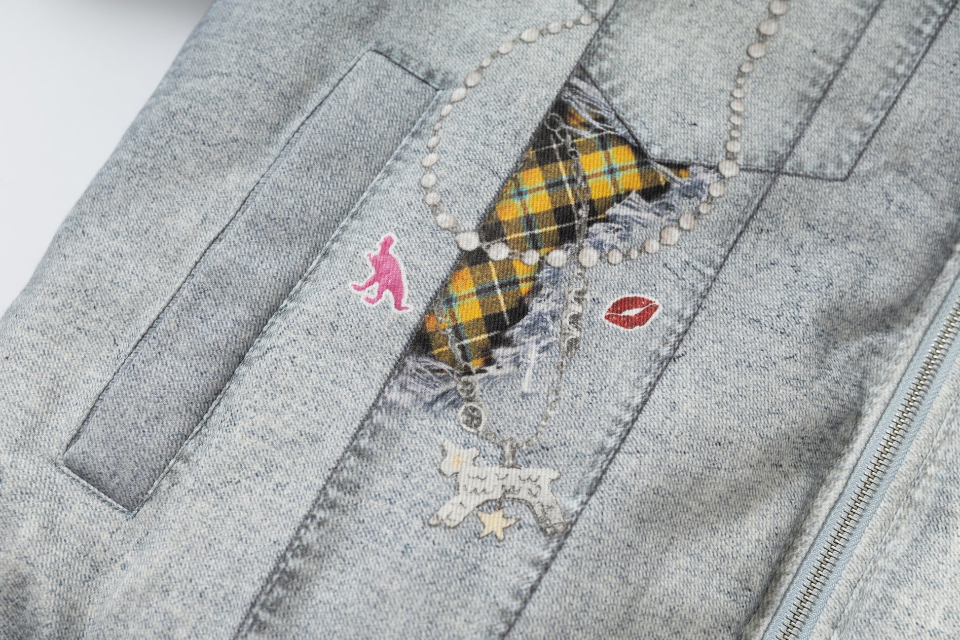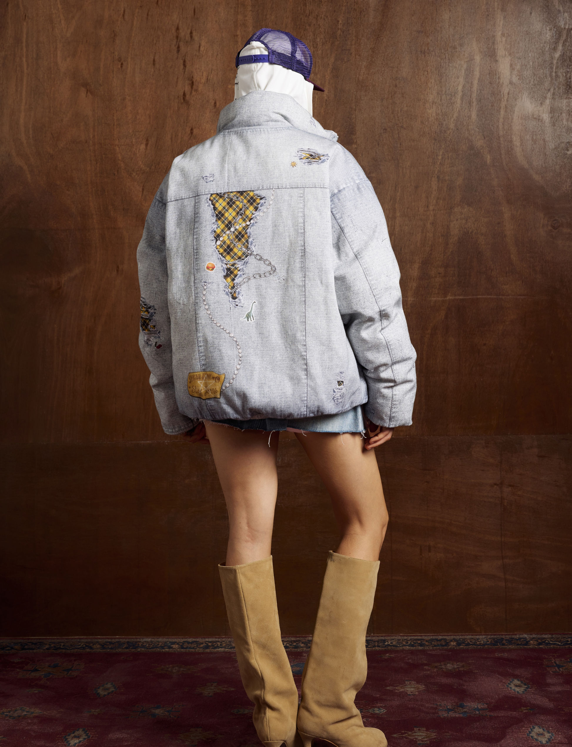 Clothing details: Distressed denim finish, plaid patchwork, embroidery details, zip-up front, padded interior for warmth.