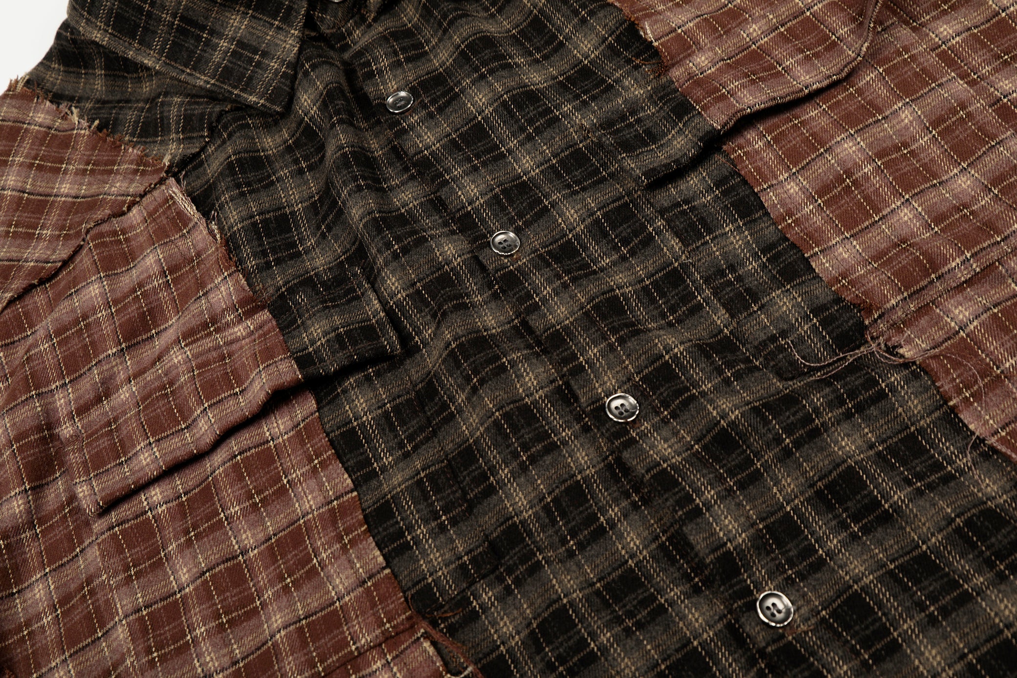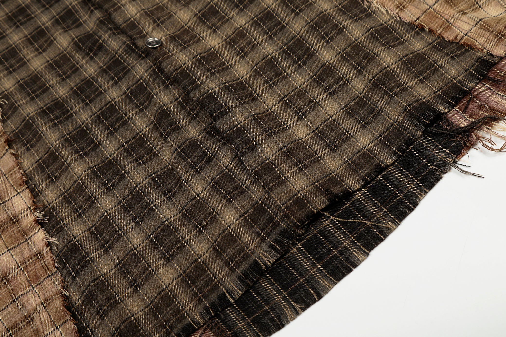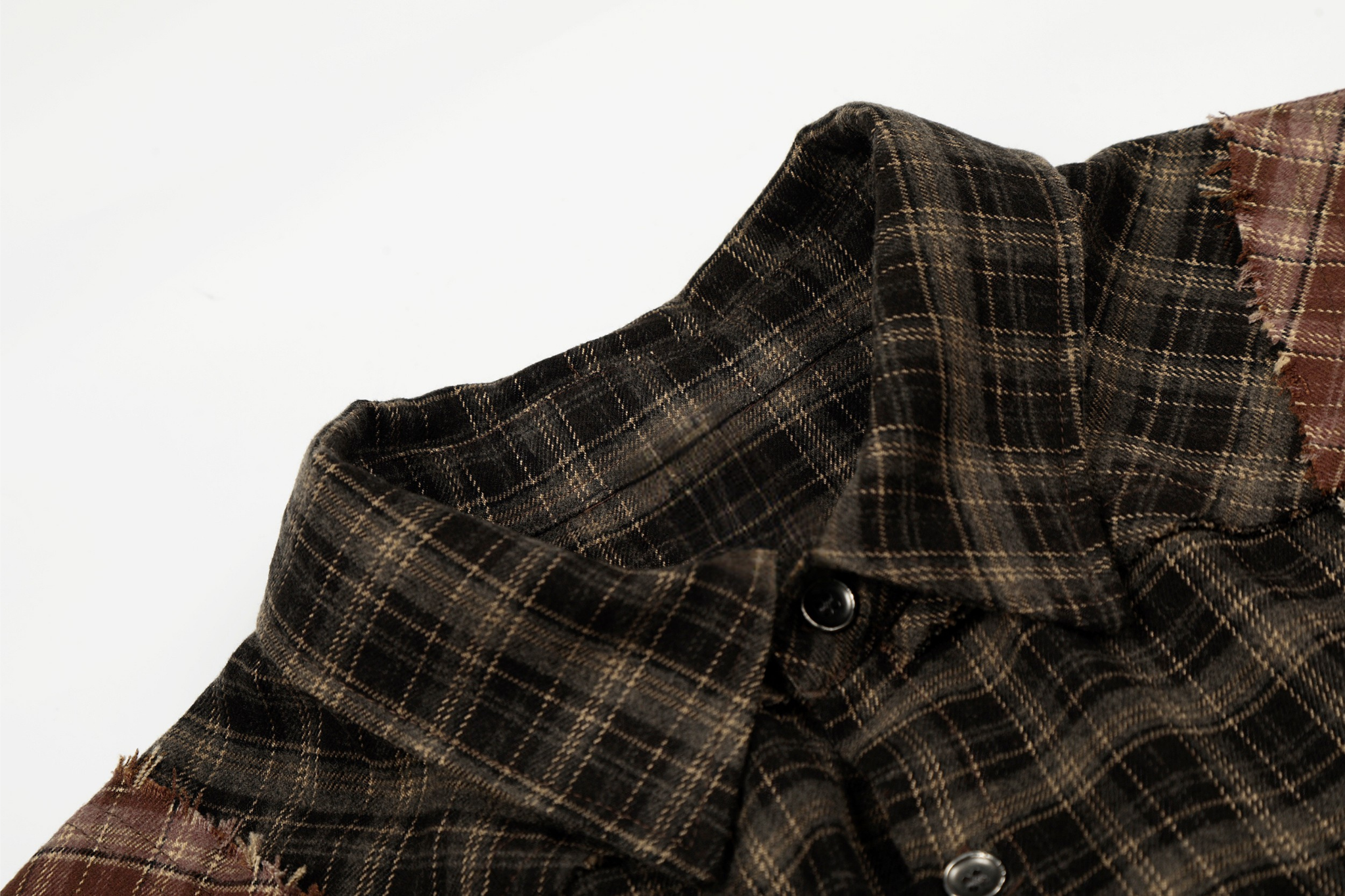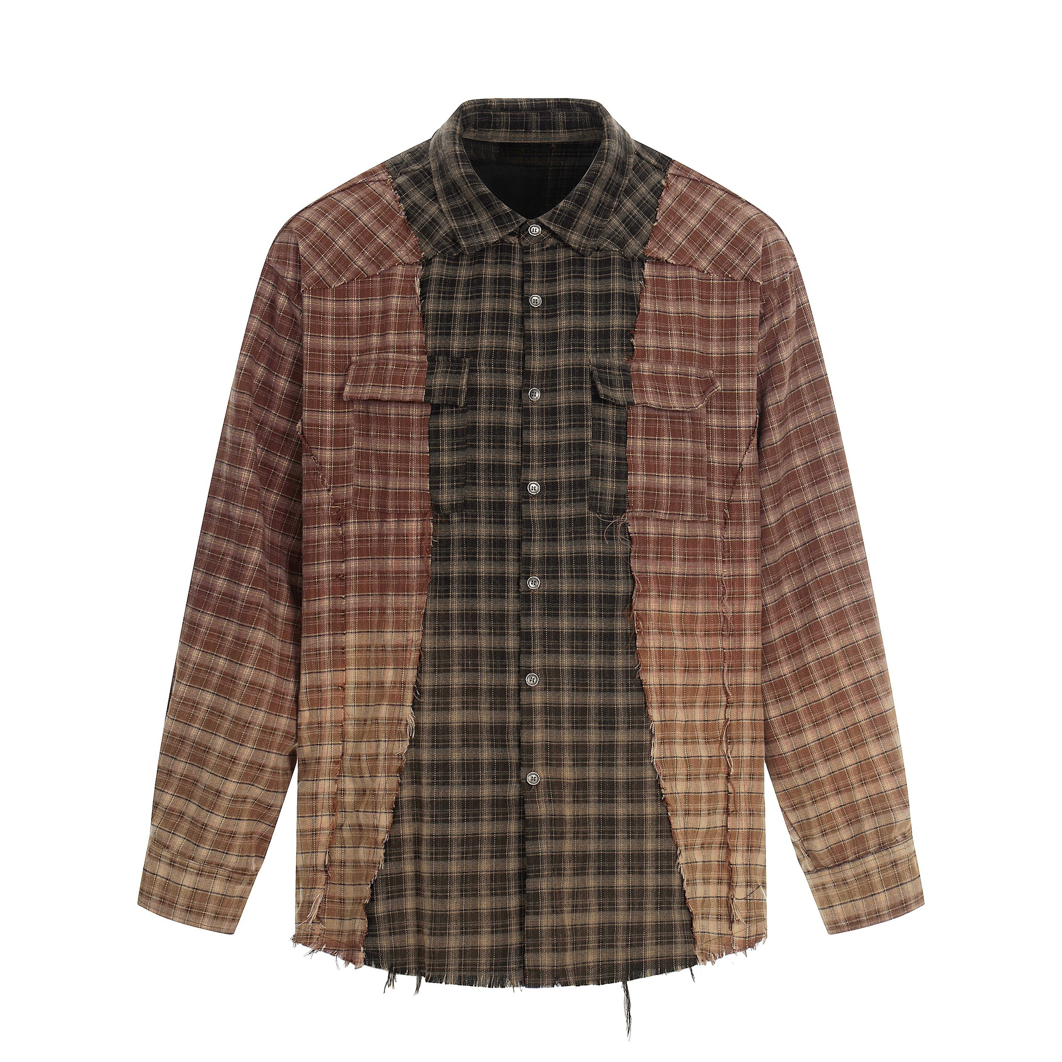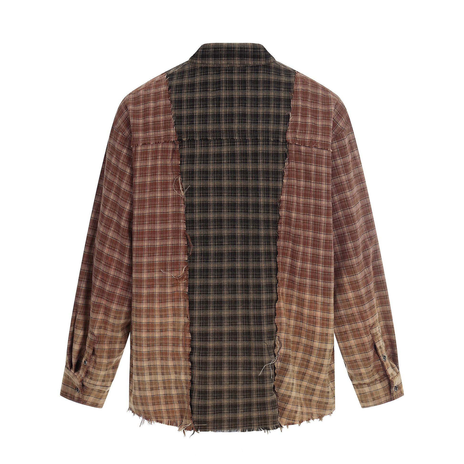 Clothing details: Patchwork plaid panel construction, contrast check patterns, distressed raw-edge detailing, classic pointed collar, full button-up closure, long sleeves with buttoned cuffs, relaxed fit, frayed hem finish.