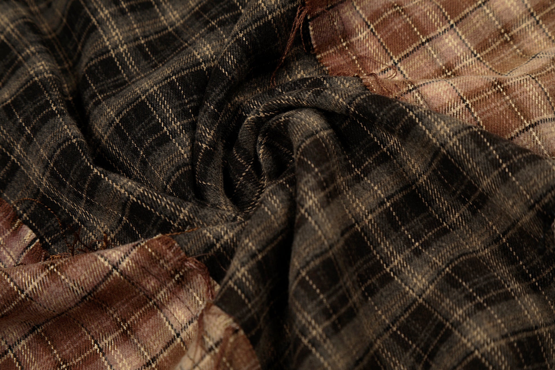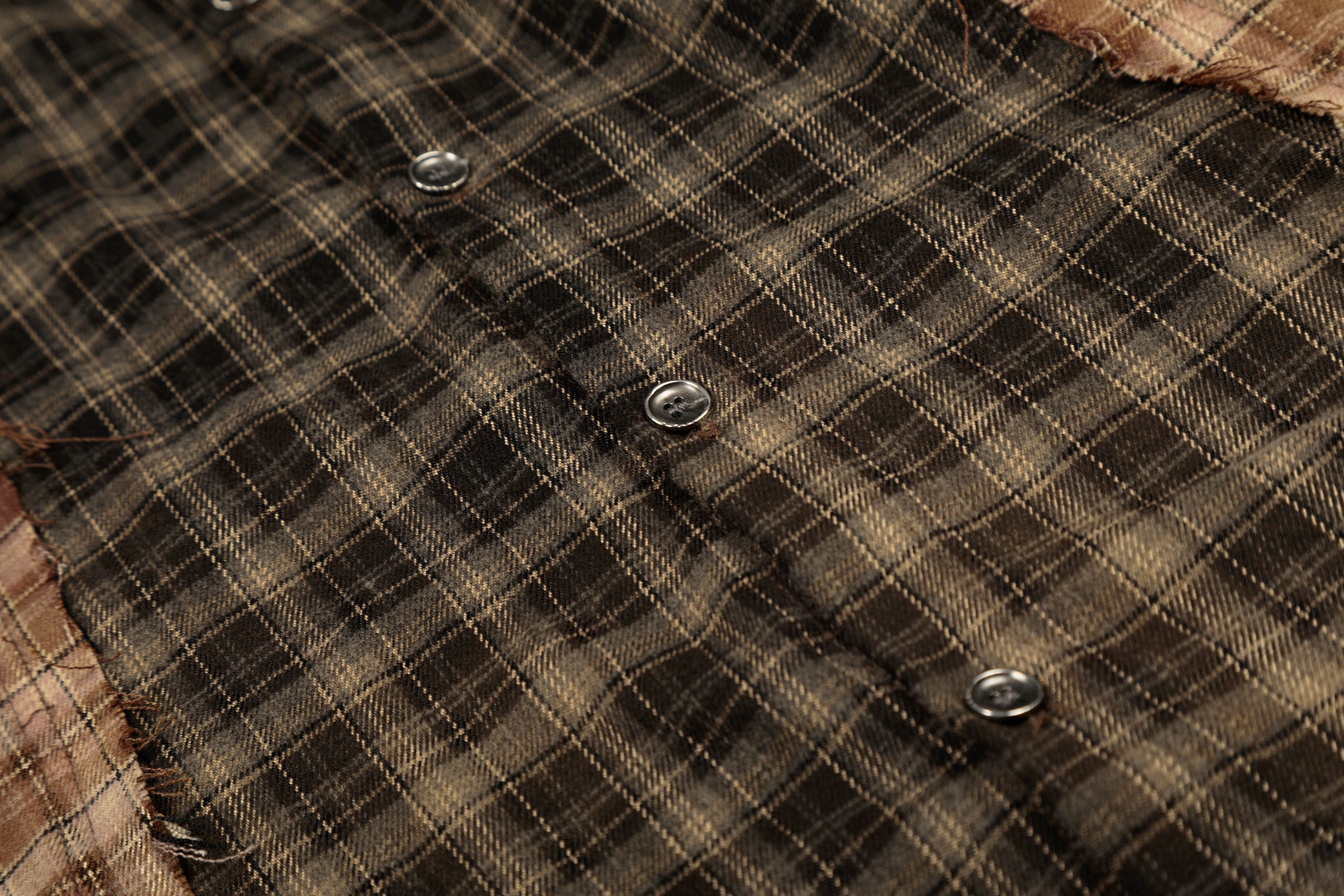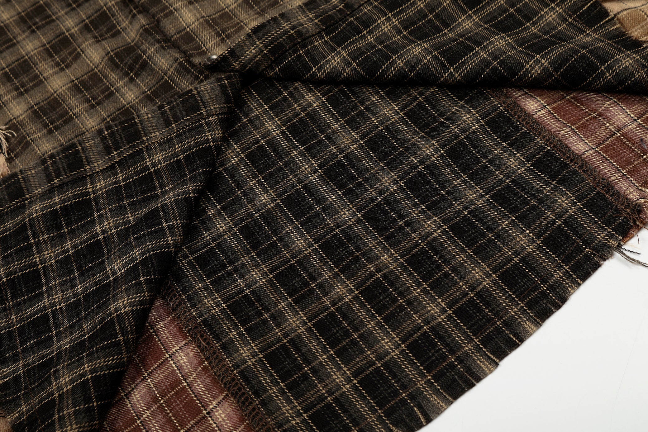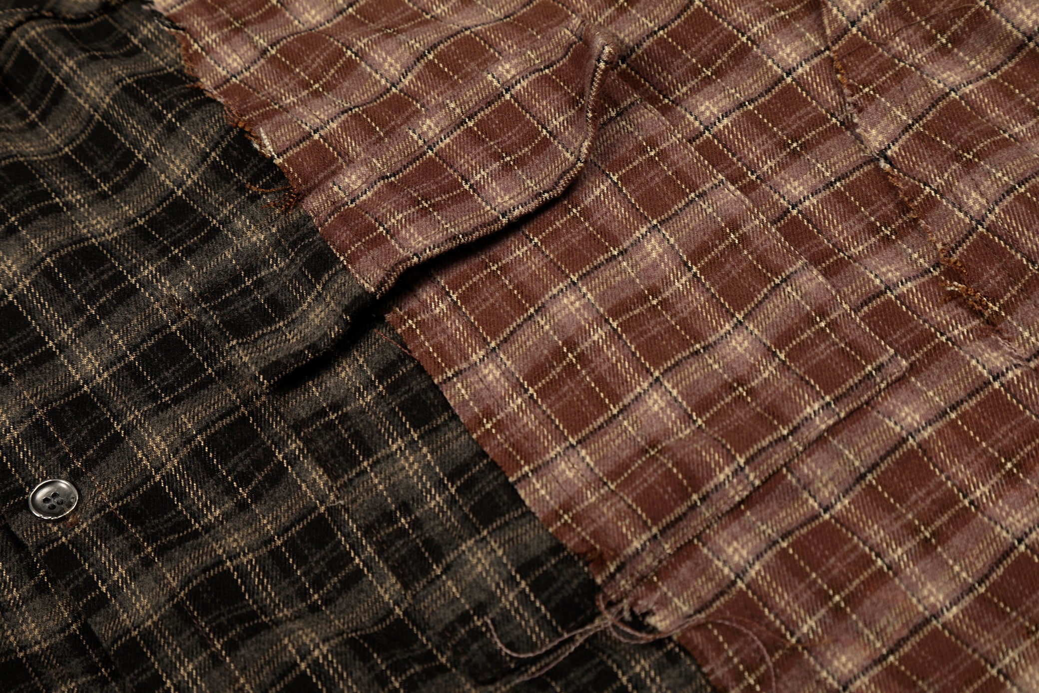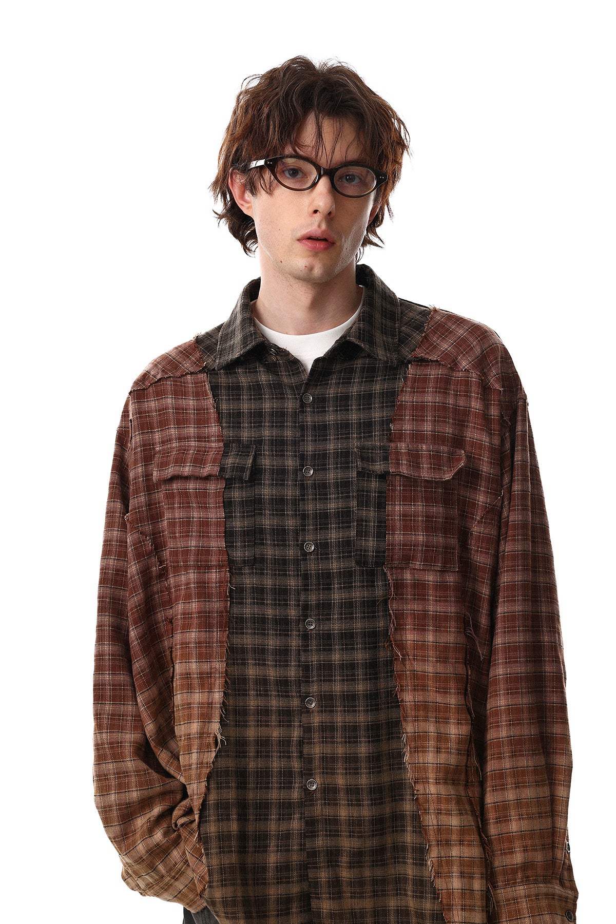 Clothing details: Patchwork plaid panel construction, contrast check patterns, distressed raw-edge detailing, classic pointed collar, full button-up closure, long sleeves with buttoned cuffs, relaxed fit, frayed hem finish.