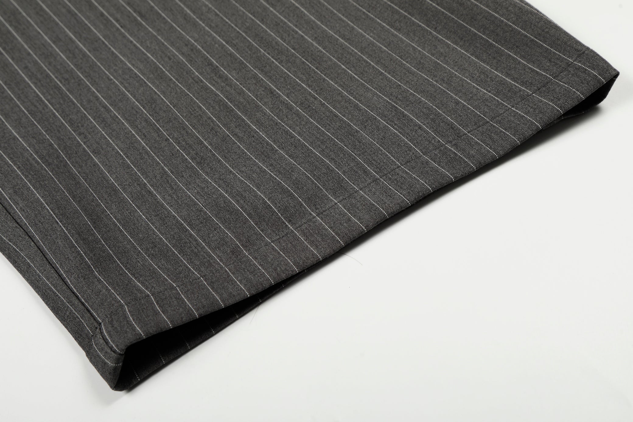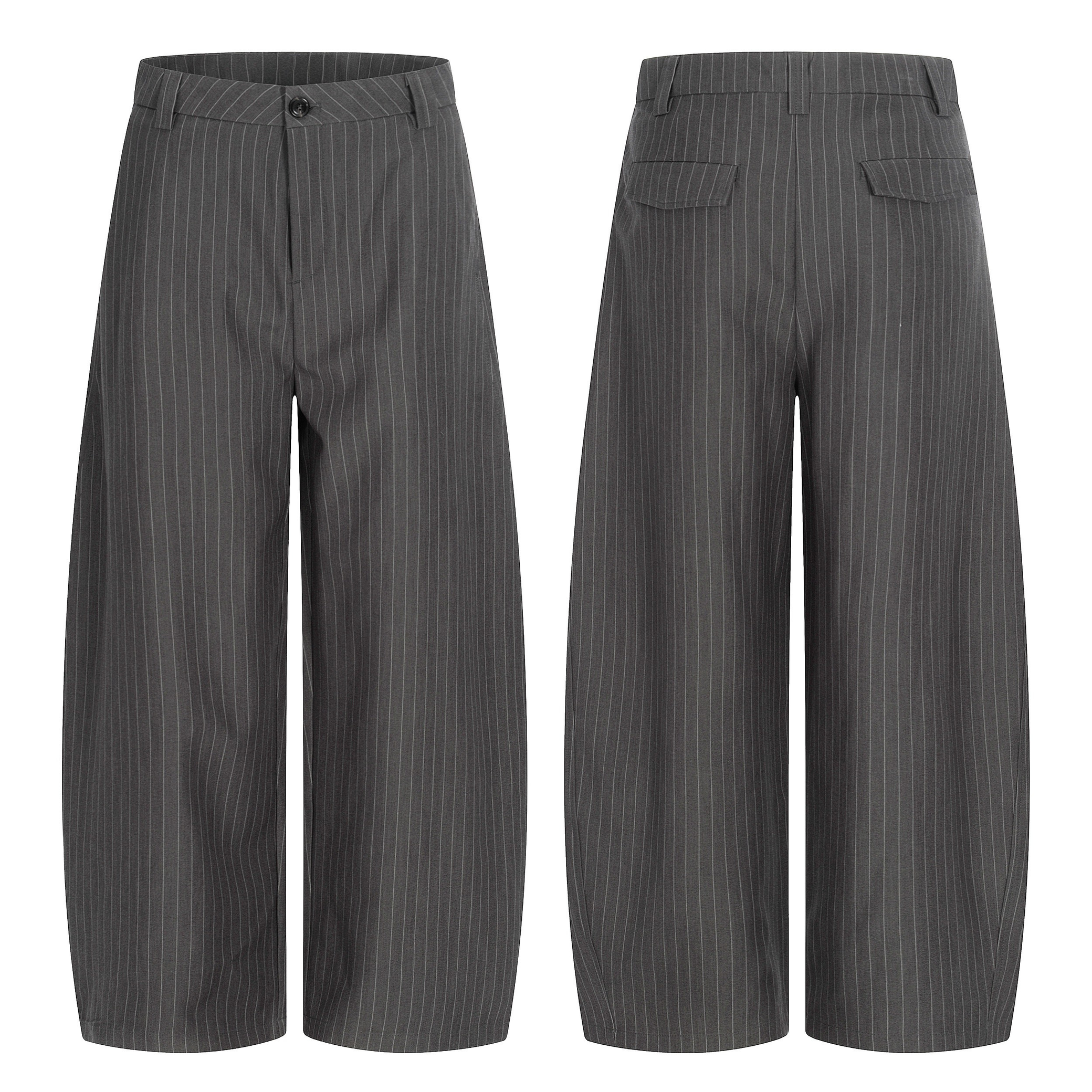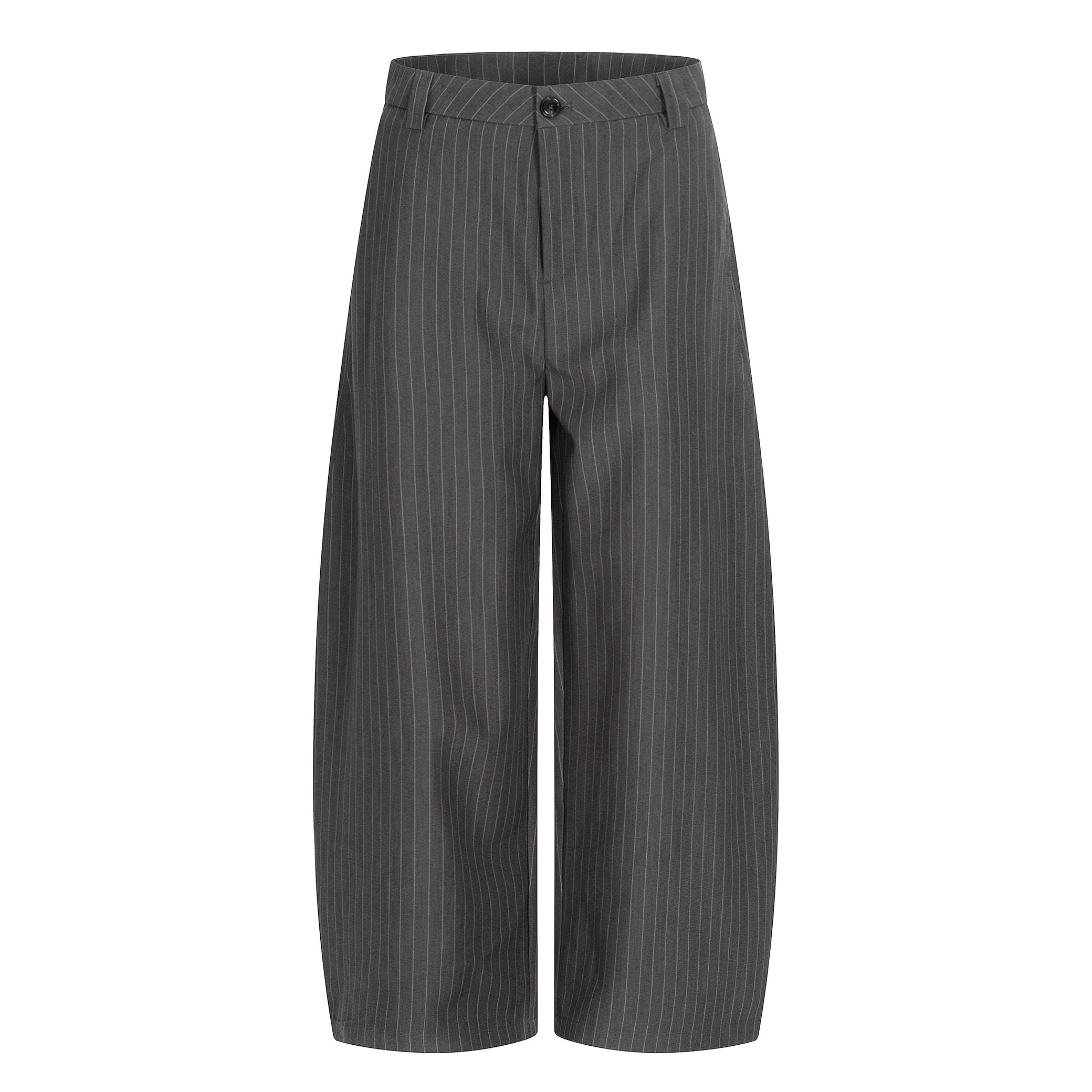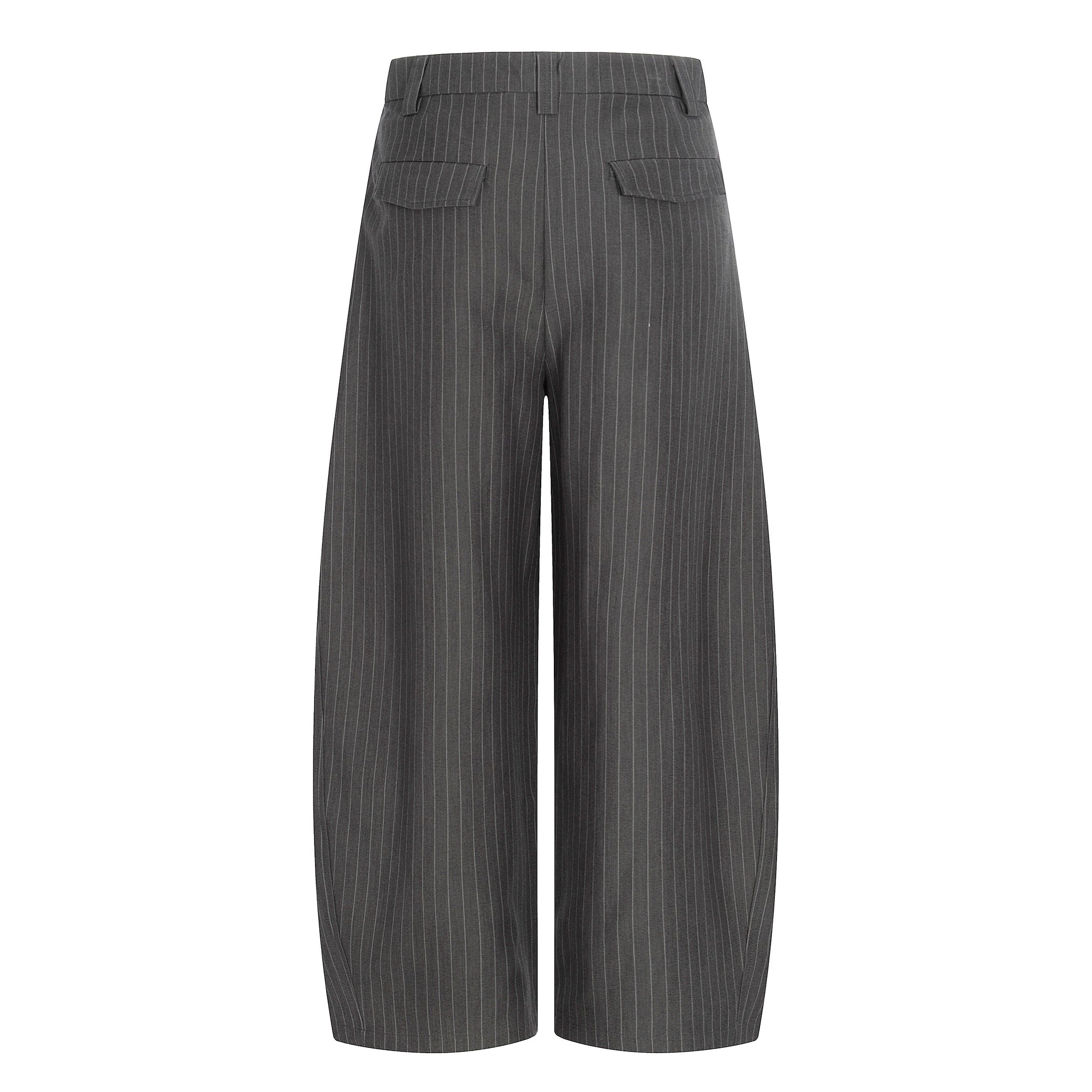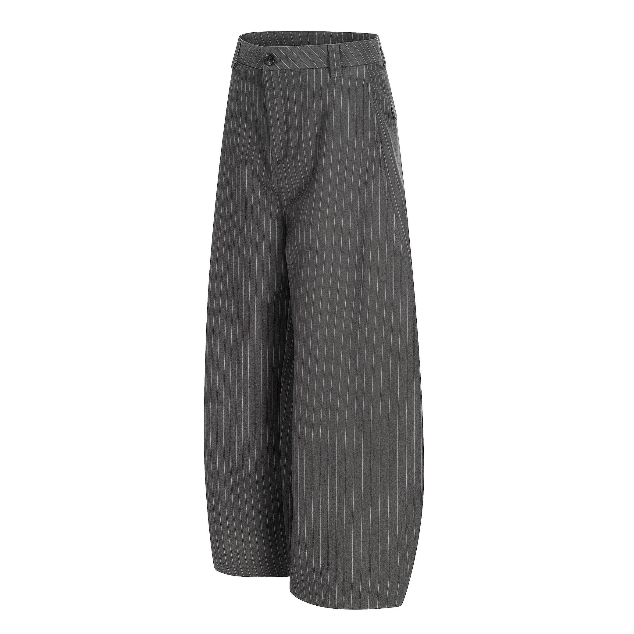 Clothing details: Wide-leg silhouette, subtle pinstripe pattern, structured waistband with button closure, smooth front construction, vertical drape for elongated proportions, flexible fabric for comfort and shape retention.