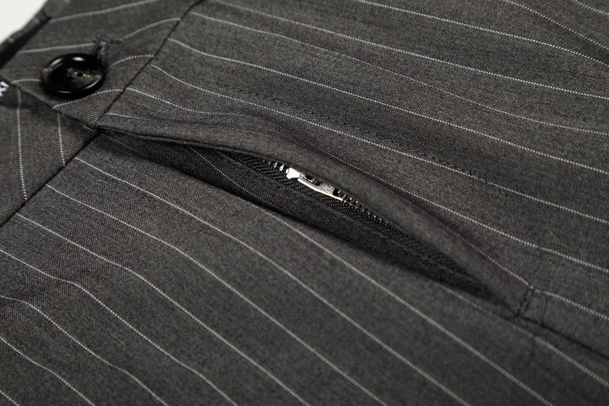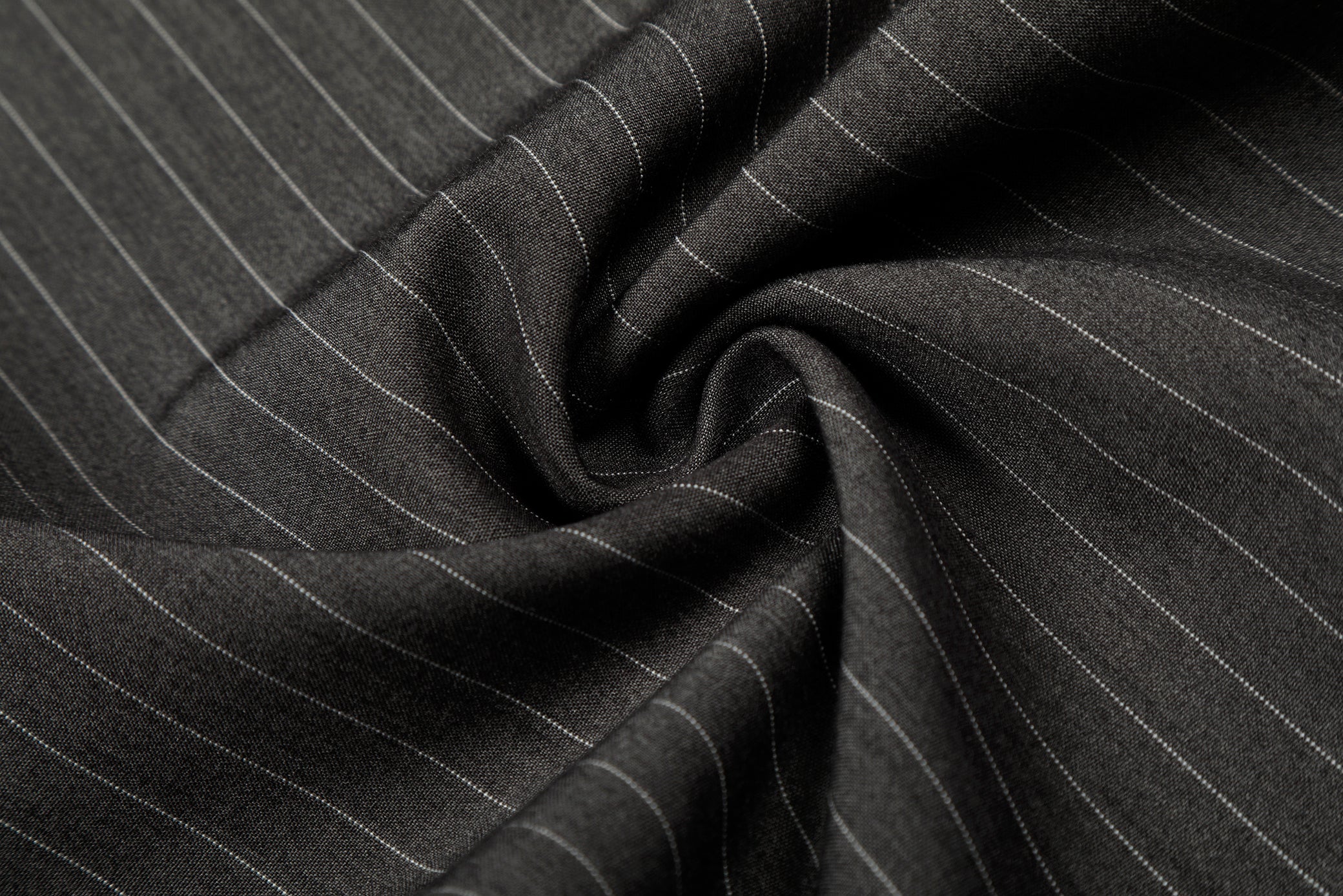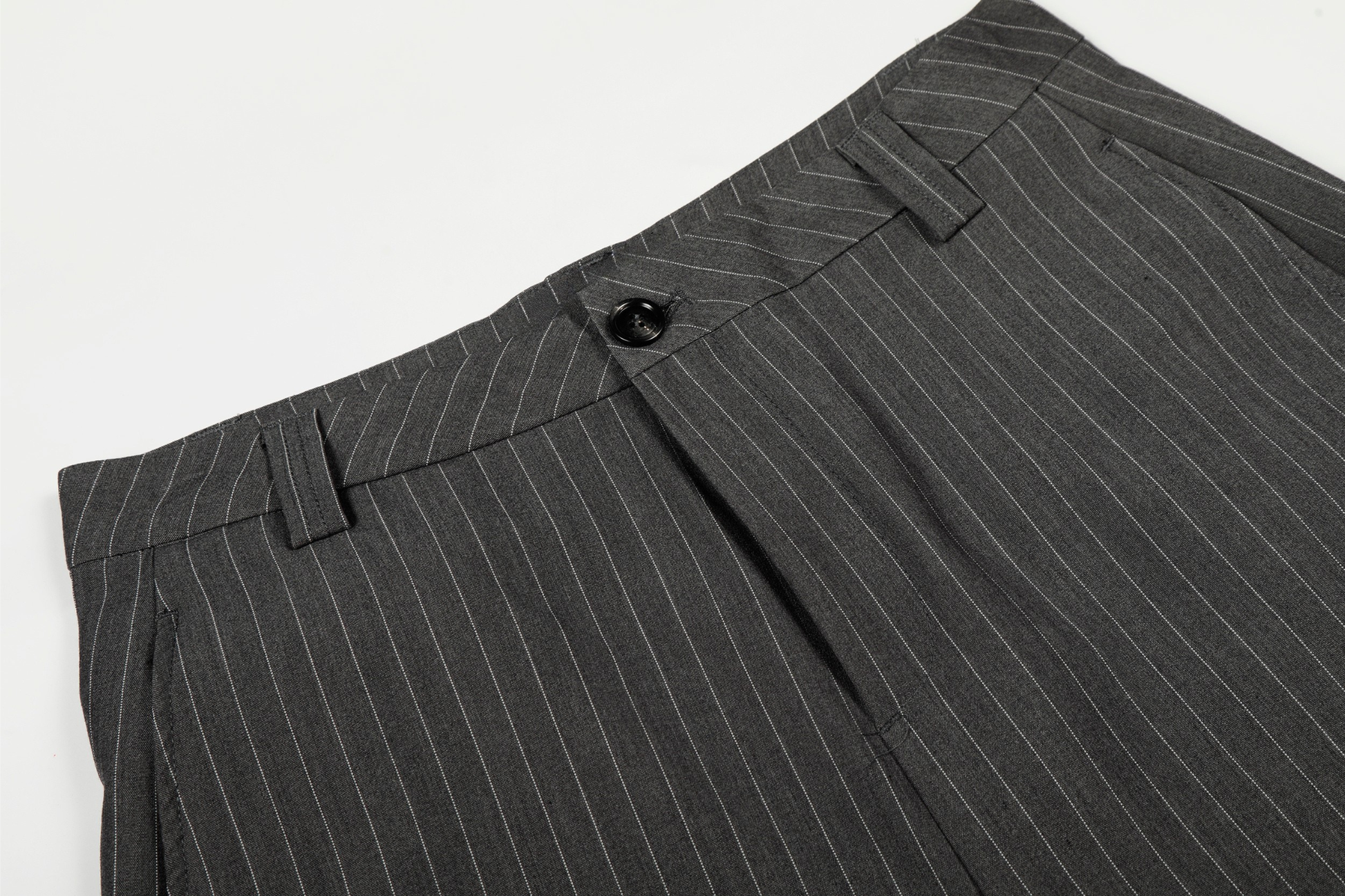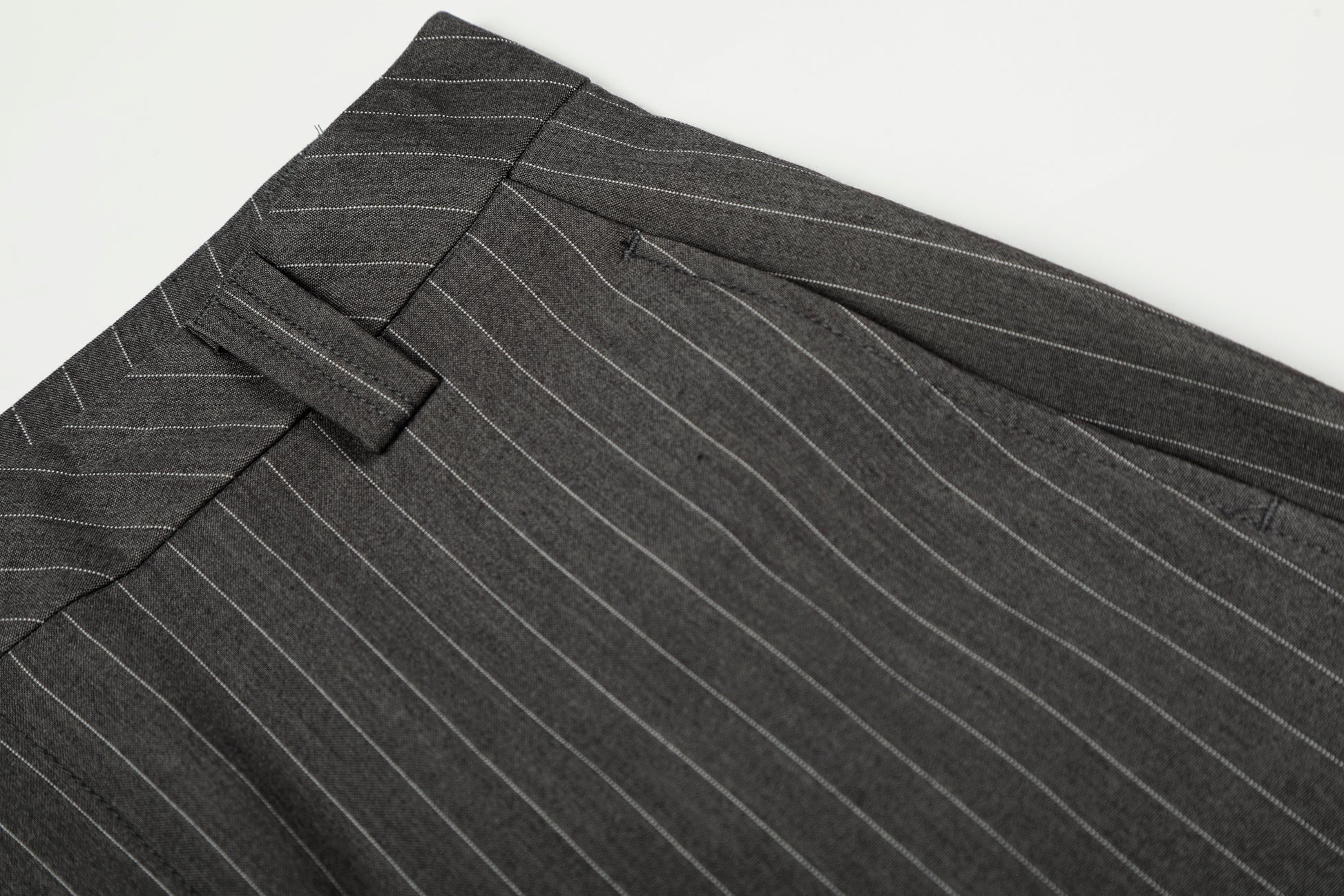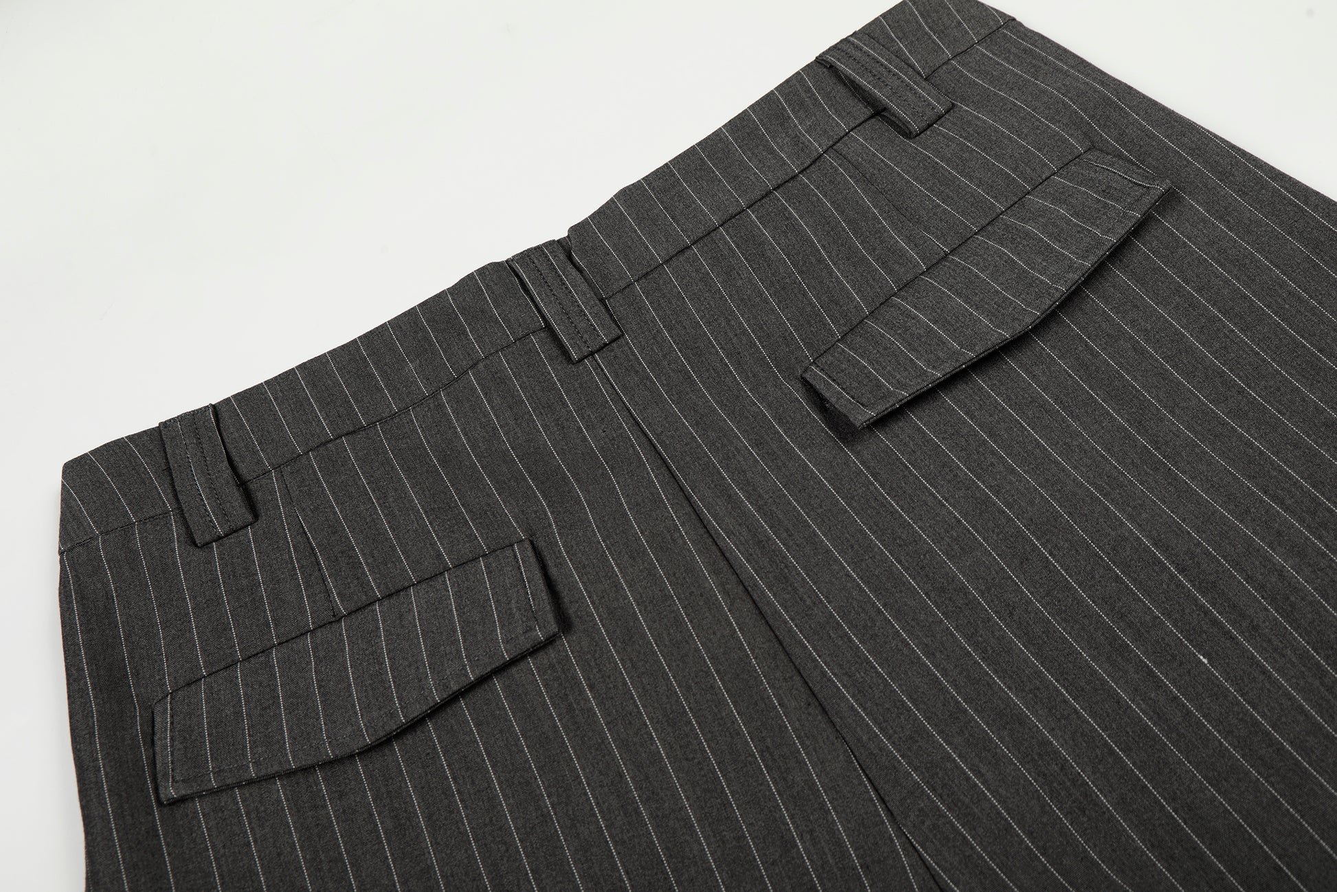 Clothing details: Wide-leg silhouette, subtle pinstripe pattern, structured waistband with button closure, smooth front construction, vertical drape for elongated proportions, flexible fabric for comfort and shape retention.
