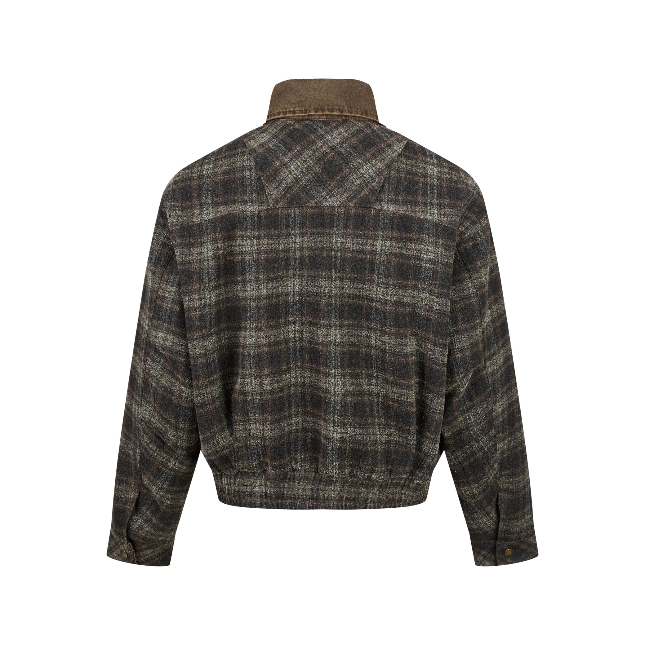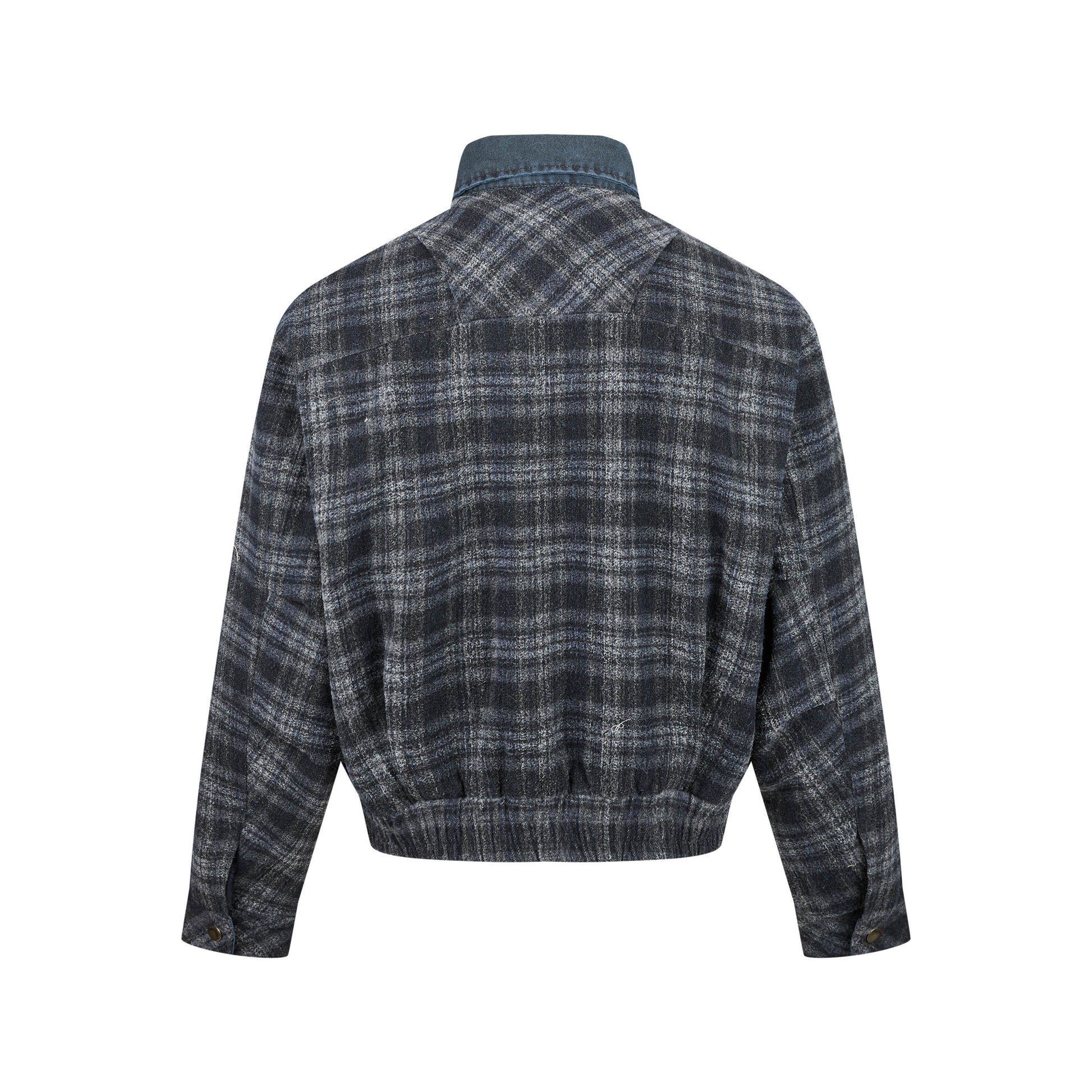 Clothing details: Vintage plaid fabric, contrast denim chest pockets with snap buttons, classic collar design, full-zip front closure, elasticated hem, relaxed cropped fit, reinforced stitching for durability, available in multiple colorways.